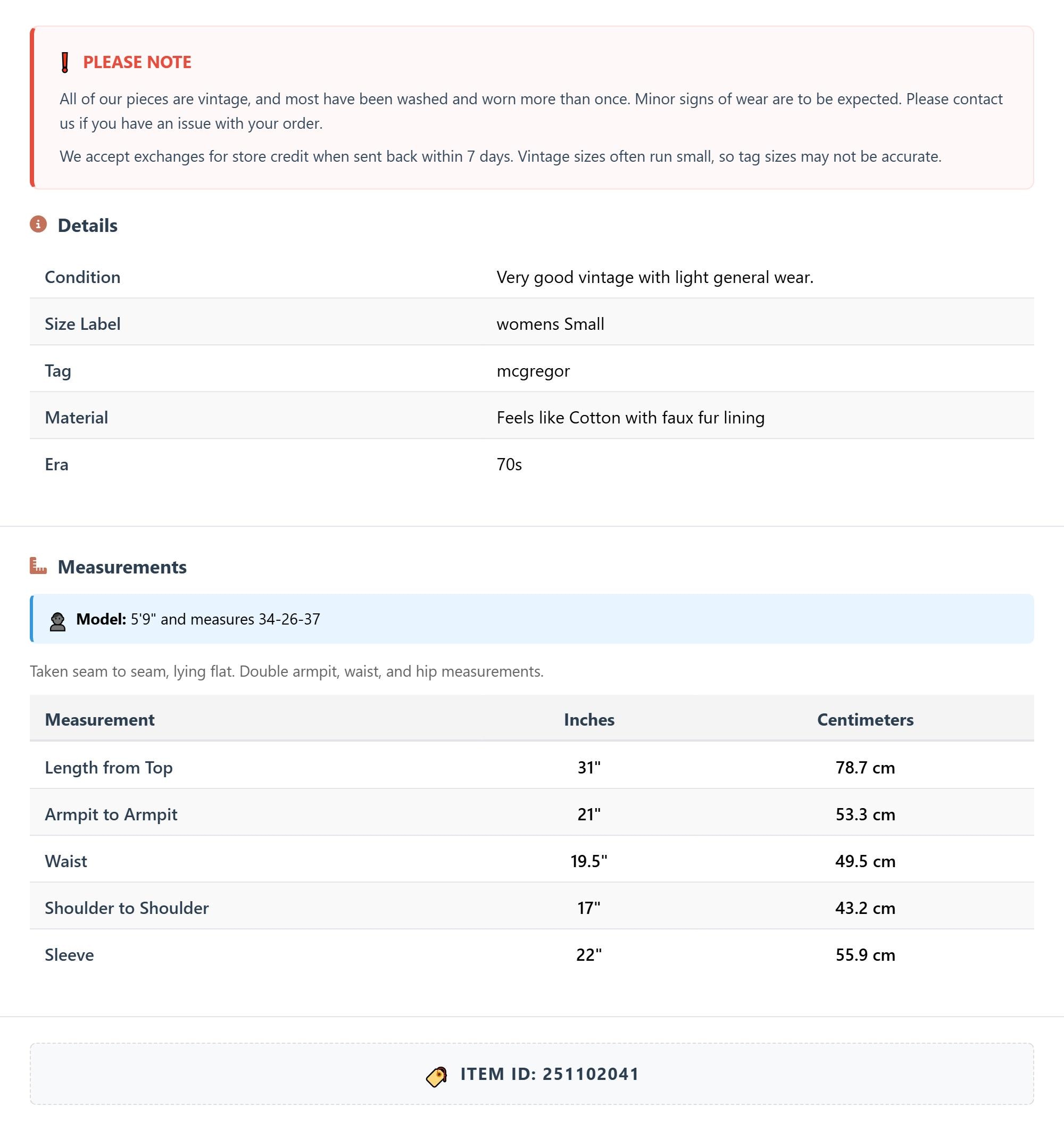 Suggested sizes are estimates only; see measurements for exact sizing. Vintage sizes often run small, so tag sizes may not be accurate.