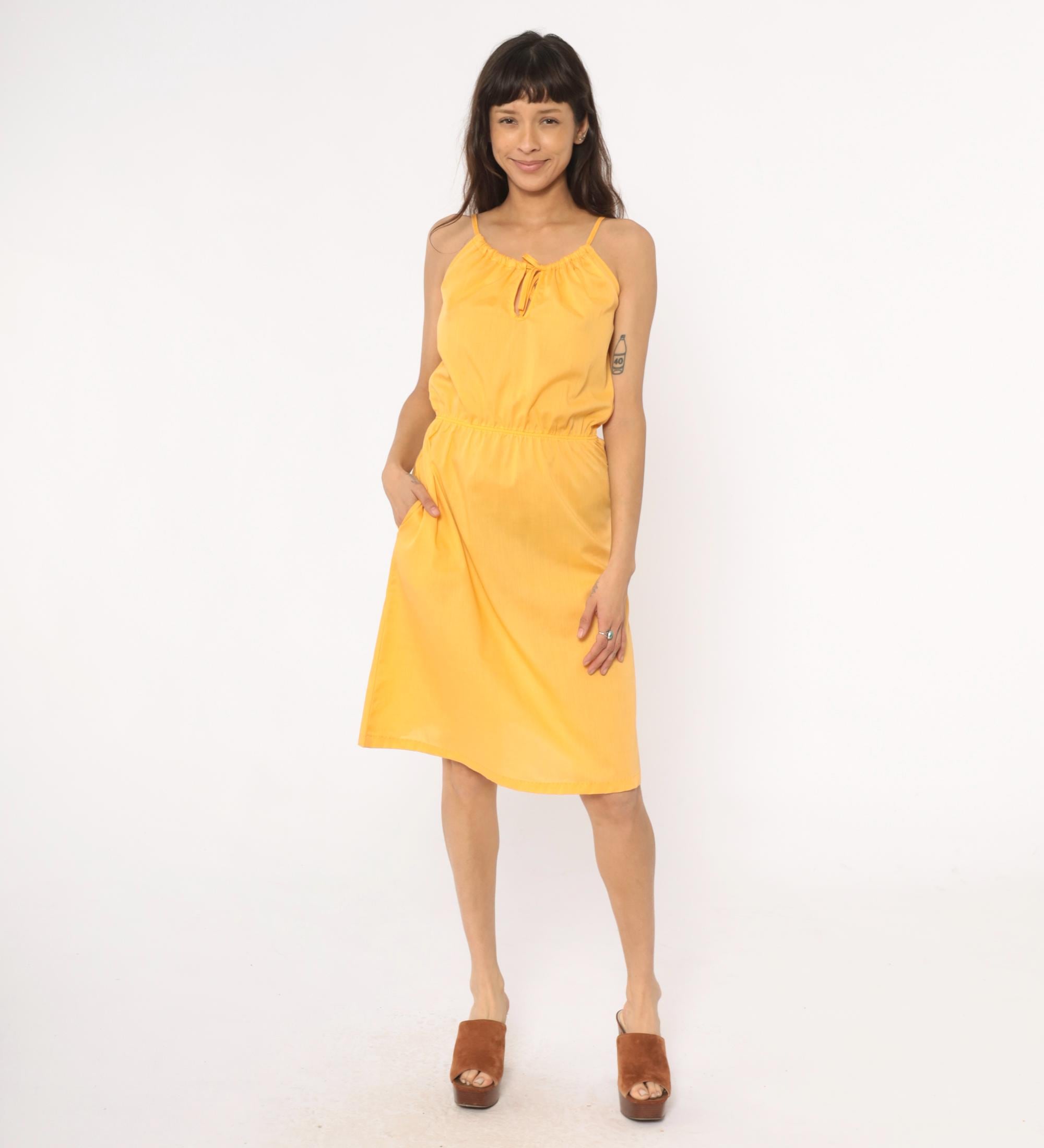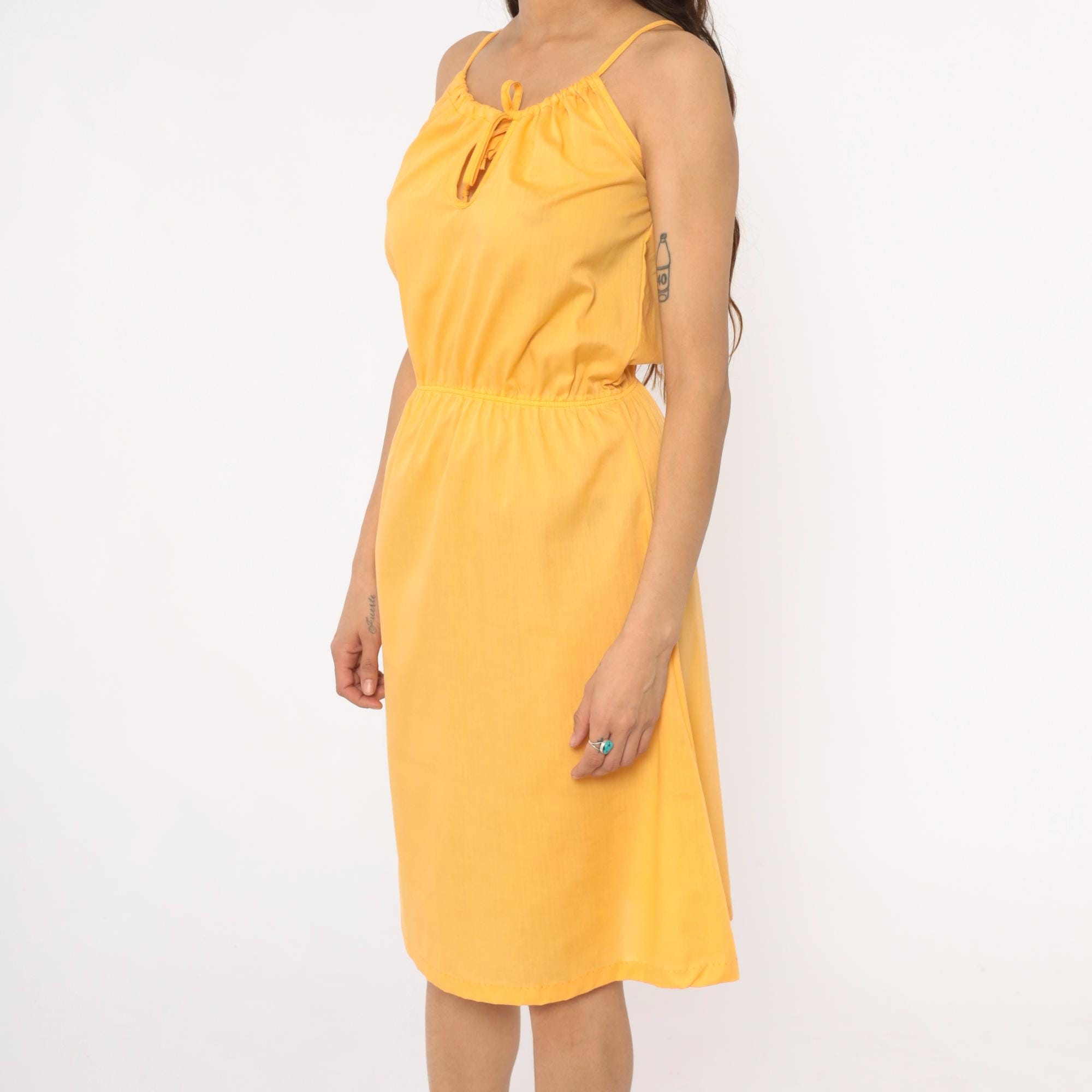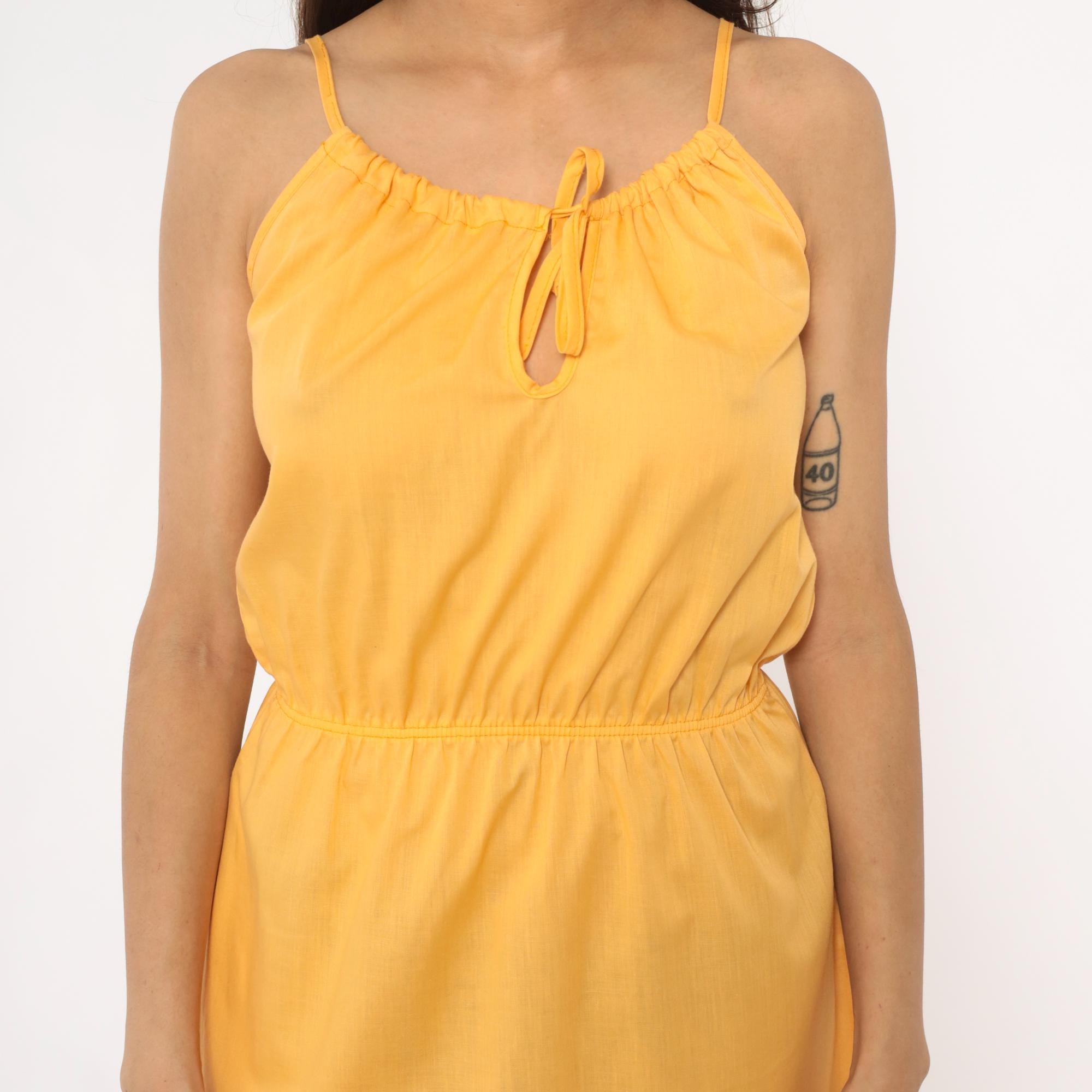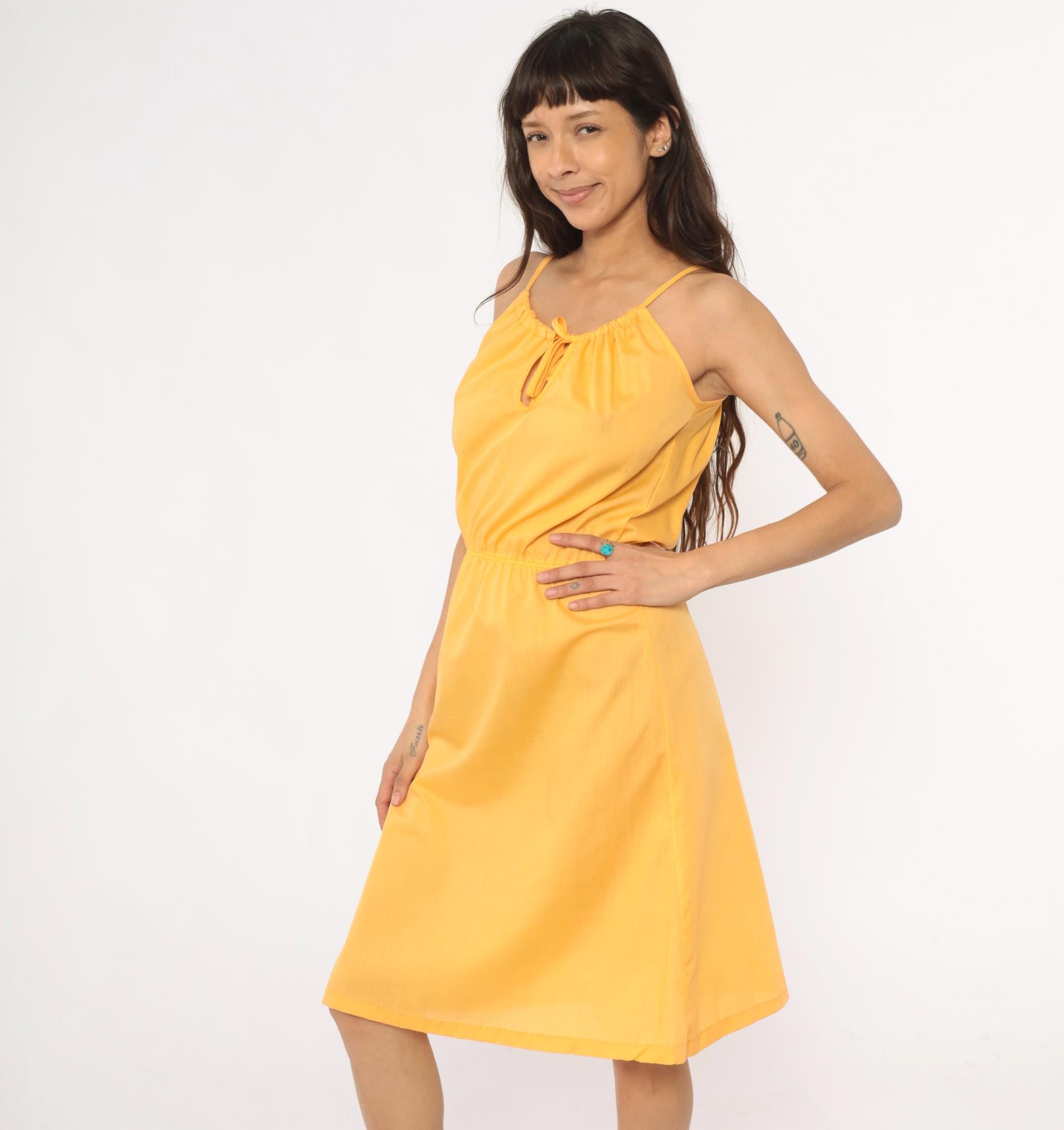 70s yellow dress with thin spaghetti straps and gathered neckline with small bow tie detail at center front. Elastic waist creates a blouson bodice above a knee-length skirt.