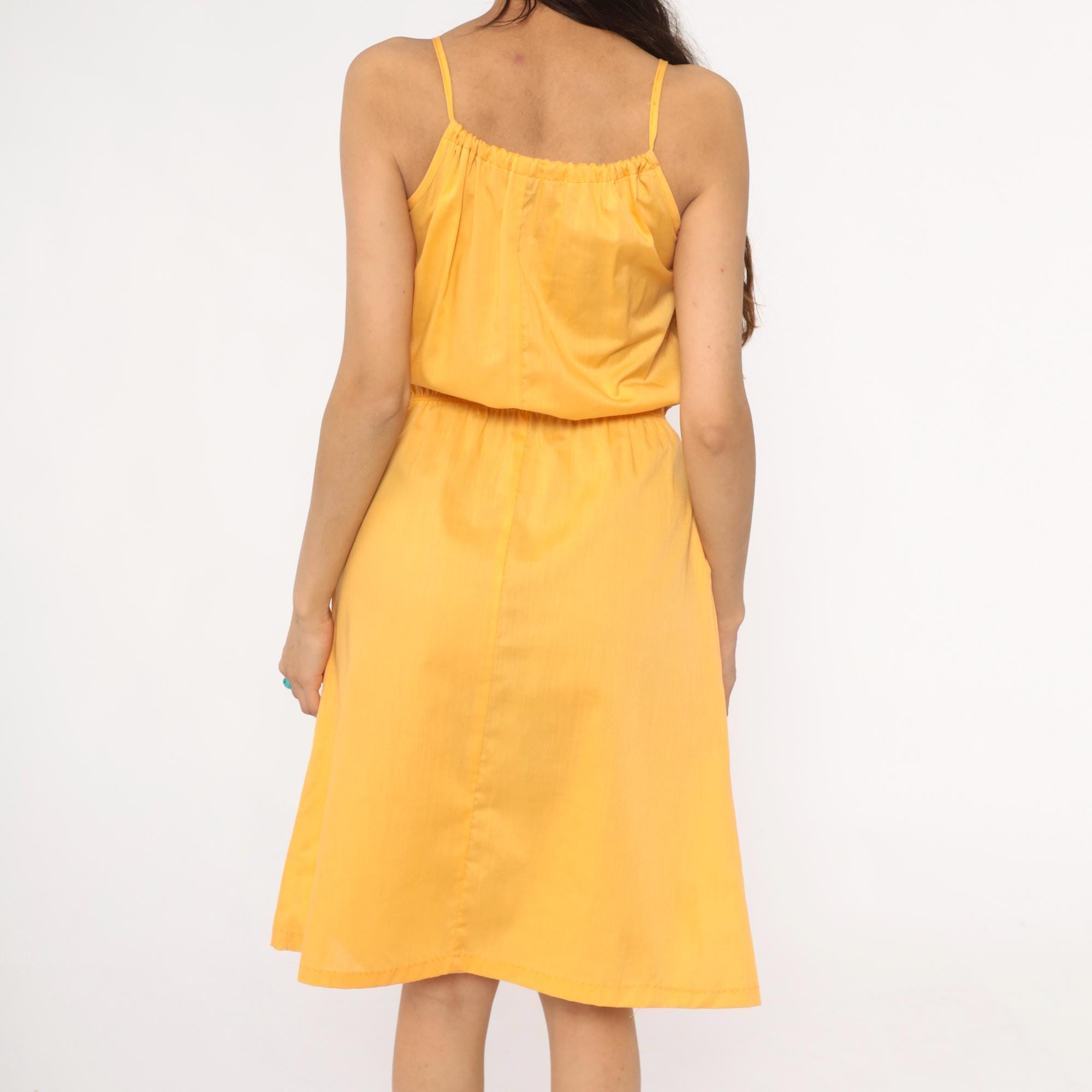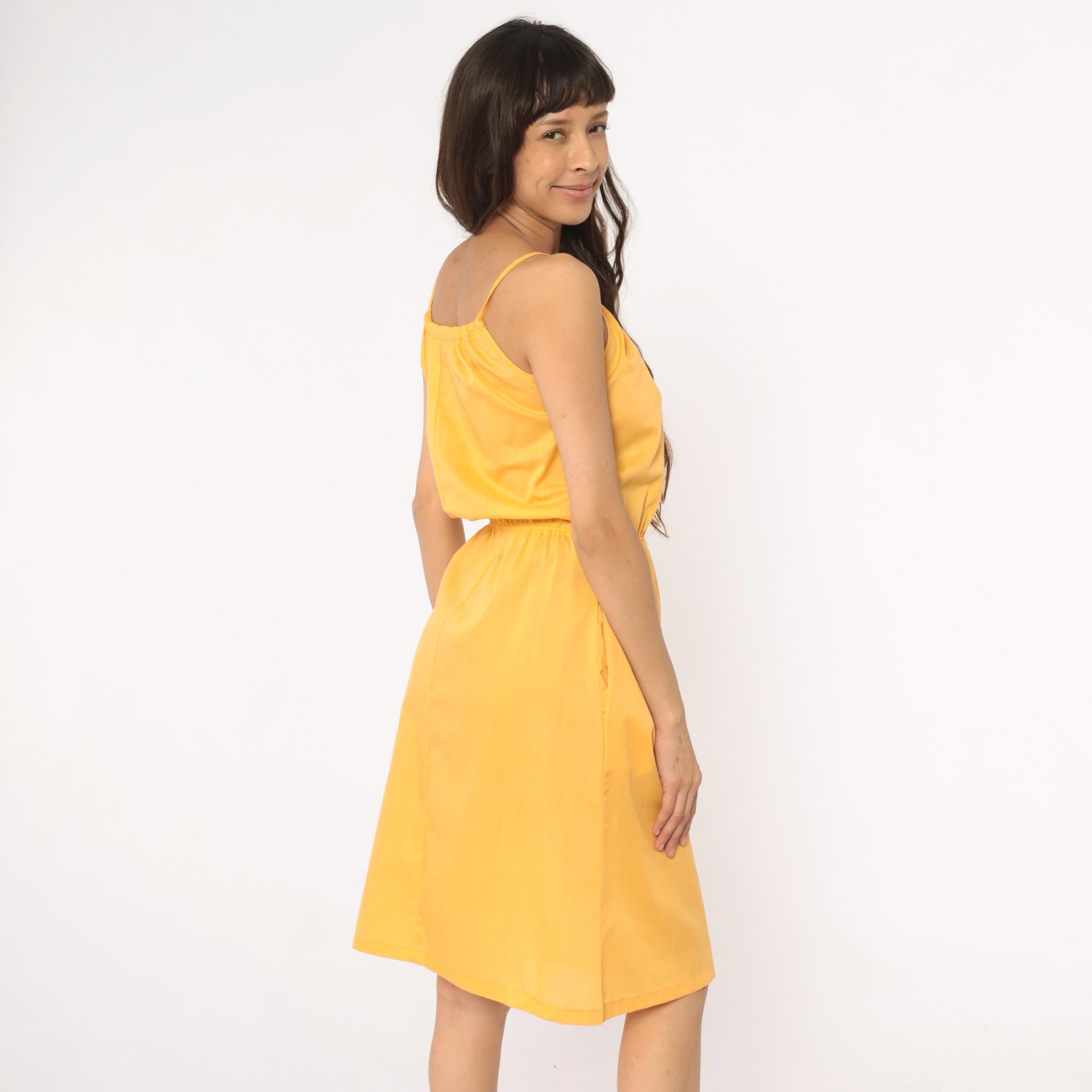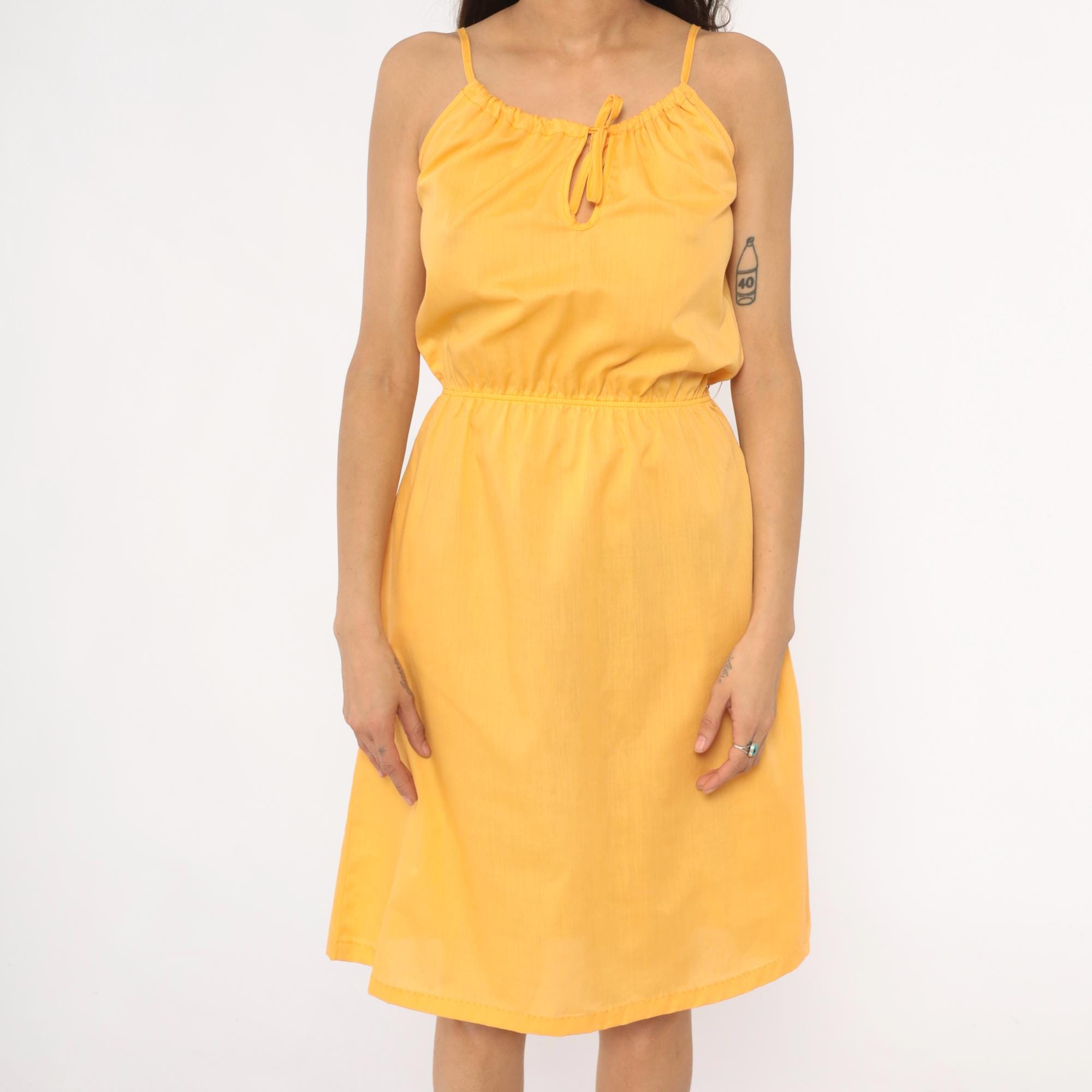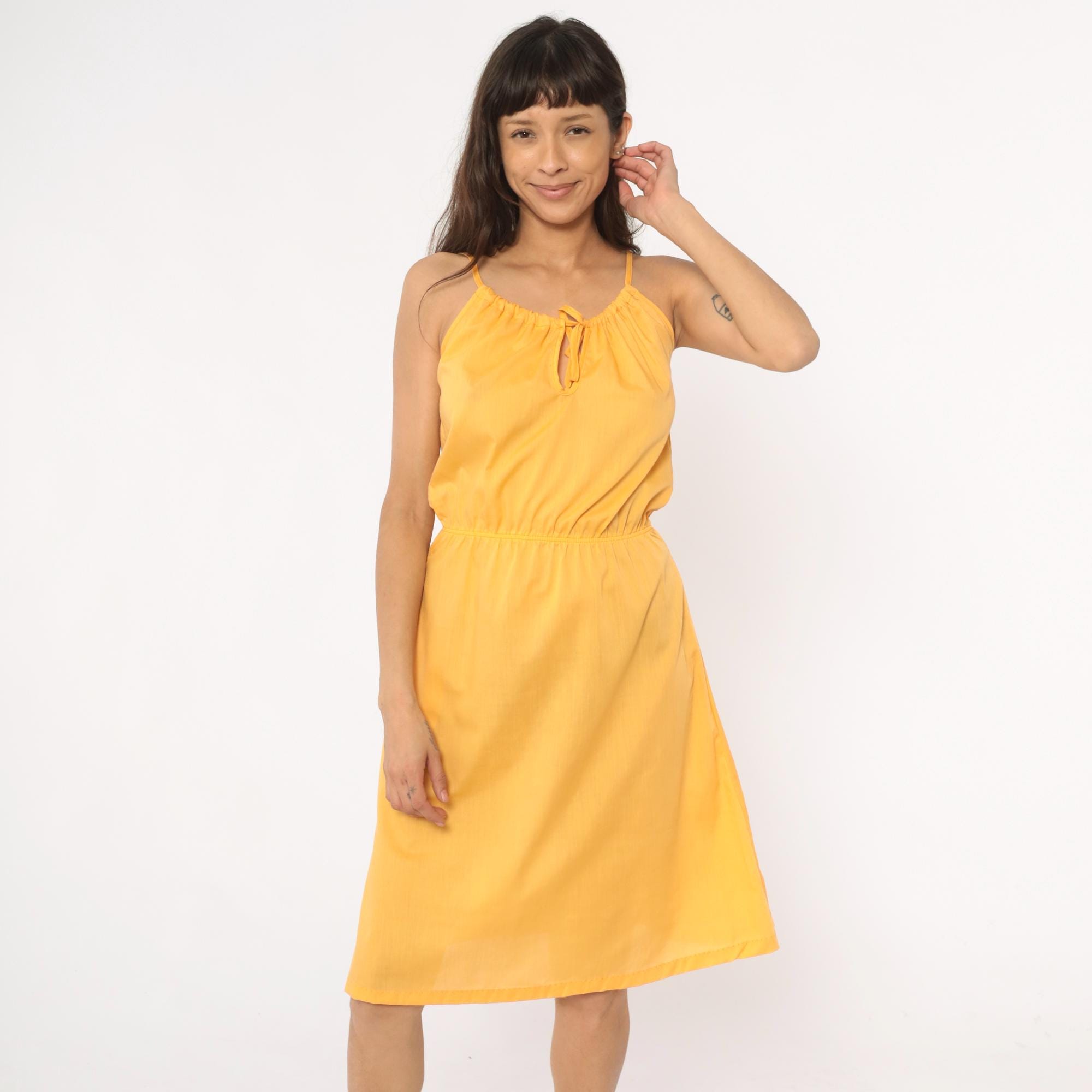 70s yellow dress with thin spaghetti straps and gathered neckline with small bow tie detail at center front. Elastic waist creates a blouson bodice above a knee-length skirt.