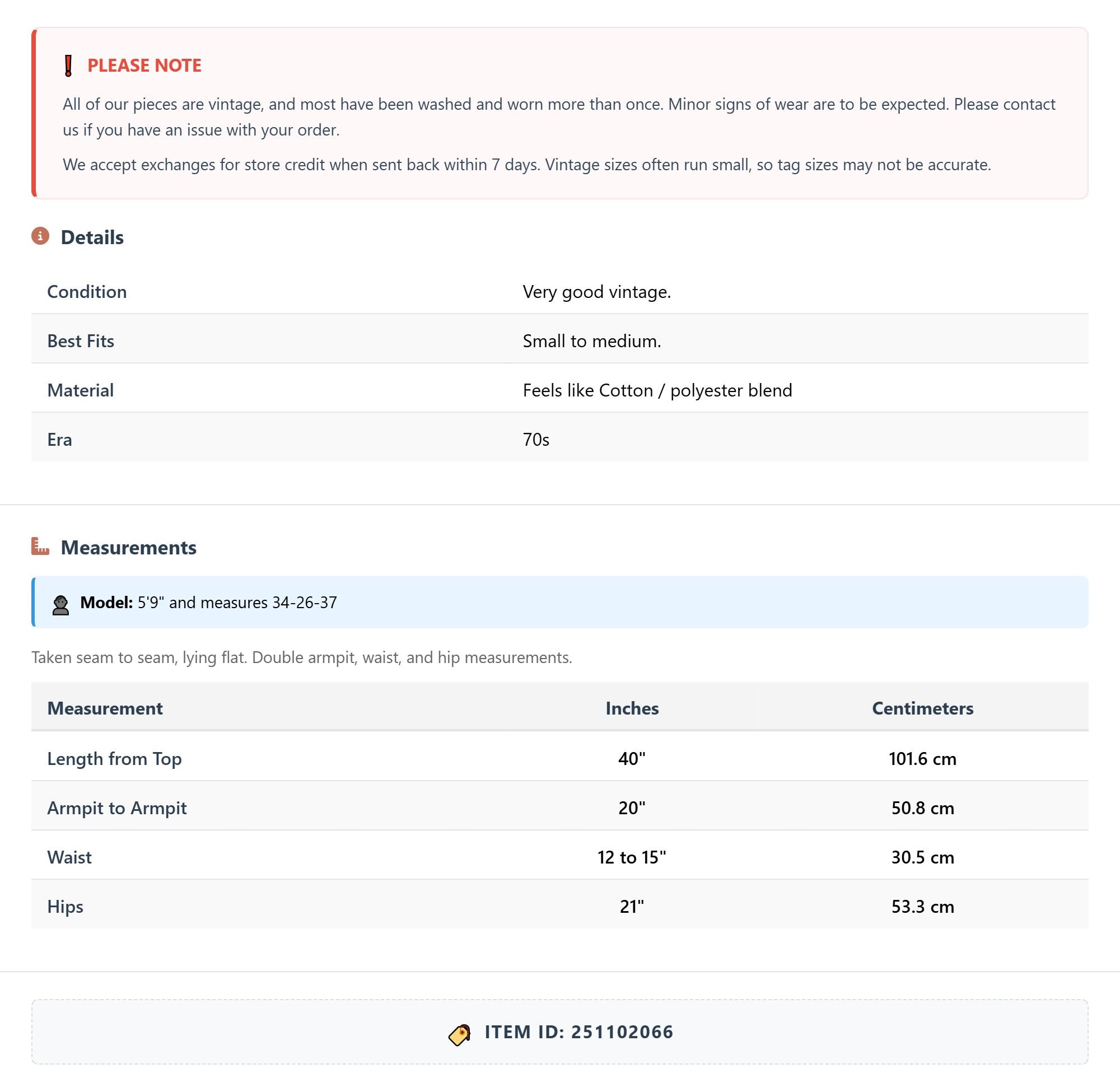 Suggested sizes are estimates only; see measurements for exact sizing. Vintage sizes often run small, so tag sizes may not be accurate.