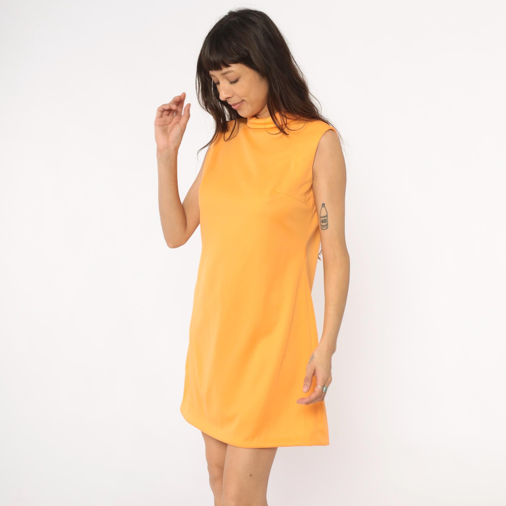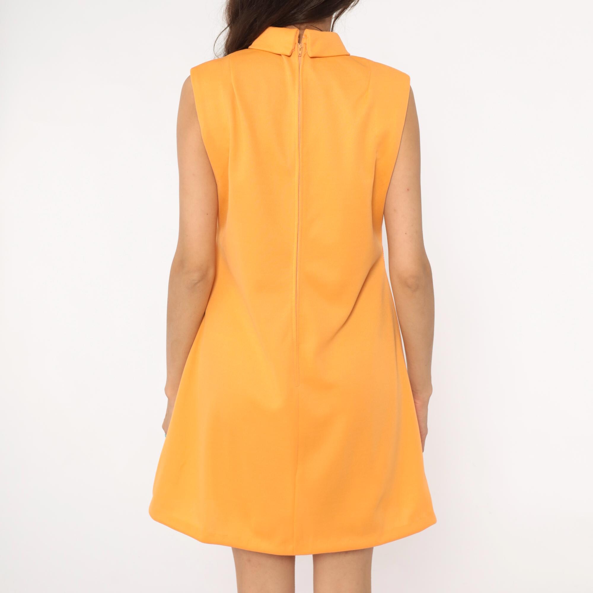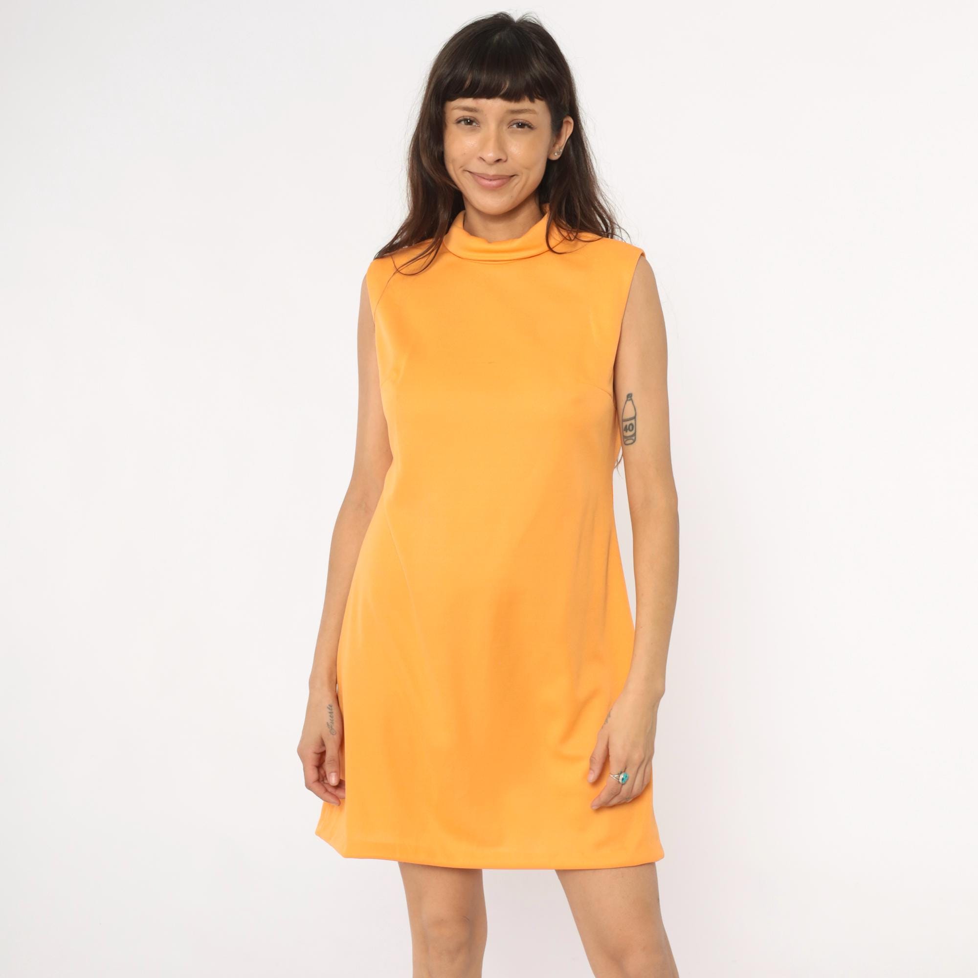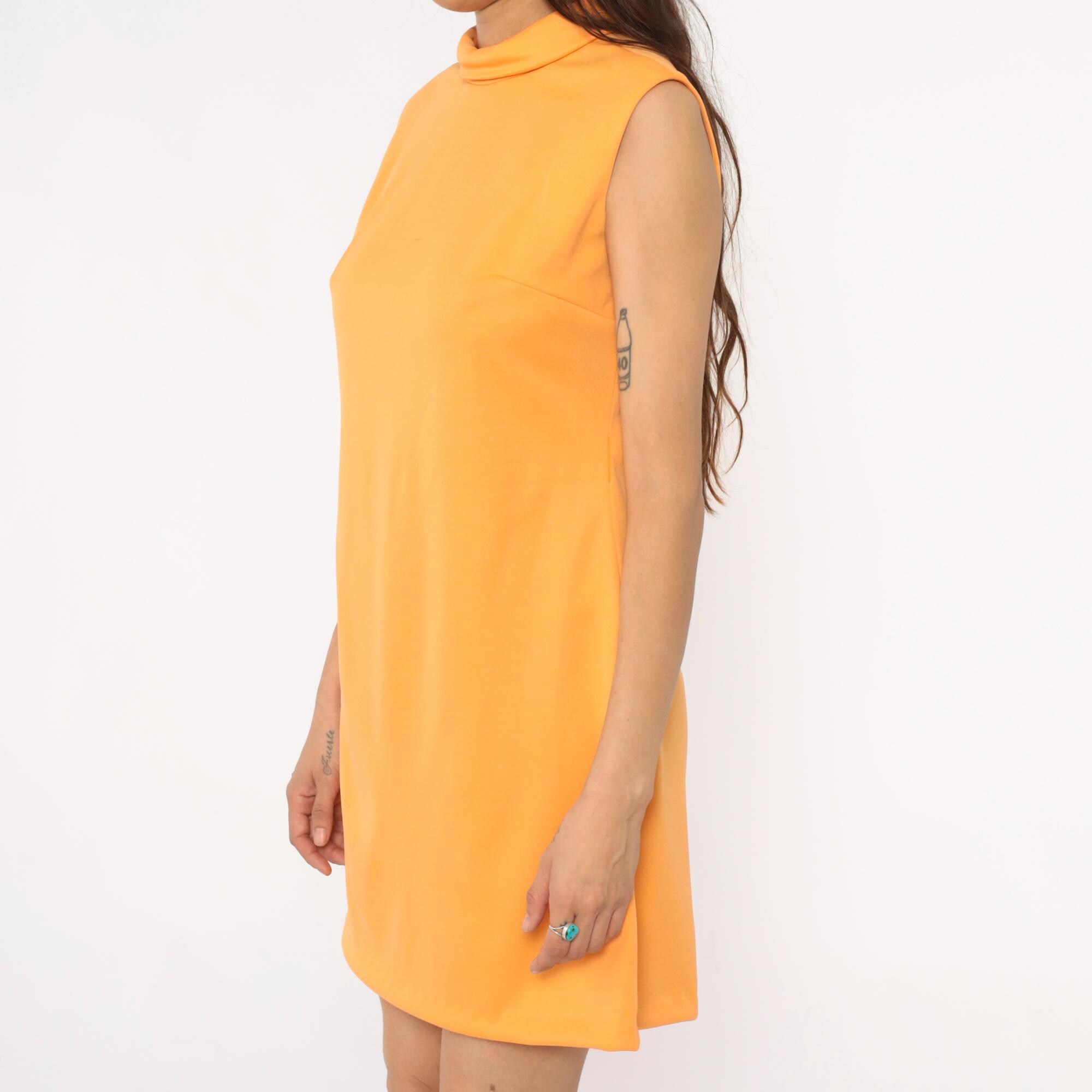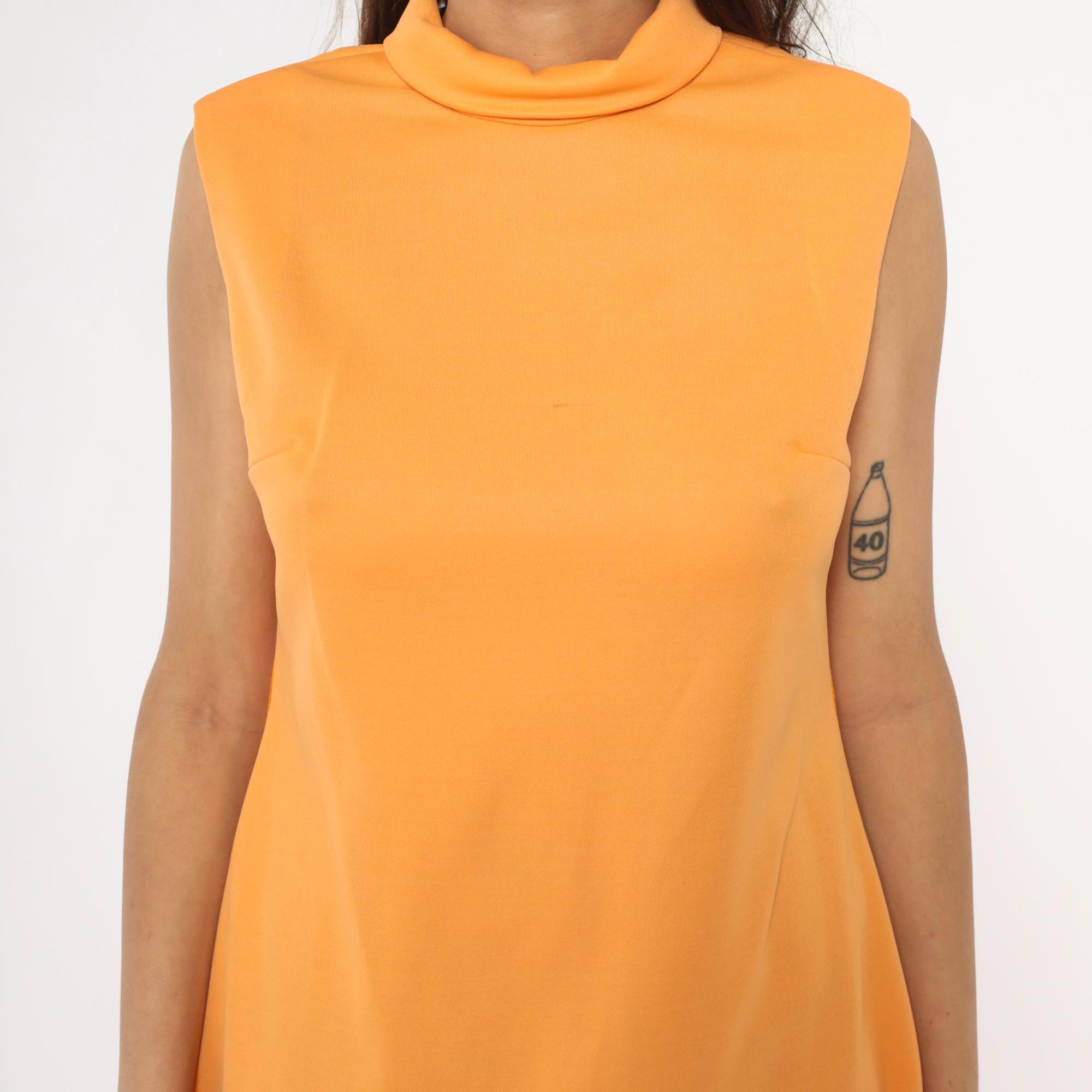 70s orange sleeveless shift dress from Brief Originals with mock neck collar and back zipper closure. A-line silhouette with straight cut from shoulders to hem.