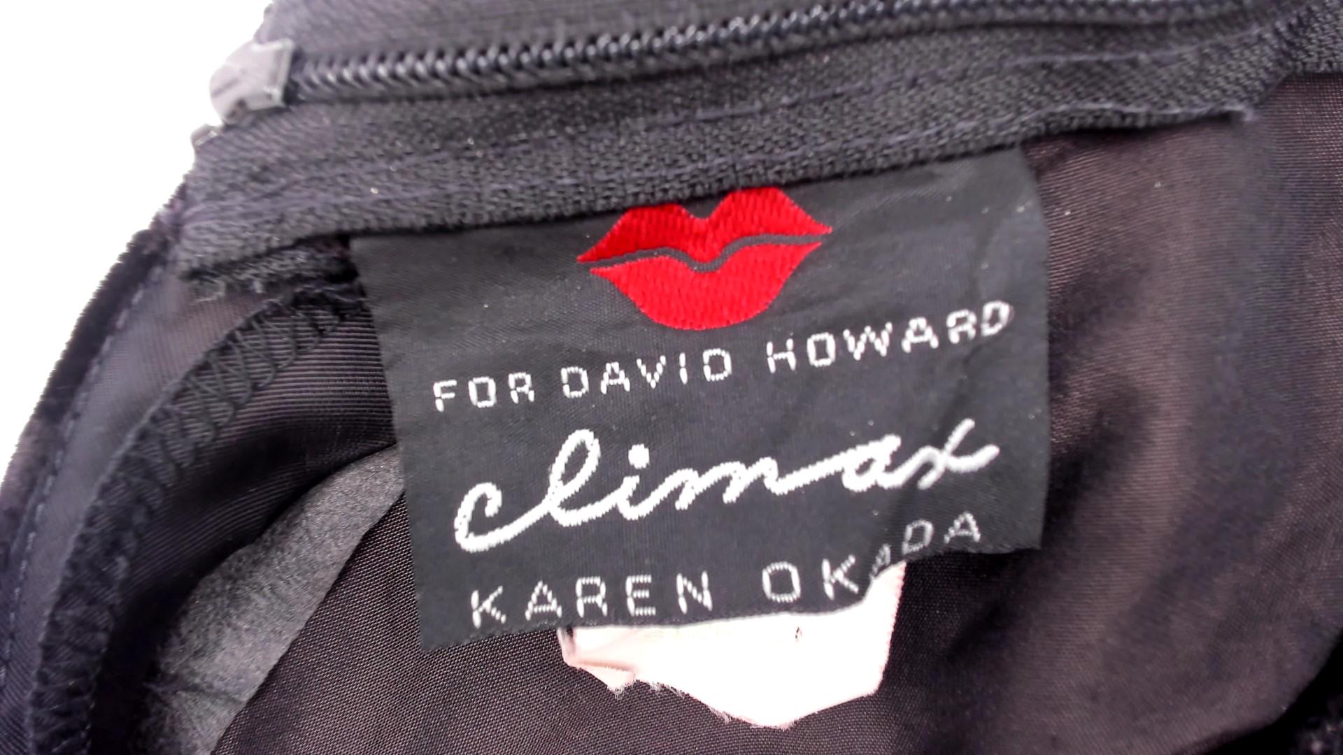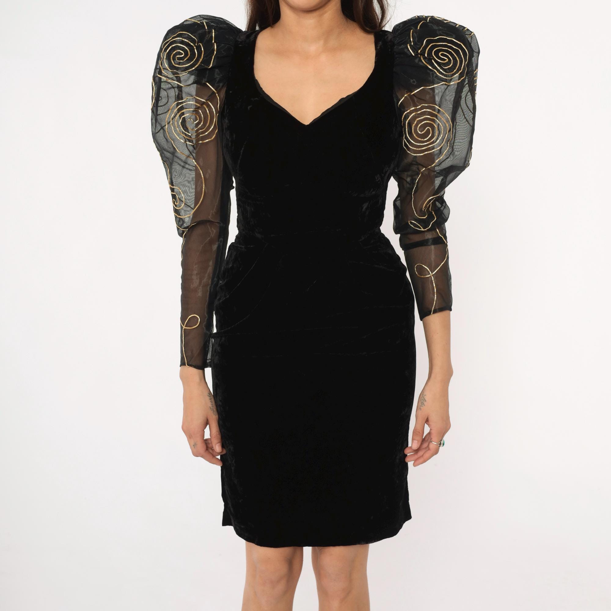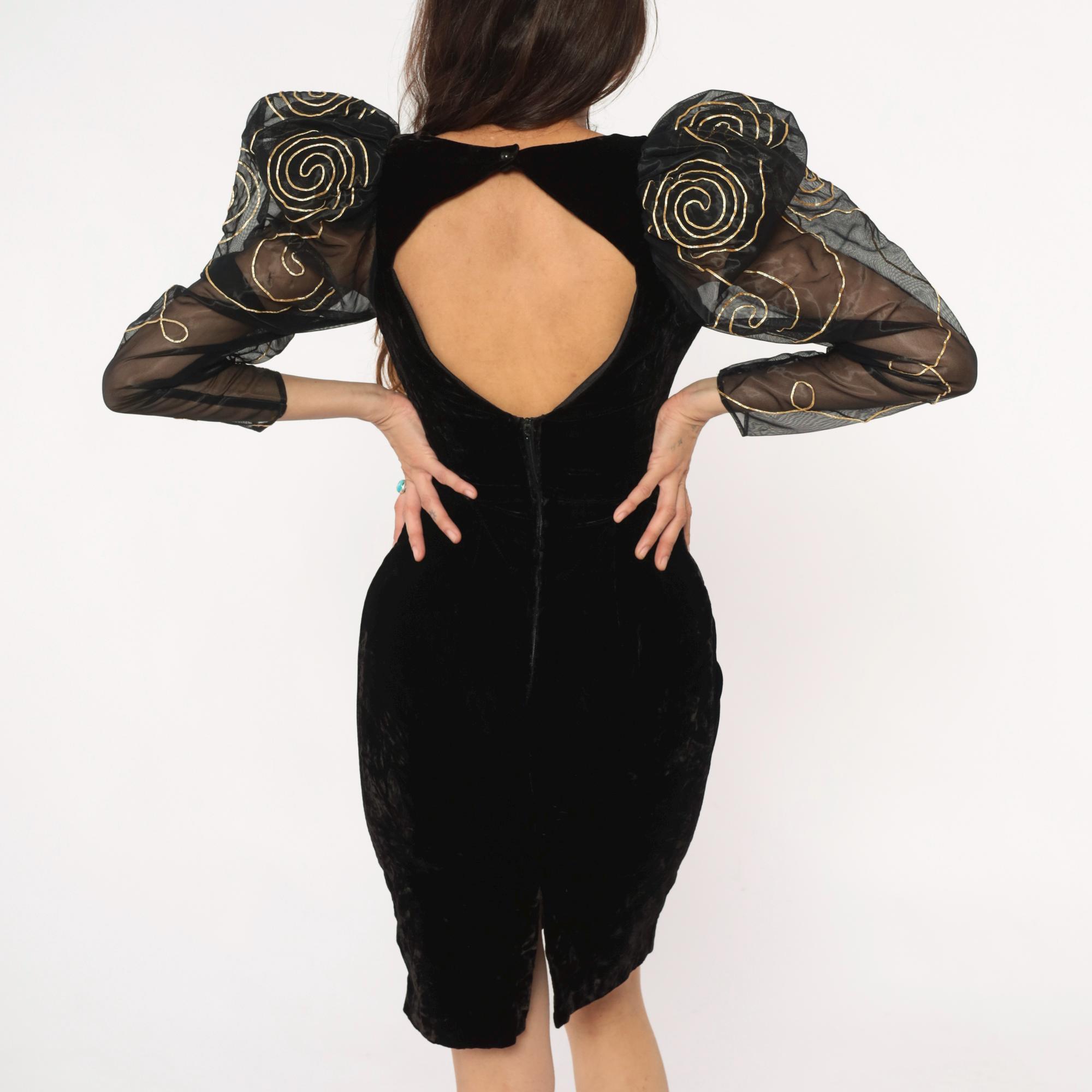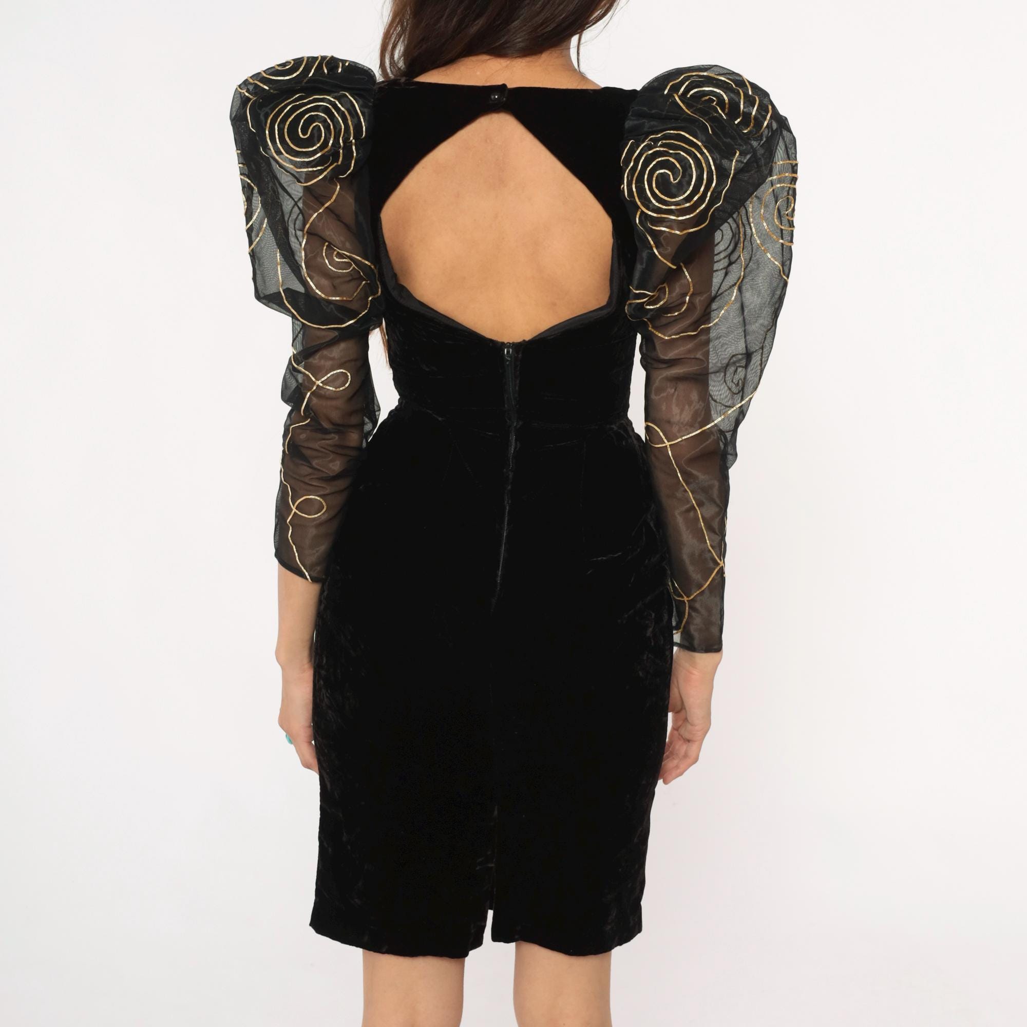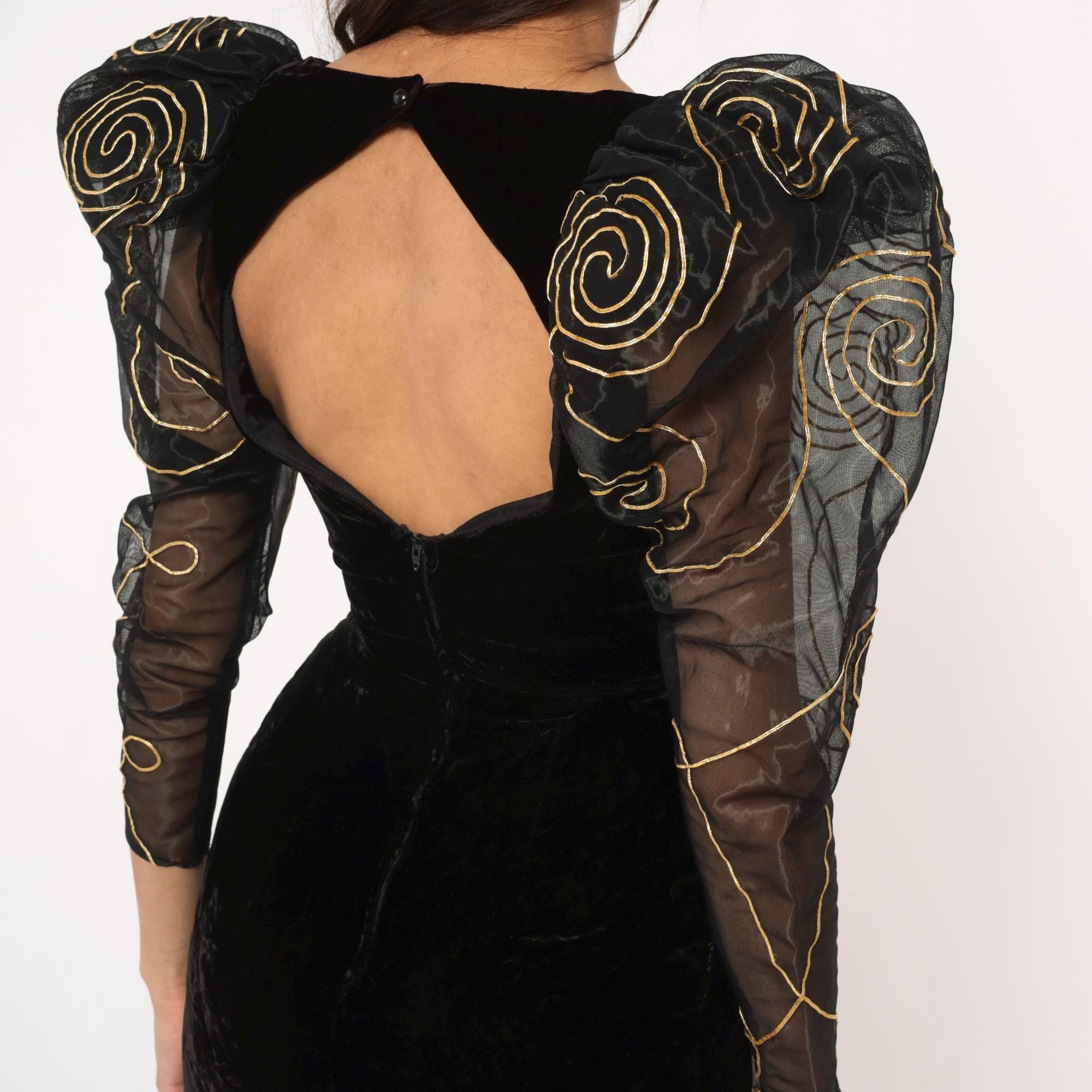 90s black velvet dress from climax with dramatic sheer organza sleeves embroidered with gold spiral patterns. Fitted velvet bodice with V-neckline and open hexagonal back cutout, back zipper closure. Large puff shoulders transition to long sheer sleeves with gold swirl embroidery throughout.