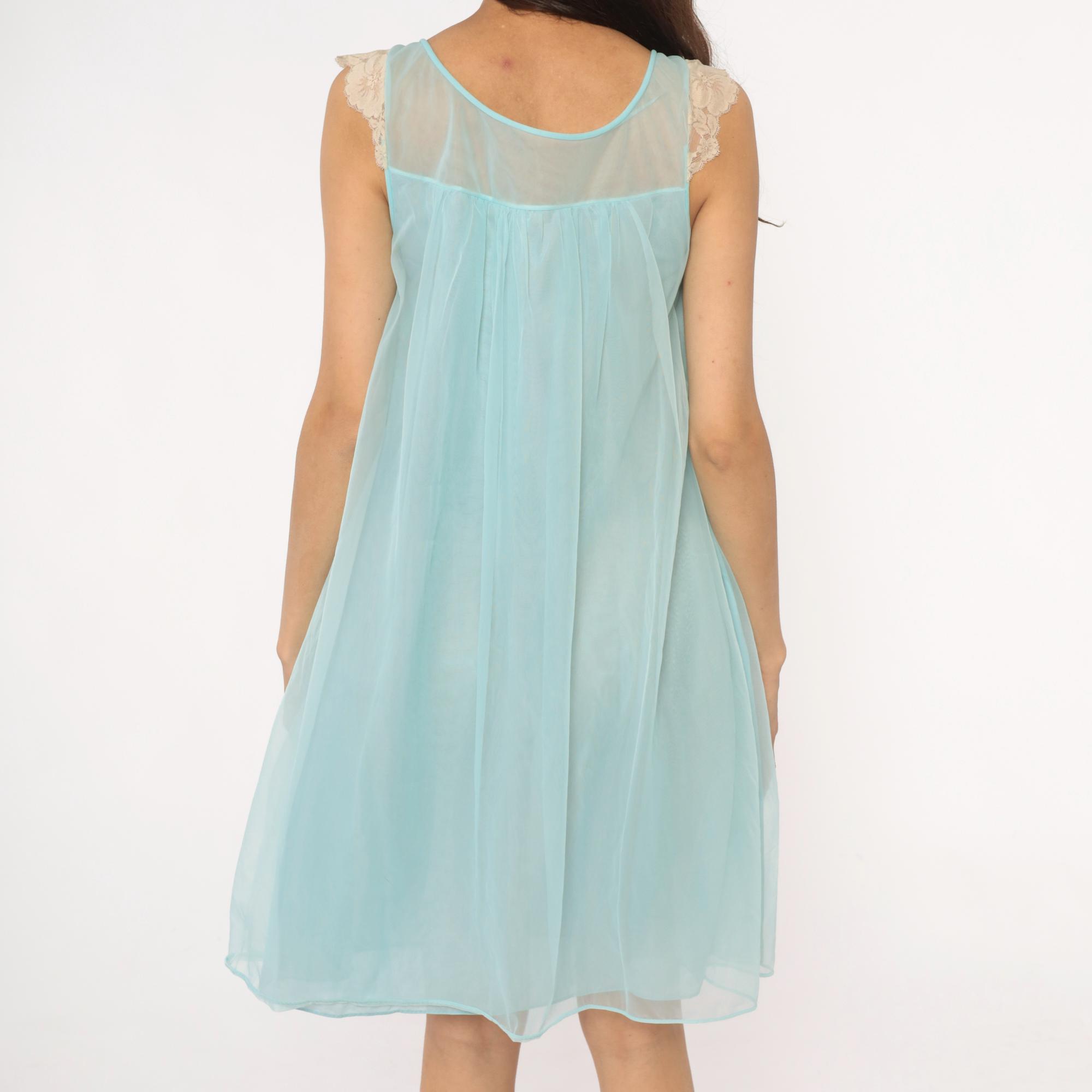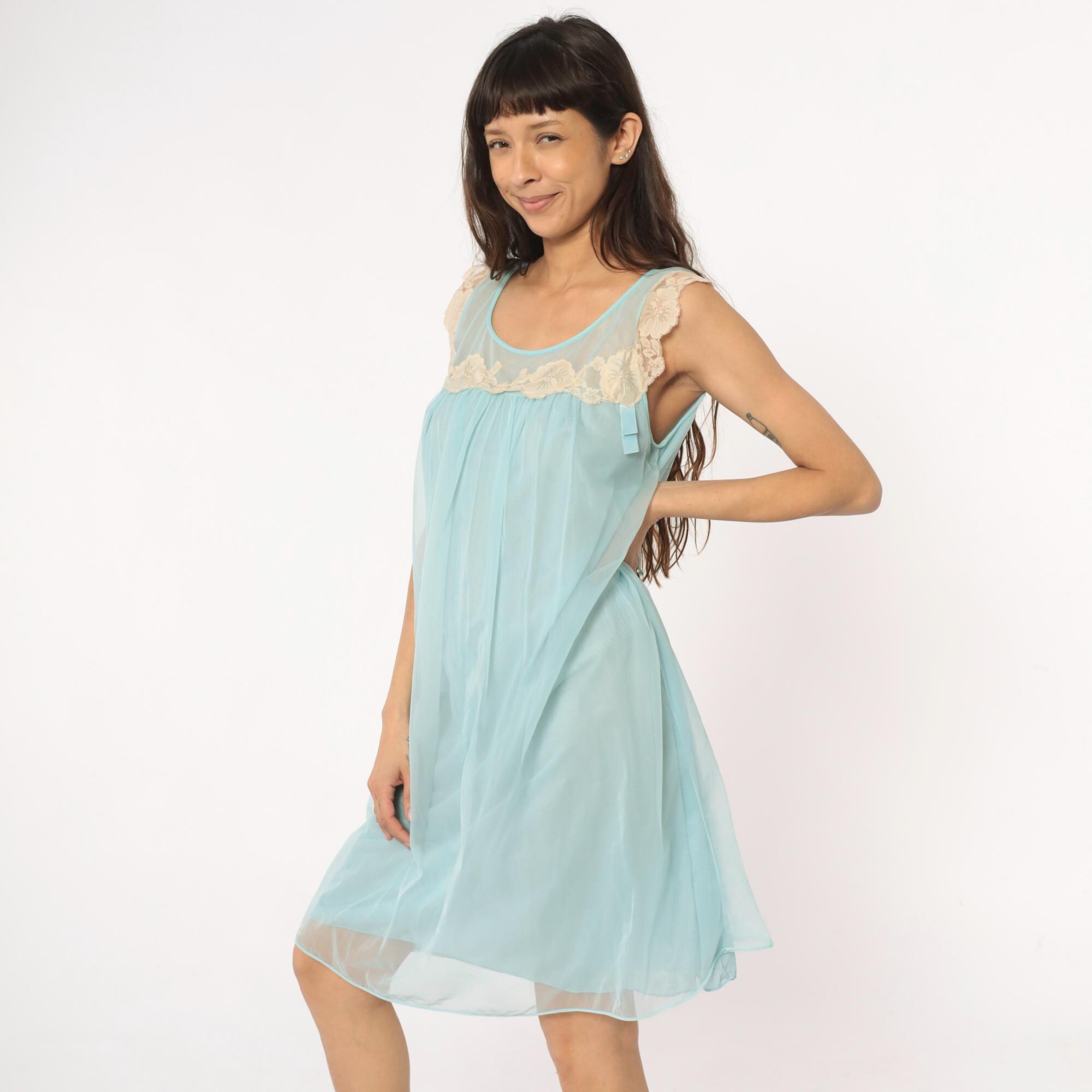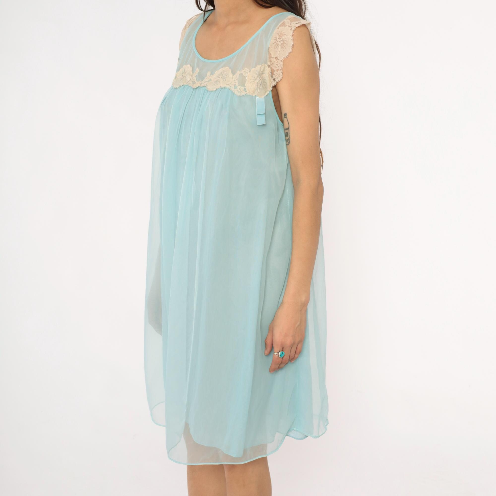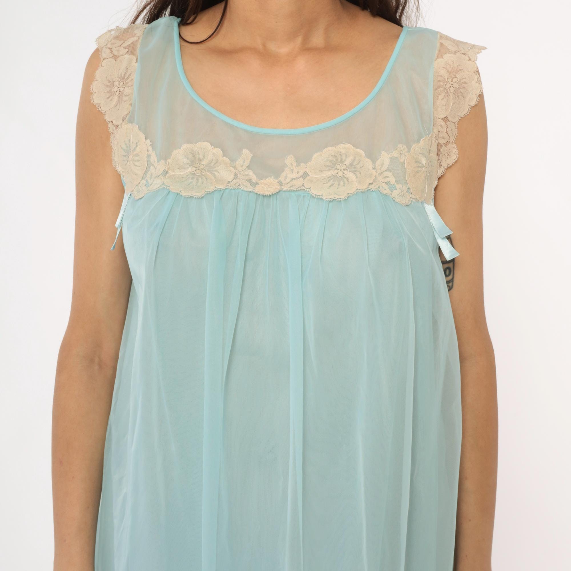 70s aqua blue babydoll nightgown with sheer overlay and cream lace trim along neckline and shoulders. Sleeveless design with scalloped lace detail at yoke, empire waist with gathered skirt, ribbon tie accent at chest.