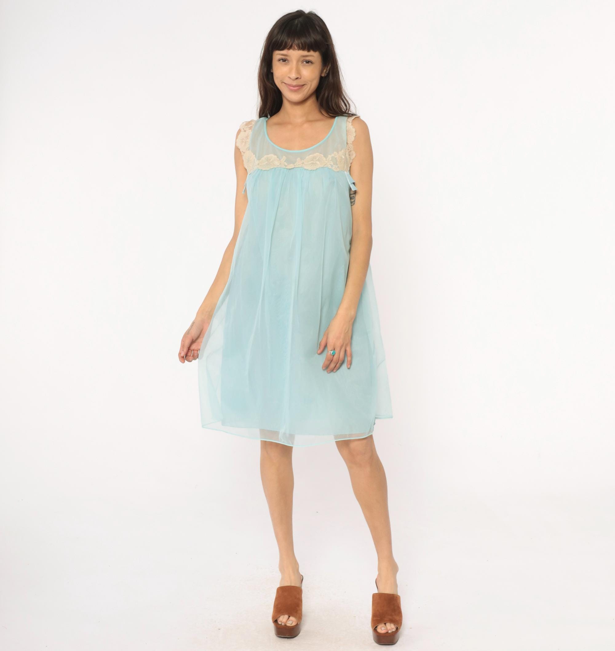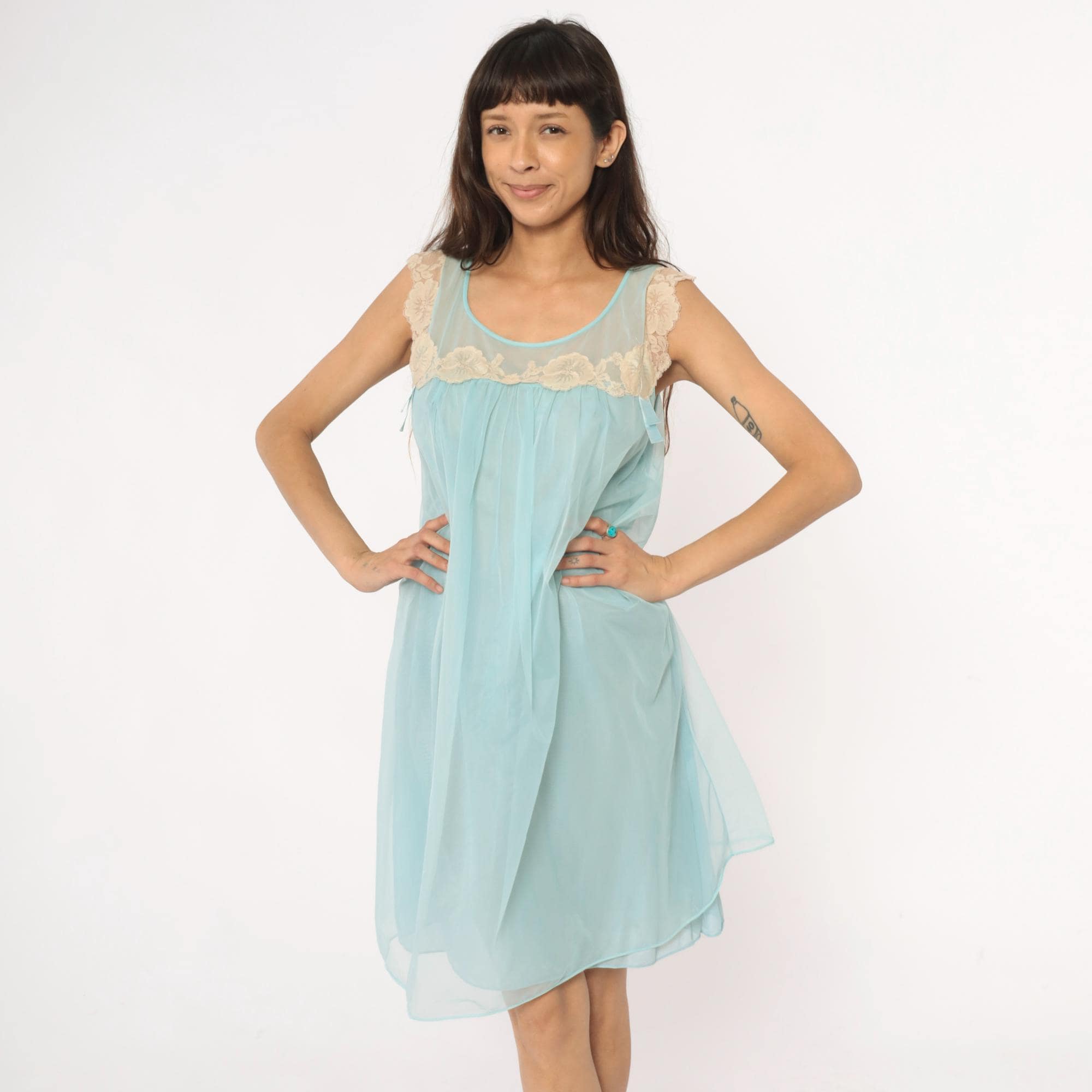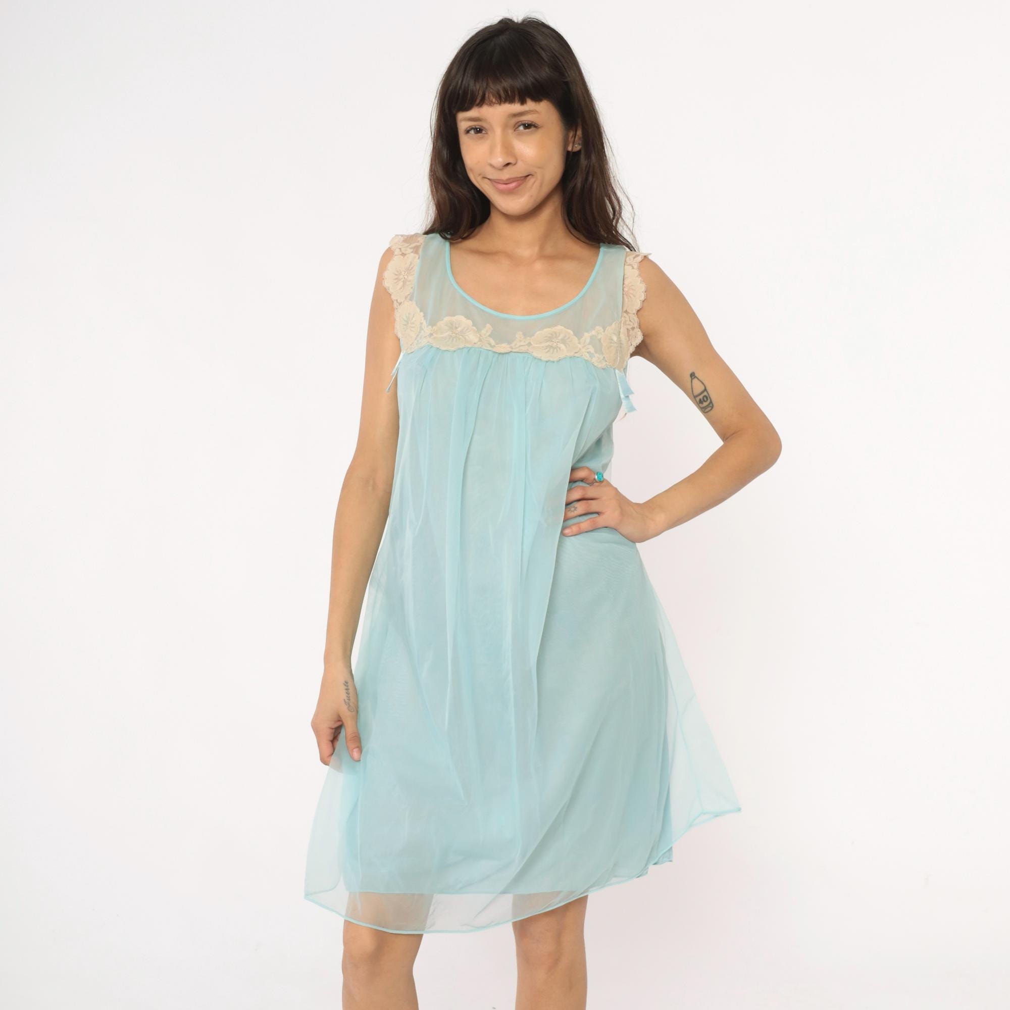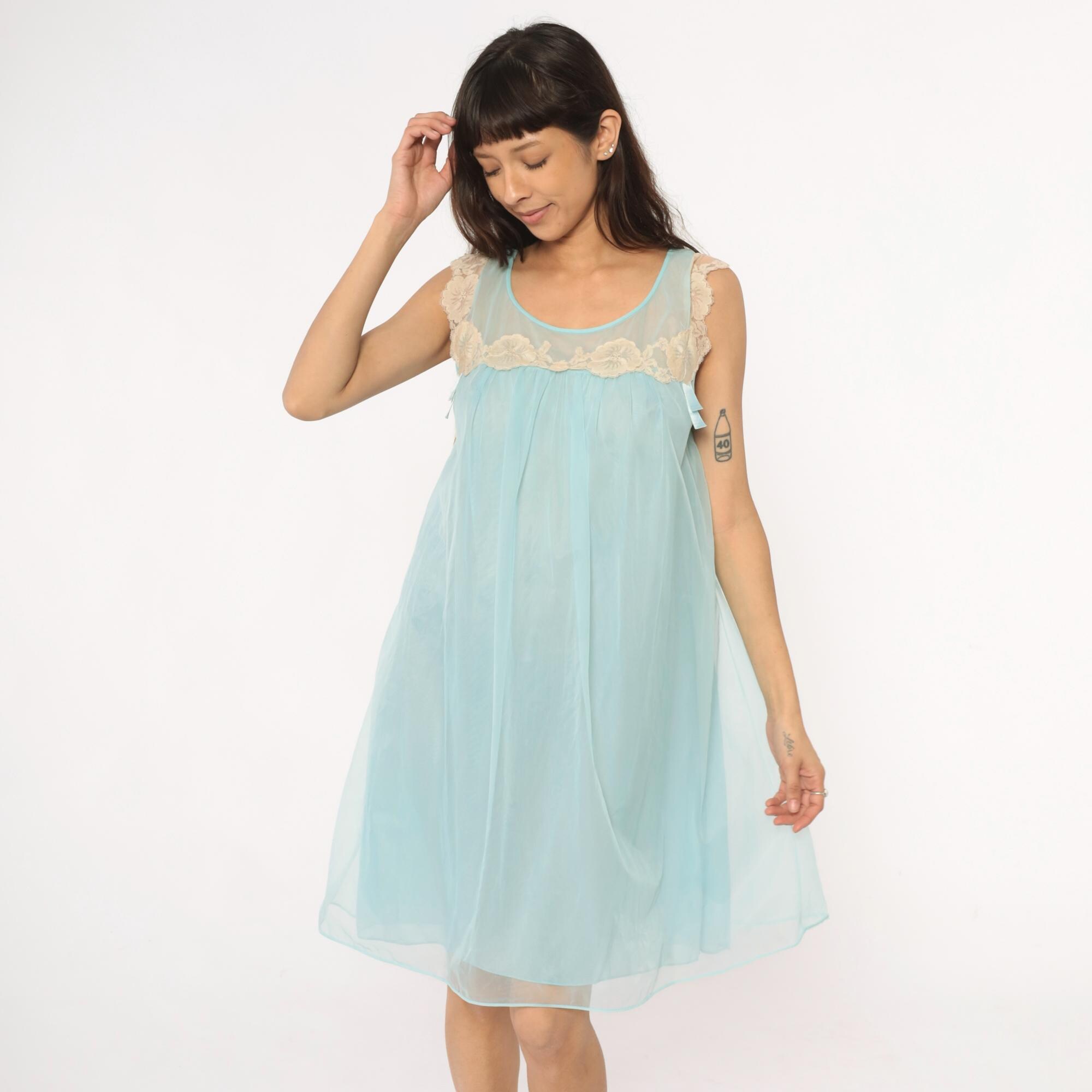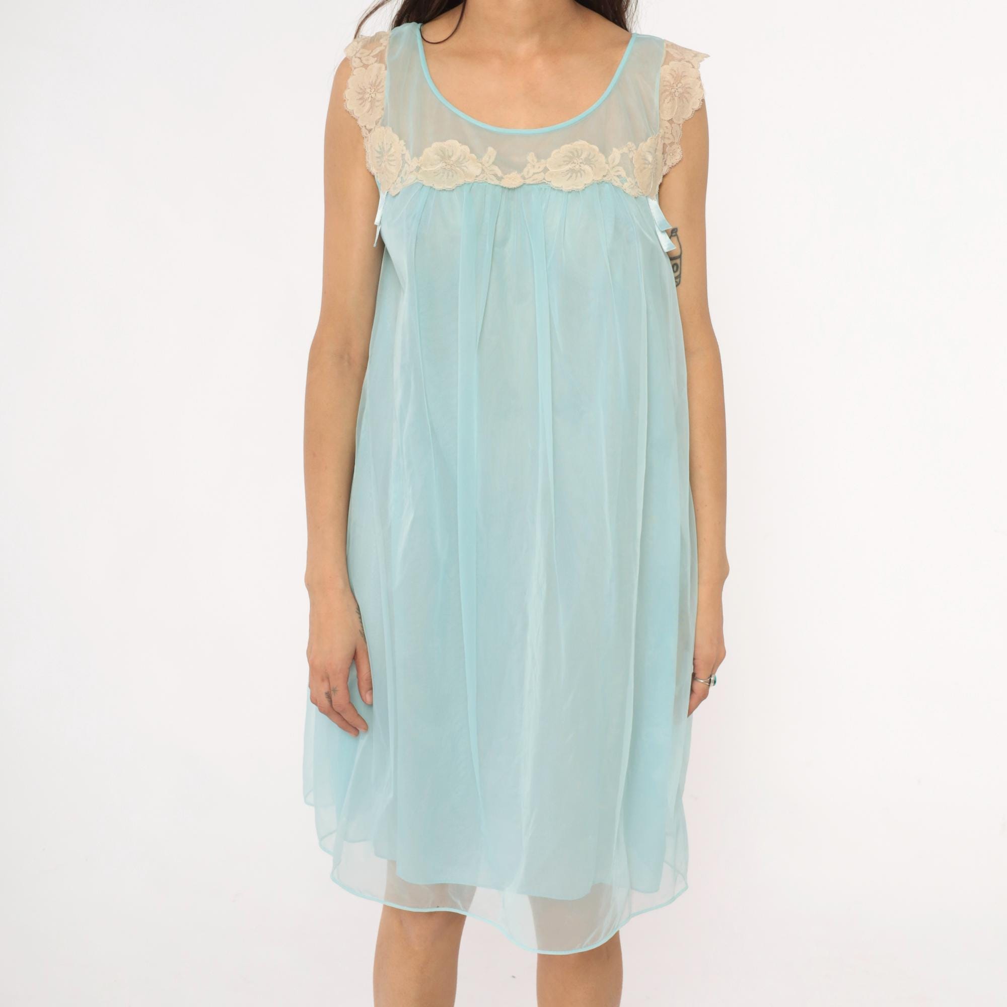 70s aqua blue babydoll nightgown with sheer overlay and cream lace trim along neckline and shoulders. Sleeveless design with scalloped lace detail at yoke, empire waist with gathered skirt, ribbon tie accent at chest.