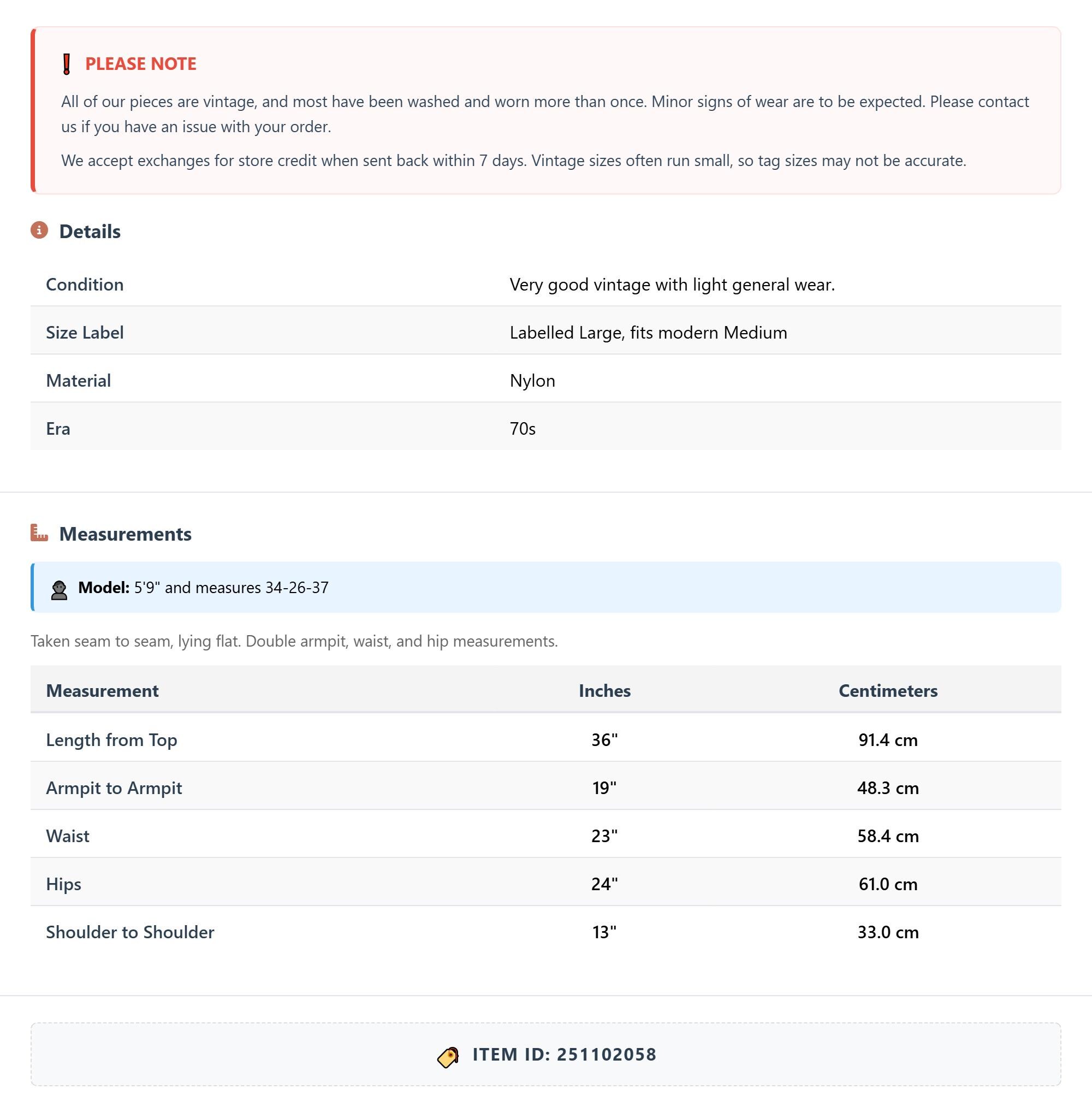 All of our pieces are vintage, and most have been washed and worn more than once. Minor signs of wear are to be expected. Please contact us if you have an issue with your order. We accept exchanges for store credit when sent back within 7 days.
