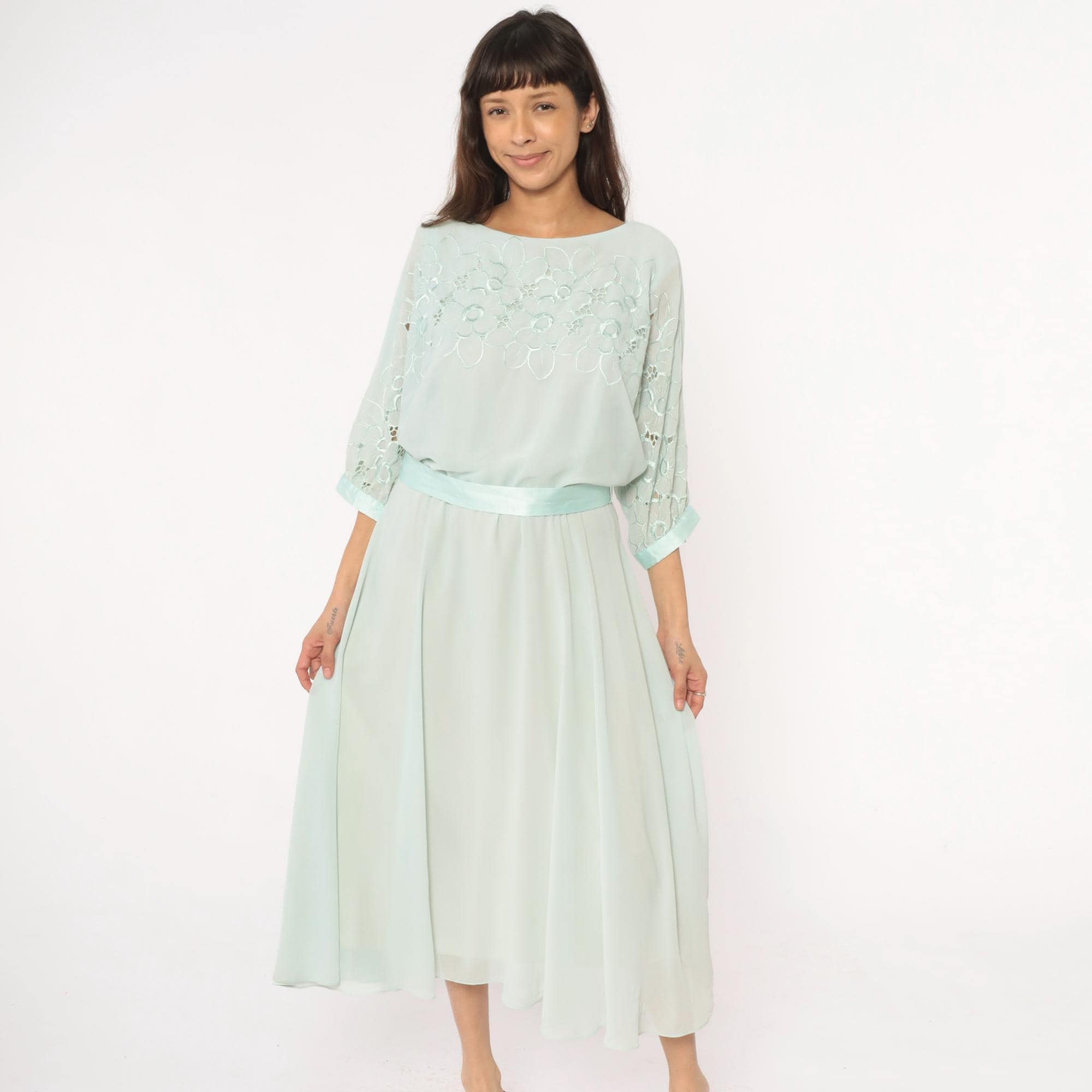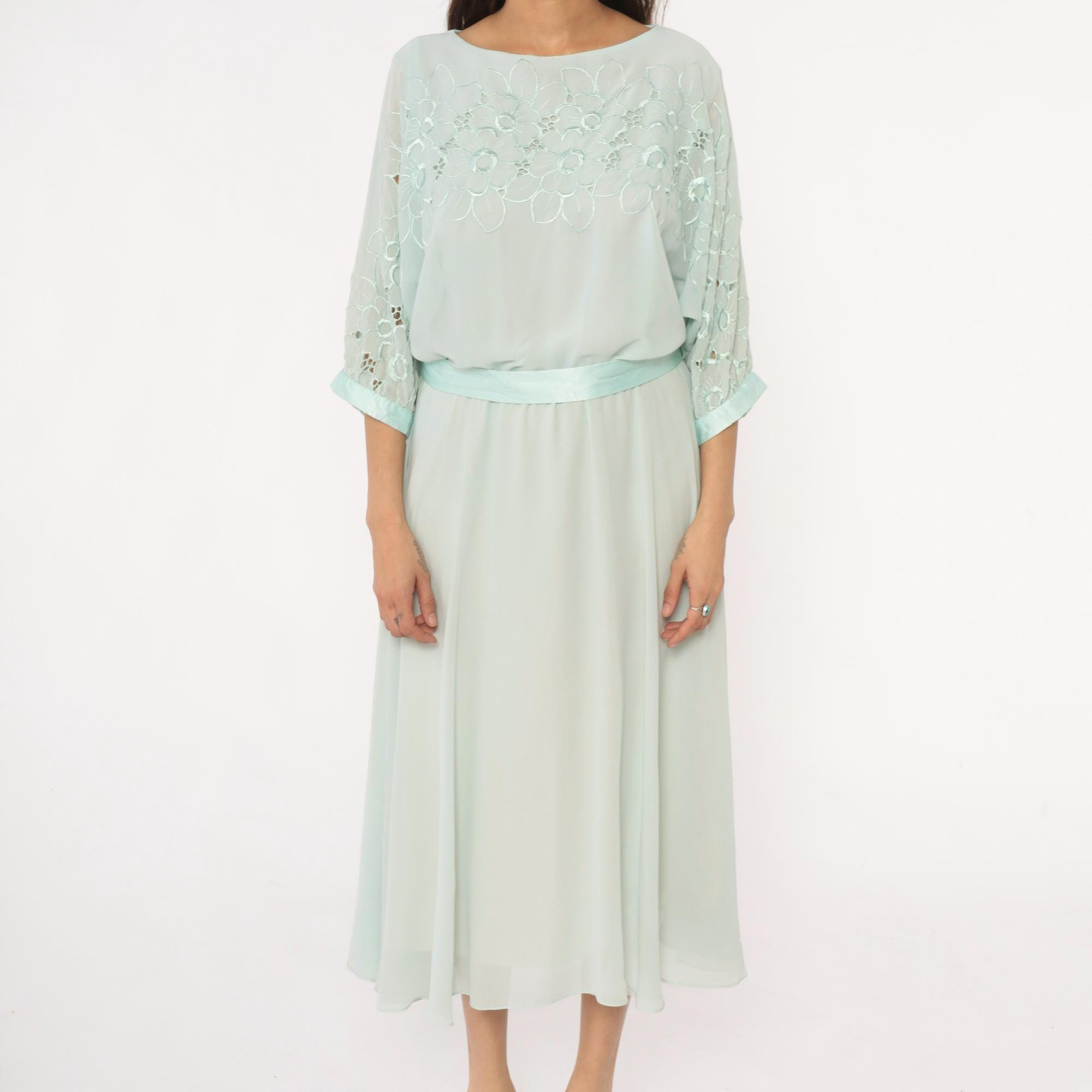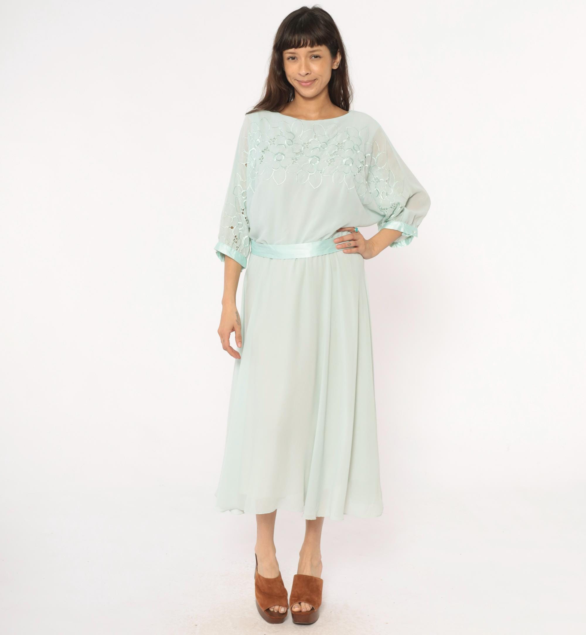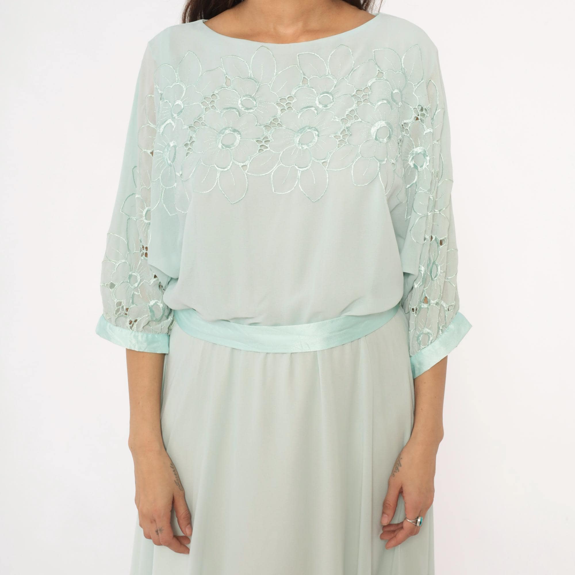 80s seafoam green midi dress from Ursula with sheer embroidered floral cutout detail across the upper bodice and sleeves. Three-quarter sleeves with button tab detail, matching fabric belt, back zipper closure.