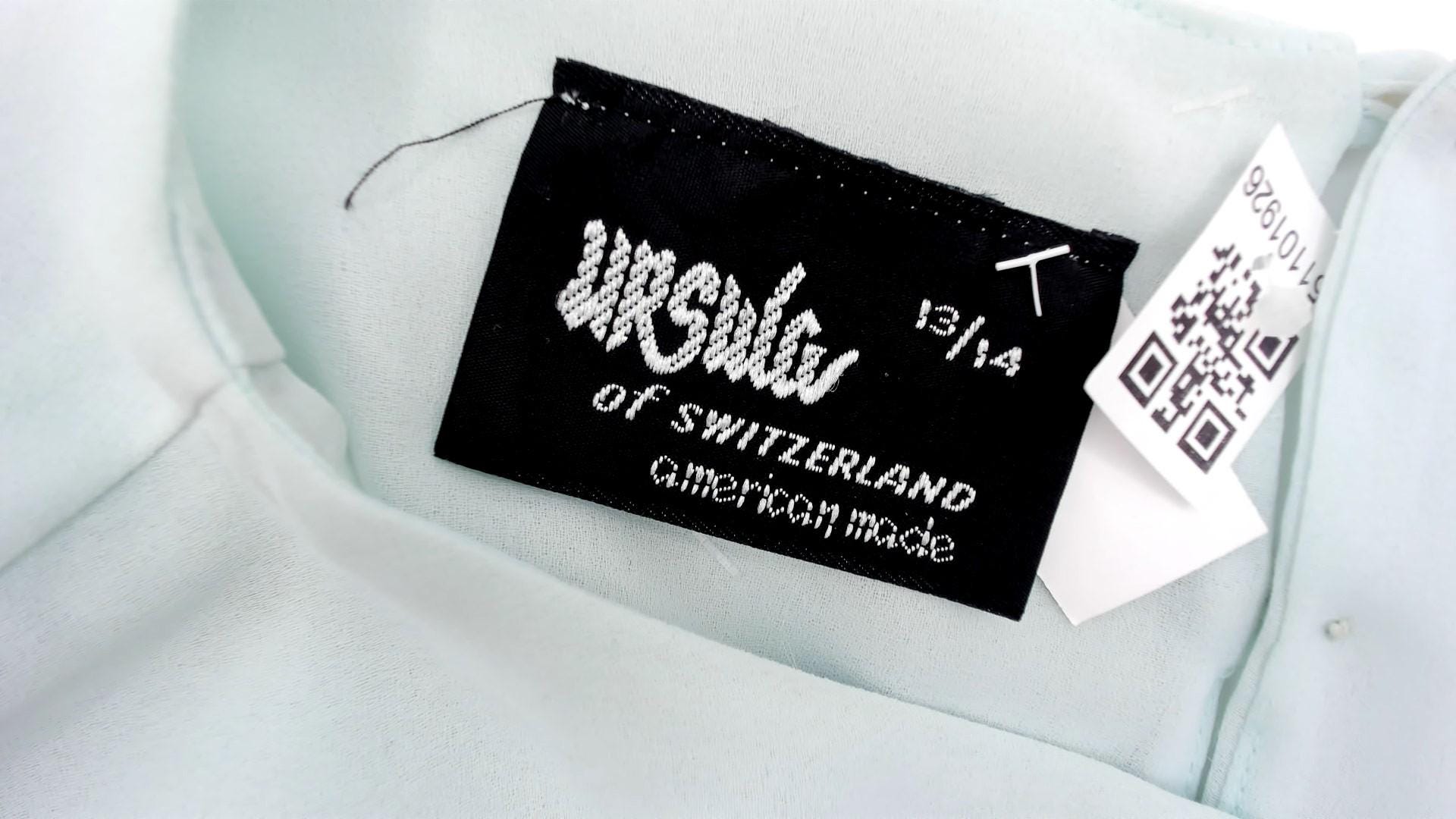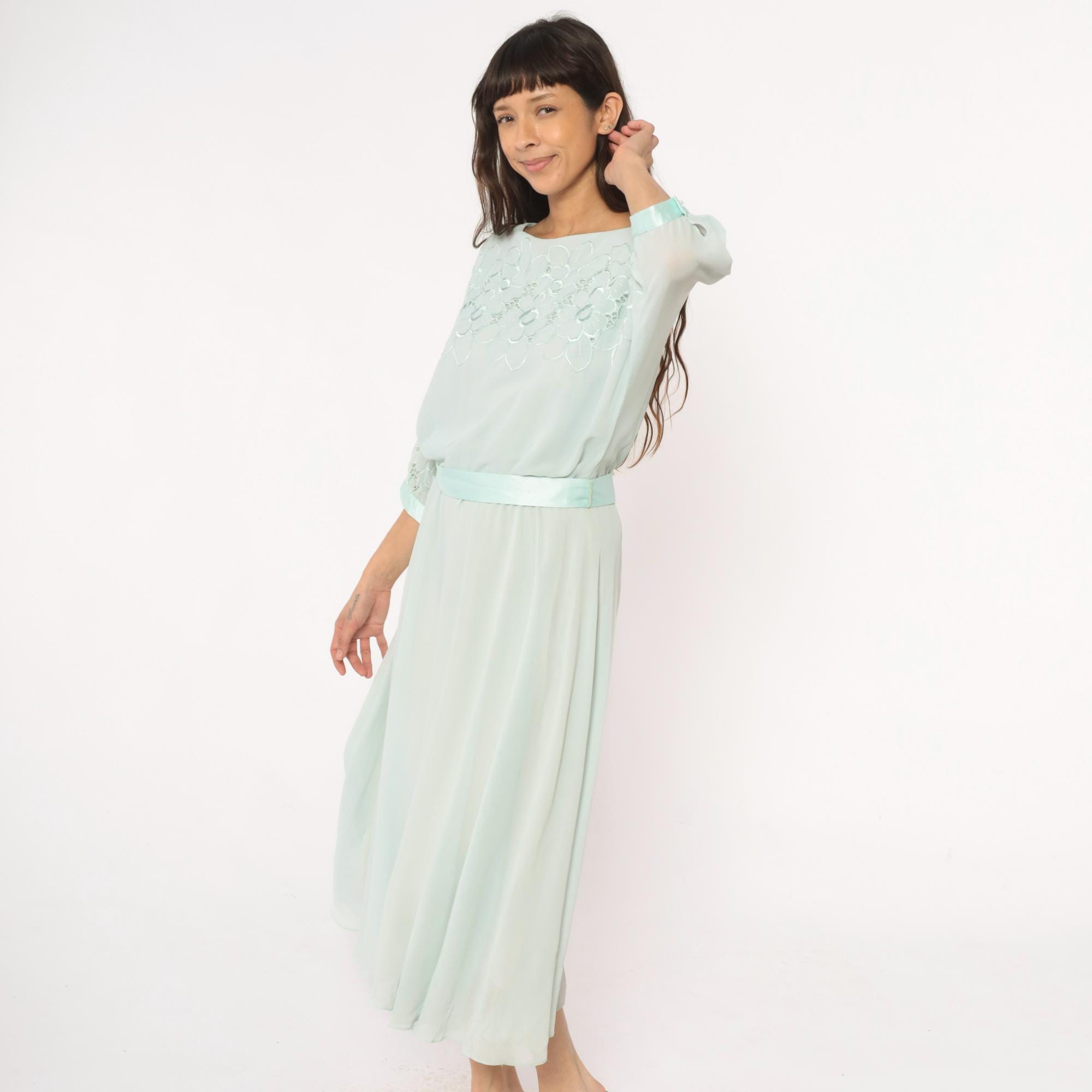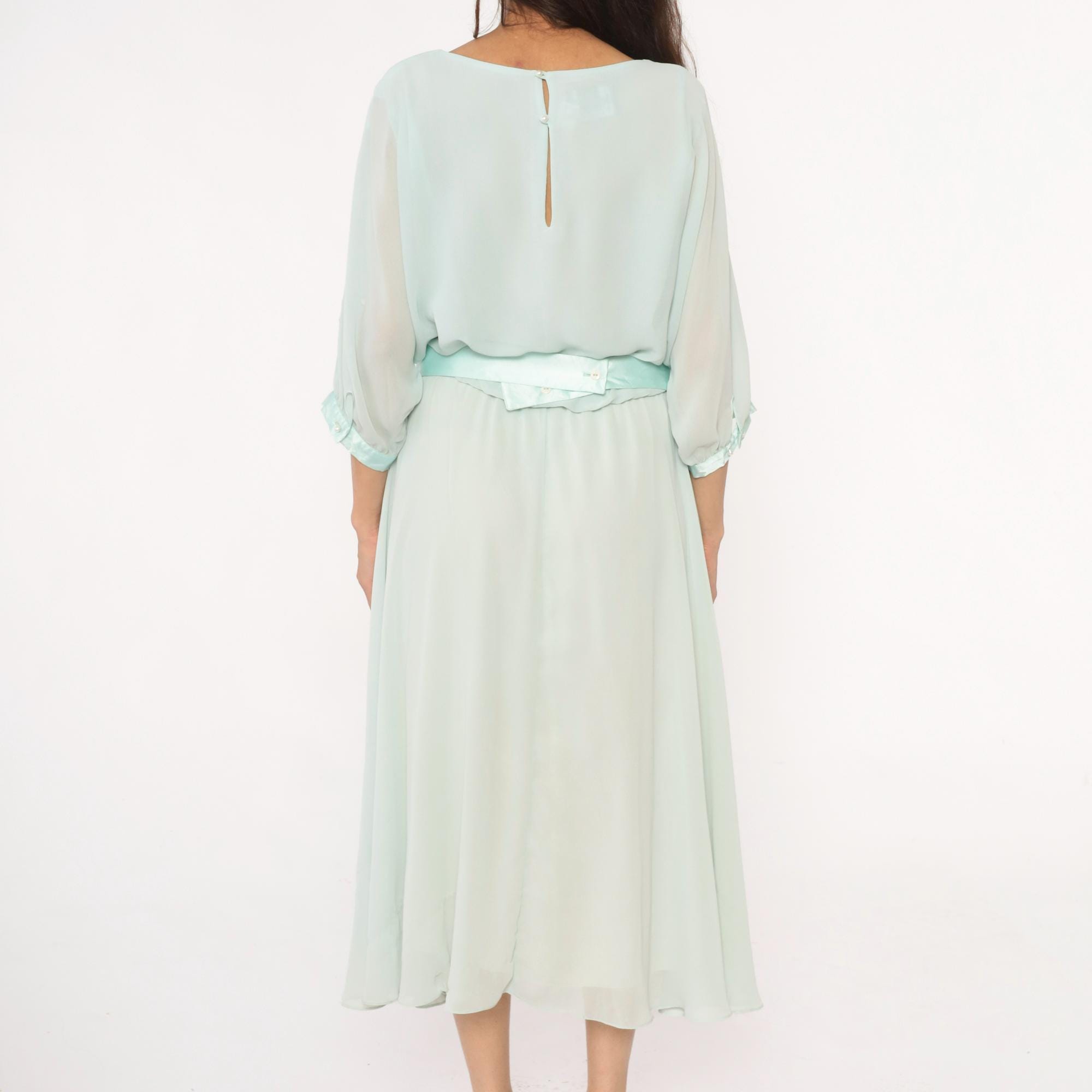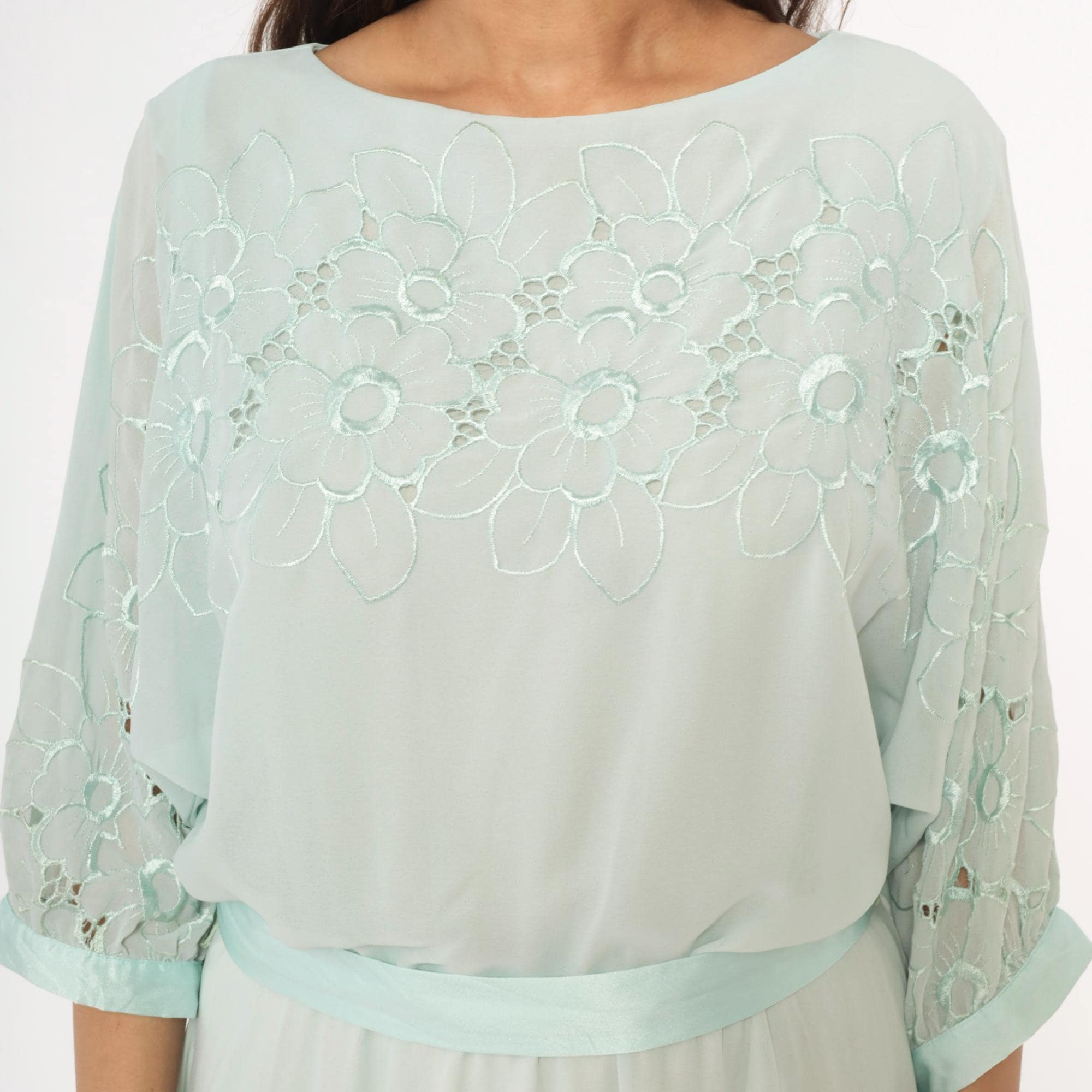 80s seafoam green midi dress from Ursula with sheer embroidered floral cutout detail across the upper bodice and sleeves. Three-quarter sleeves with button tab detail, matching fabric belt, back zipper closure.