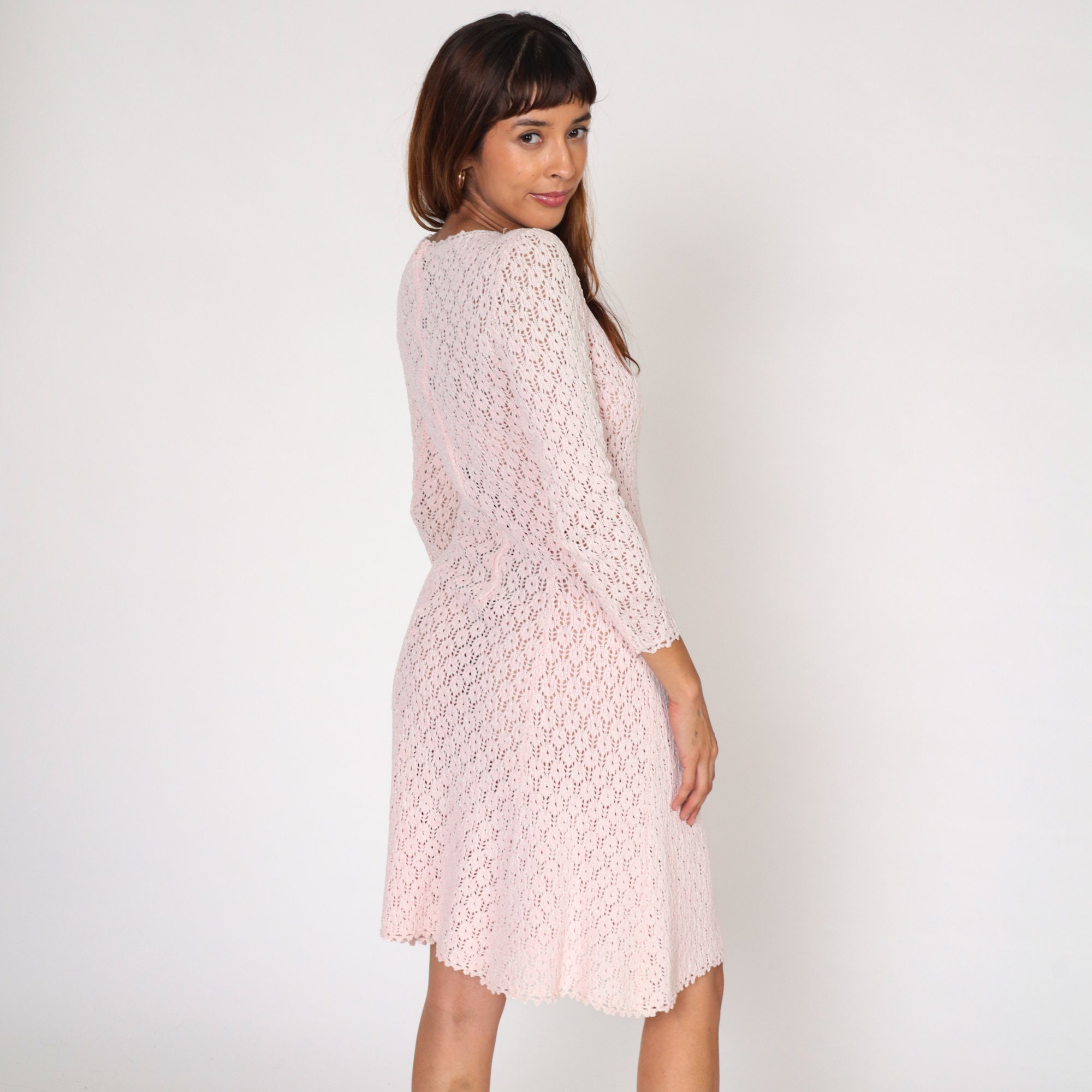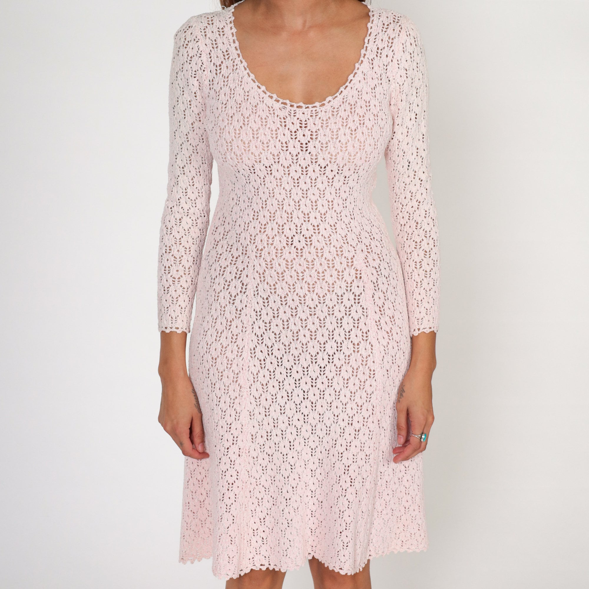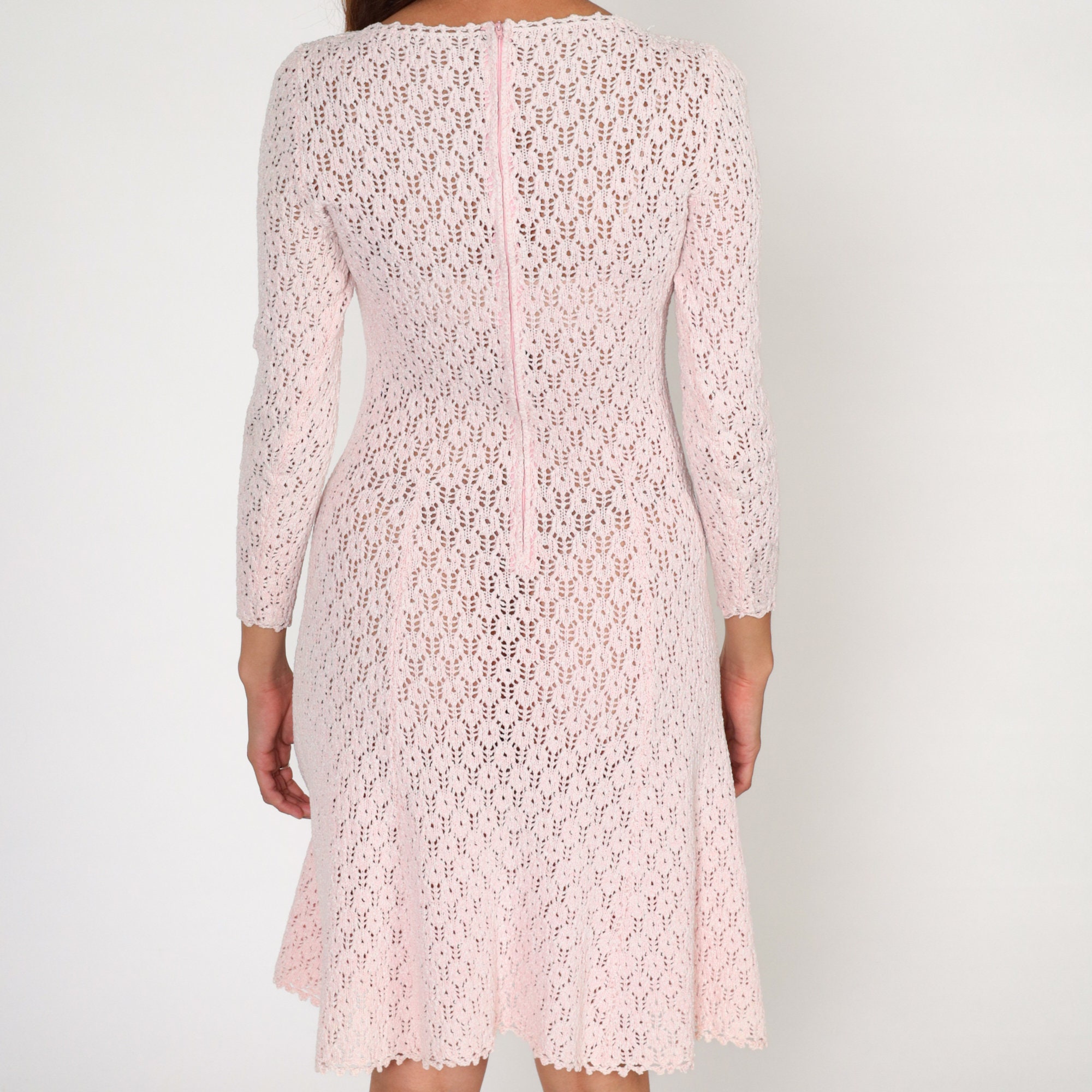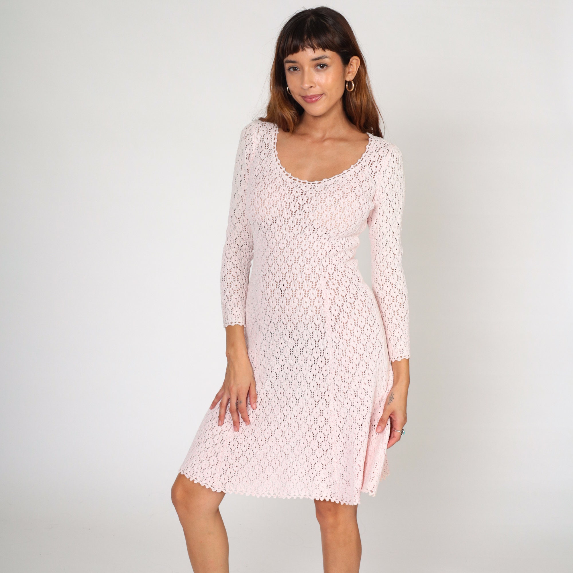 Vintage 70s dress in sheer pink crochet with a scoop neck and long sleeves. Knee length.