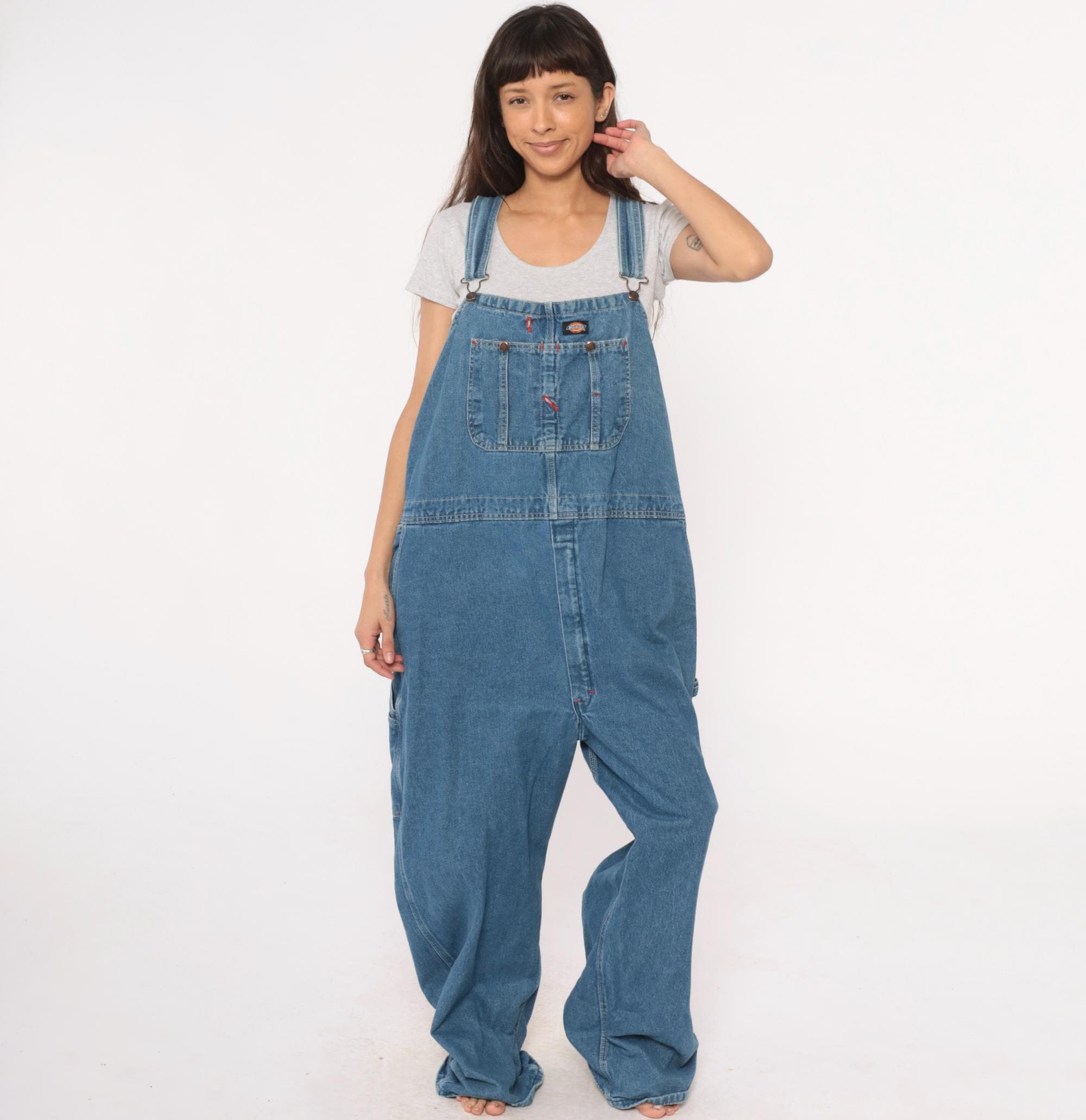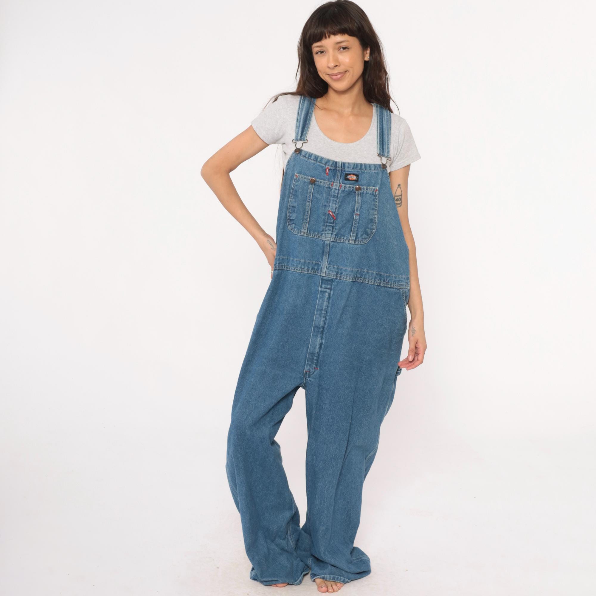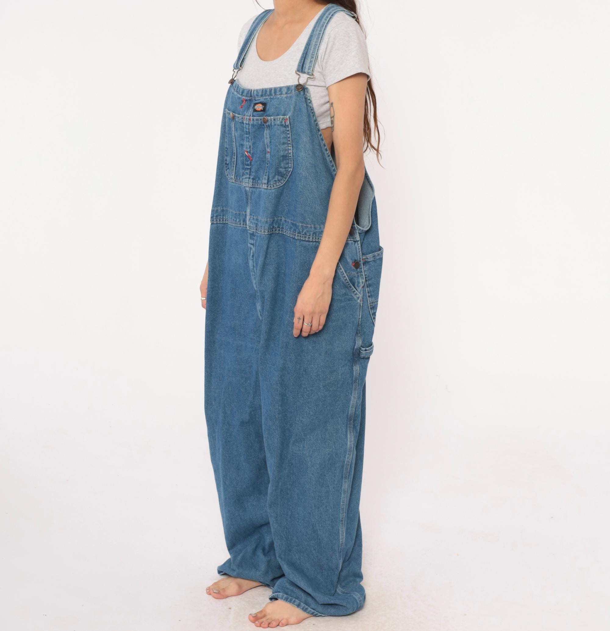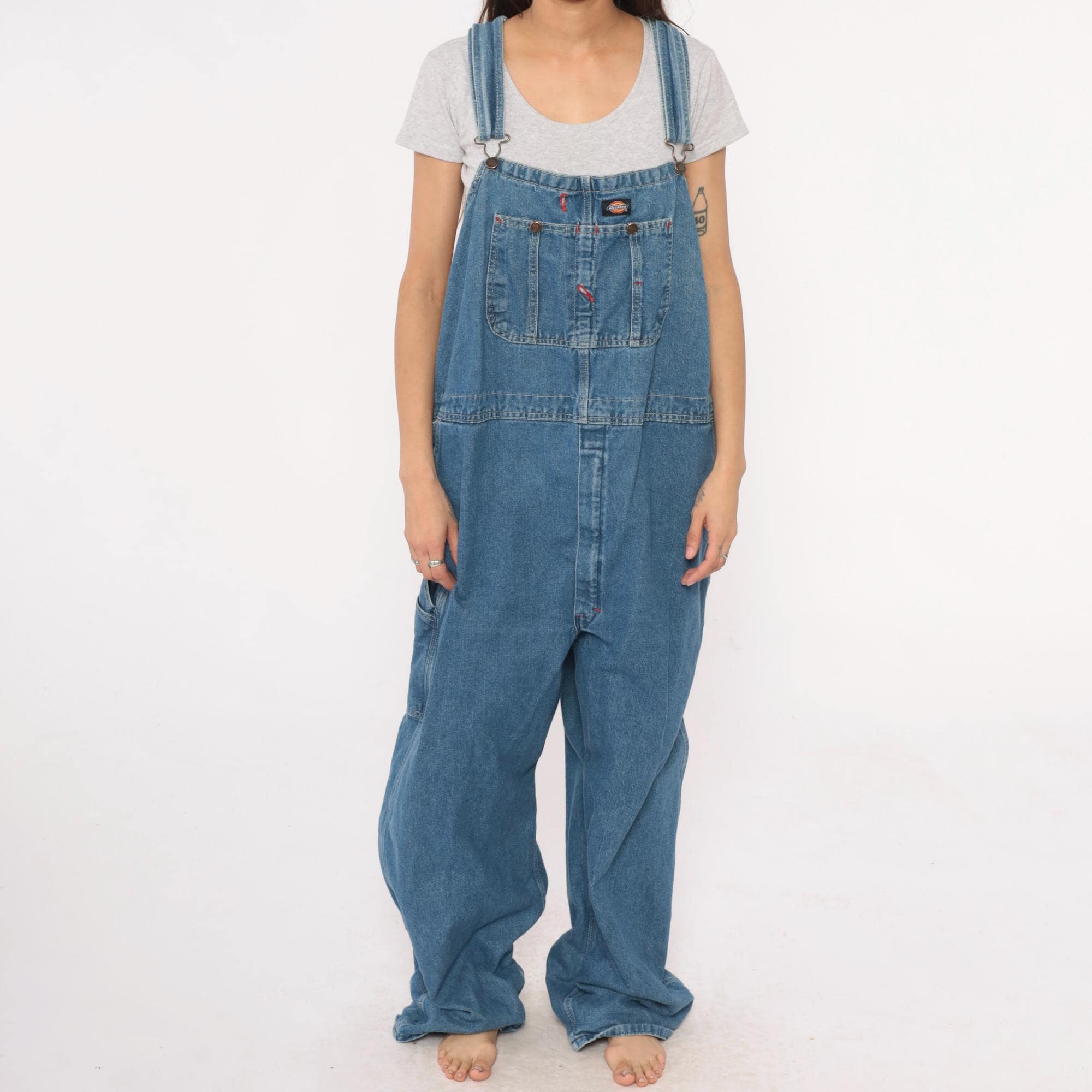 90s Dickies denim overalls in medium blue wash with adjustable straps and metal clip closures. Large front bib pocket with multiple compartments, side cargo pockets, and back pockets. Full length with straight wide legs and button fly closure.