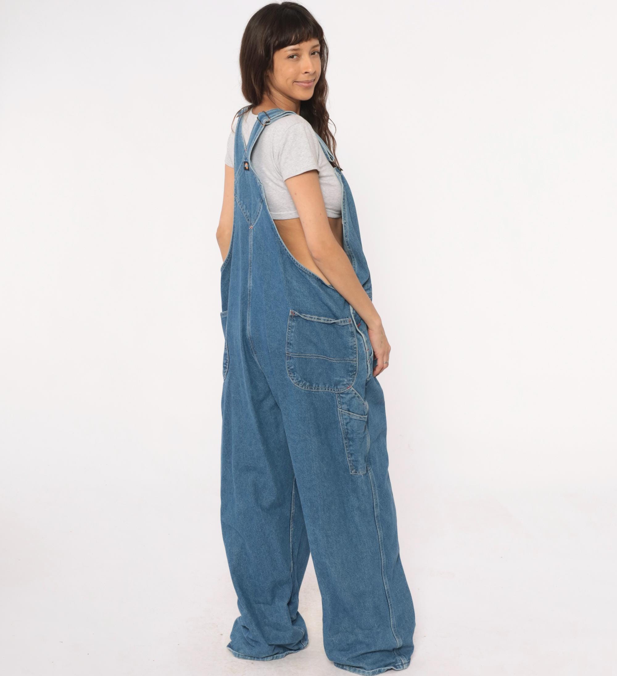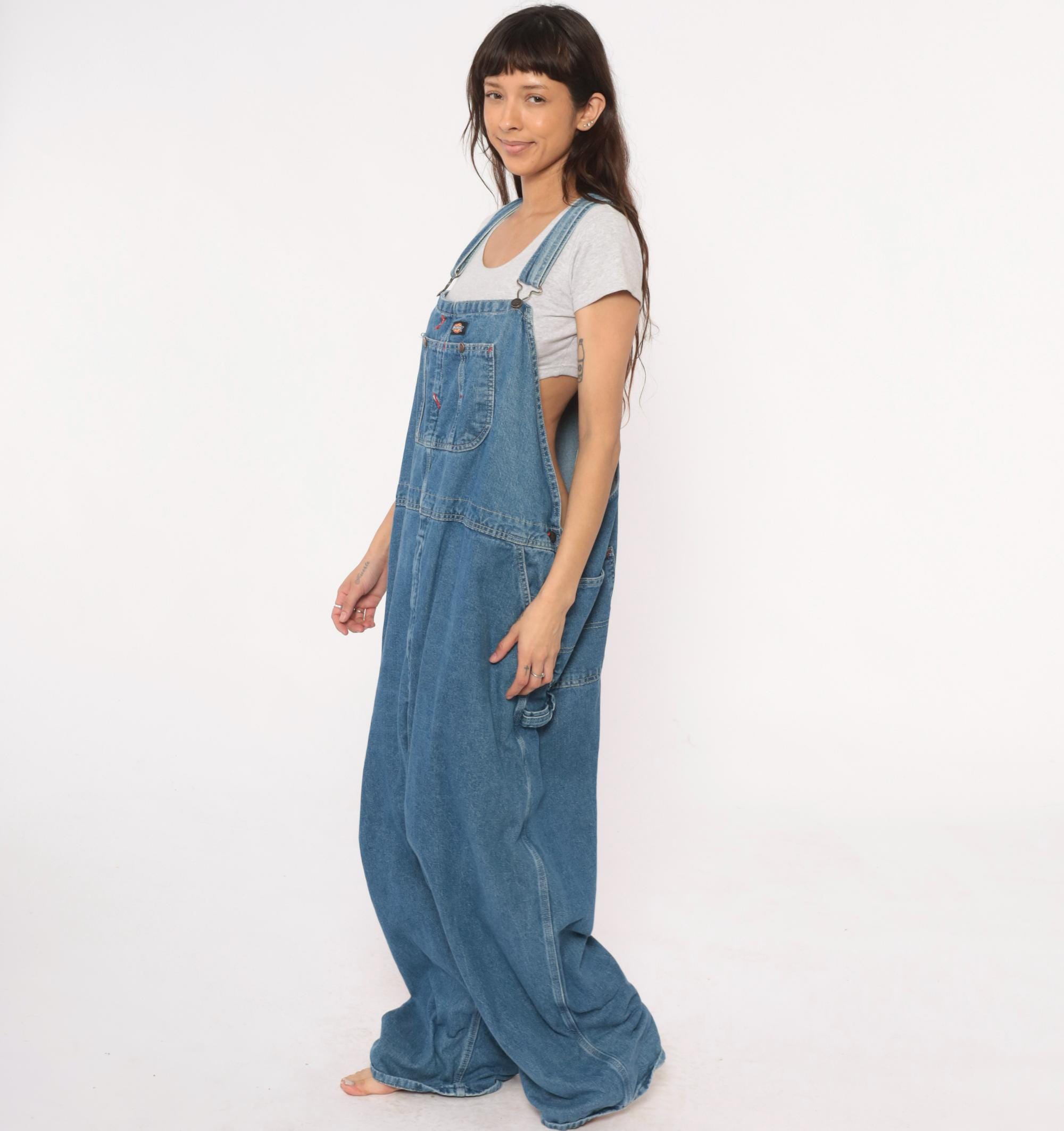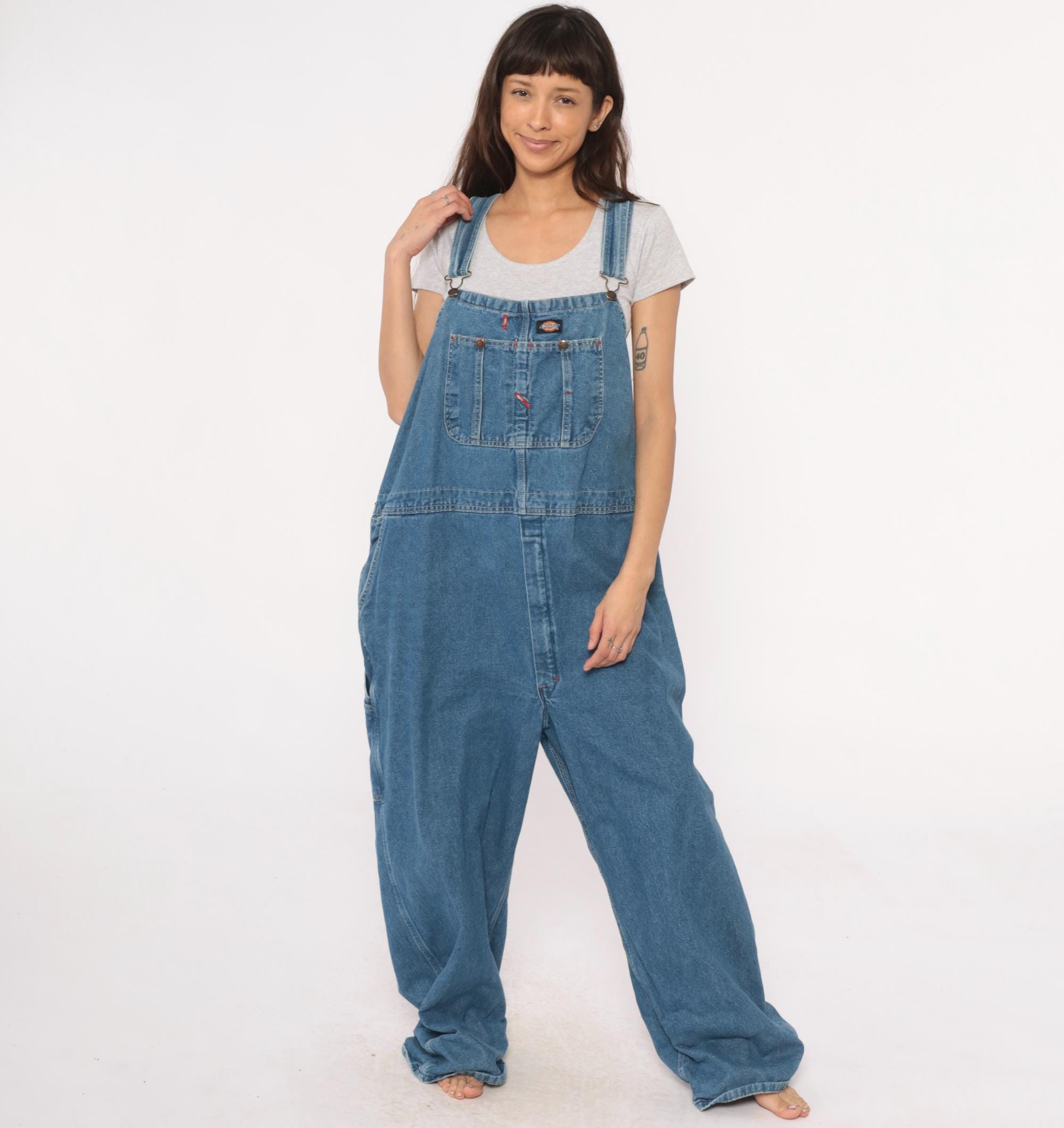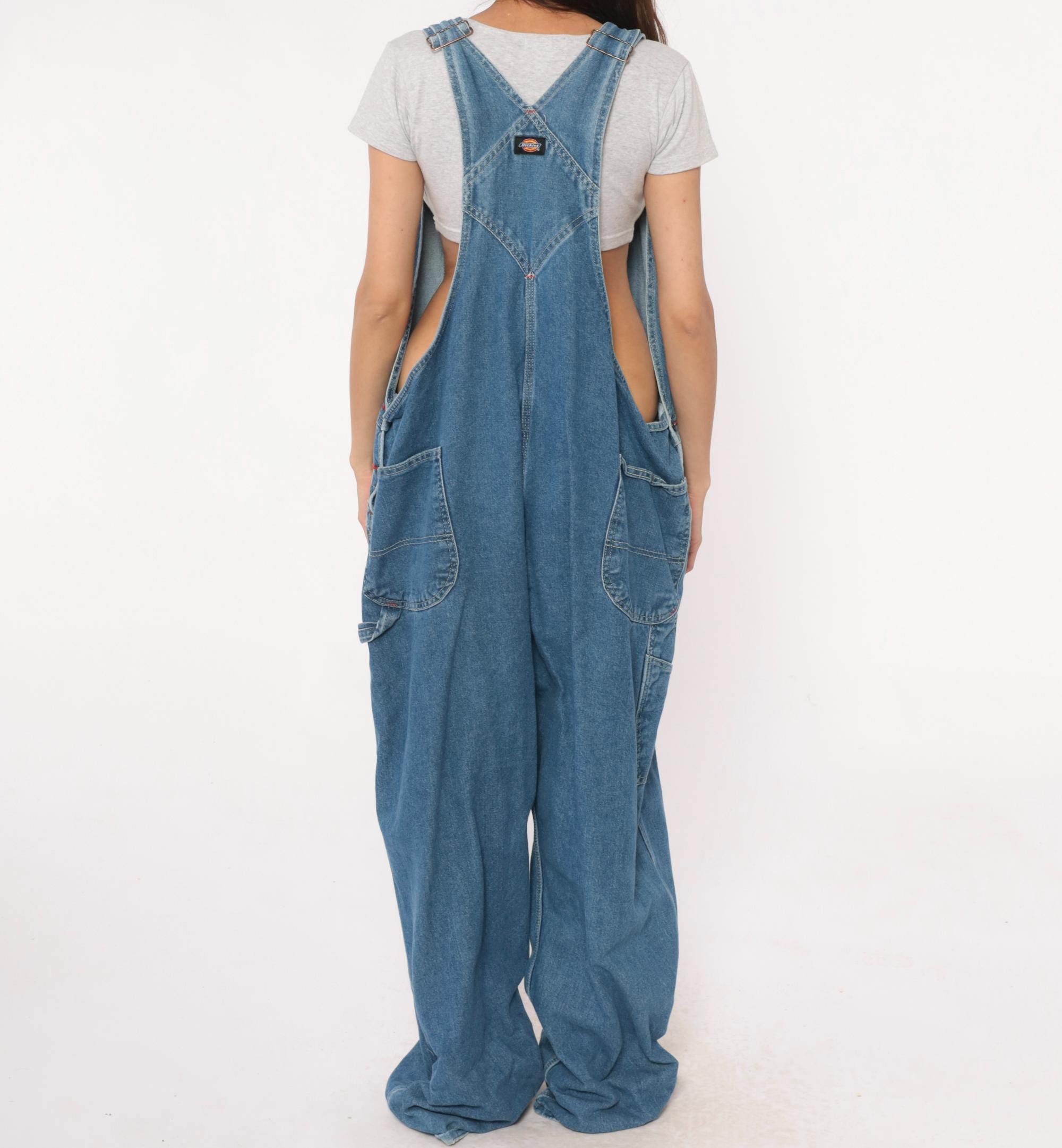90s Dickies denim overalls in medium blue wash with adjustable straps and metal clip closures. Large front bib pocket with multiple compartments, side cargo pockets, and back pockets. Full length with straight wide legs and button fly closure.