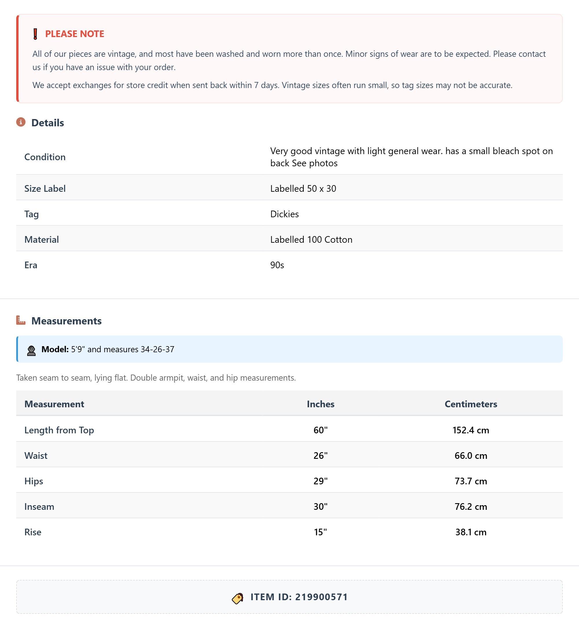 Vintage denim was usually made without any stretch, unlike modern jeans. Check the measurements to ensure proper fit, and remember to give yourself a little wiggle room in the waist and hips, depending on your preferred fit.