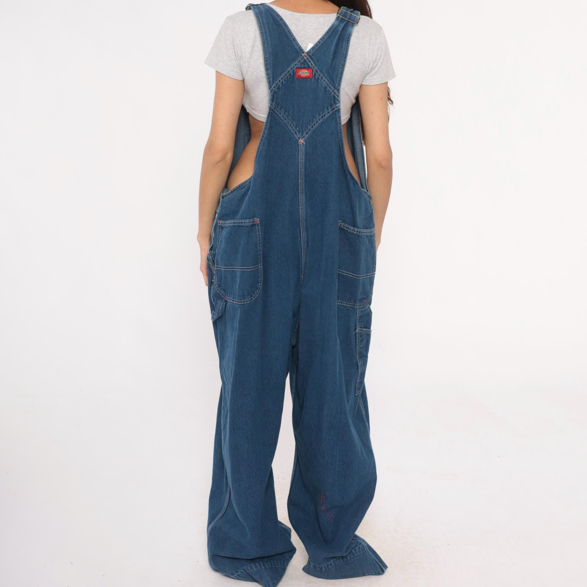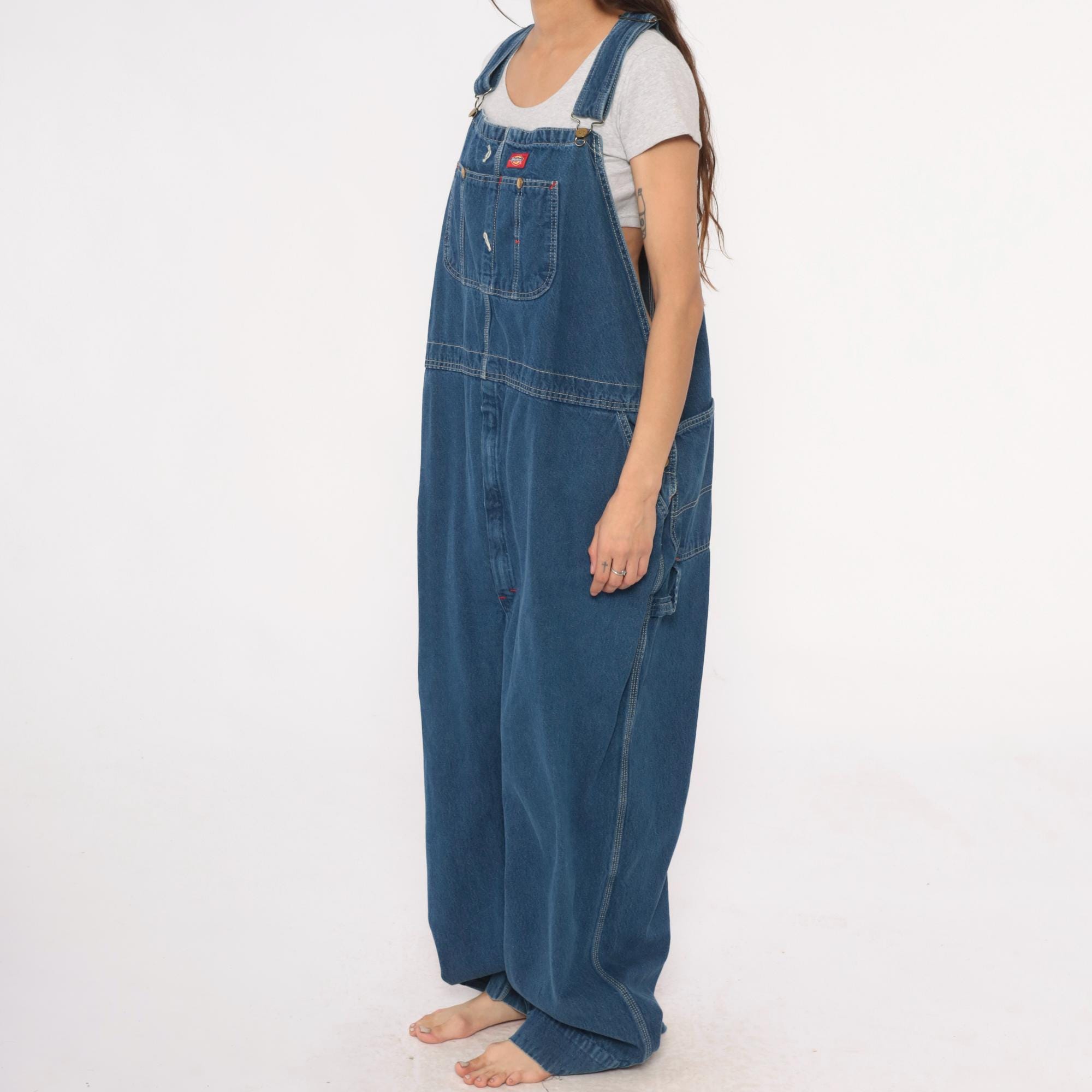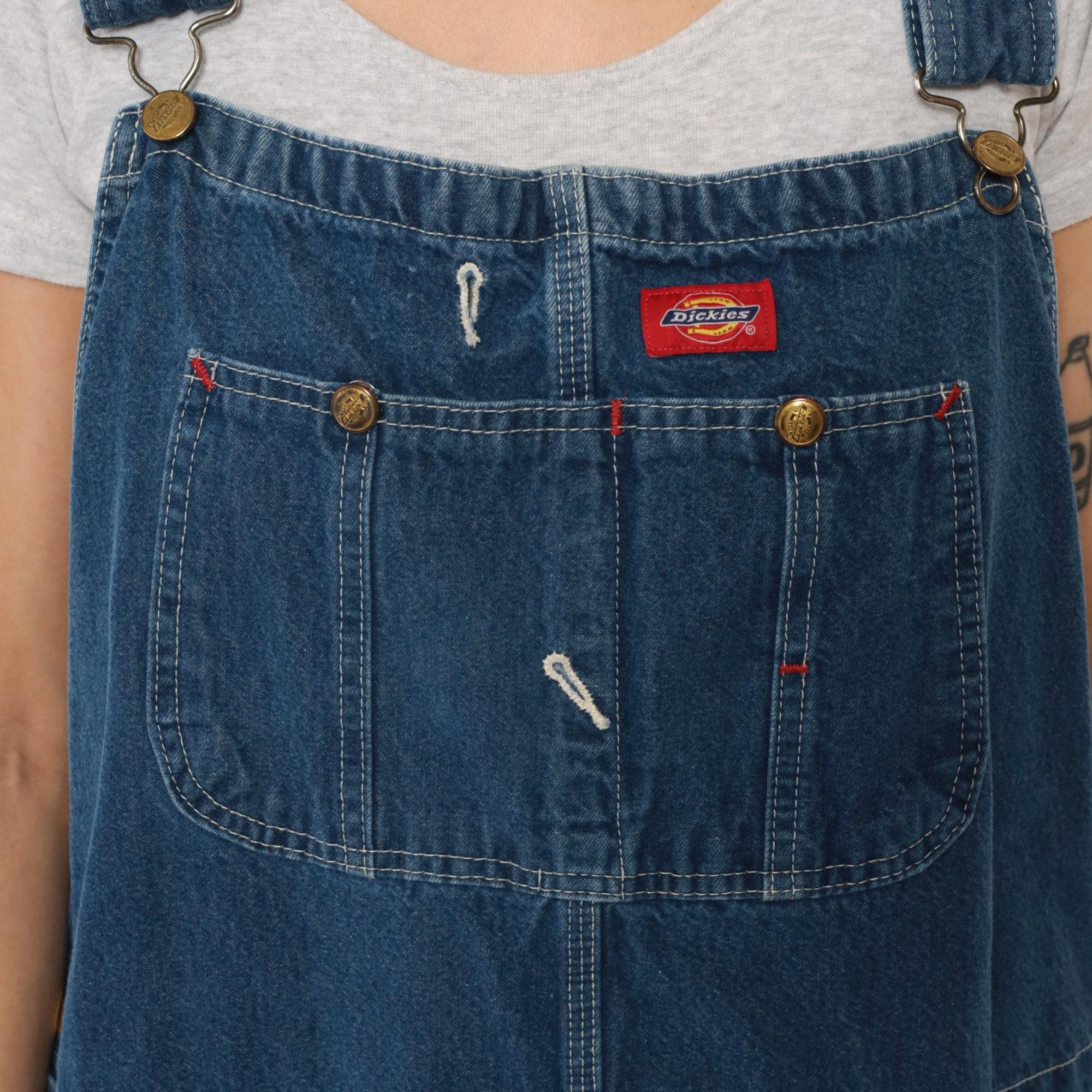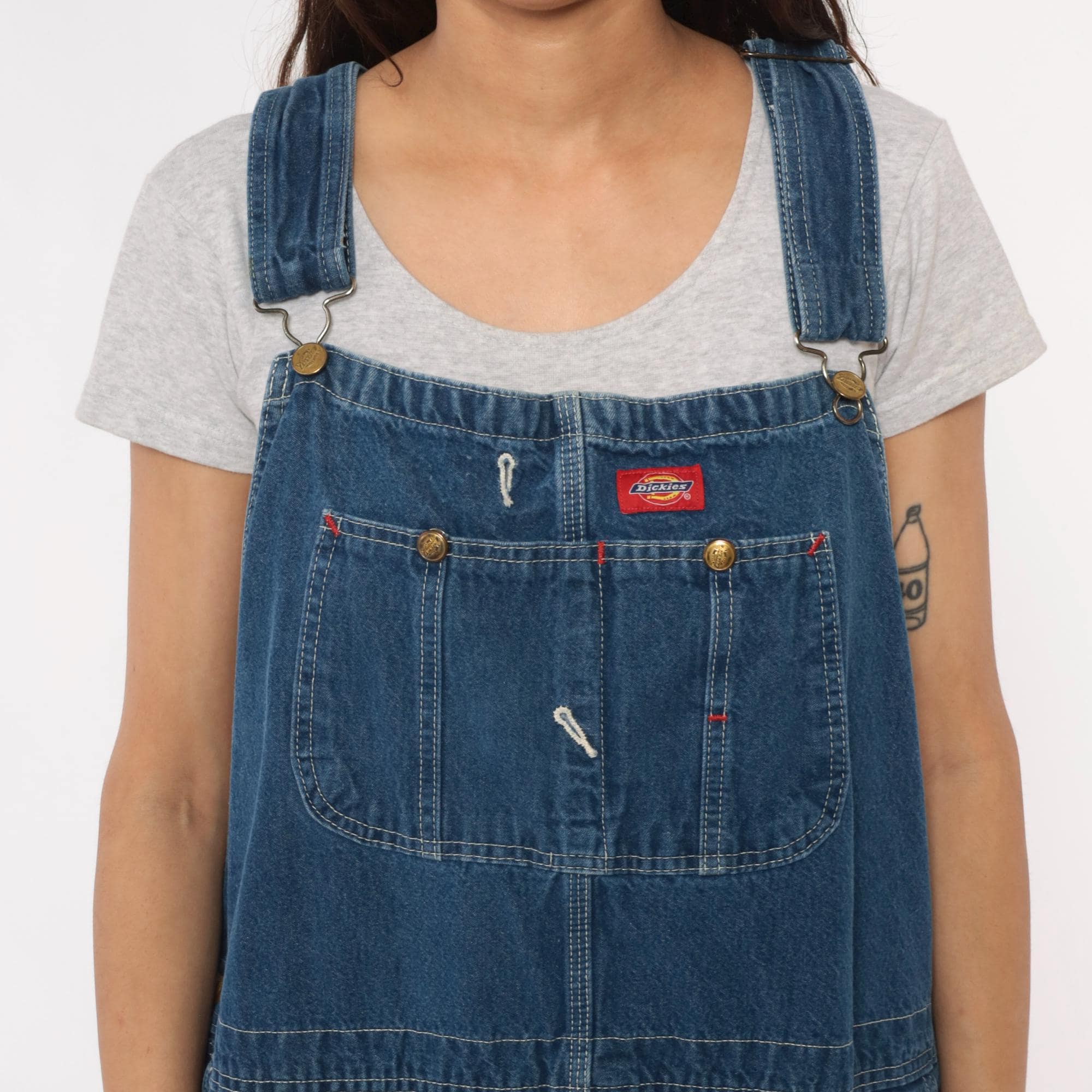 Y2K blue denim overalls from Dickies with adjustable shoulder straps and brass hardware. Red Dickies logo label on chest bib, multiple pockets including front bib pocket with brass button closures, side seam pockets, and back pockets.