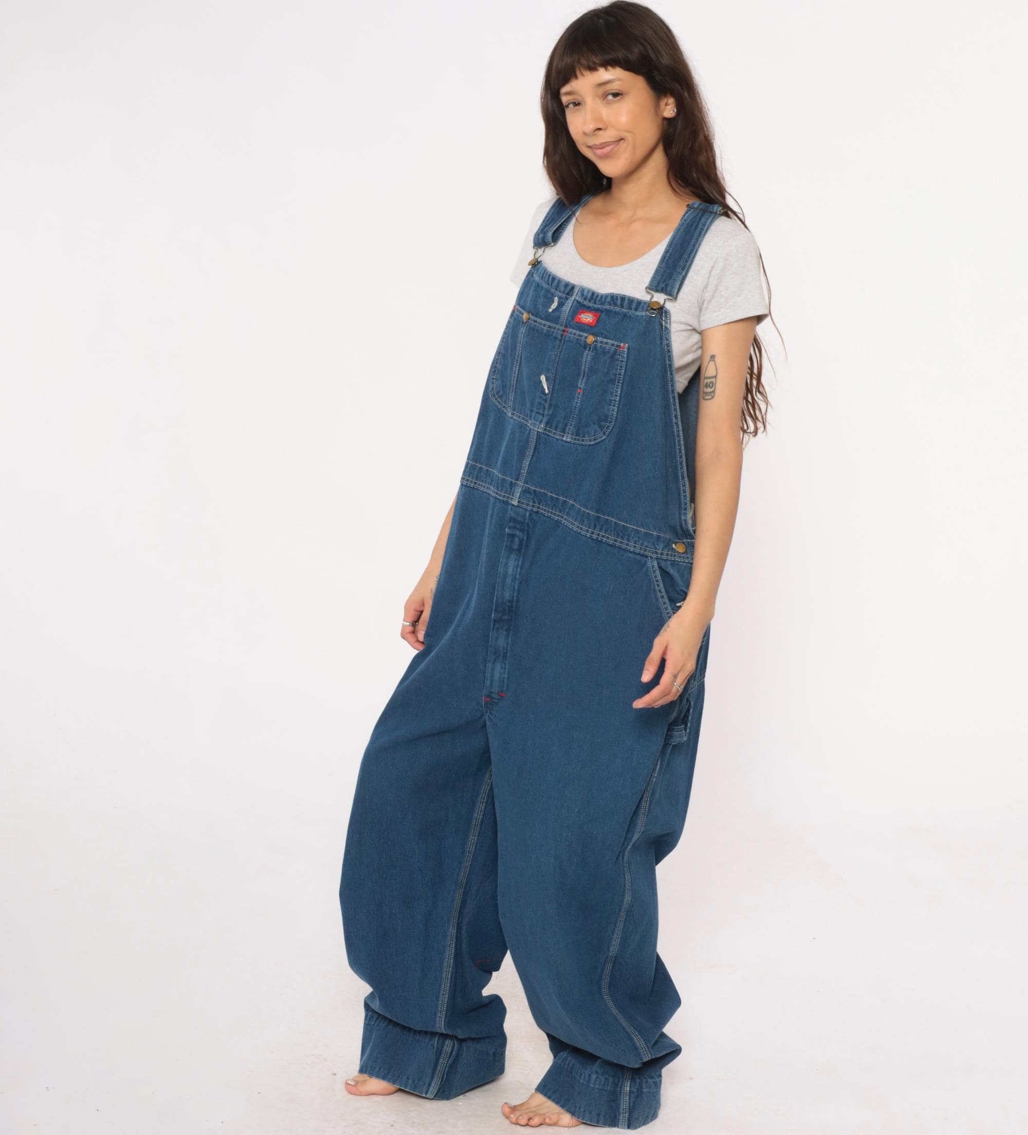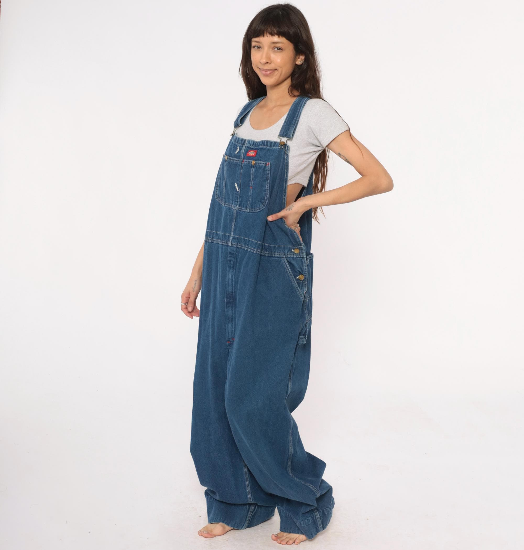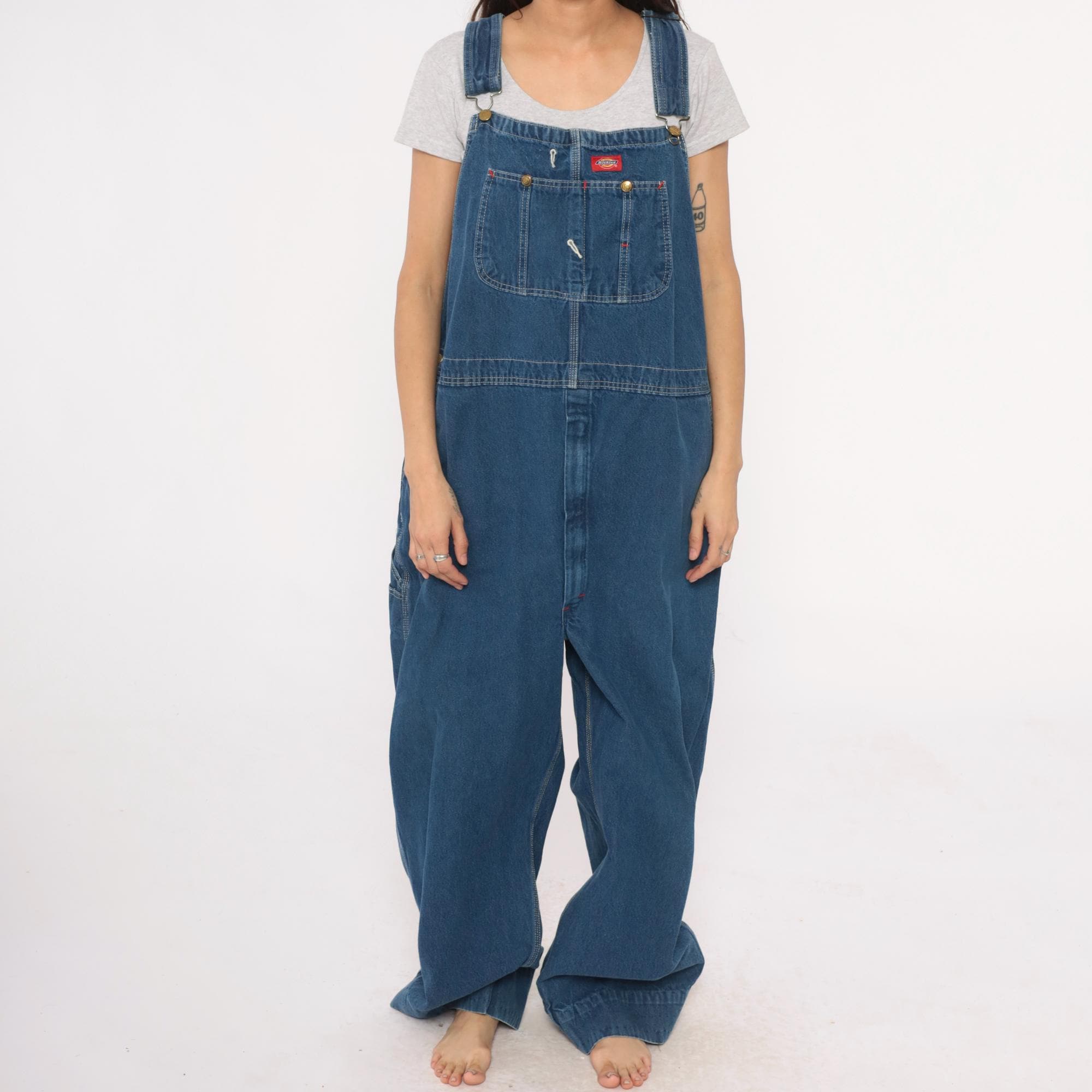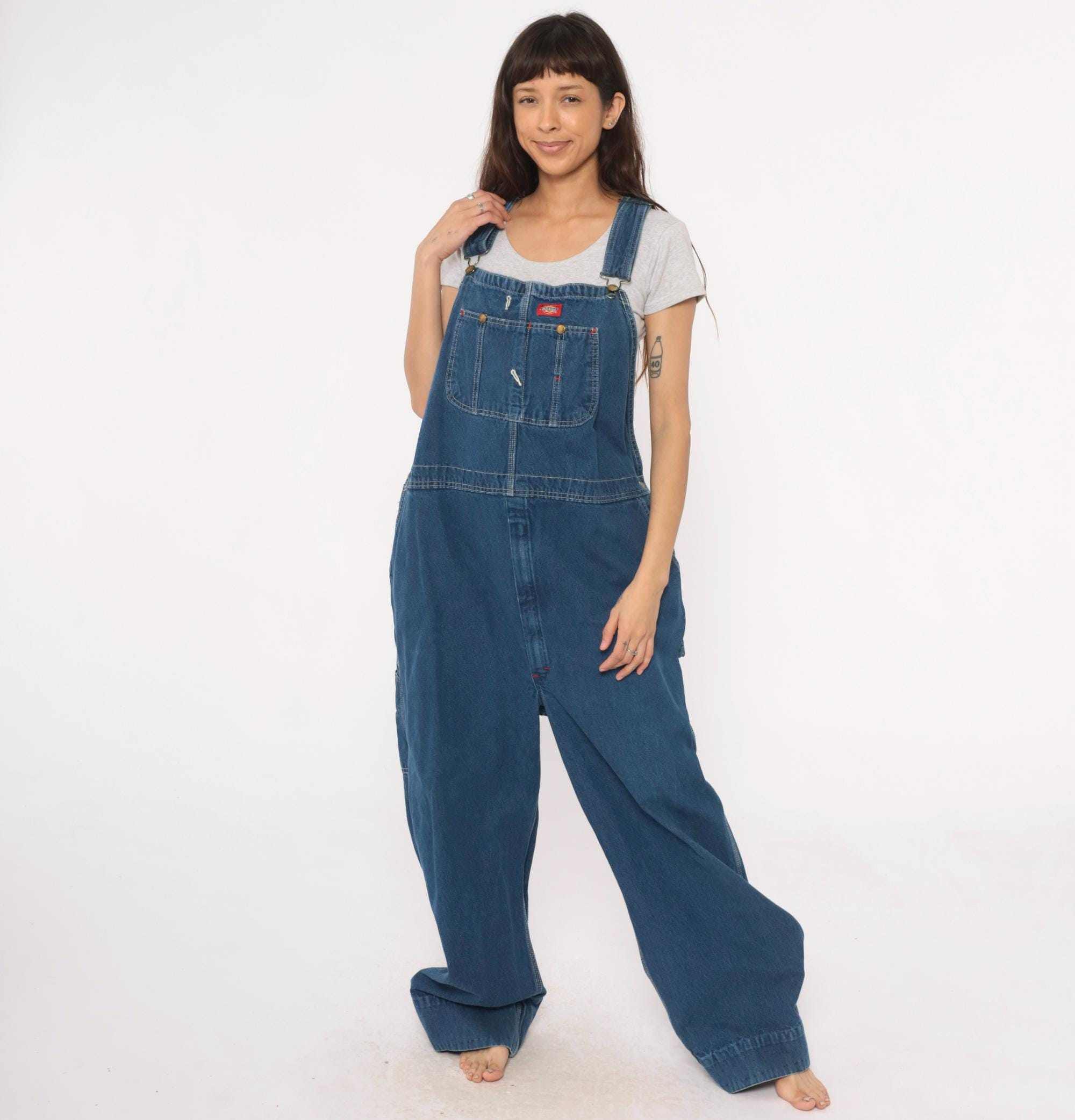 Y2K blue denim overalls from Dickies with adjustable shoulder straps and brass hardware. Red Dickies logo label on chest bib, multiple pockets including front bib pocket with brass button closures, side seam pockets, and back pockets.