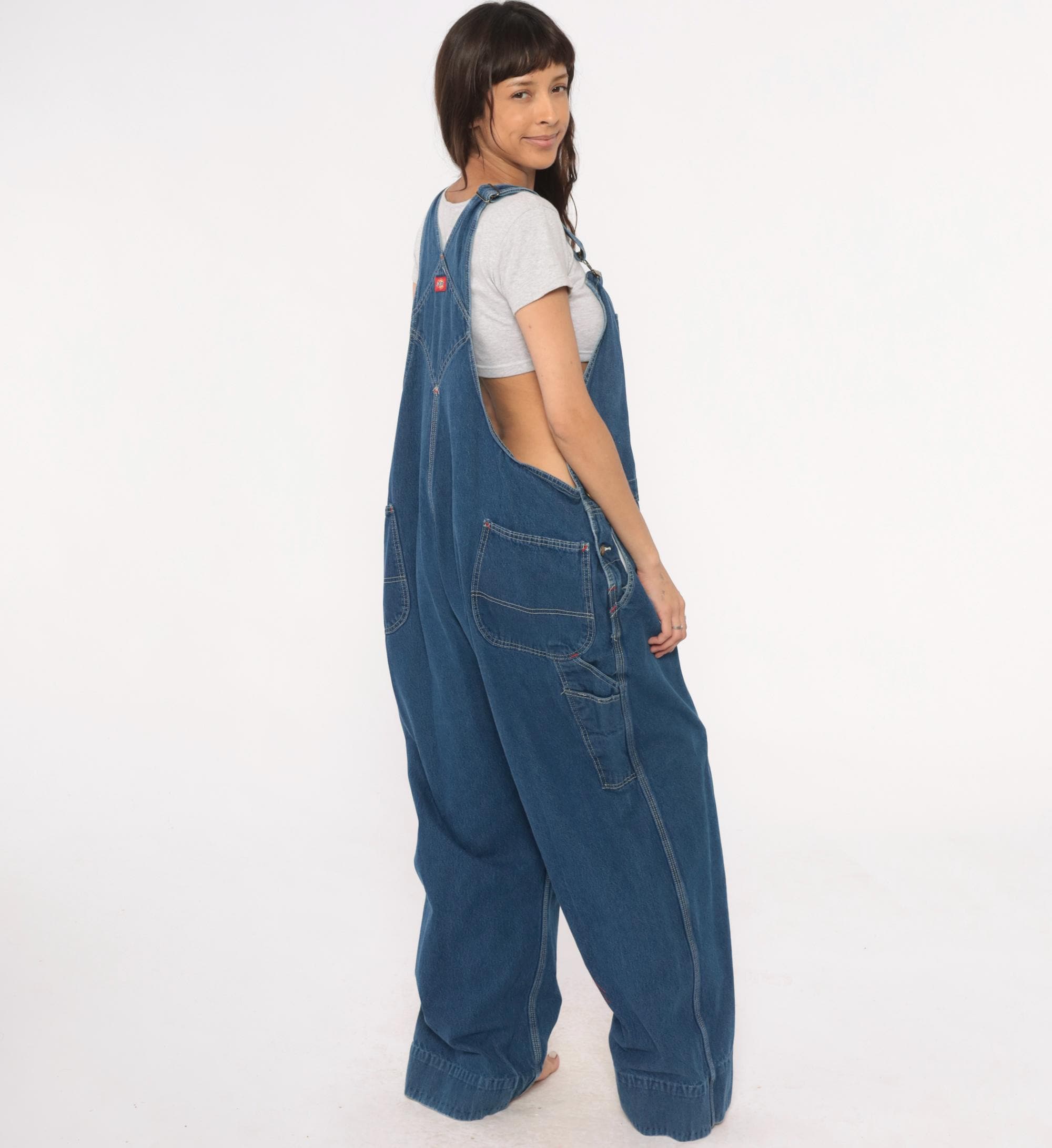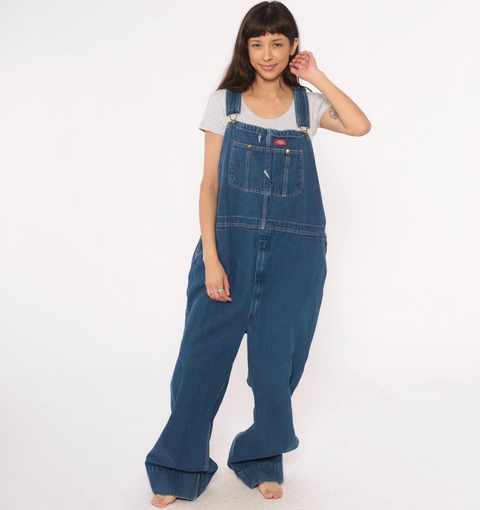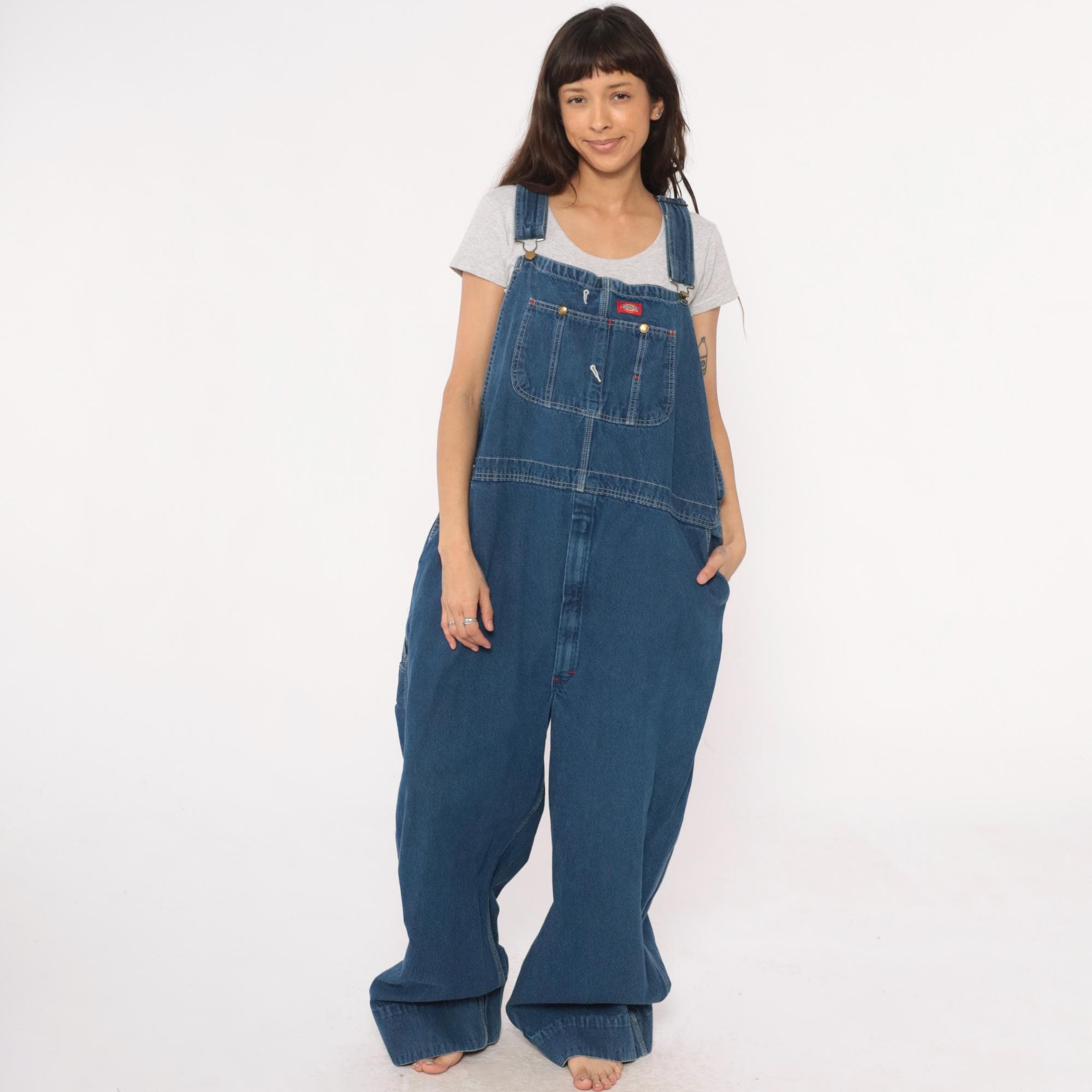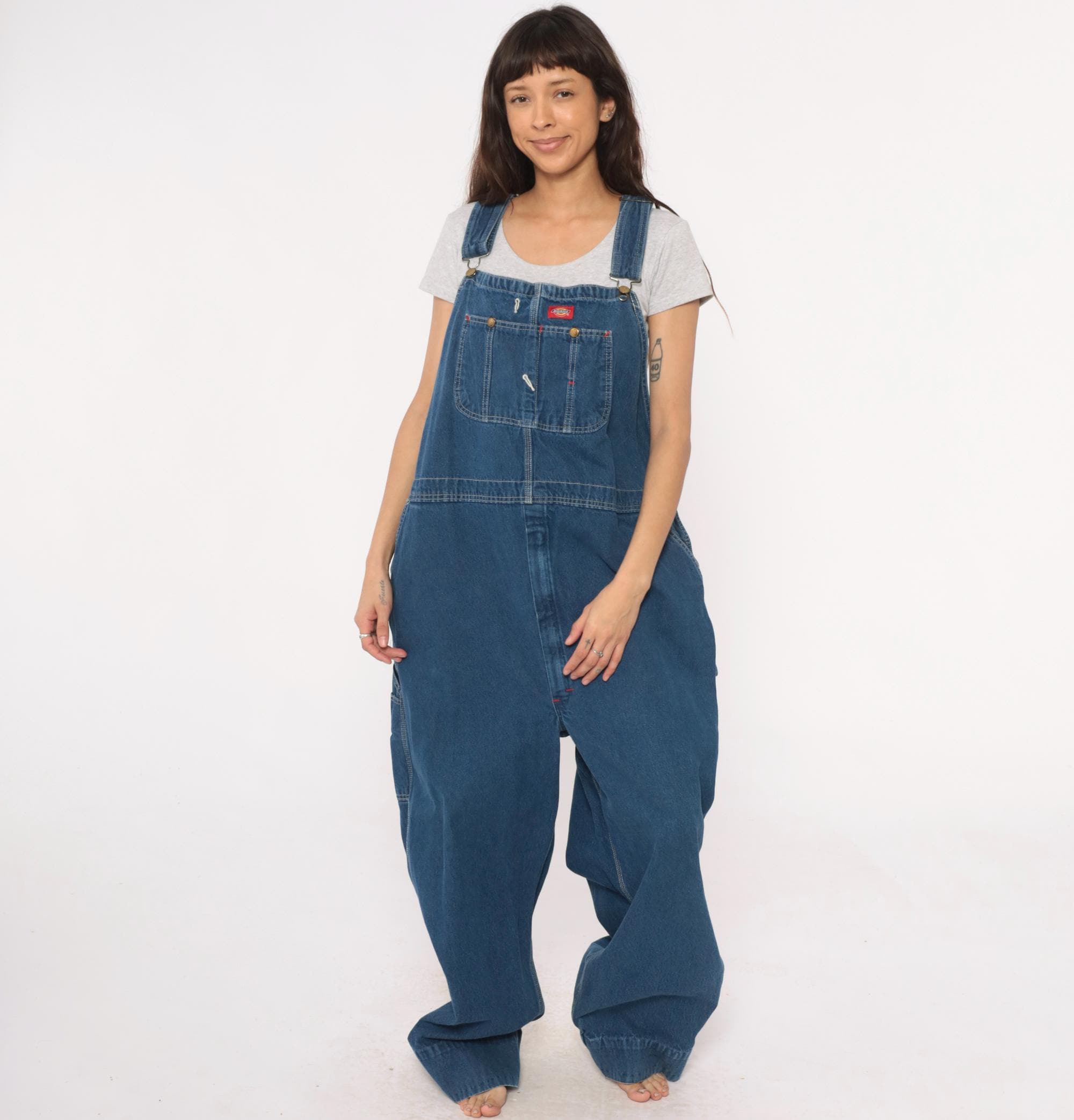 Y2K blue denim overalls from Dickies with adjustable shoulder straps and brass hardware. Red Dickies logo label on chest bib, multiple pockets including front bib pocket with brass button closures, side seam pockets, and back pockets.