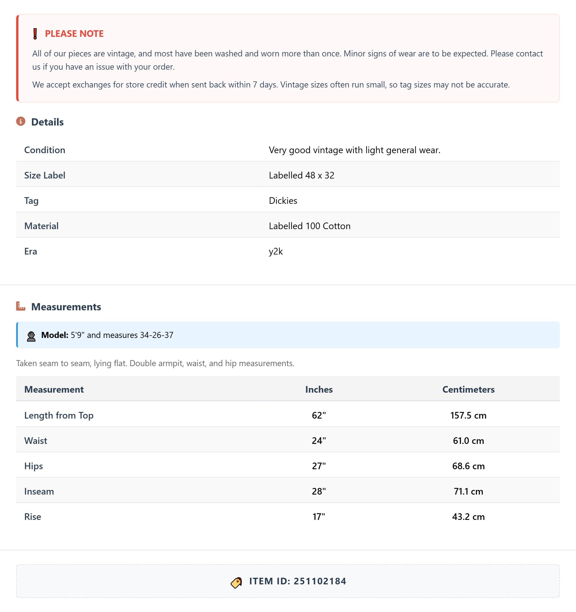 Vintage denim was usually made without any stretch, unlike modern jeans. Check the measurements to ensure proper fit, and remember to give yourself a little wiggle room in the waist and hips, depending on your preferred fit.