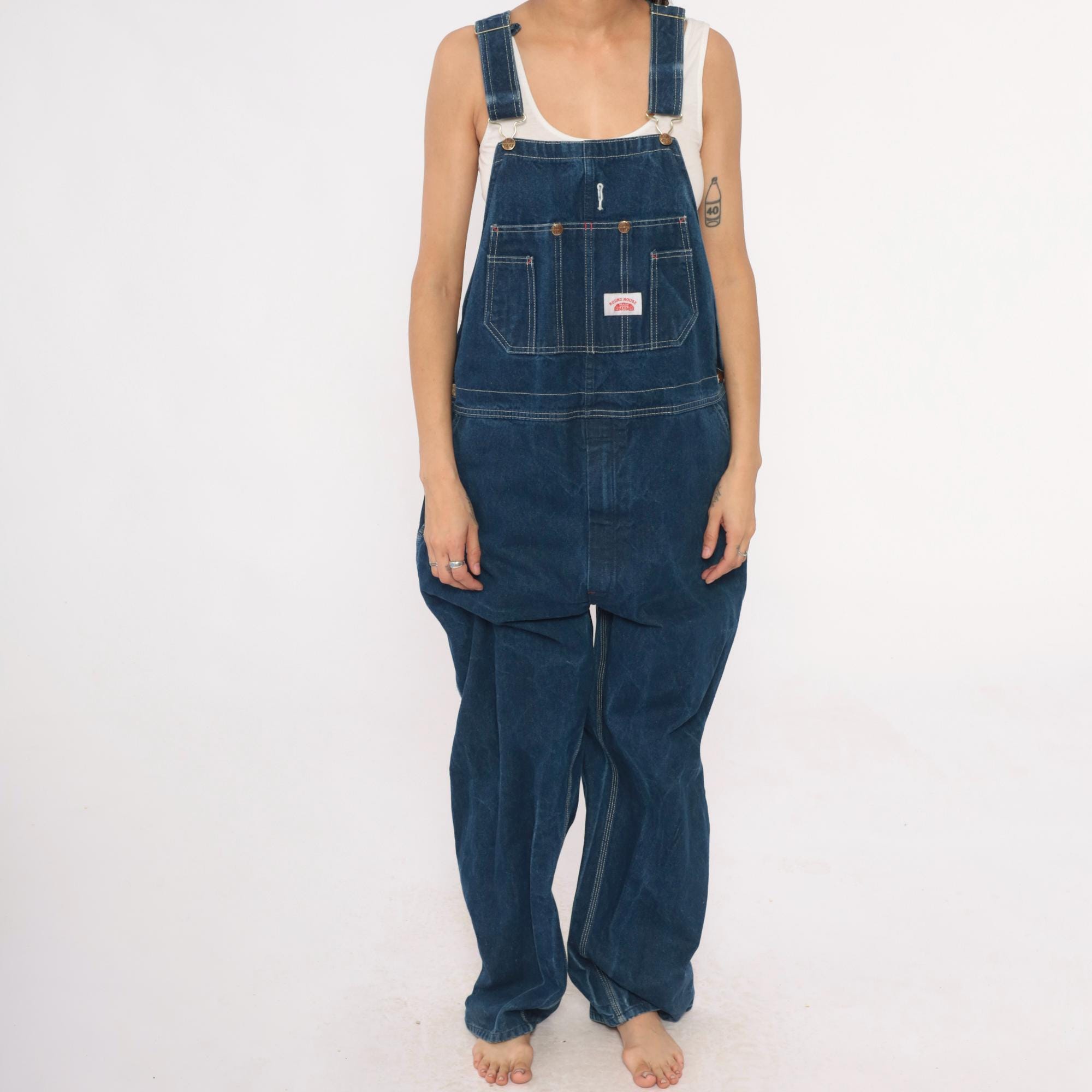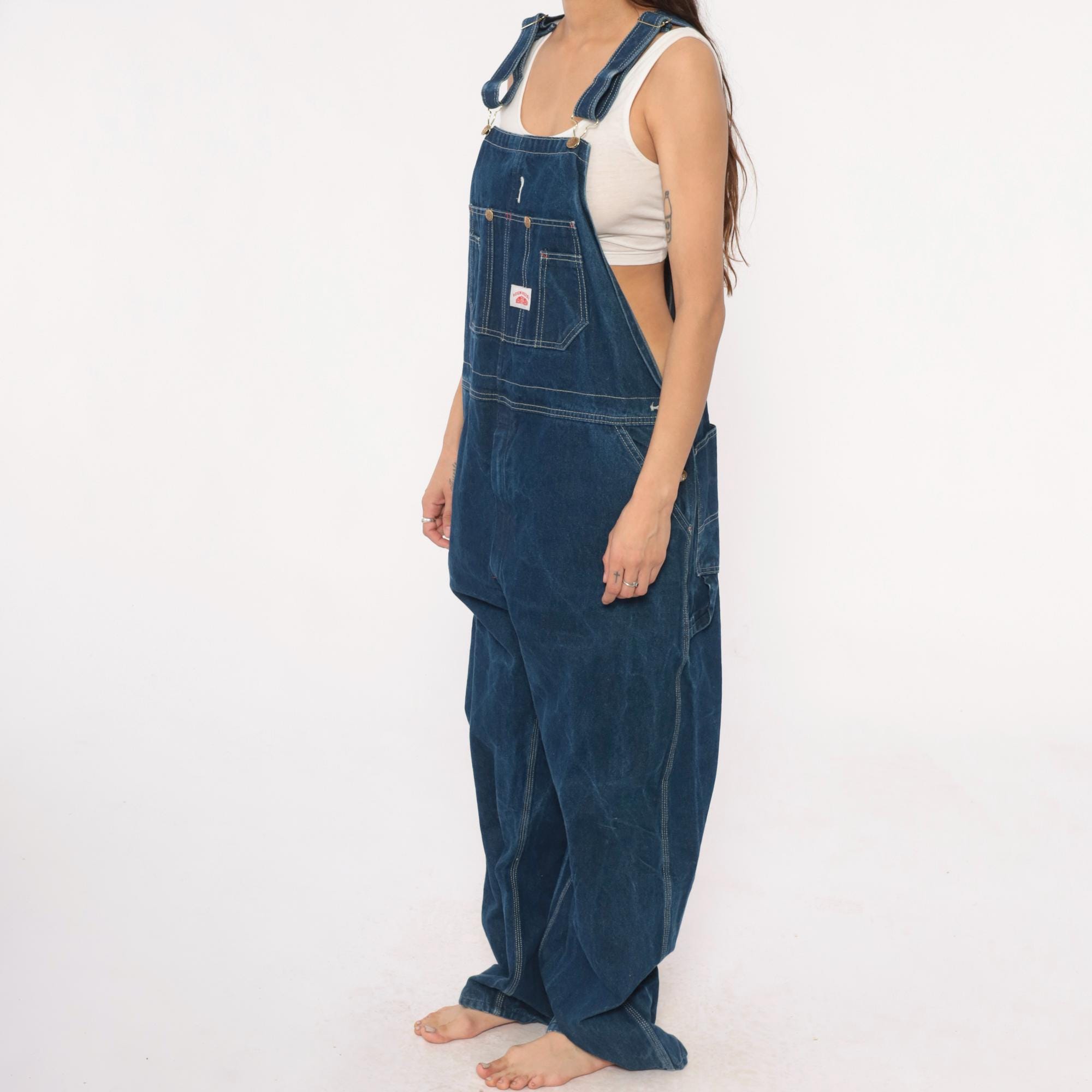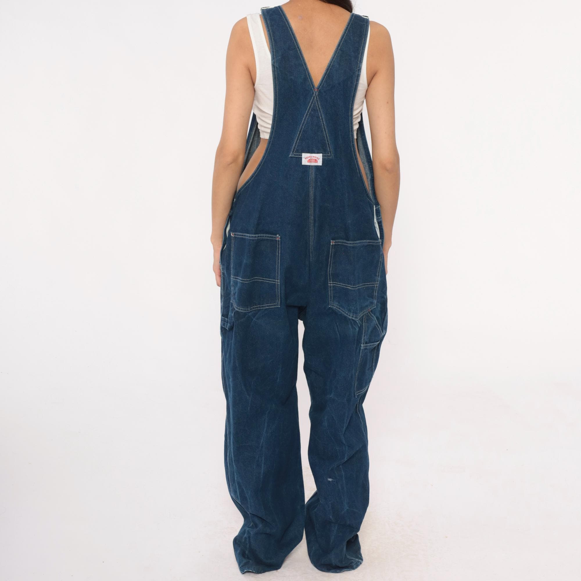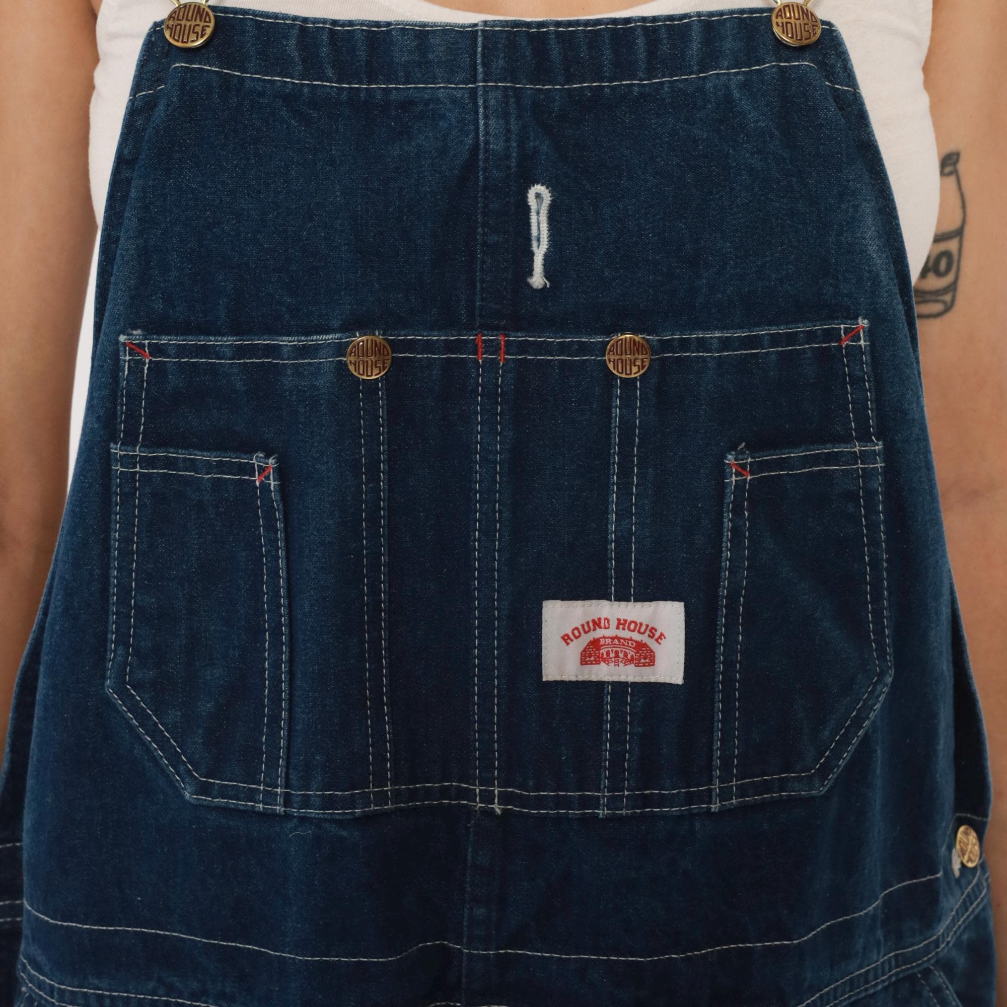 Y2k dark blue denim overalls from Roundhouse with adjustable straps, metal hardware closures, and contrast white stitching throughout. Multiple pockets including chest pockets with button closures, side pockets, and back pockets. Straight leg silhouette with carpenter style utility details.