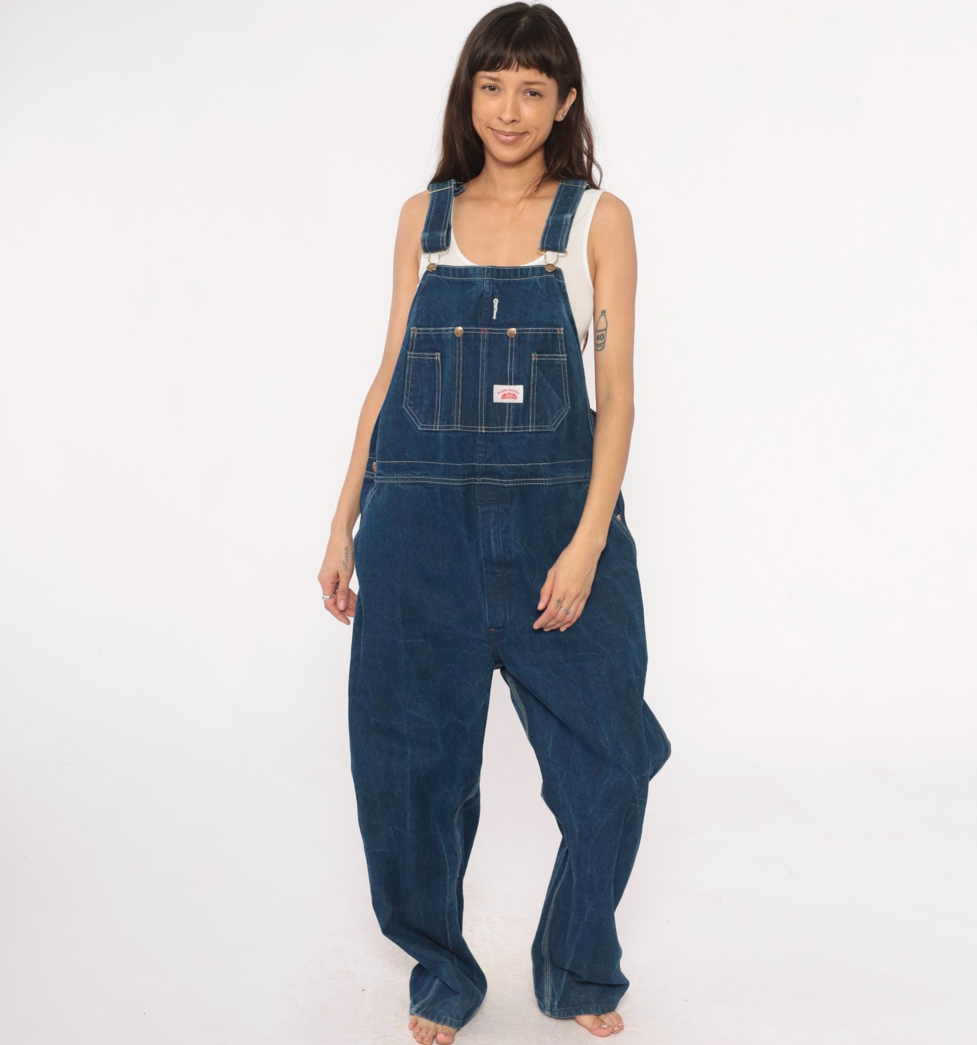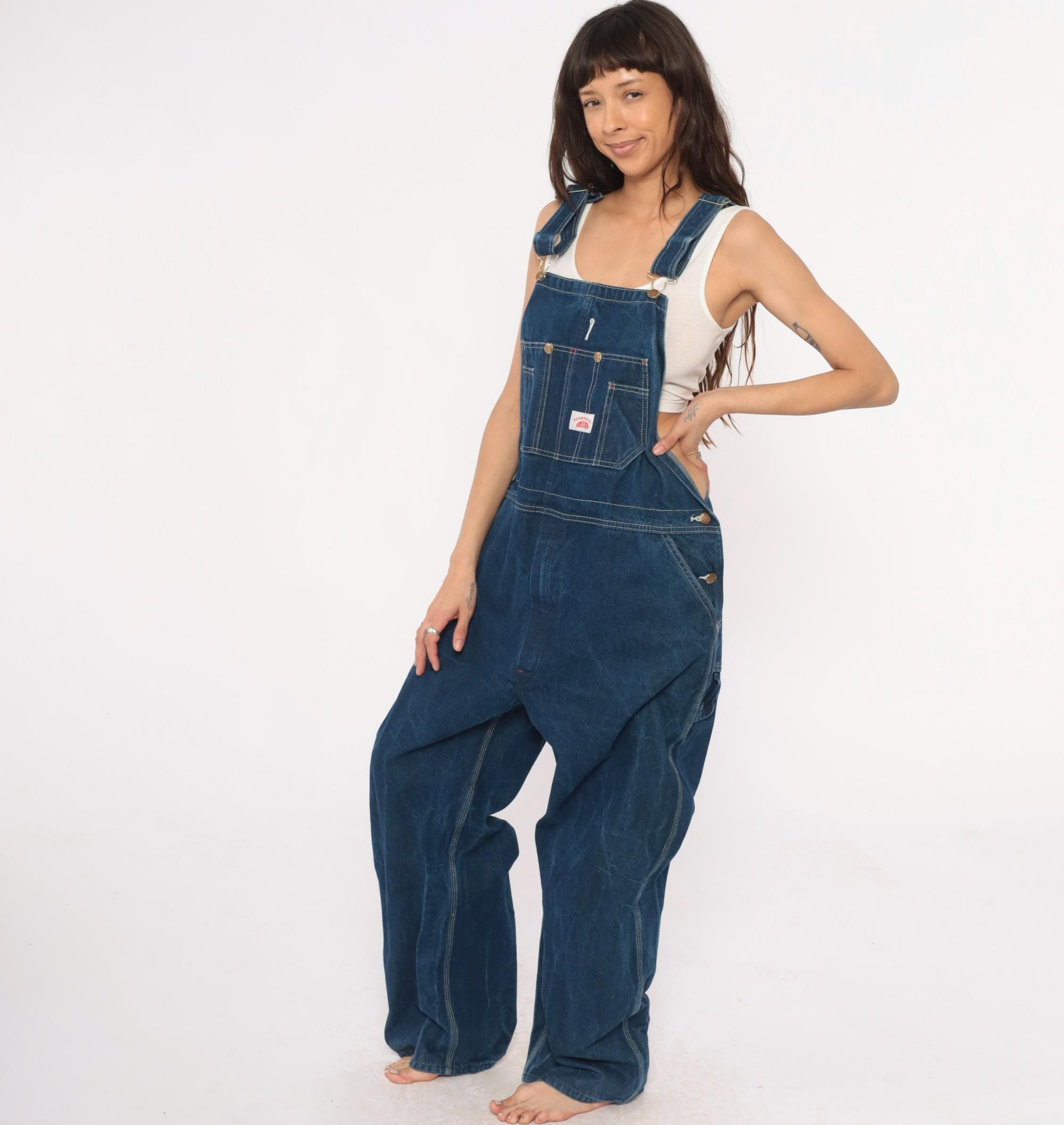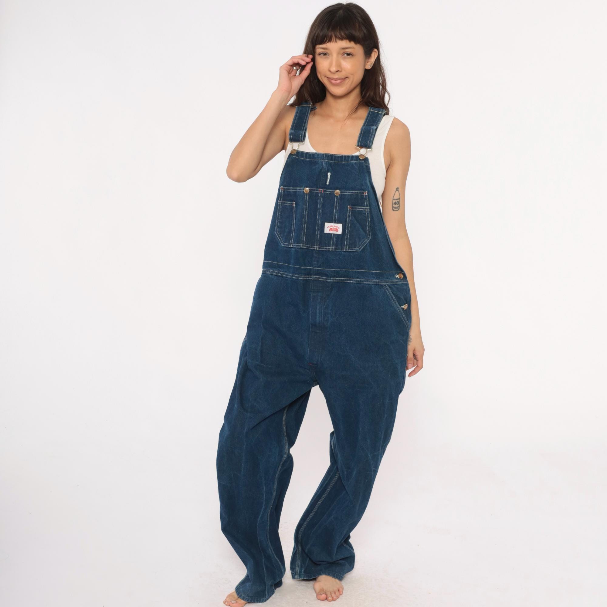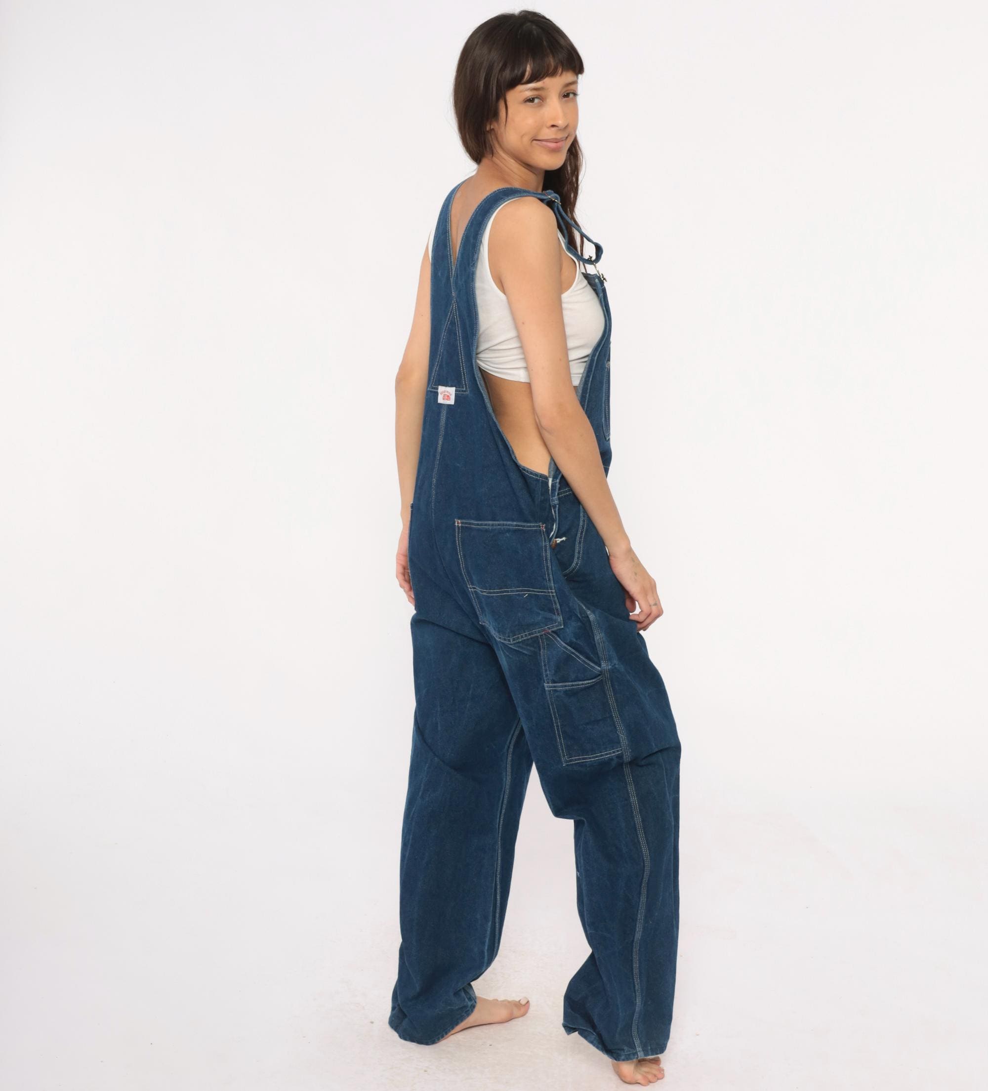Y2k dark blue denim overalls from Roundhouse with adjustable straps, metal hardware closures, and contrast white stitching throughout. Multiple pockets including chest pockets with button closures, side pockets, and back pockets. Straight leg silhouette with carpenter style utility details.