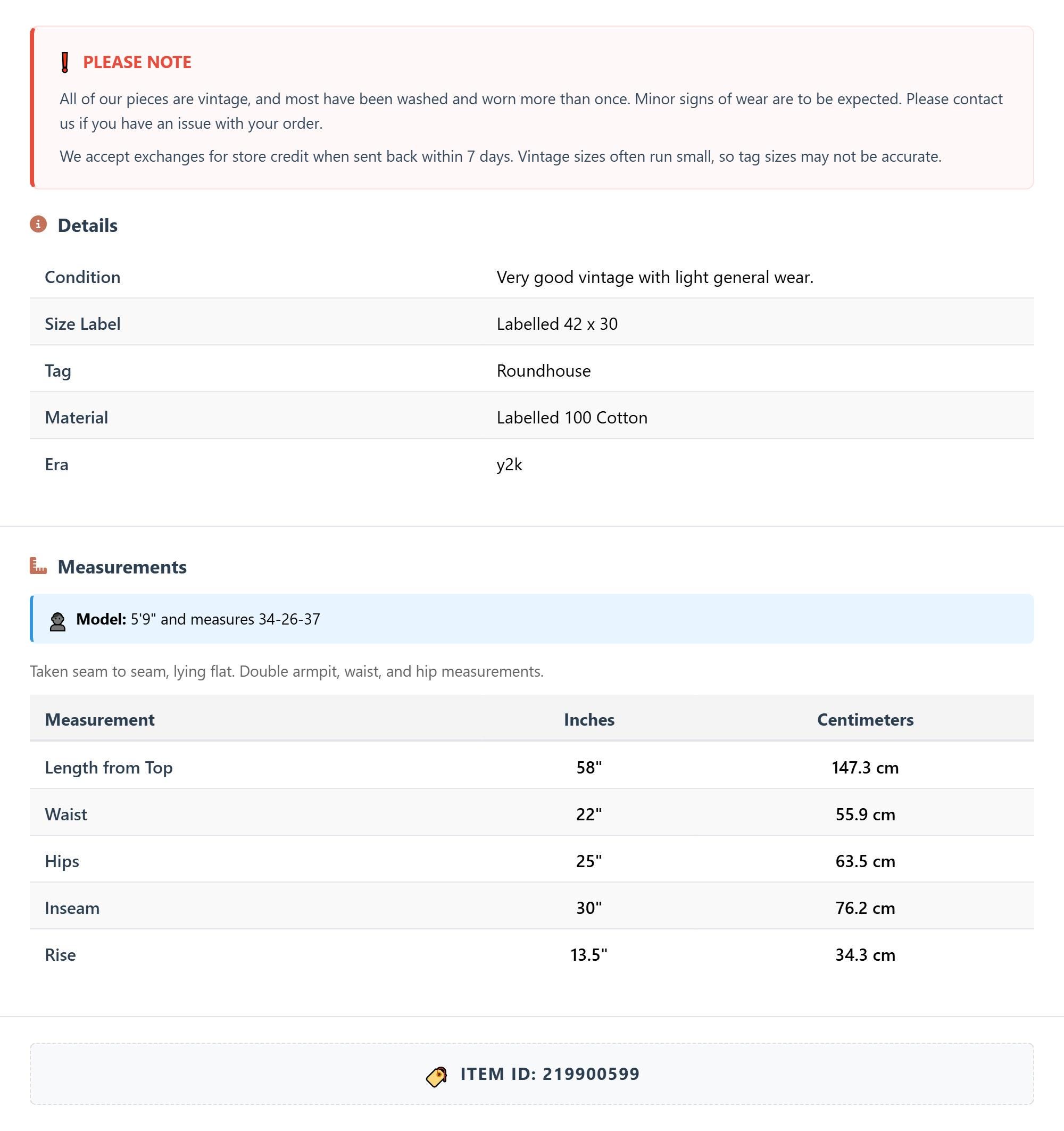 Vintage denim was usually made without any stretch, unlike modern jeans. Check the measurements to ensure proper fit, and remember to give yourself a little wiggle room in the waist and hips, depending on your preferred fit.