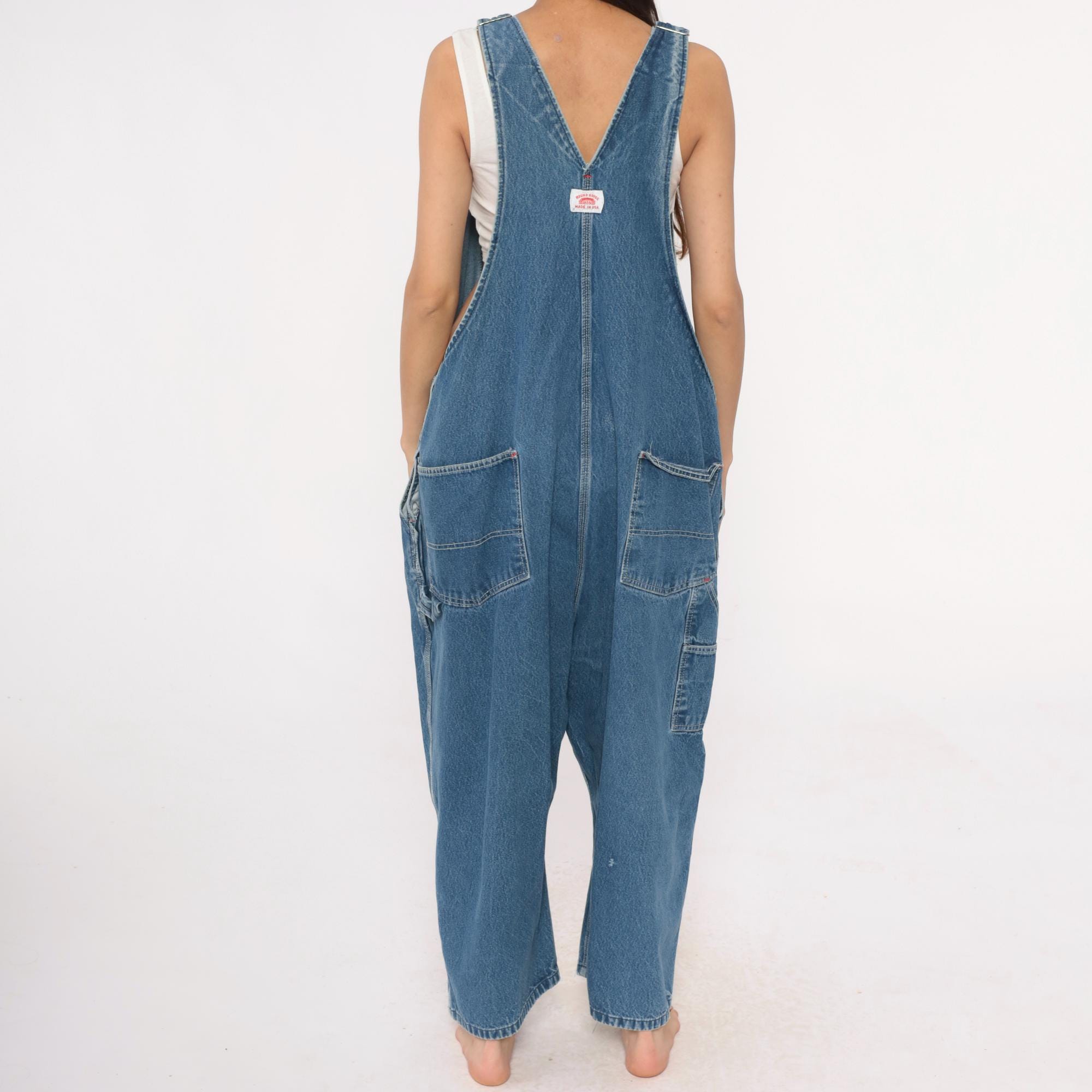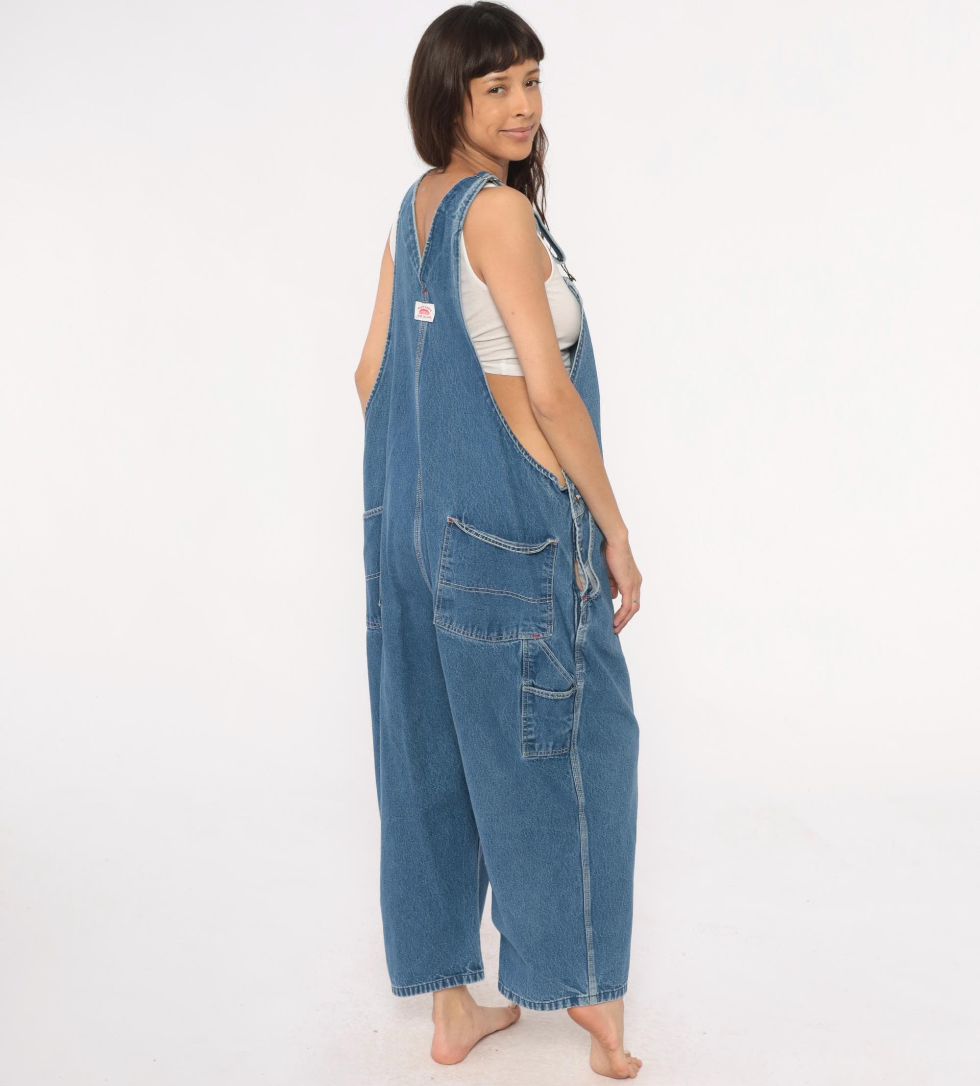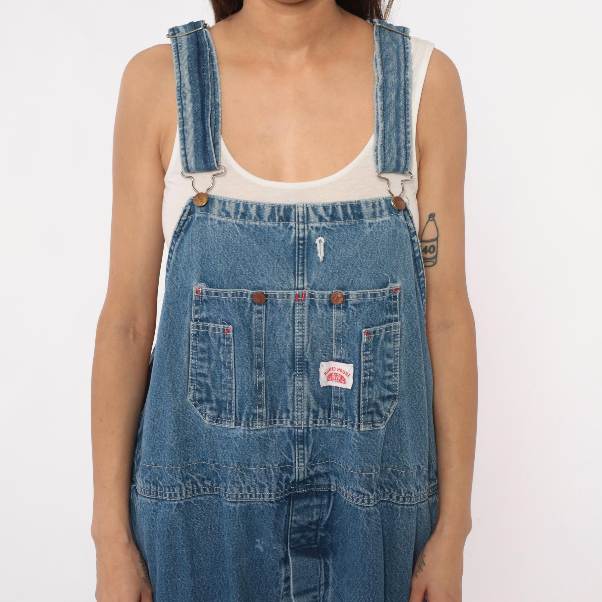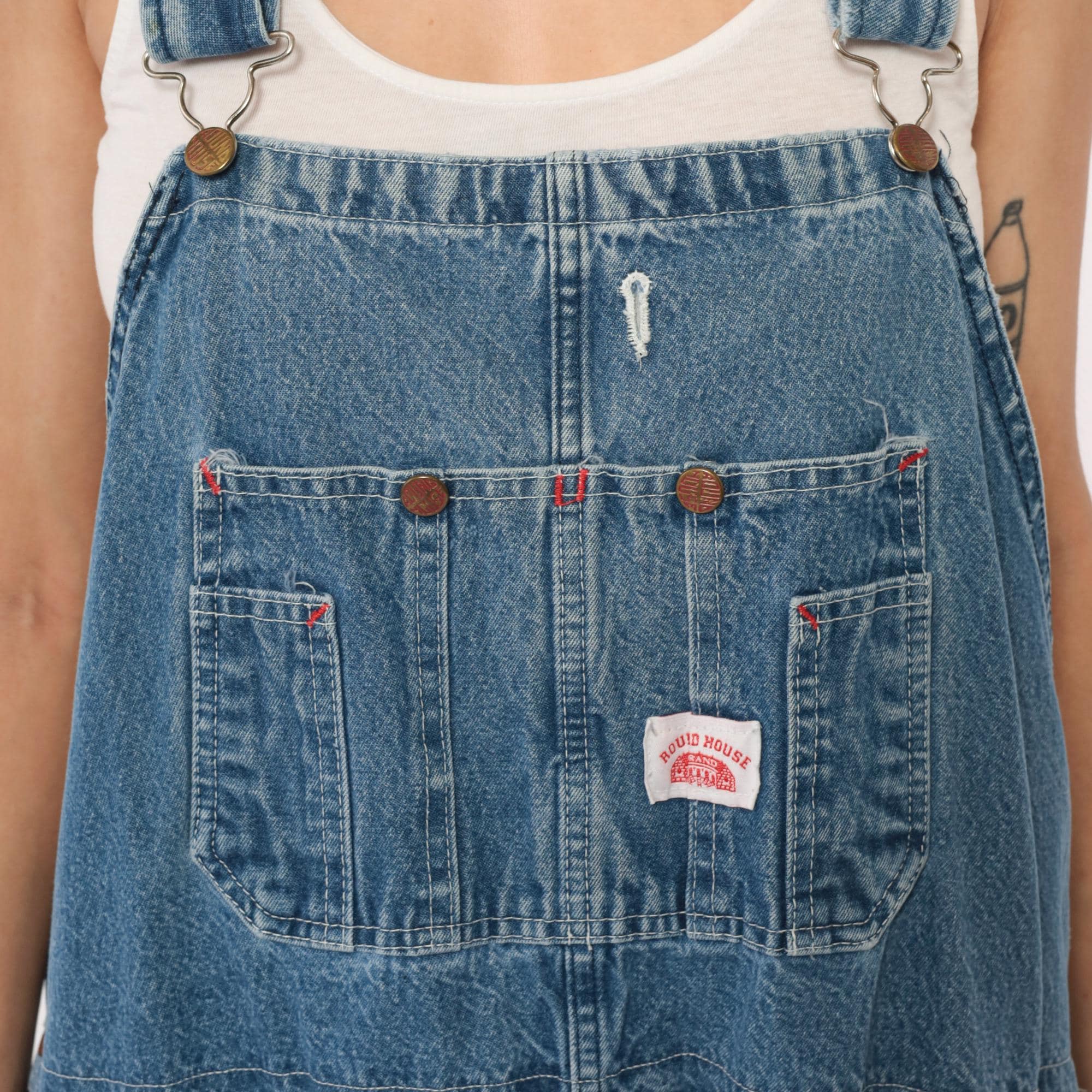 90s medium wash denim overalls from Roundhouse with bib front, chest pockets with button closures, and adjustable straps with metal hardware. Straight leg with side pockets and Roundhouse label at center front bib.