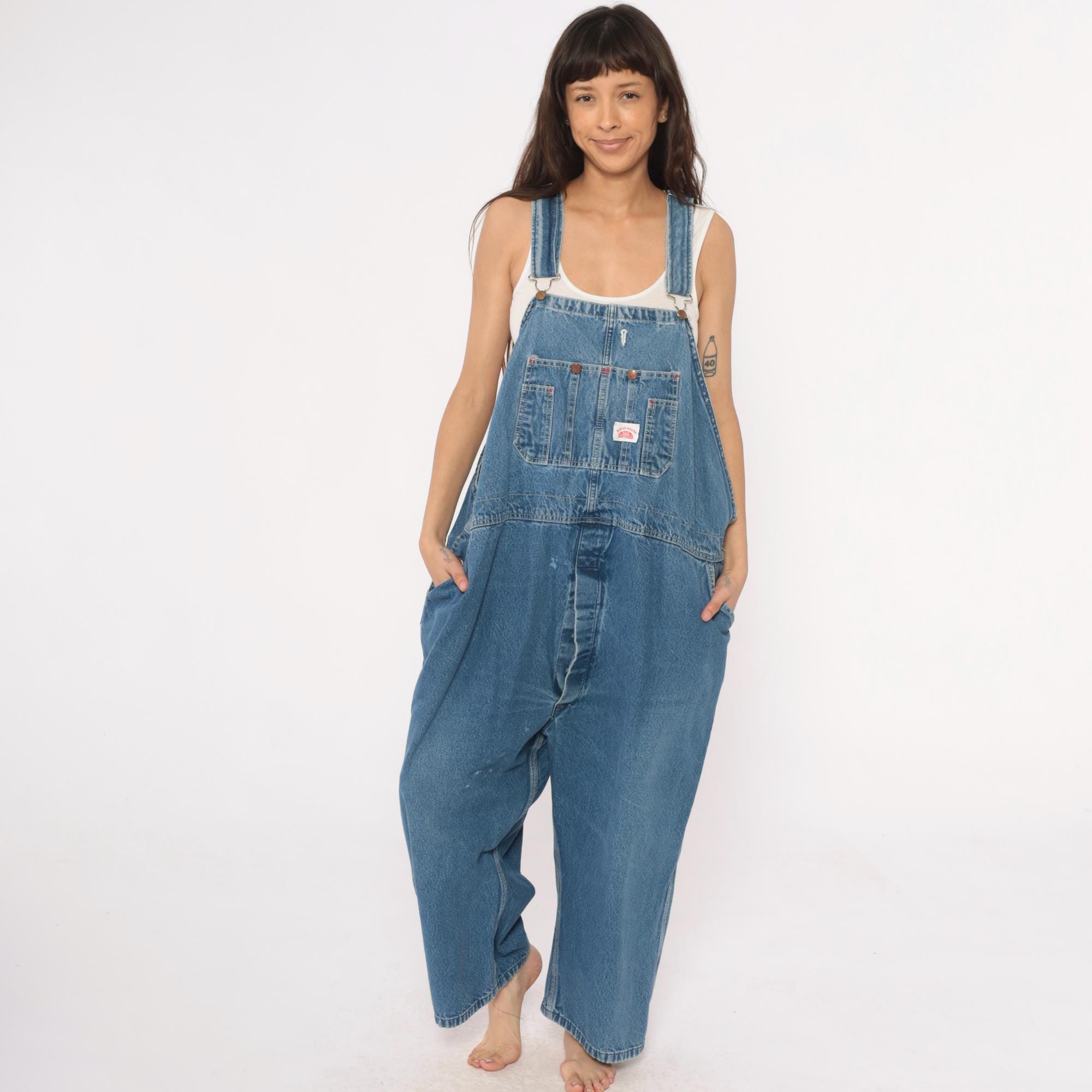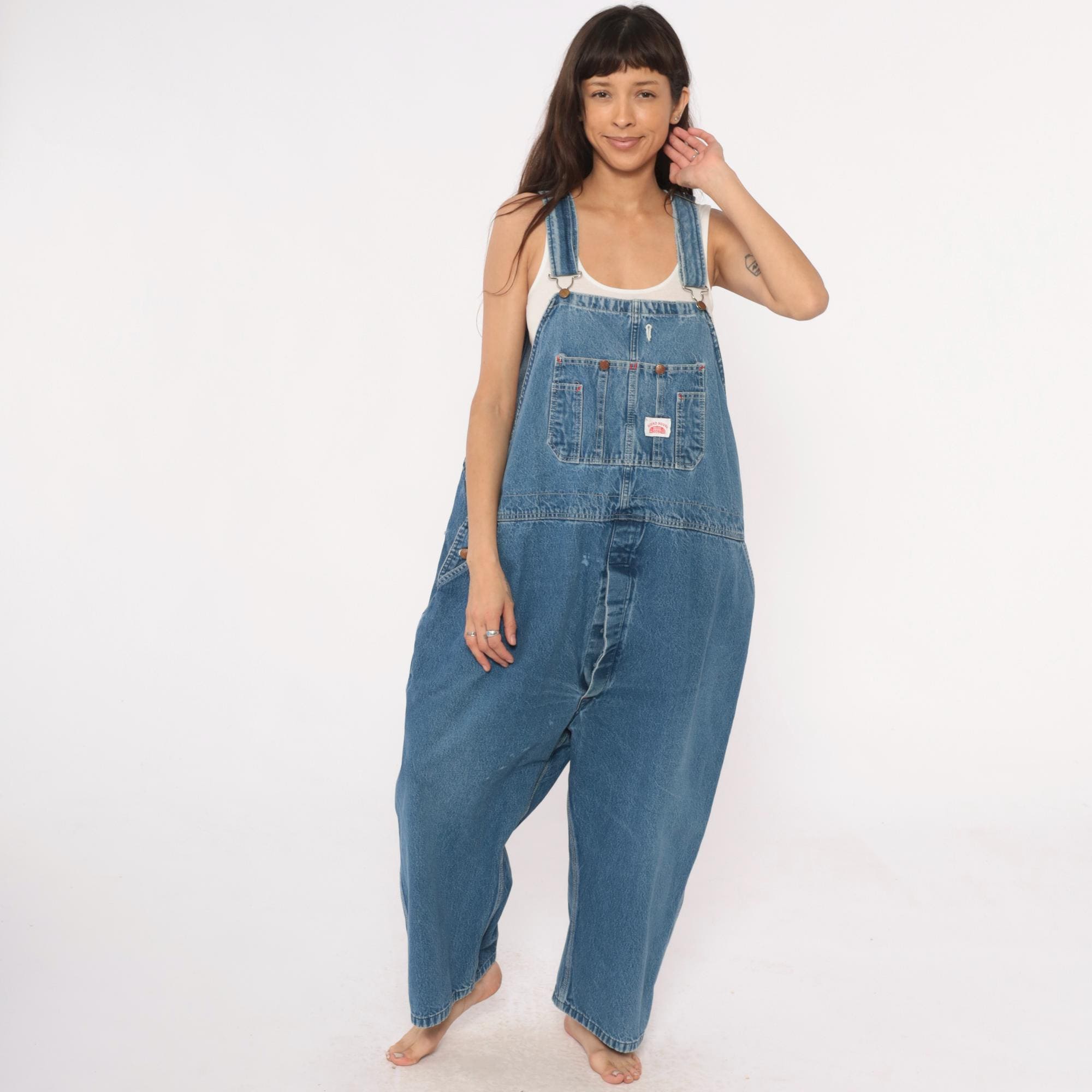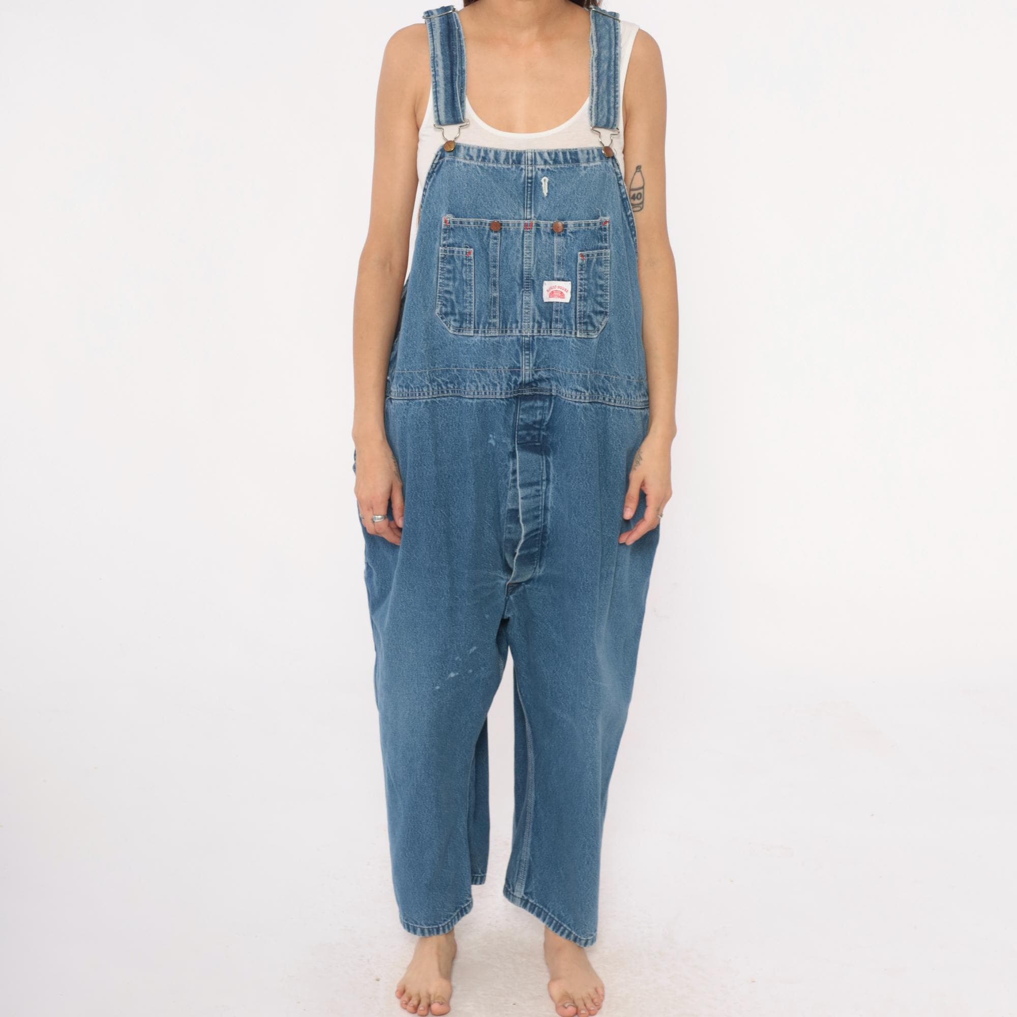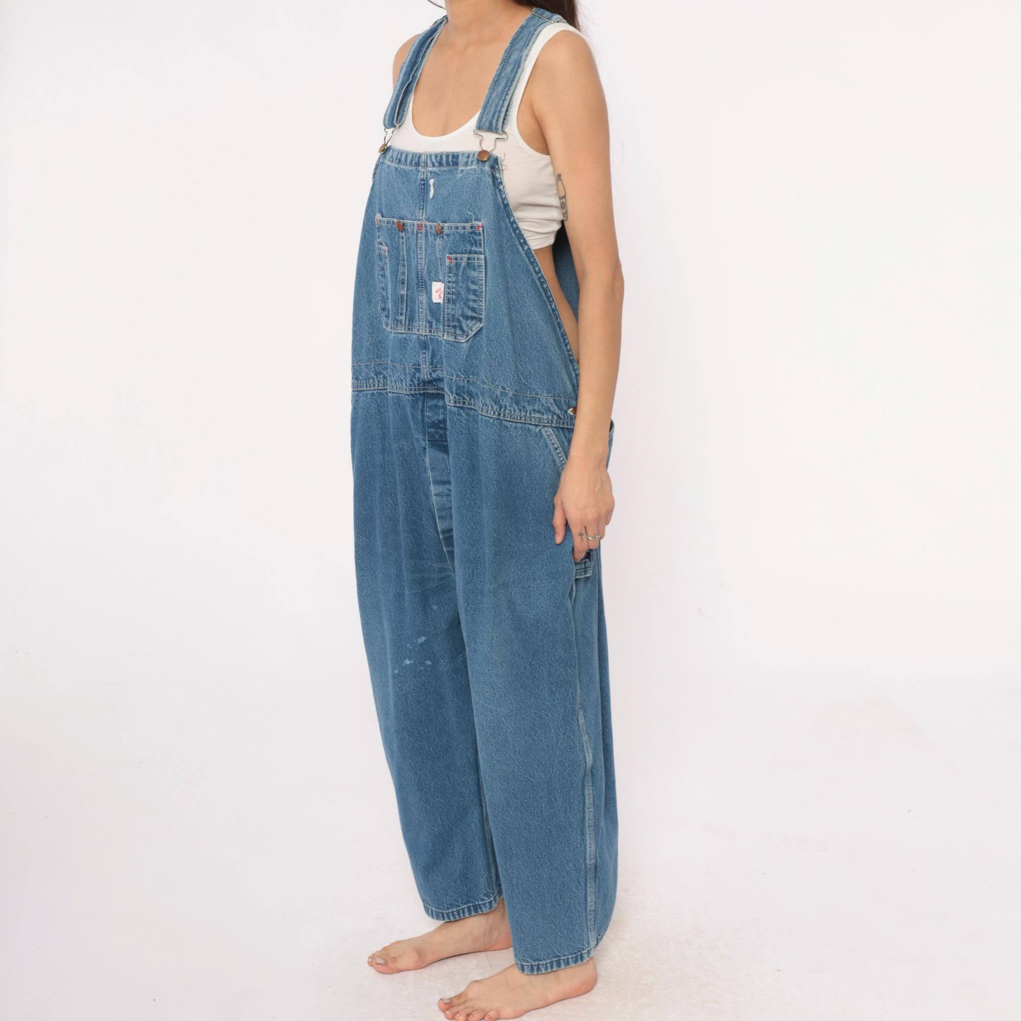 90s medium wash denim overalls from Roundhouse with bib front, chest pockets with button closures, and adjustable straps with metal hardware. Straight leg with side pockets and Roundhouse label at center front bib.