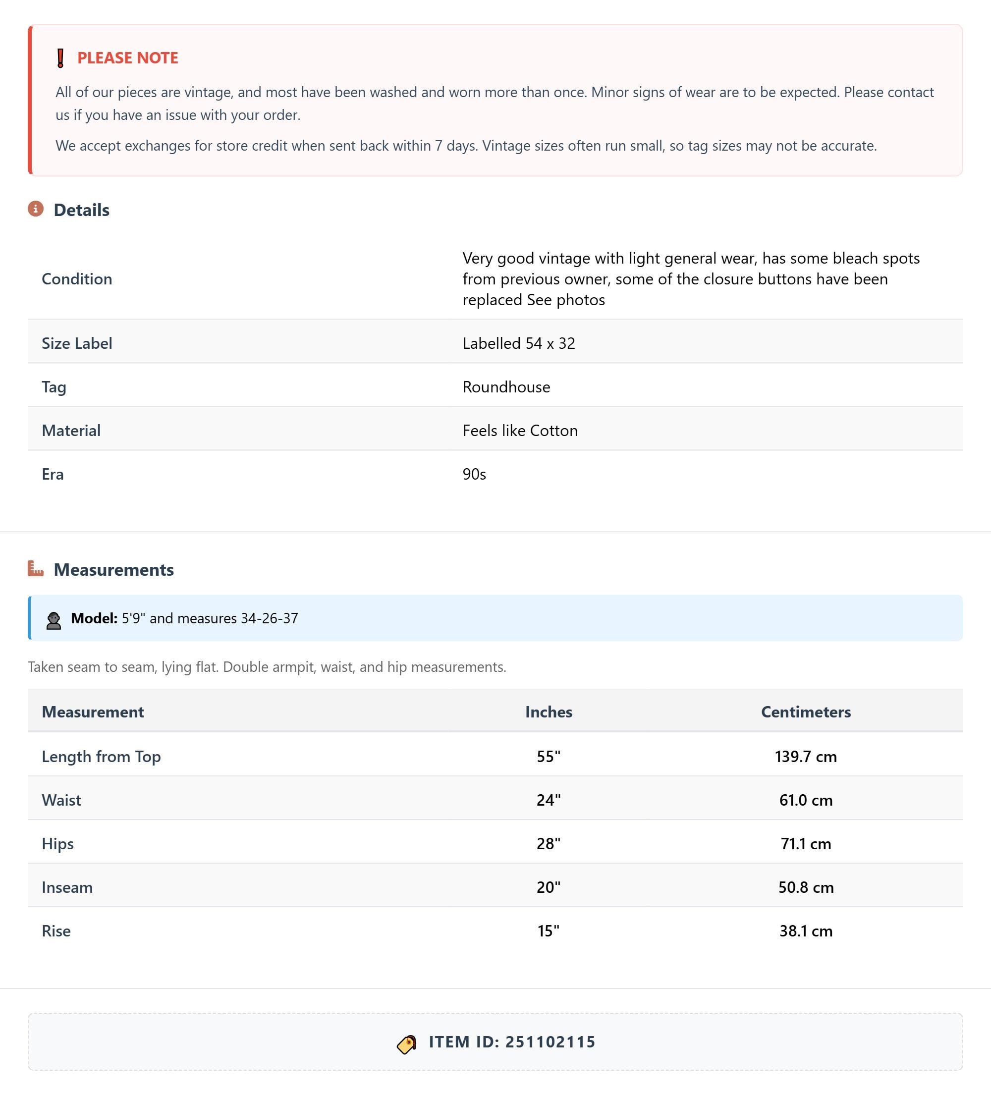 Vintage denim was usually made without any stretch, unlike modern jeans. Check the measurements to ensure proper fit, and remember to give yourself a little wiggle room in the waist and hips, depending on your preferred fit.