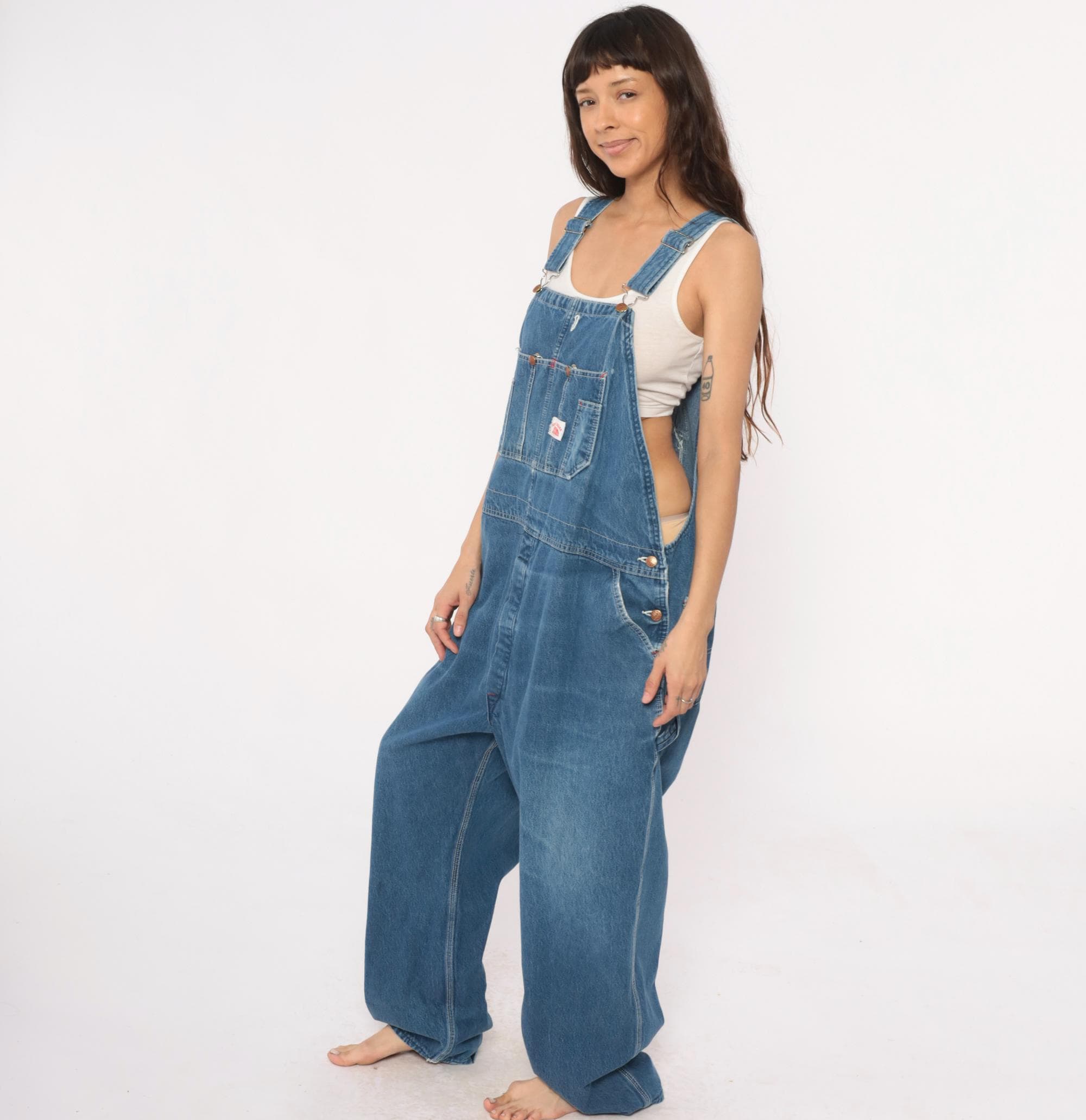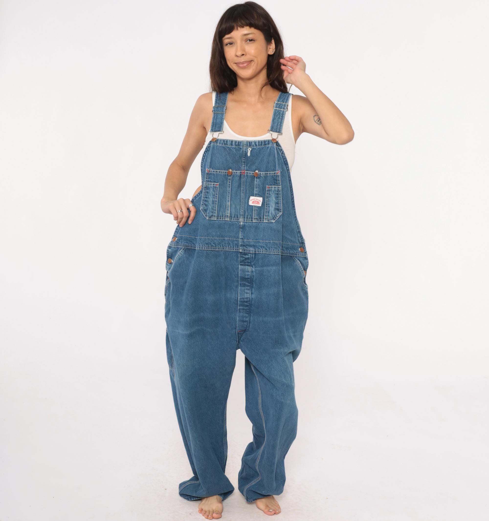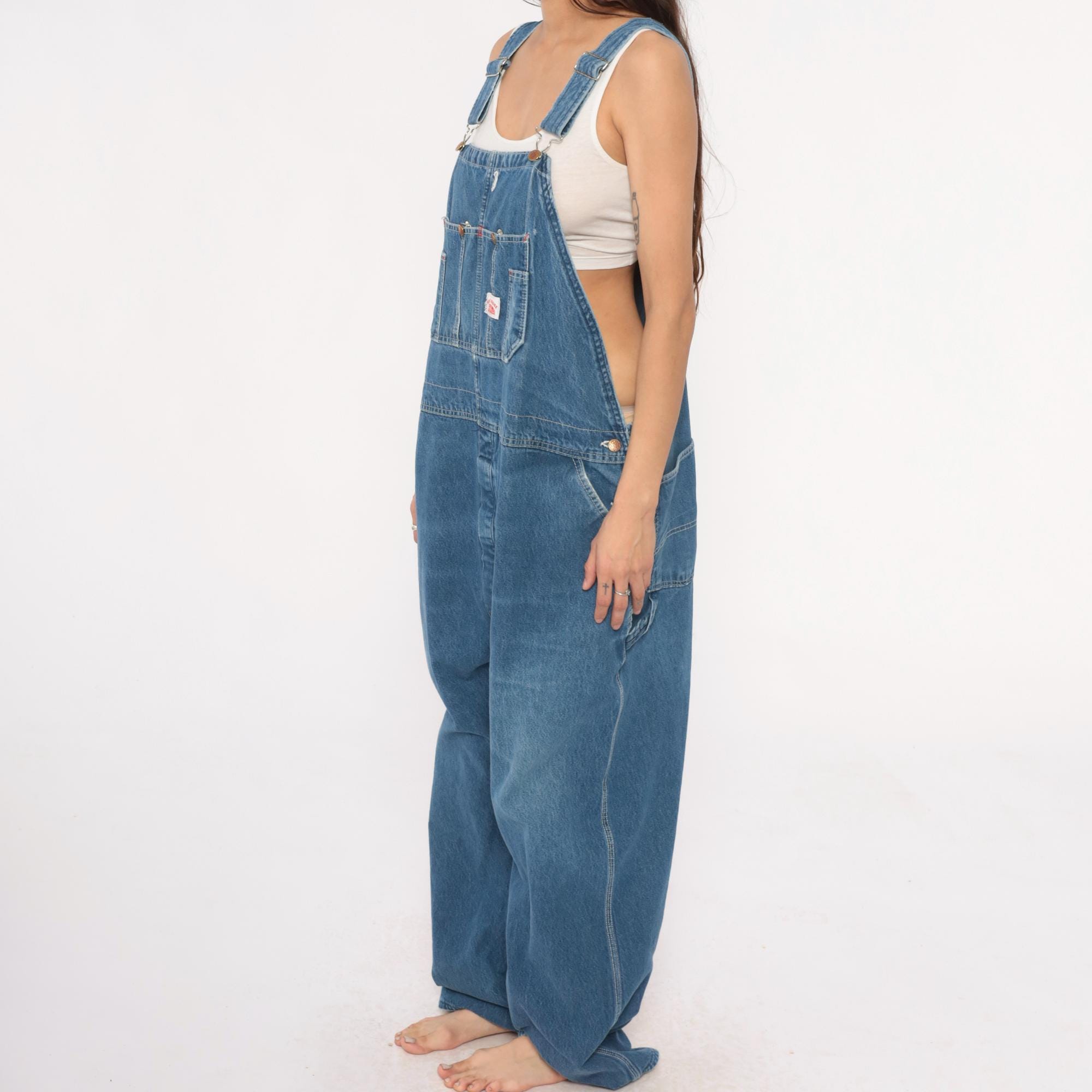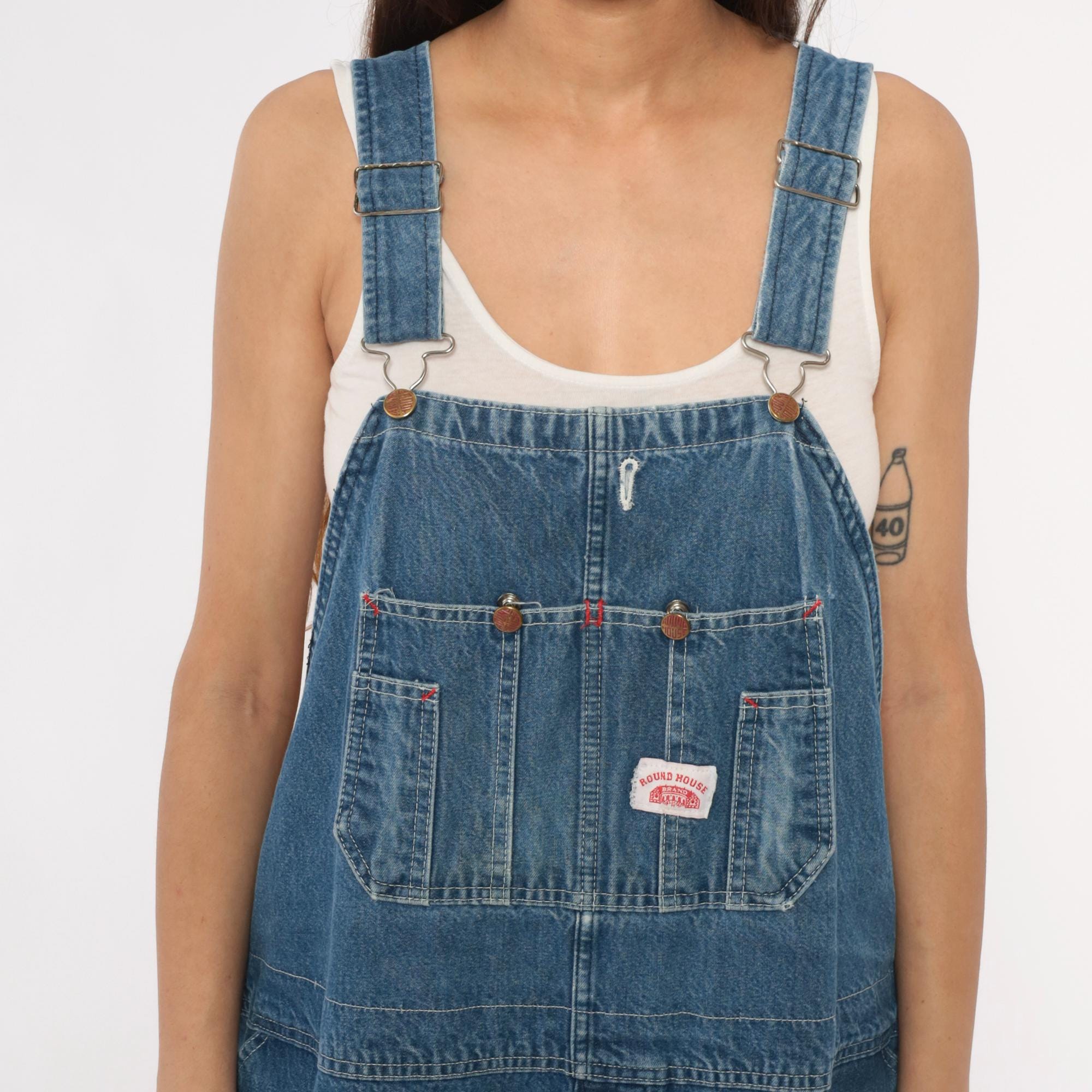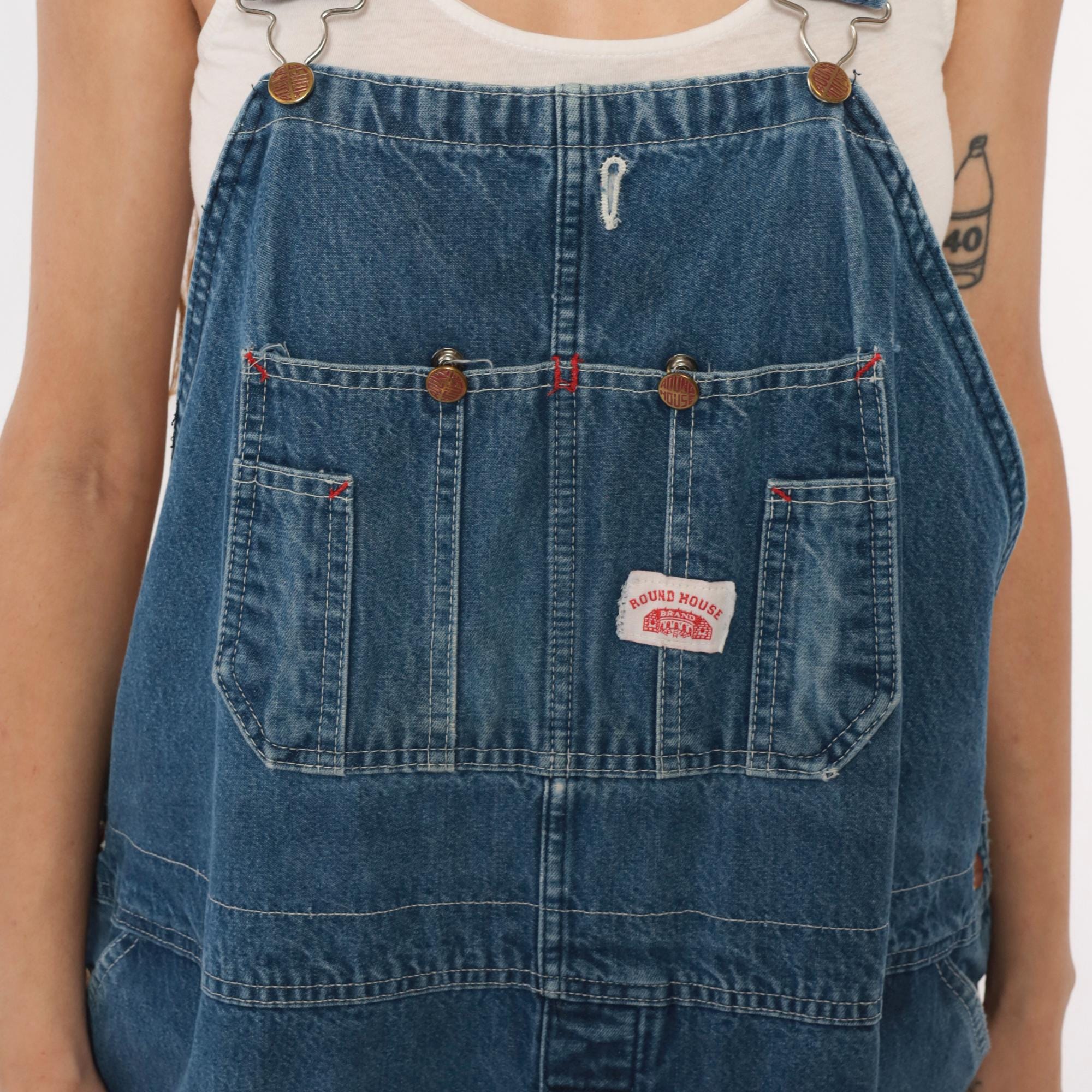 90s denim overalls from Roundhouse with adjustable shoulder straps and metal hardware. Front bib with multiple pockets including two chest pockets with copper rivets, carpenter-style side pockets at hips. Straight leg silhouette with back pockets.