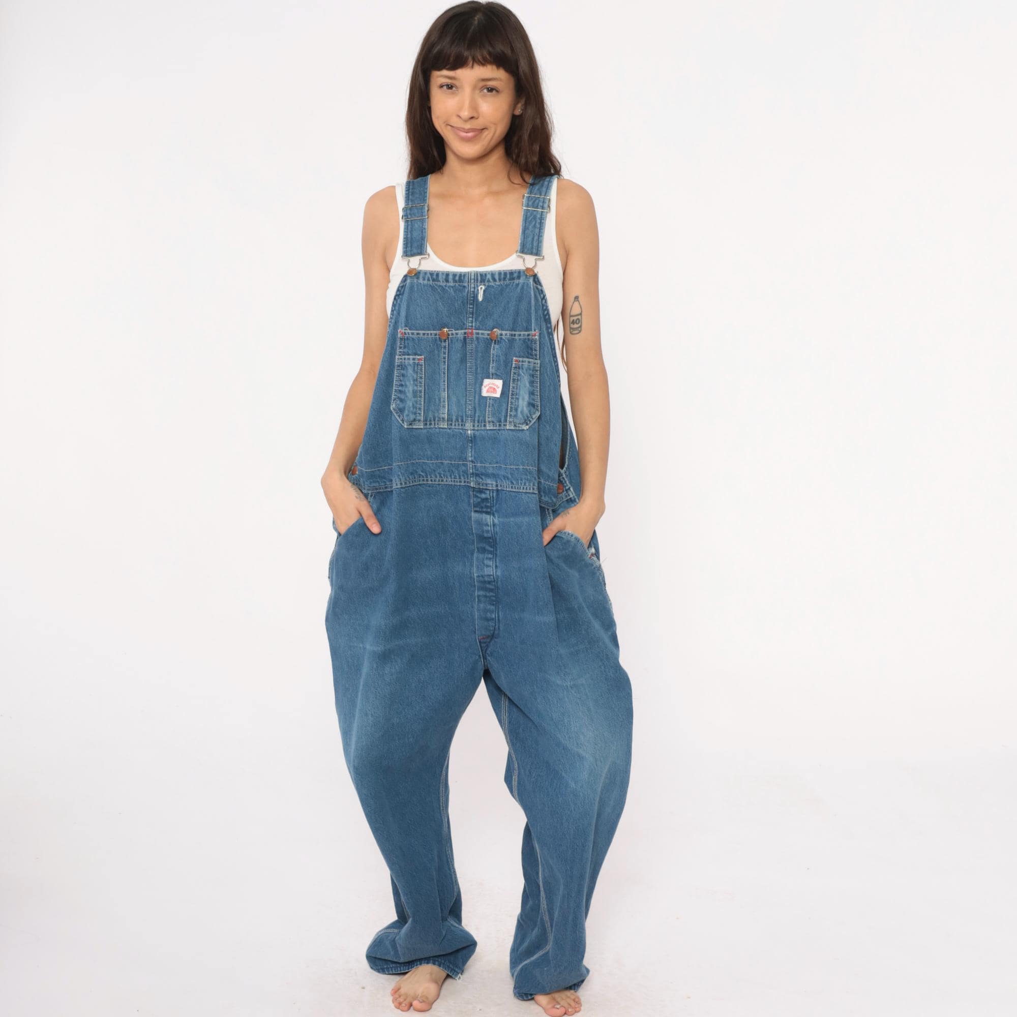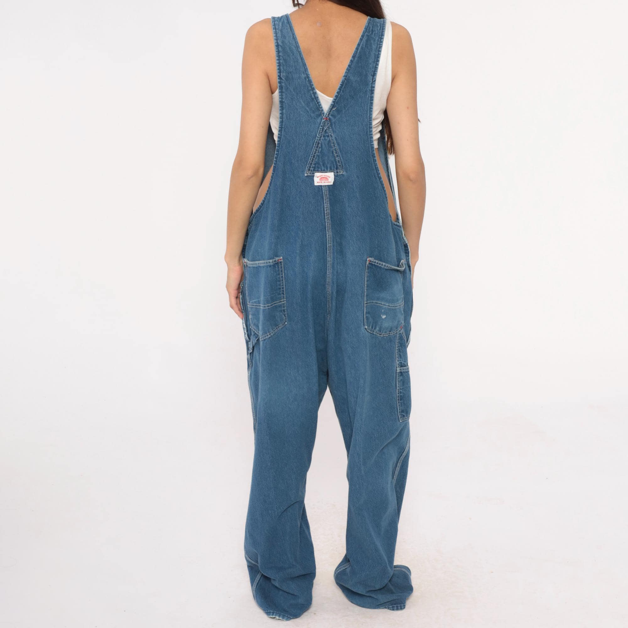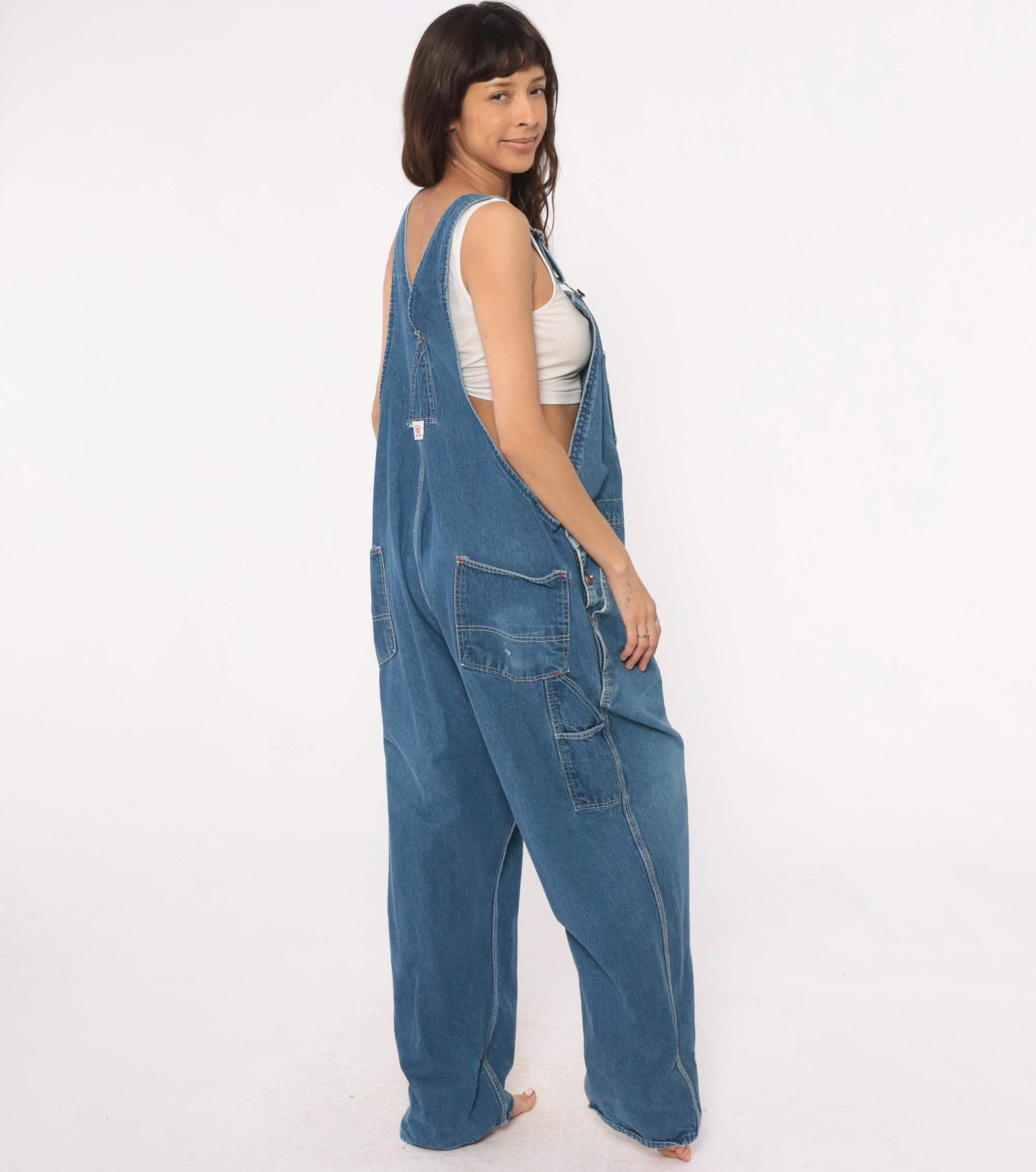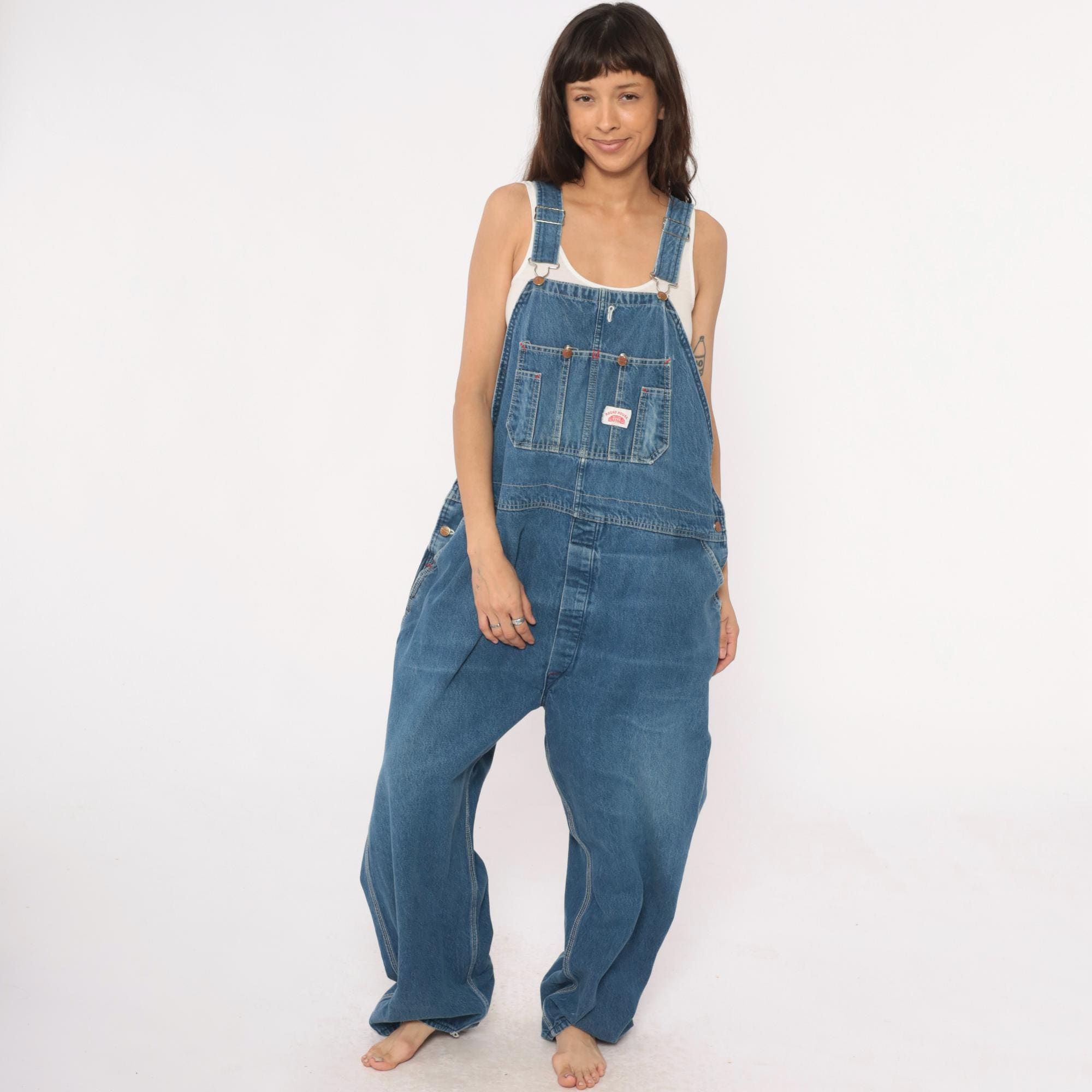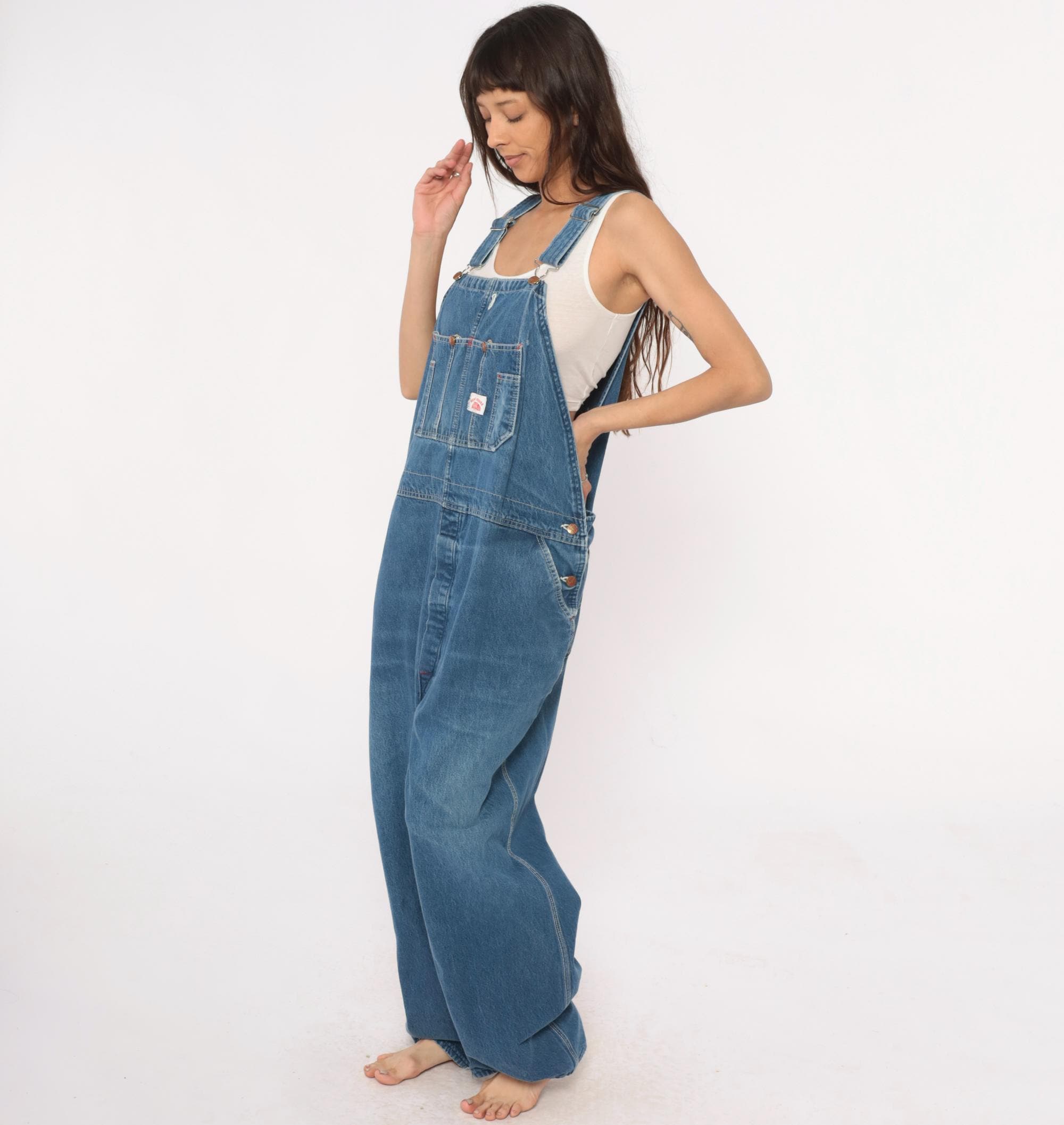 90s denim overalls from Roundhouse with adjustable shoulder straps and metal hardware. Front bib with multiple pockets including two chest pockets with copper rivets, carpenter-style side pockets at hips. Straight leg silhouette with back pockets.