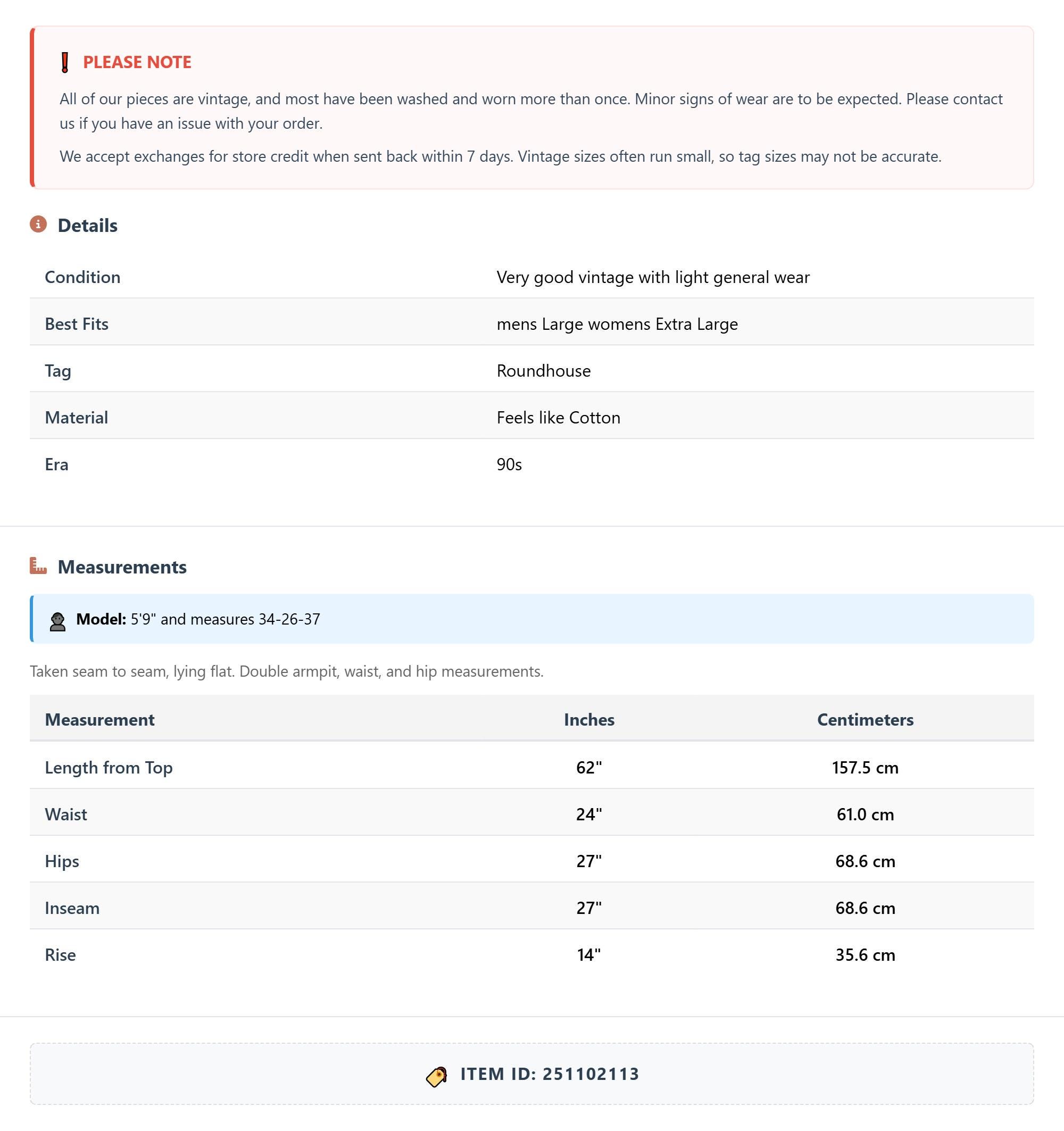 All of our pieces are vintage, and most have been washed and worn more than once. Minor signs of wear are to be expected. Please contact us if you have an issue with your order. We accept exchanges for store credit when sent back within 7 days.