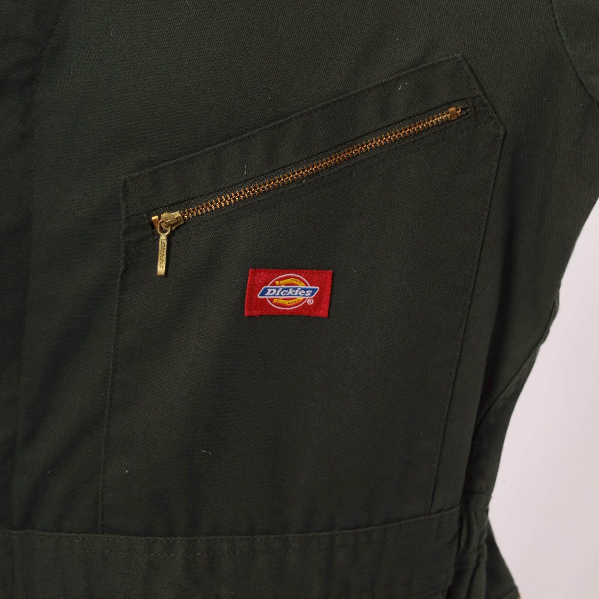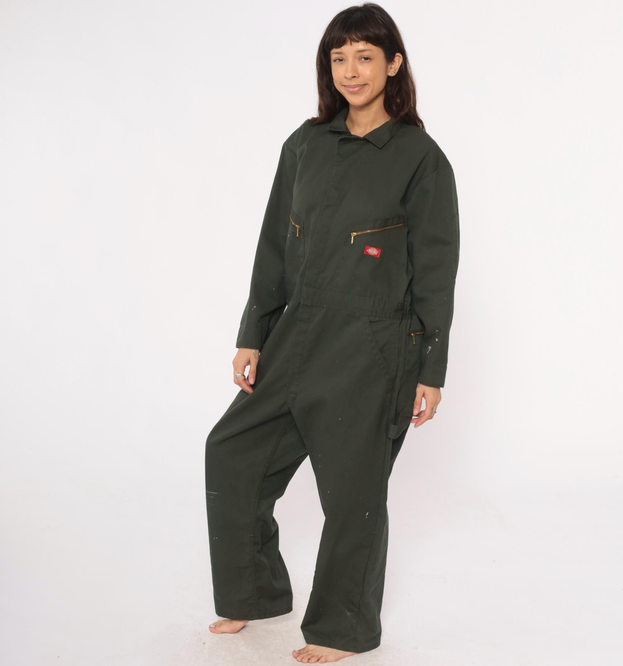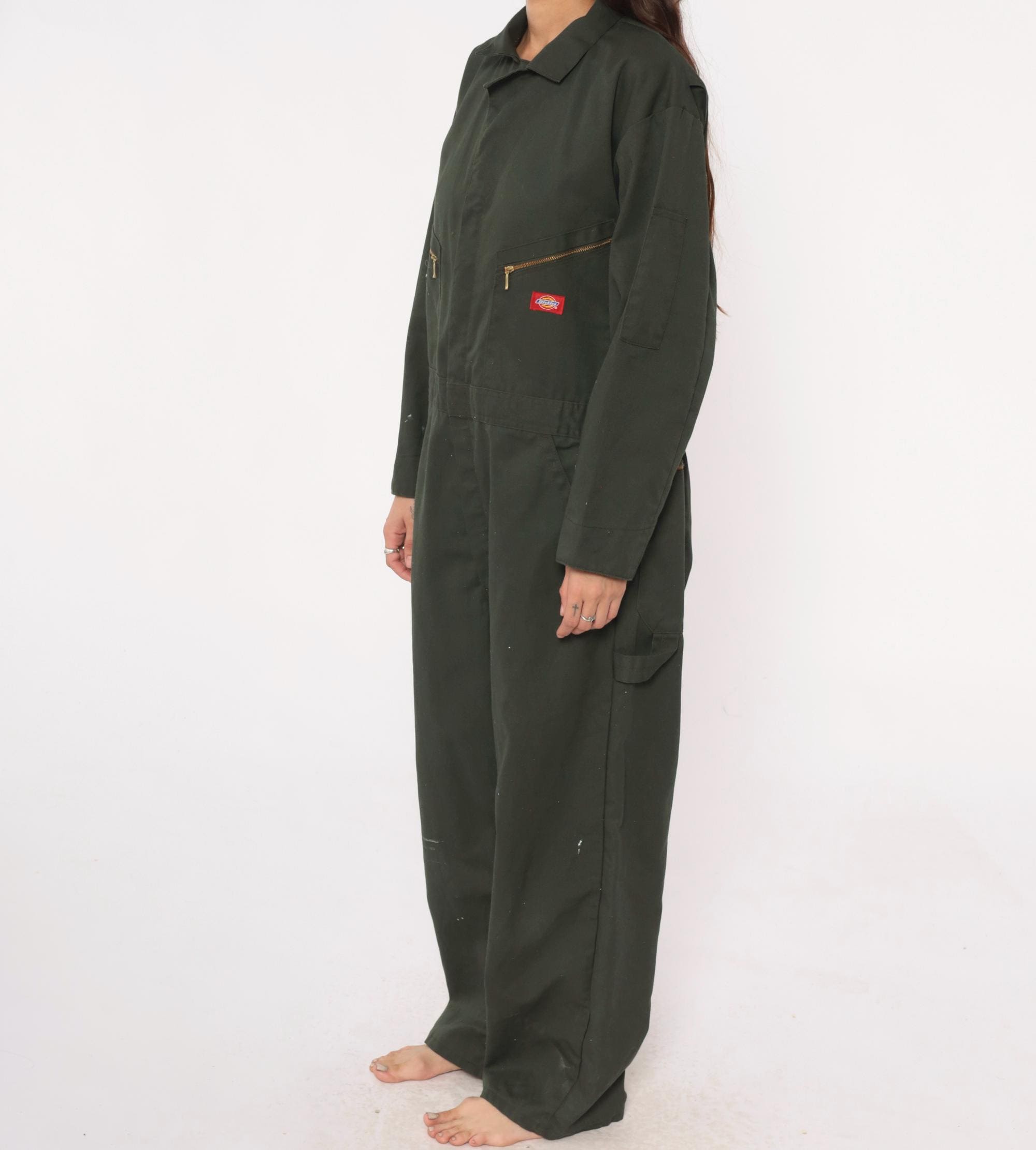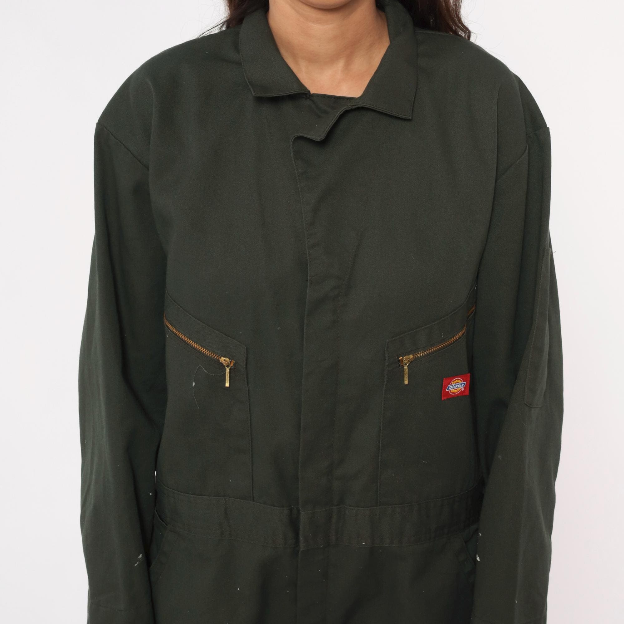 90s forest green coverall from Dickies with collared neckline and full front snap closure. Long sleeves, two chest pockets with brass zipper closures, side seam pockets, back hip pockets.