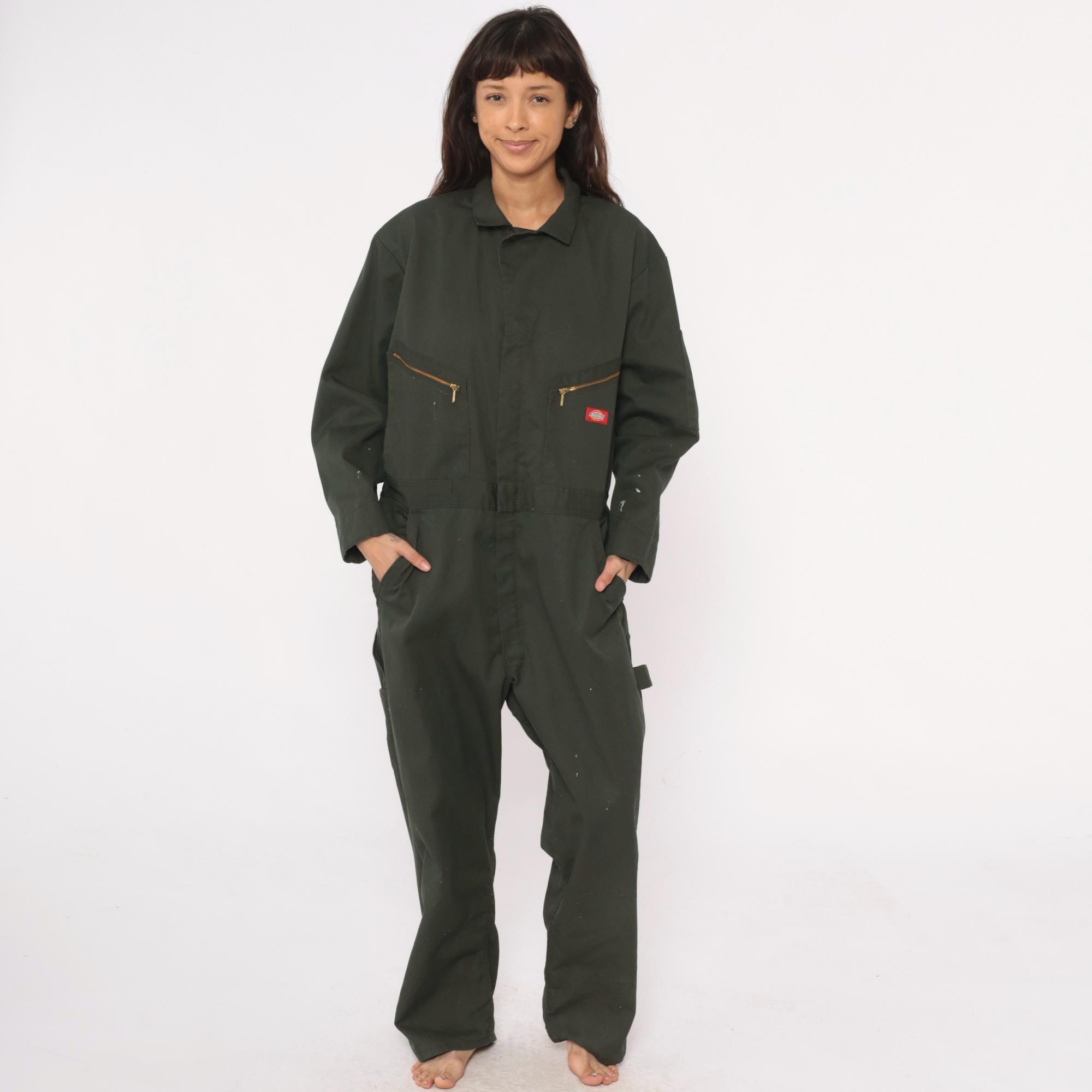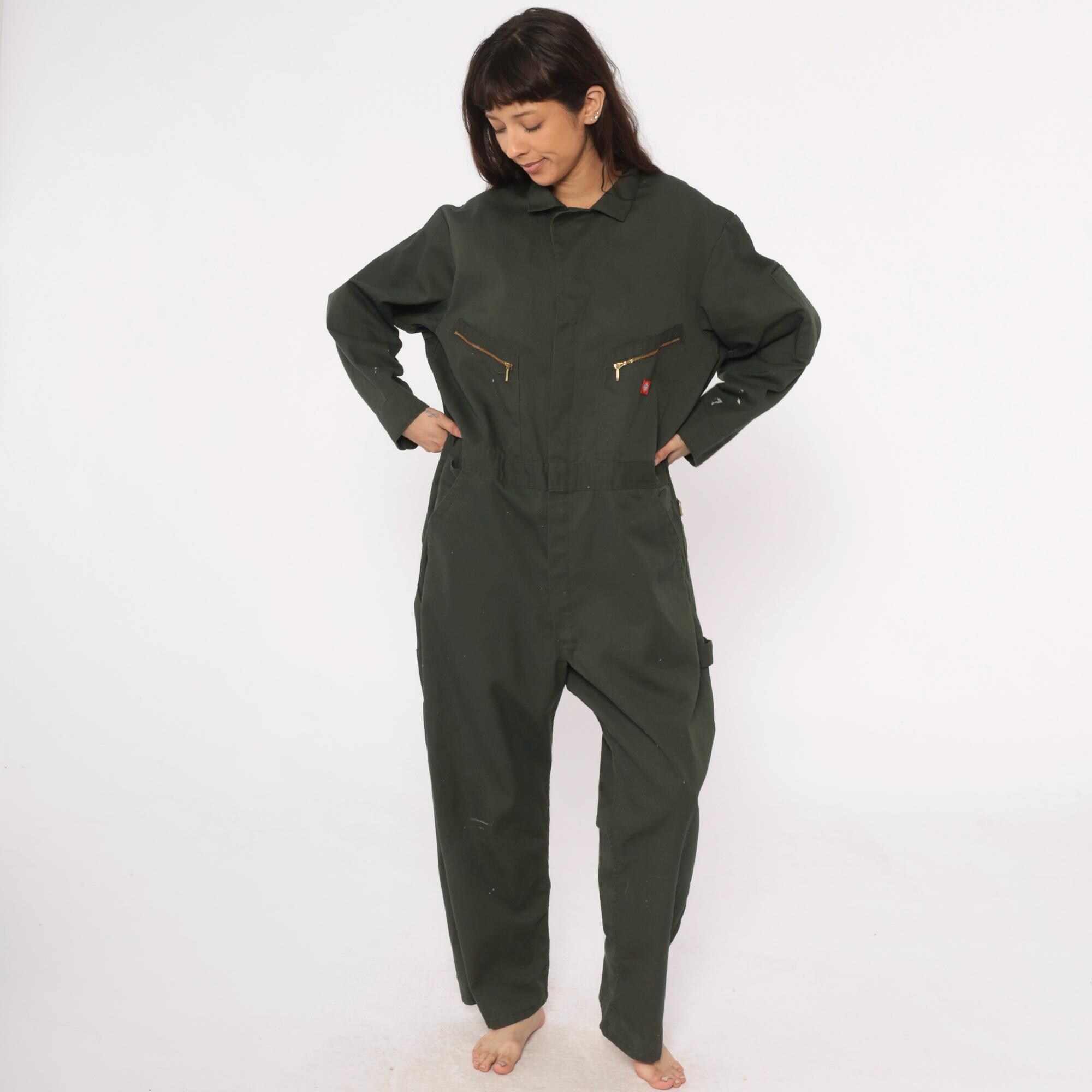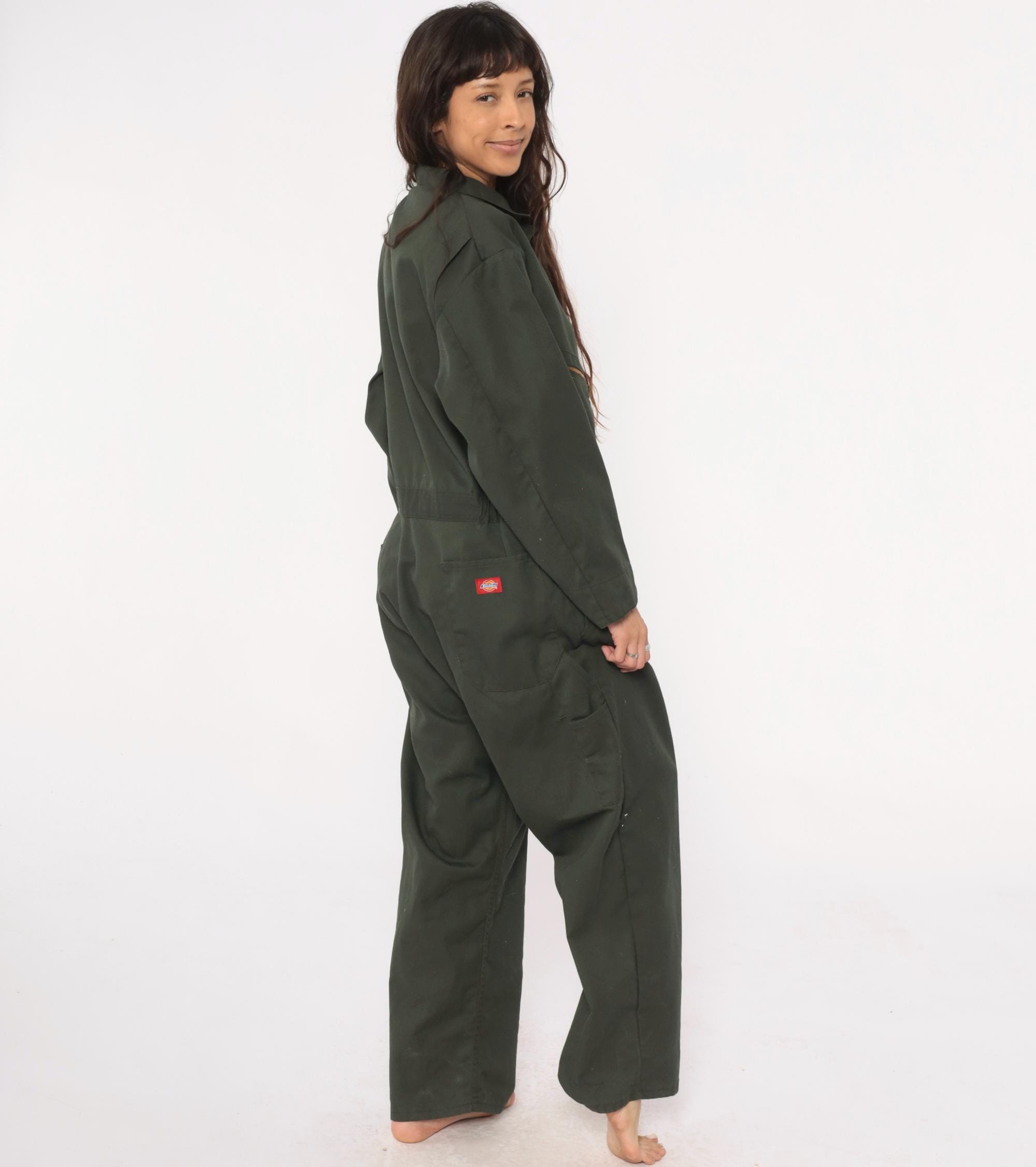 90s forest green coverall from Dickies with collared neckline and full front snap closure. Long sleeves, two chest pockets with brass zipper closures, side seam pockets, back hip pockets.