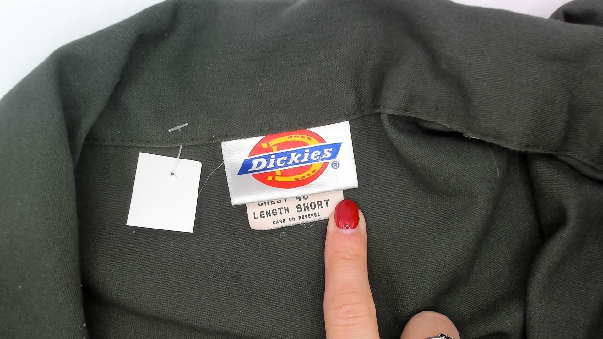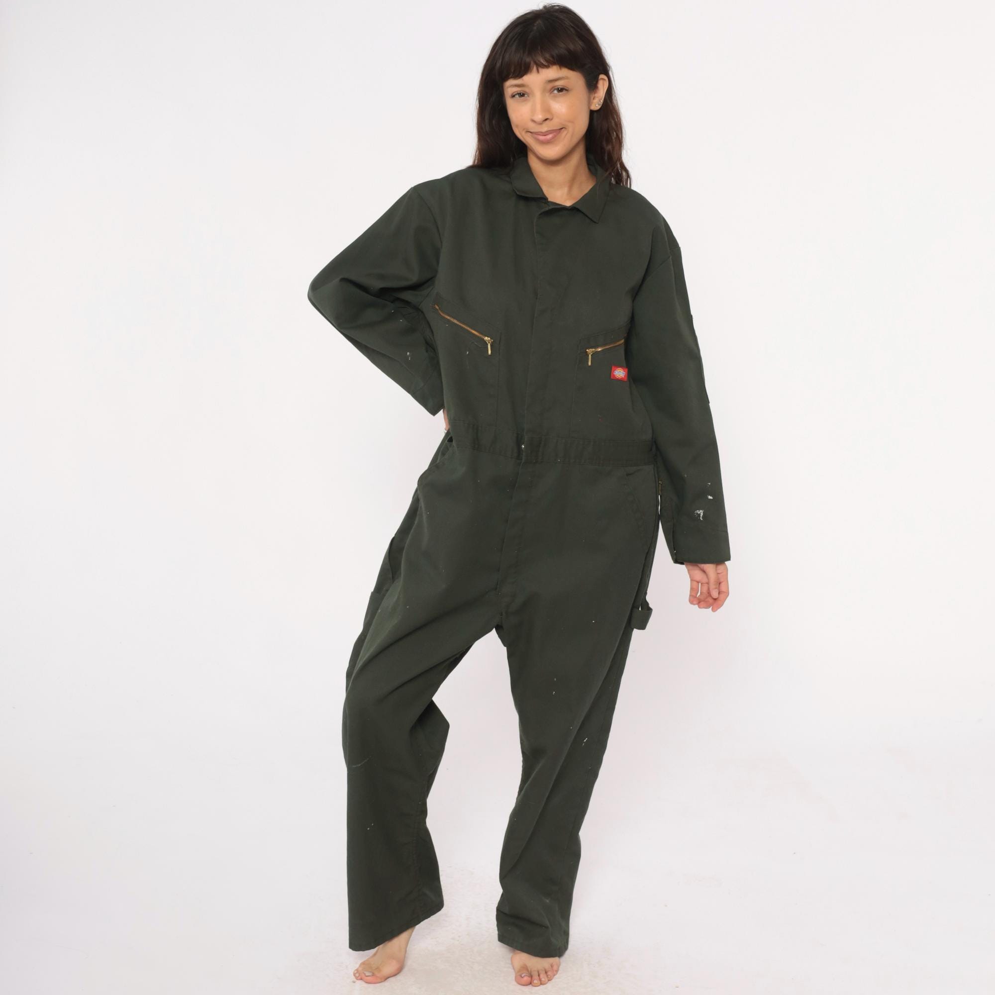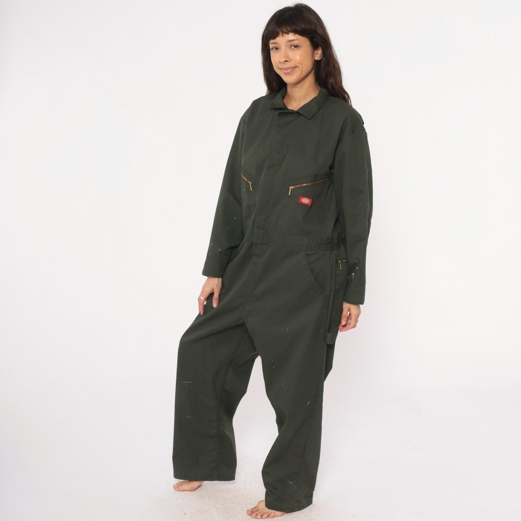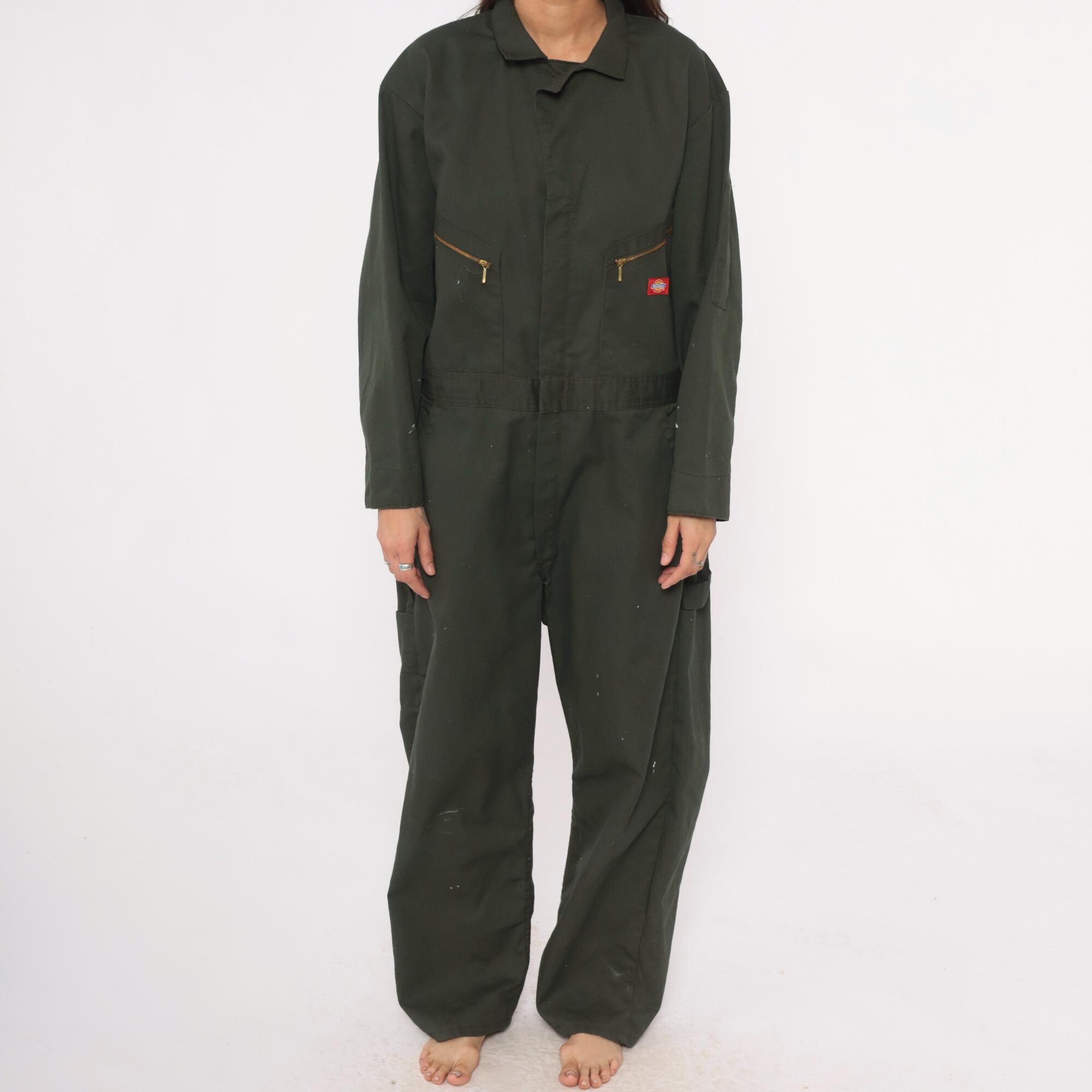 90s forest green coverall from Dickies with collared neckline and full front snap closure. Long sleeves, two chest pockets with brass zipper closures, side seam pockets, back hip pockets.