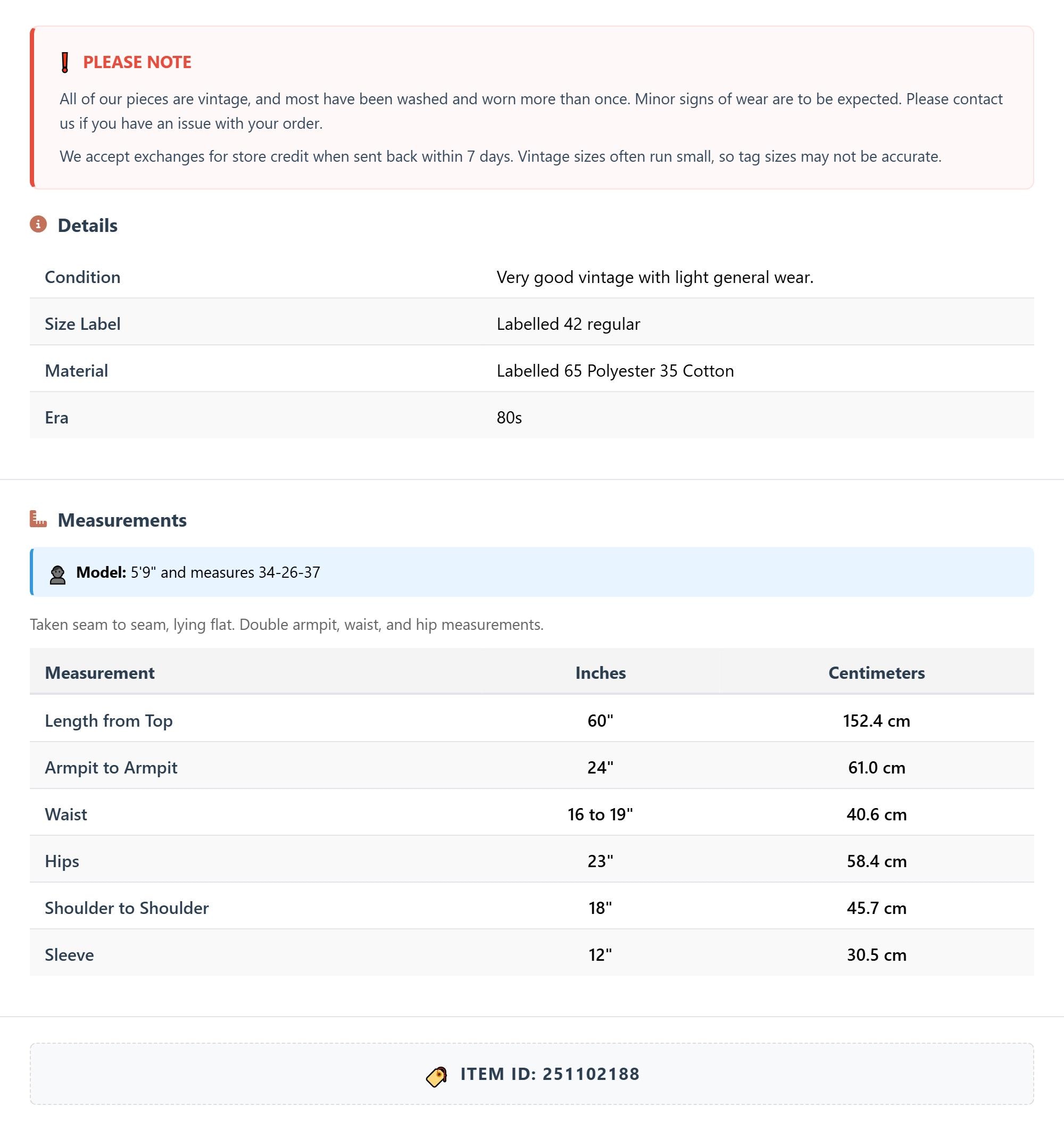 Suggested sizes are estimates only; see measurements for exact sizing. Vintage sizes often run small, so tag sizes may not be accurate.