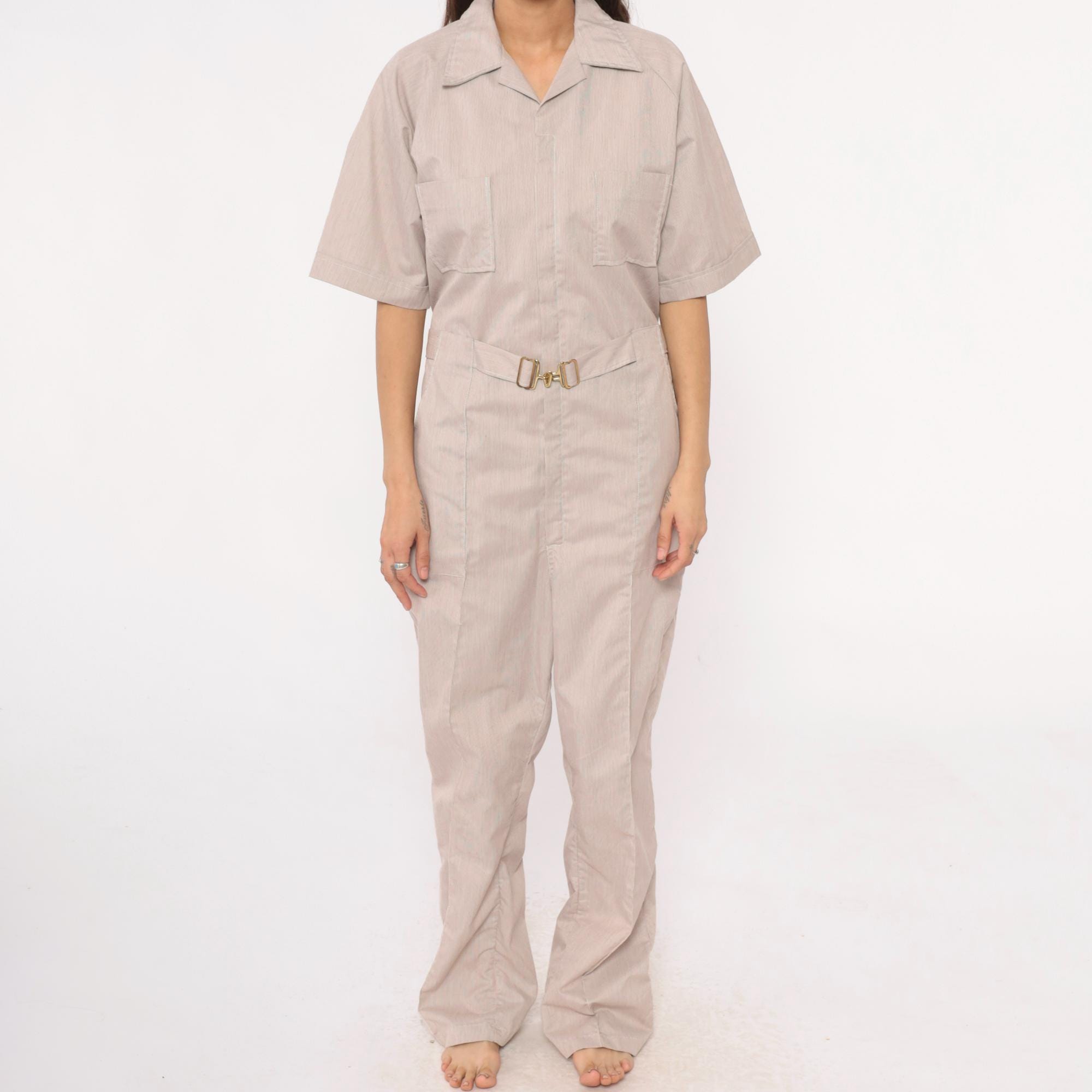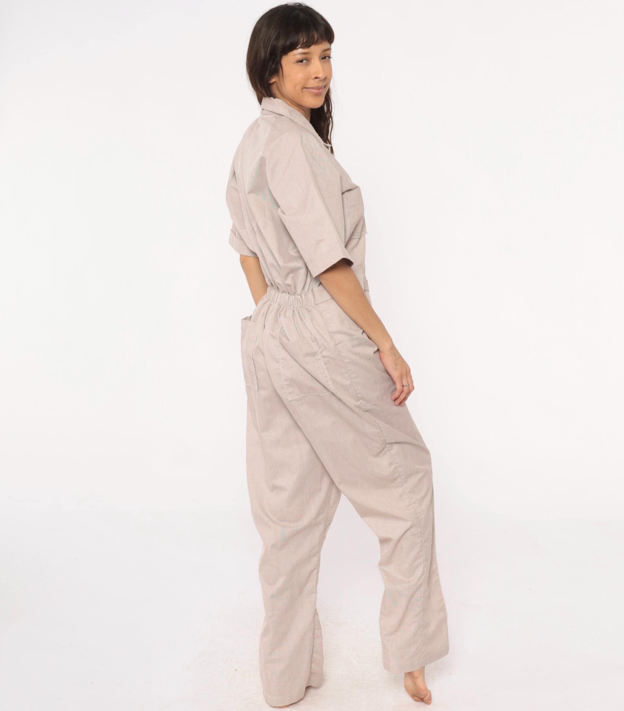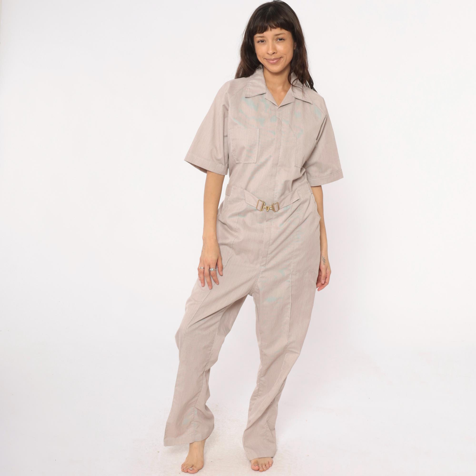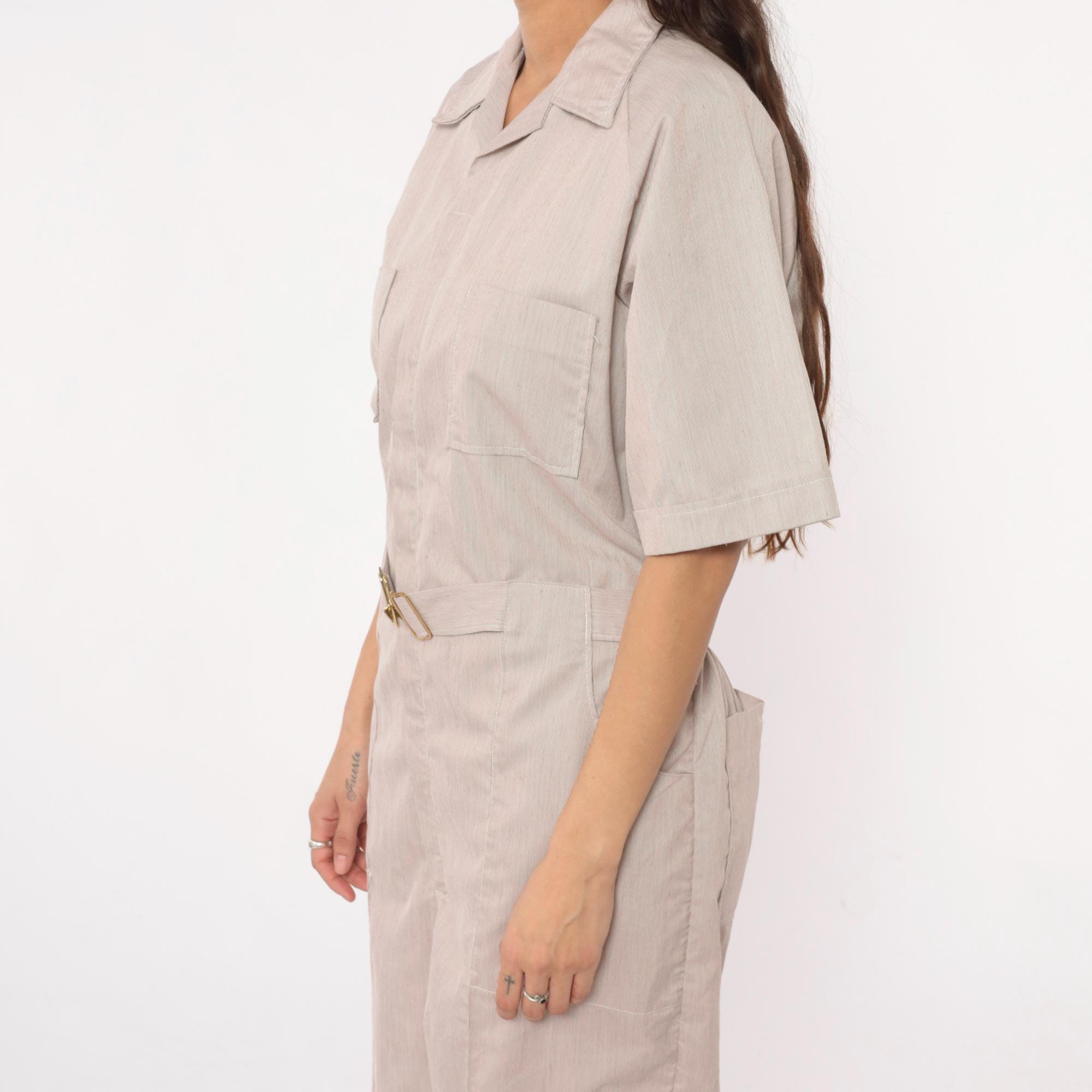 80s beige jumpsuit with notched collar, short sleeves, and front zip closure. Two chest pockets, belted waist with metal hardware buckle, wide leg pants. Back elastic waist detail.