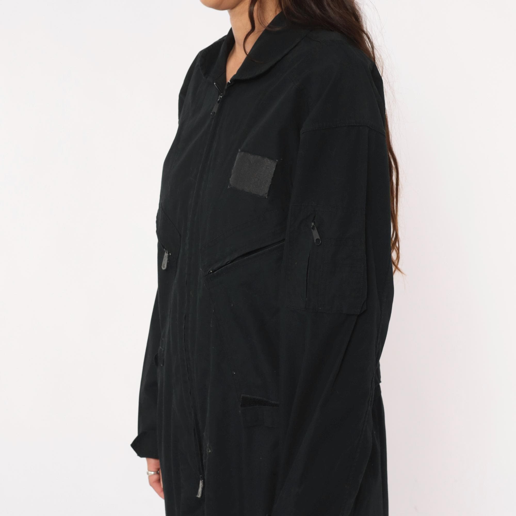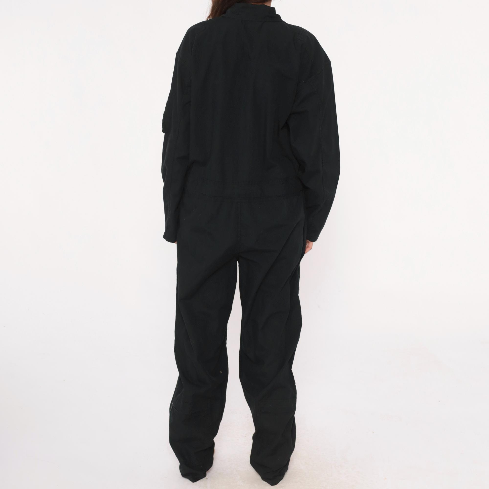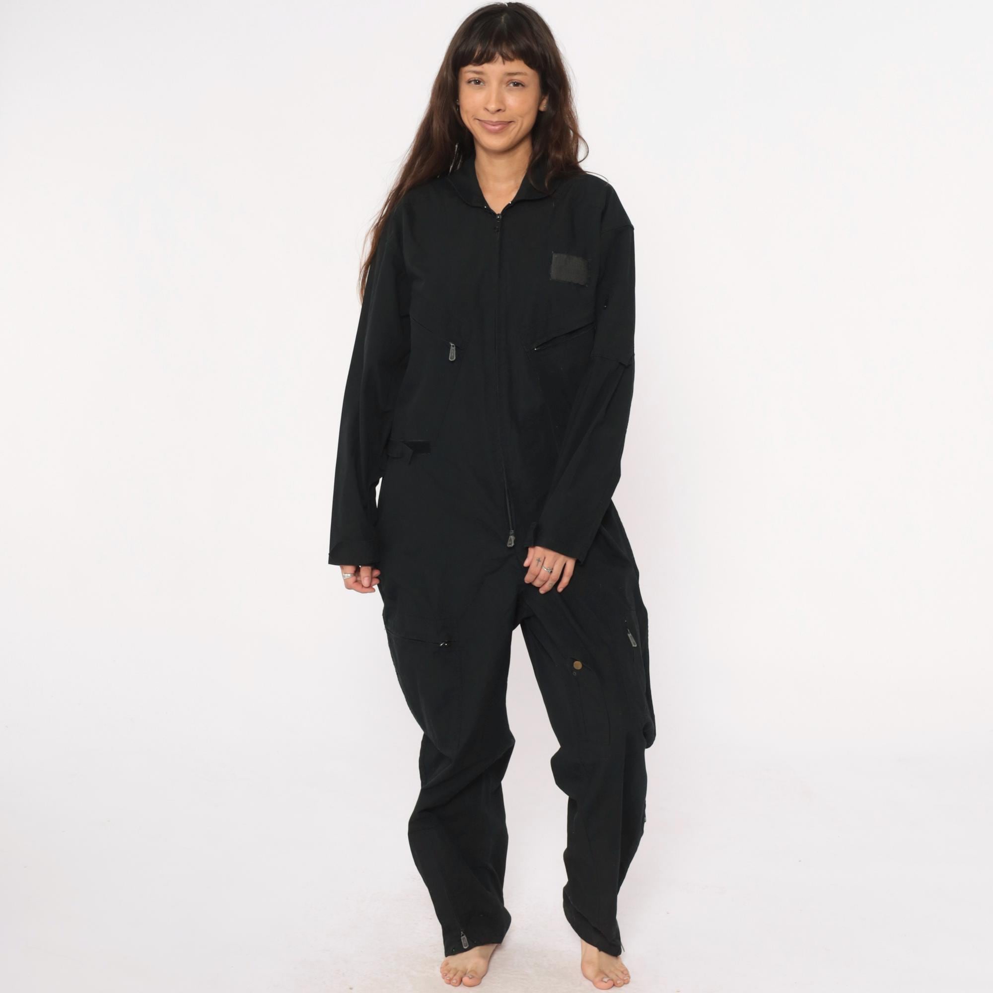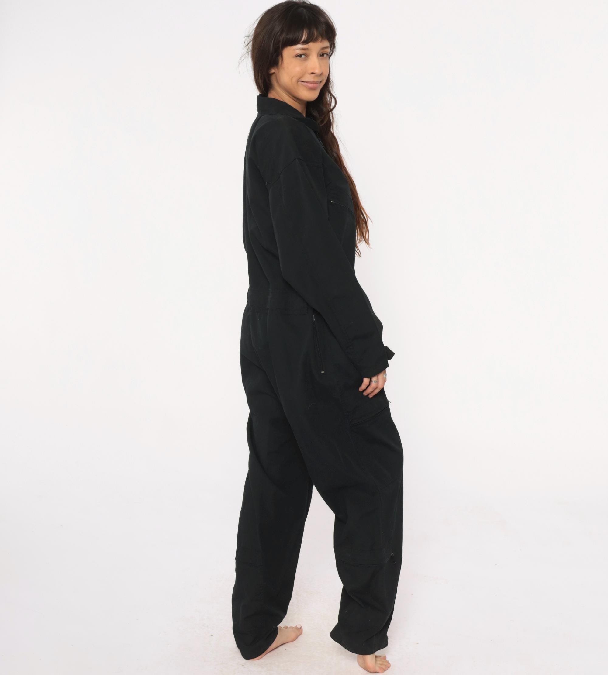 Y2k black coverall from Roth Co with full front zipper closure, spread collar, and long sleeves with adjustable cuffs. Multiple zippered pockets including chest pocket, hand pockets, and side utility pockets.