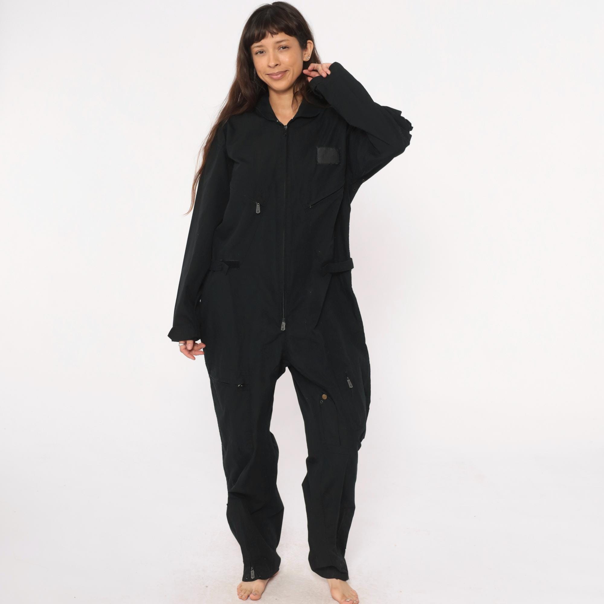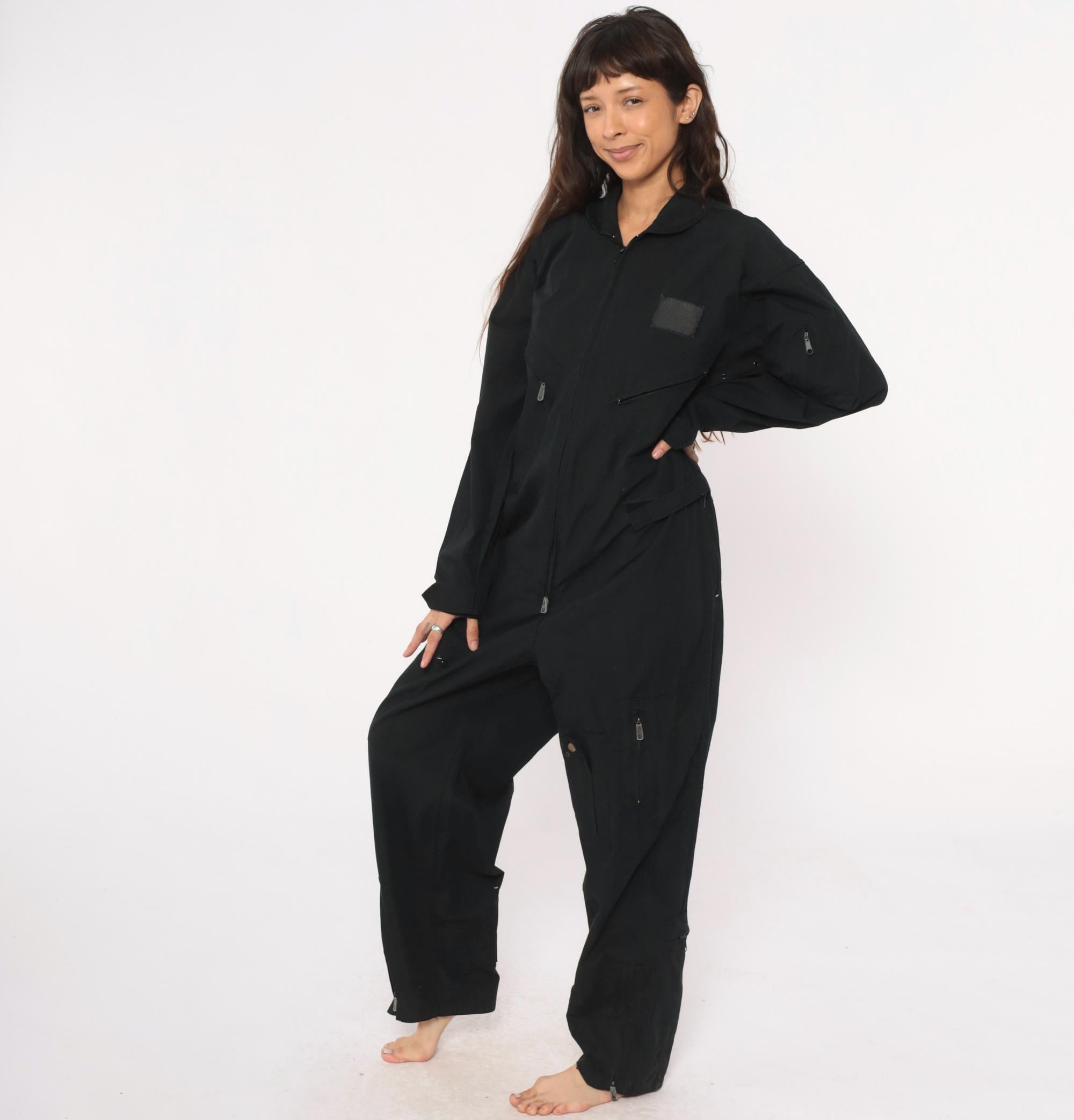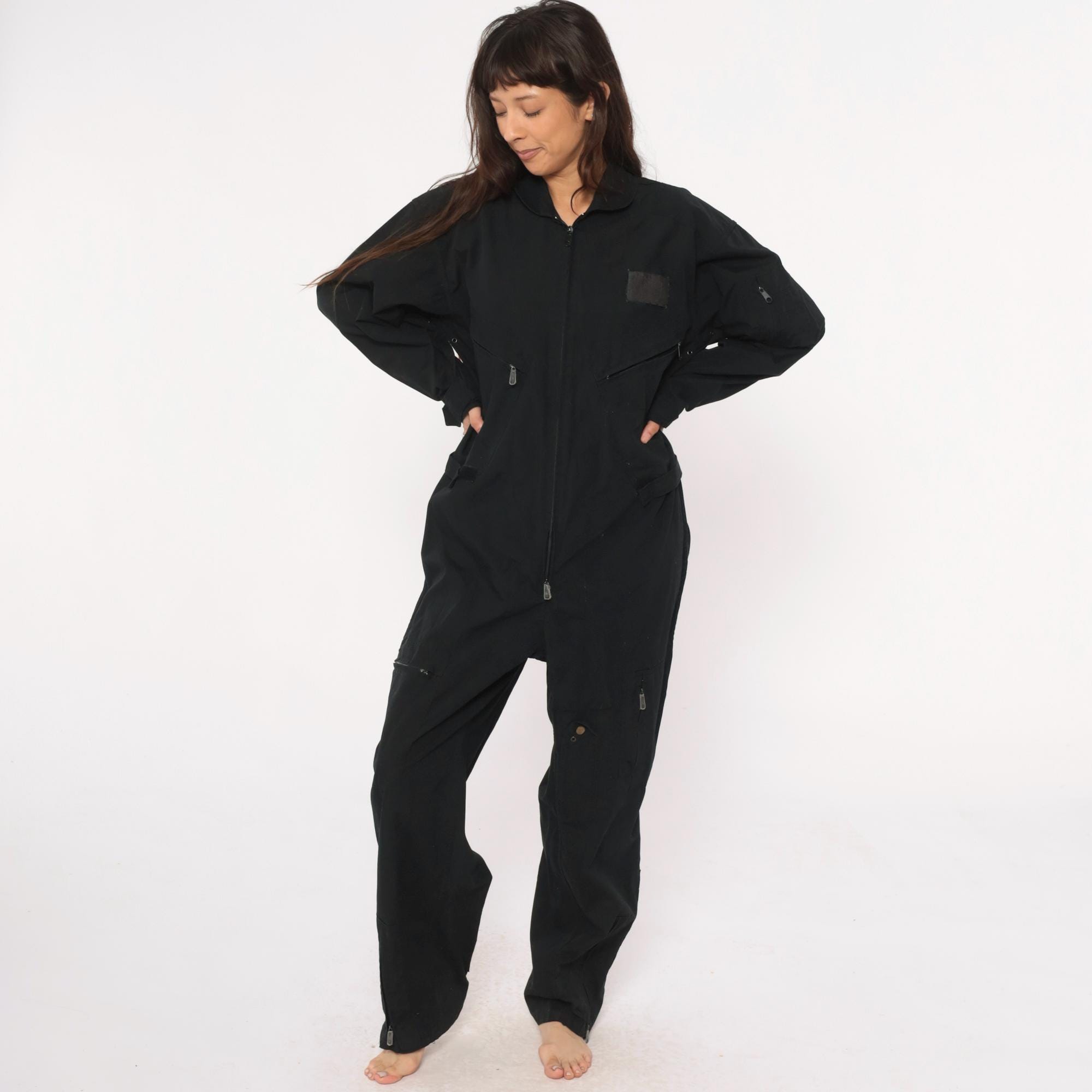 Y2k black coverall from Roth Co with full front zipper closure, spread collar, and long sleeves with adjustable cuffs. Multiple zippered pockets including chest pocket, hand pockets, and side utility pockets.