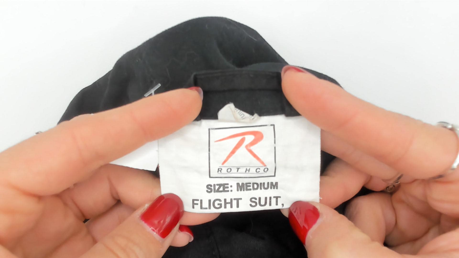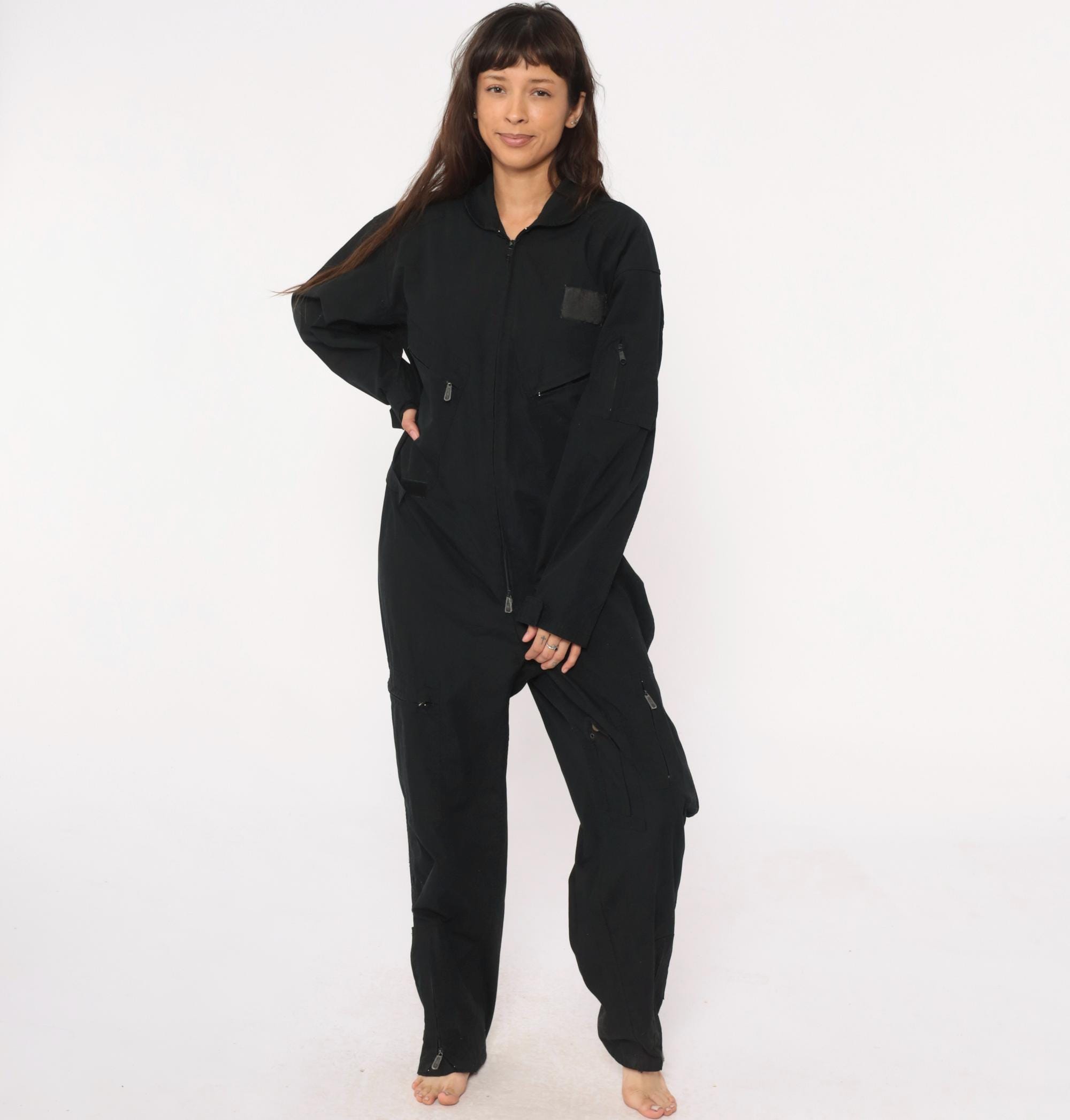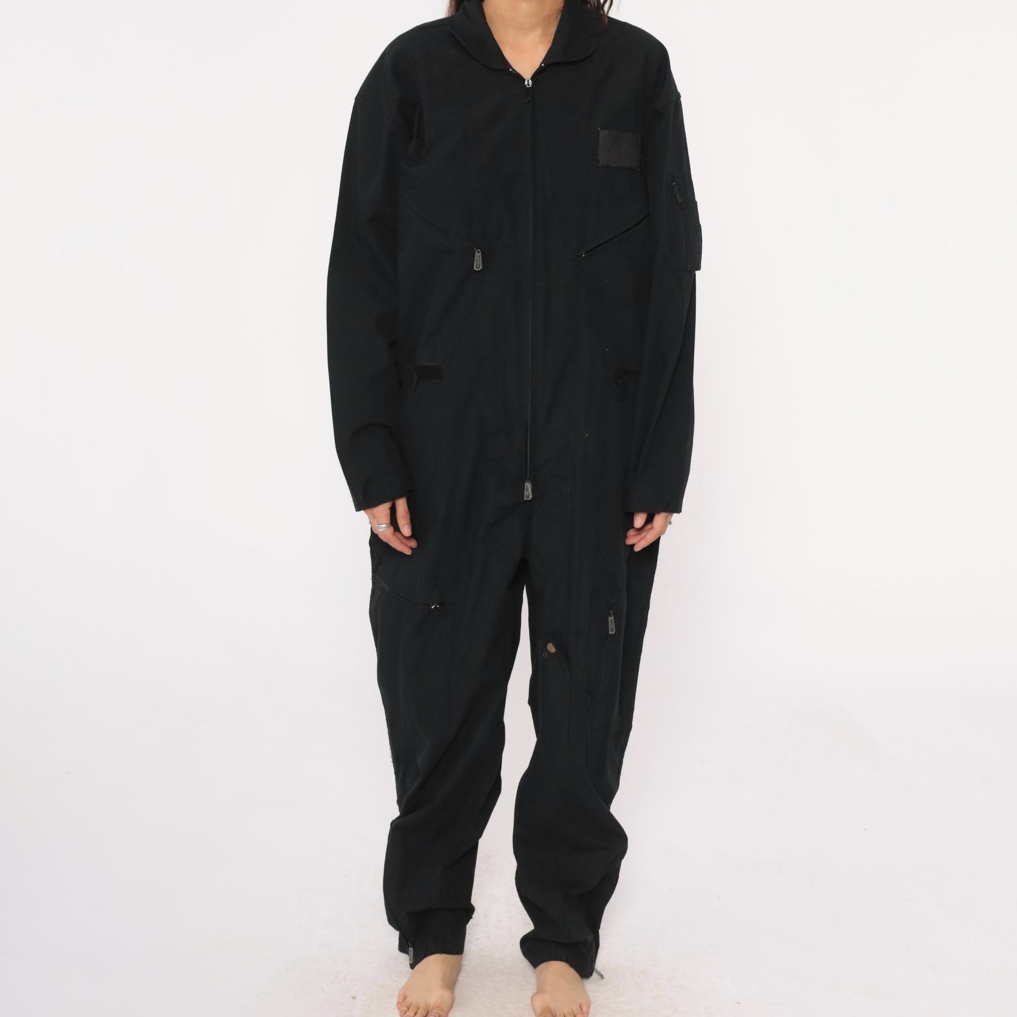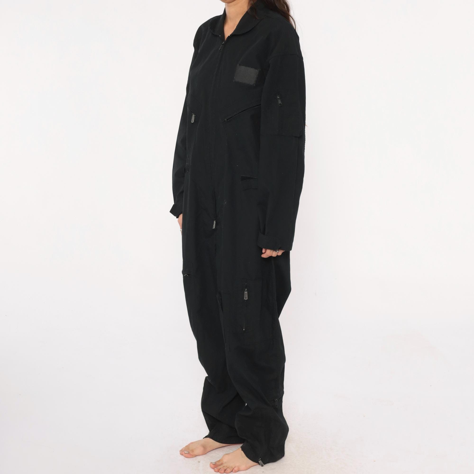 Y2k black coverall from Roth Co with full front zipper closure, spread collar, and long sleeves with adjustable cuffs. Multiple zippered pockets including chest pocket, hand pockets, and side utility pockets.