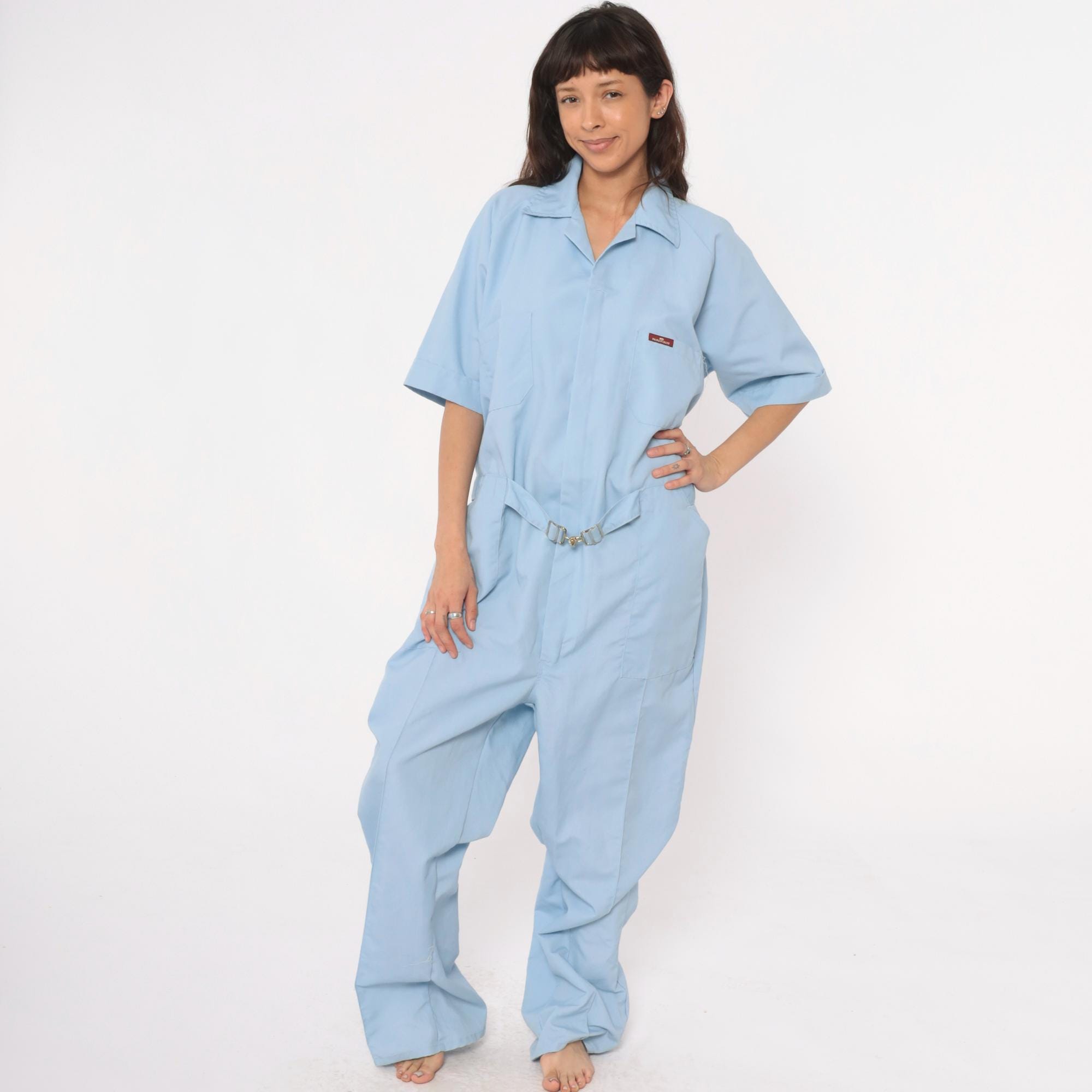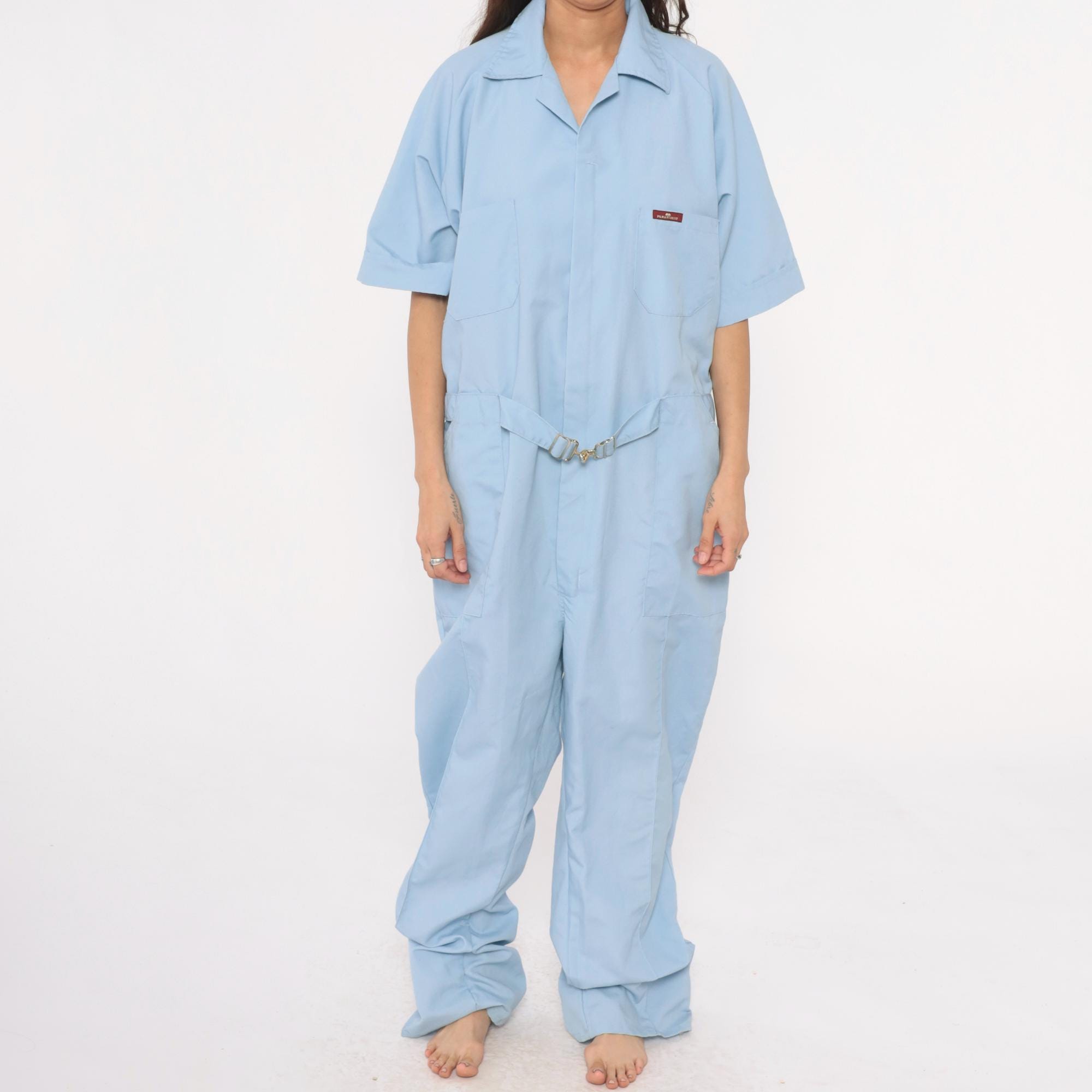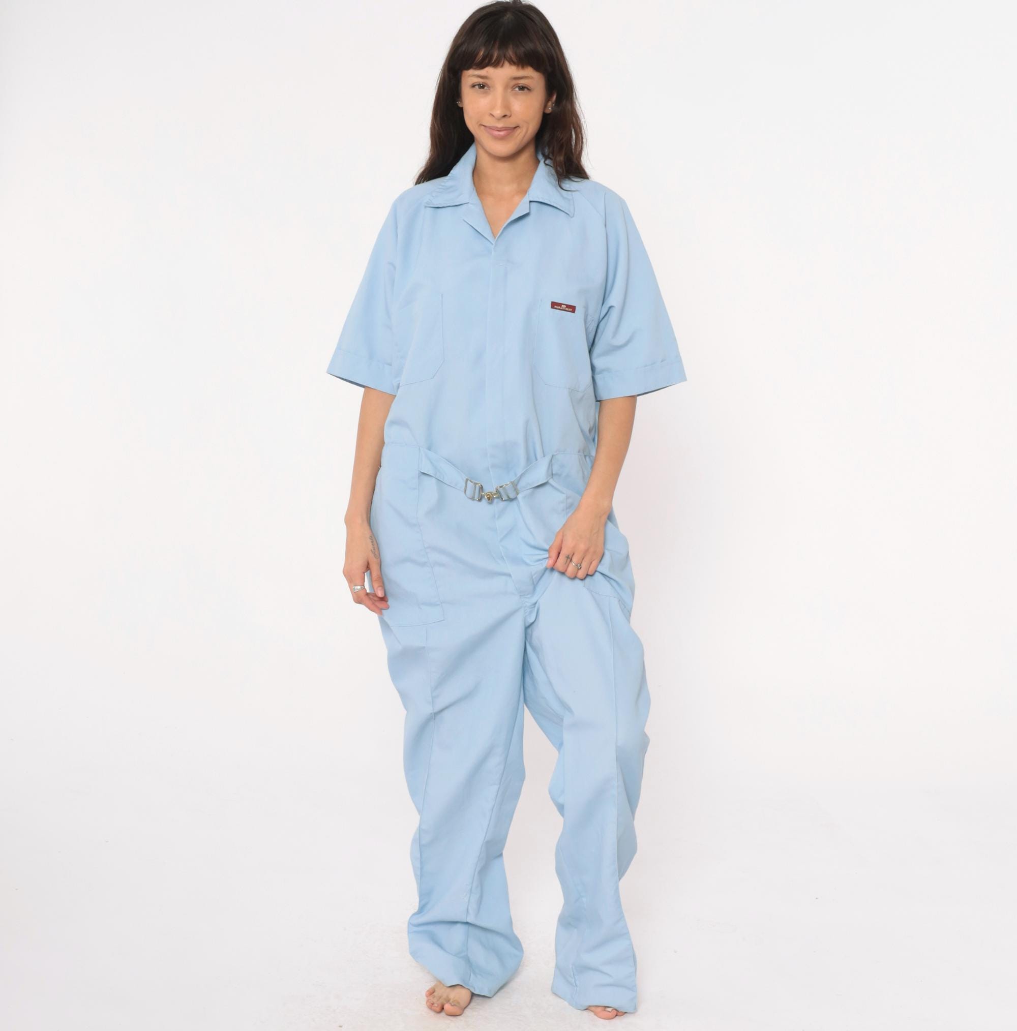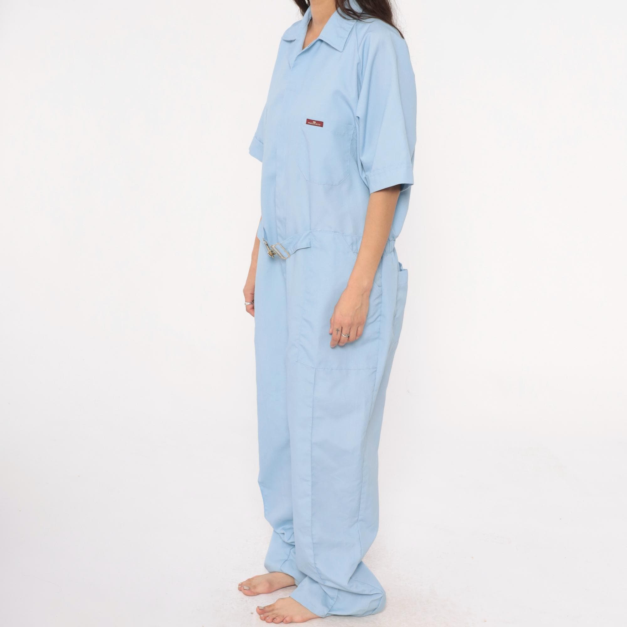 80s light blue one-piece jumpsuit from Parasuit with notched collar, short sleeves with rolled cuffs, and partial button front closure. Two chest pockets, elastic cinched waist with metal buckle closure, hip pockets.