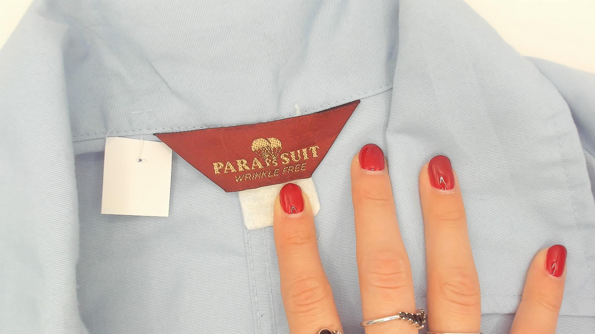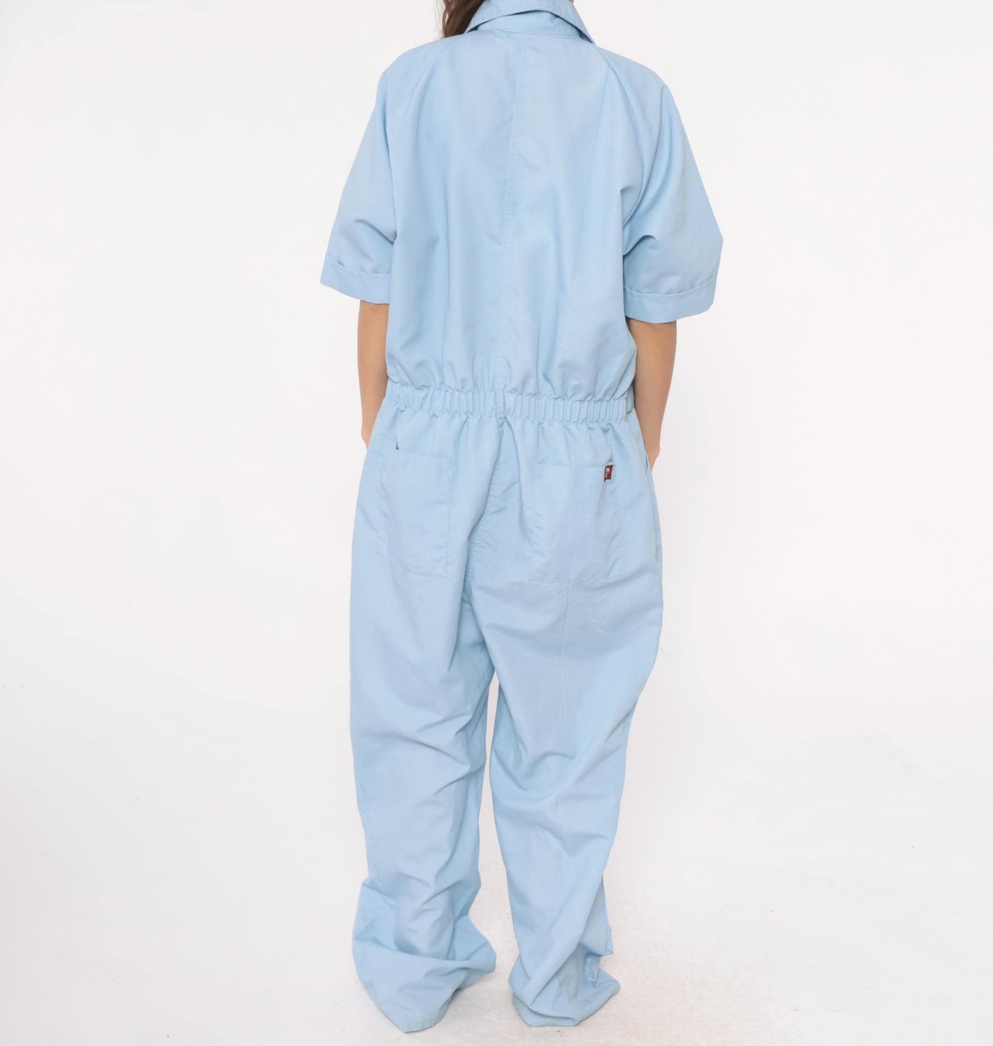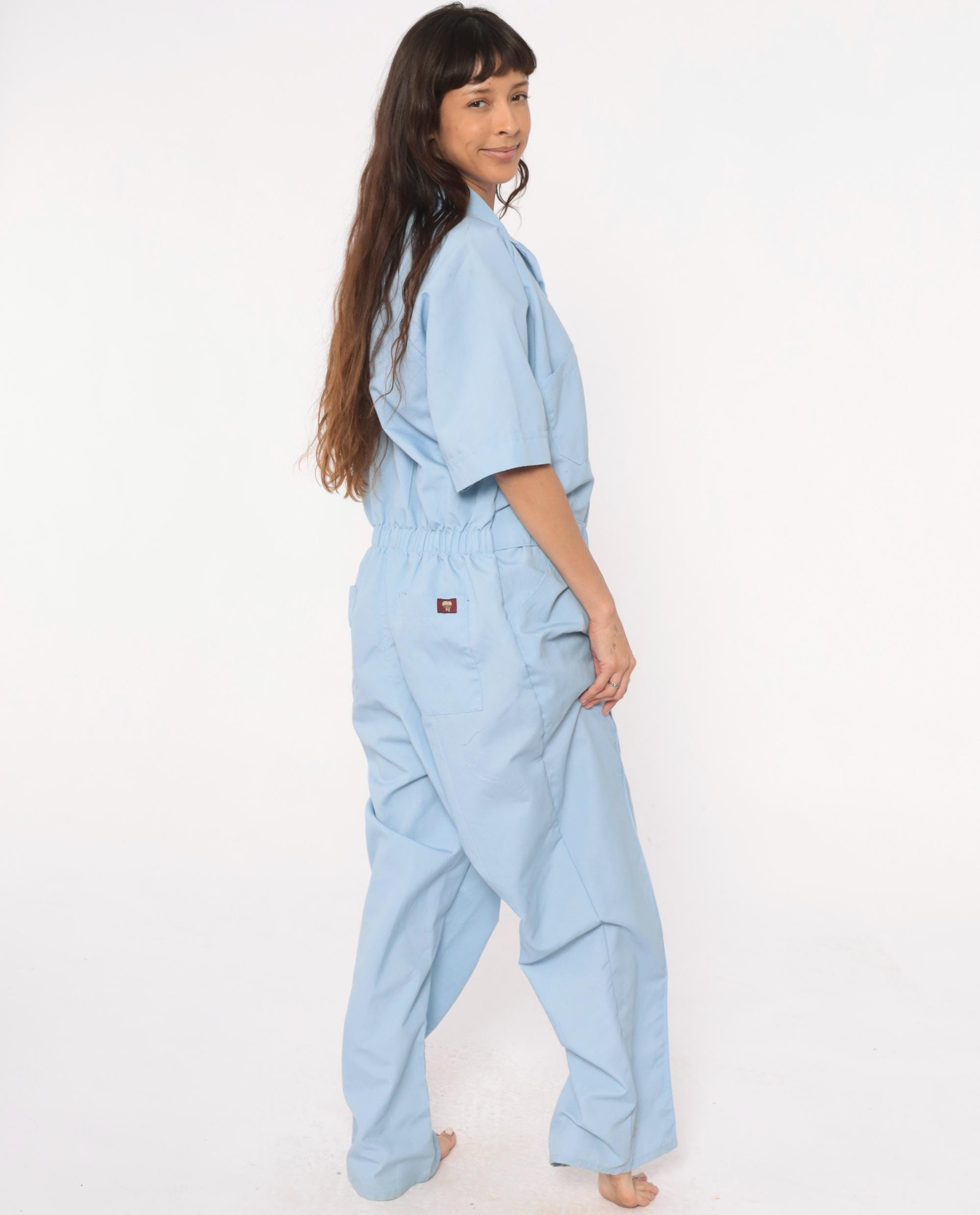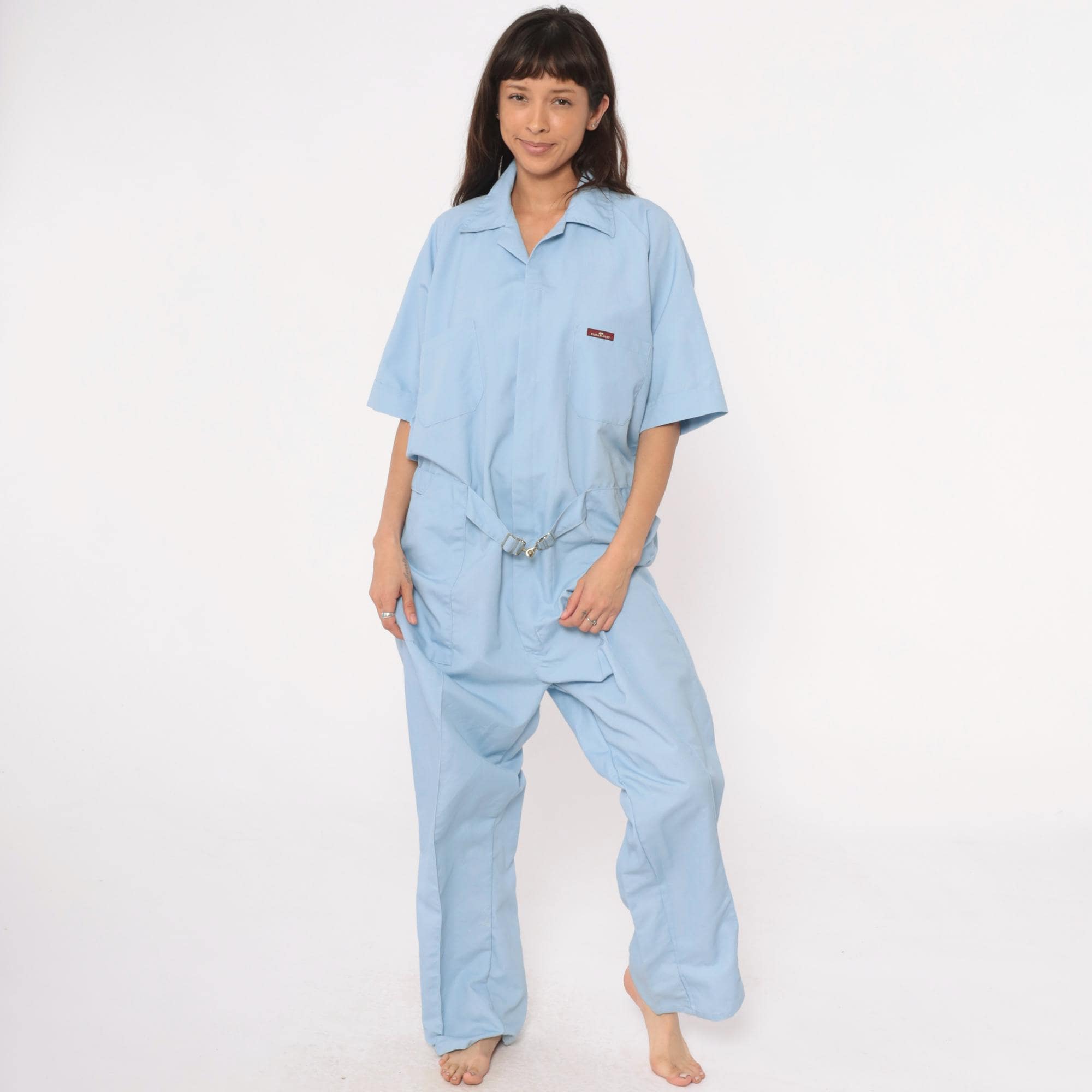 80s light blue one-piece jumpsuit from Parasuit with notched collar, short sleeves with rolled cuffs, and partial button front closure. Two chest pockets, elastic cinched waist with metal buckle closure, hip pockets.