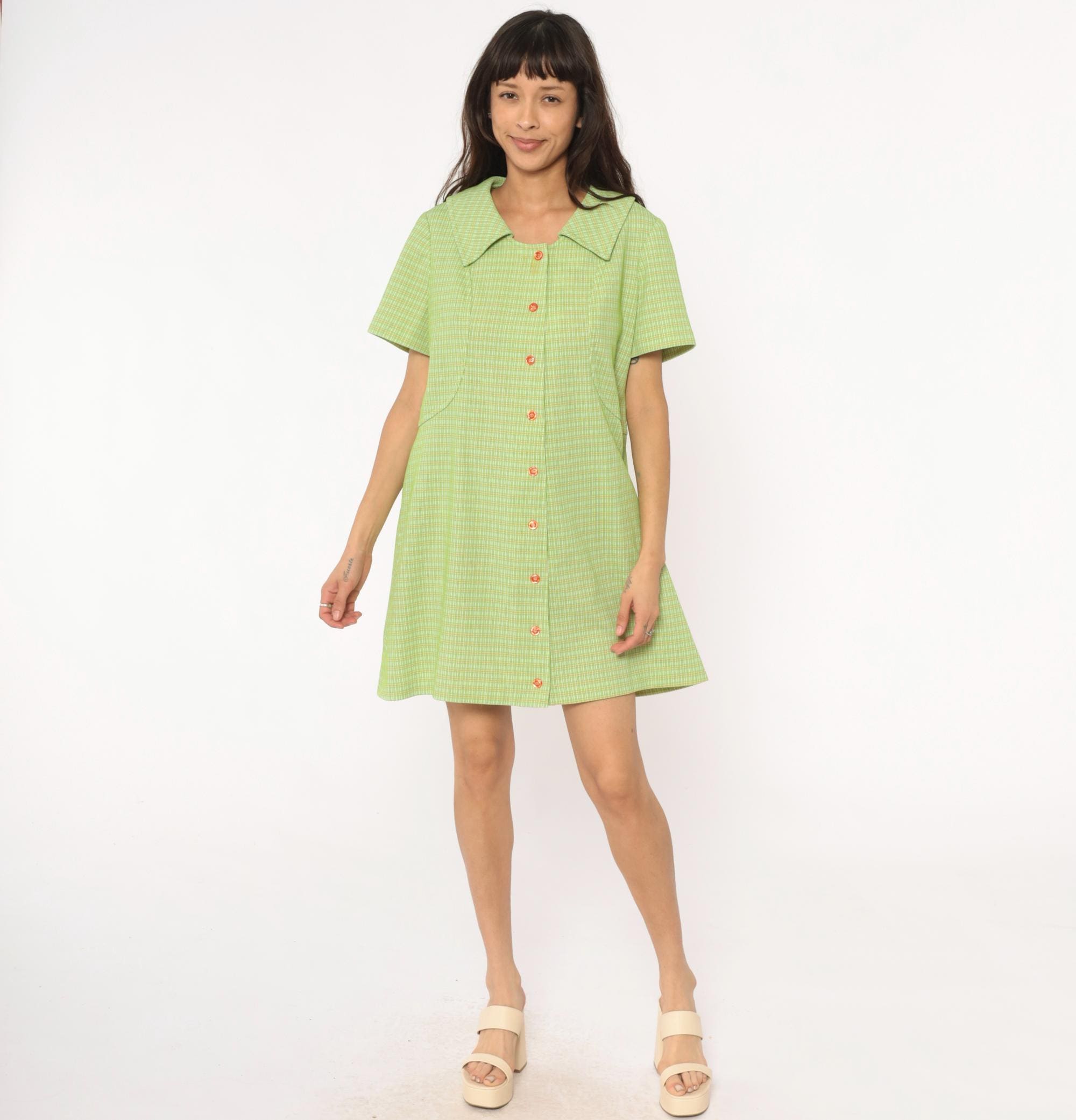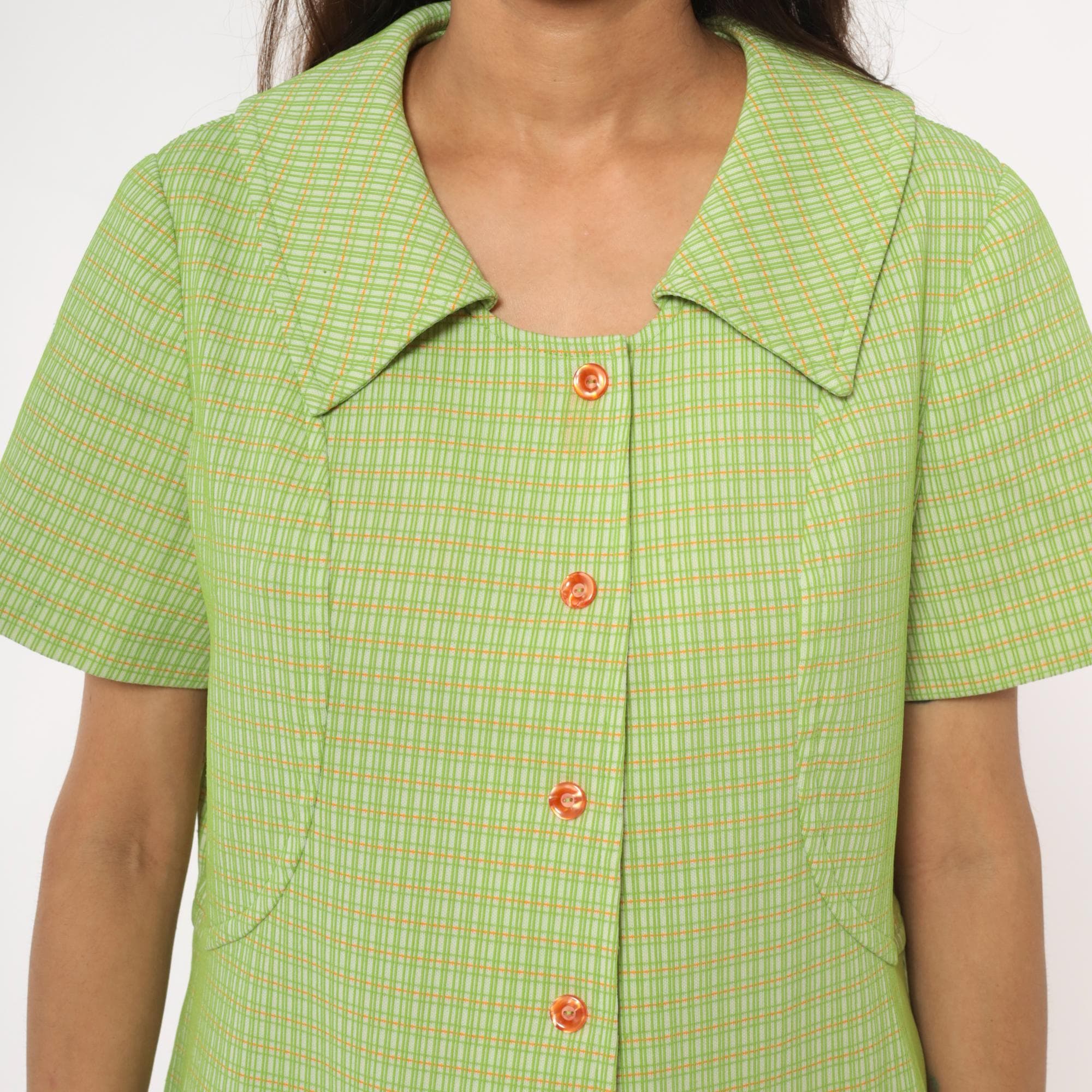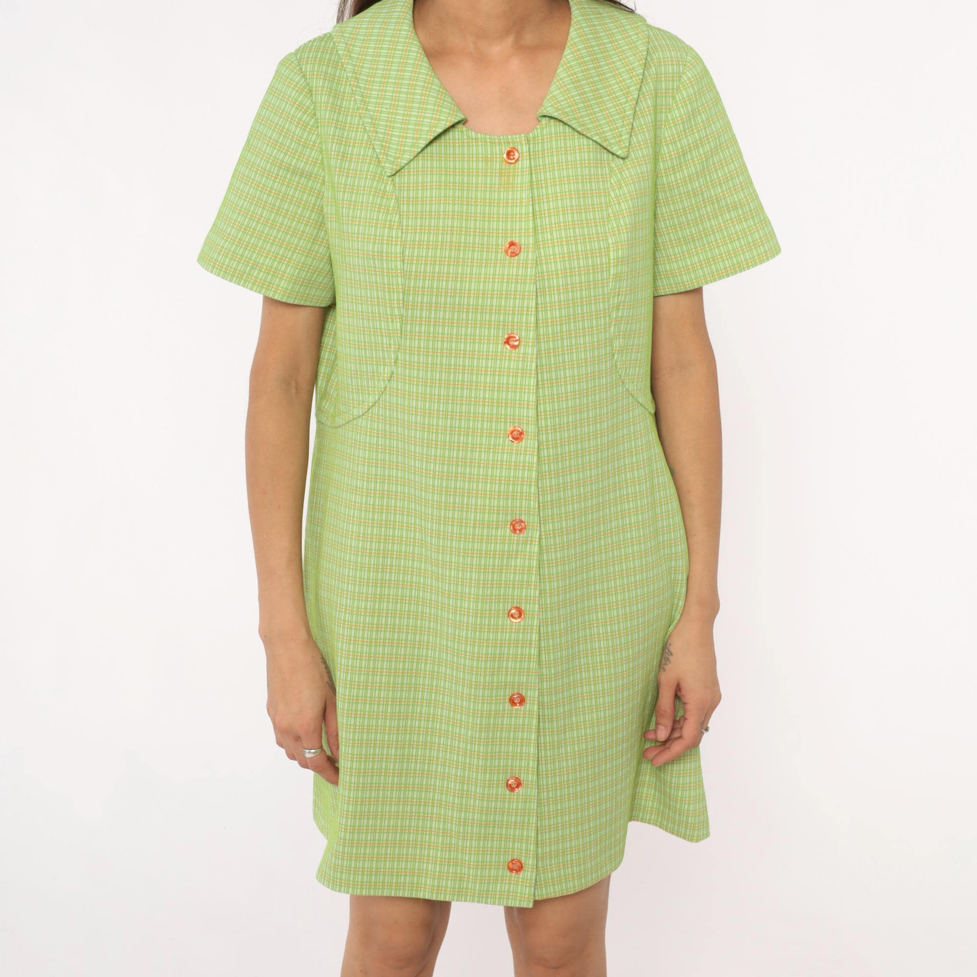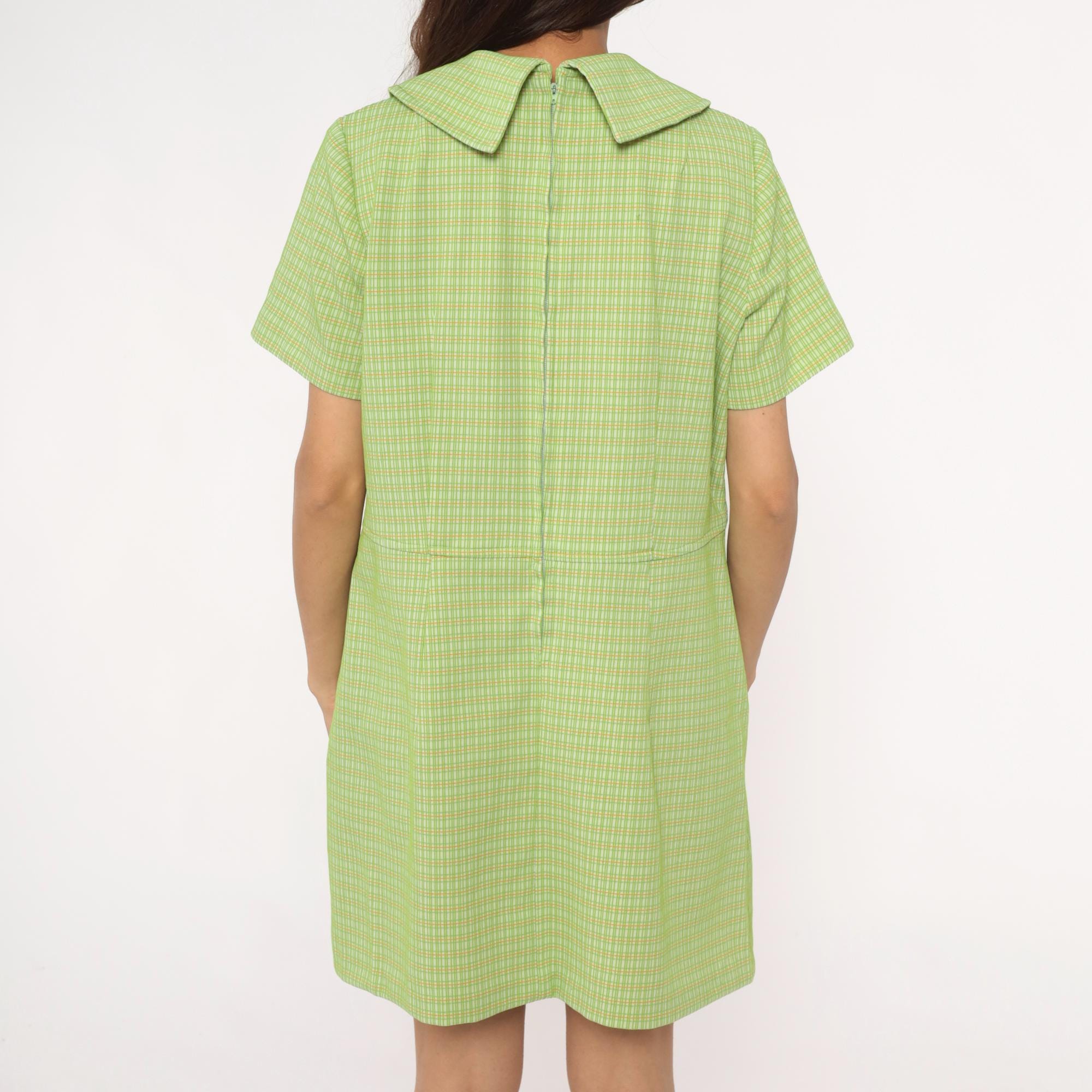70s green and yellow check pattern shift dress in polyester with pointed collar and faux button front with zipper back closure. Short sleeves and straight silhouette. Lime green and yellow plaid throughout.