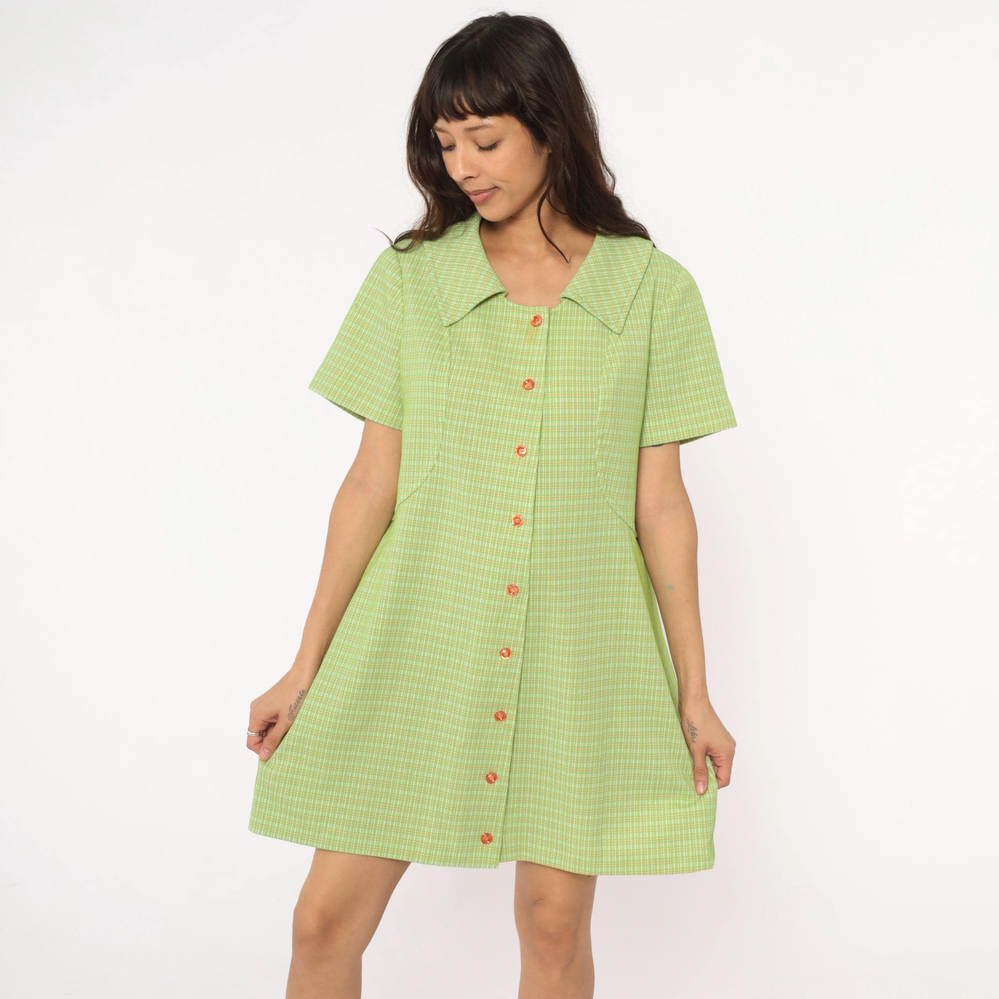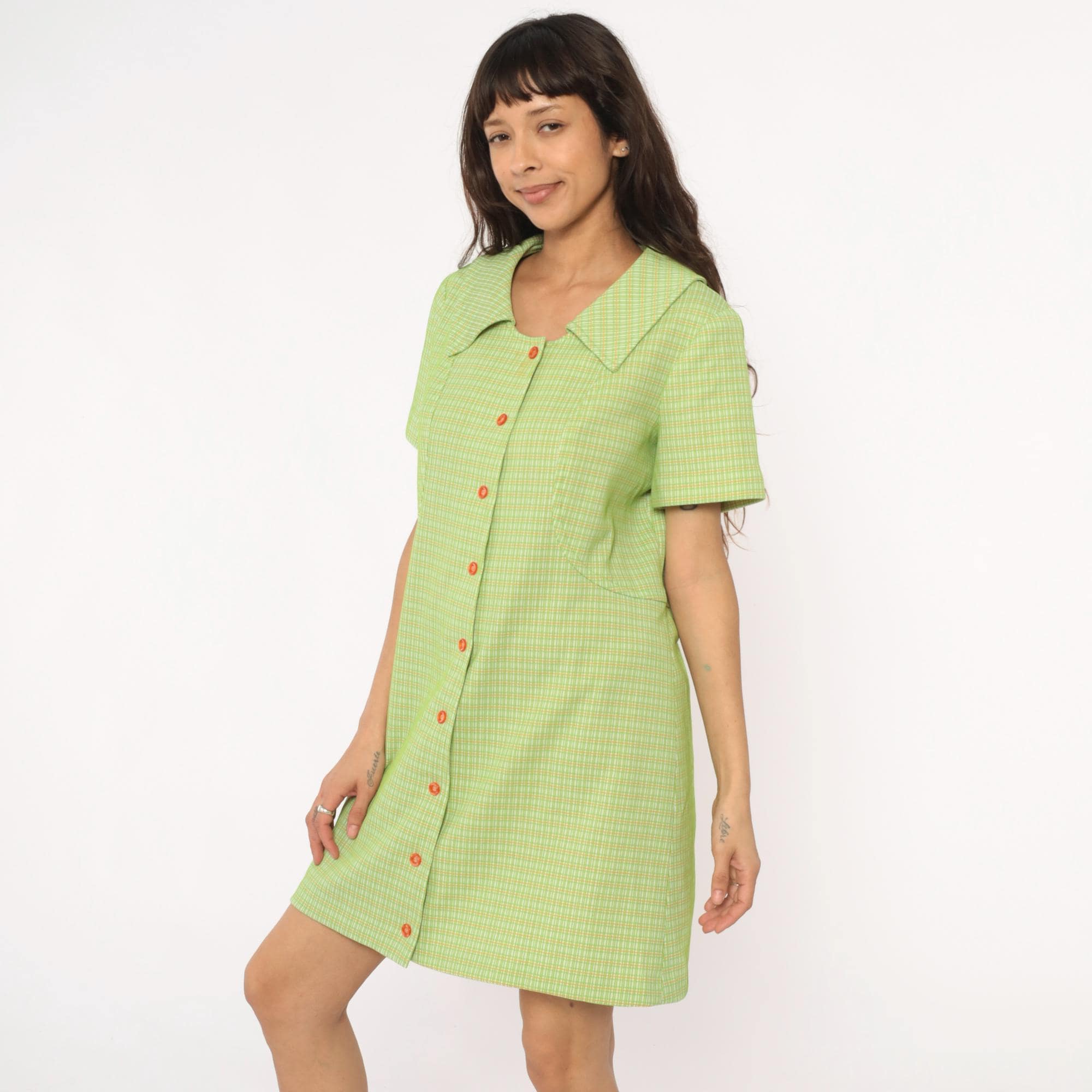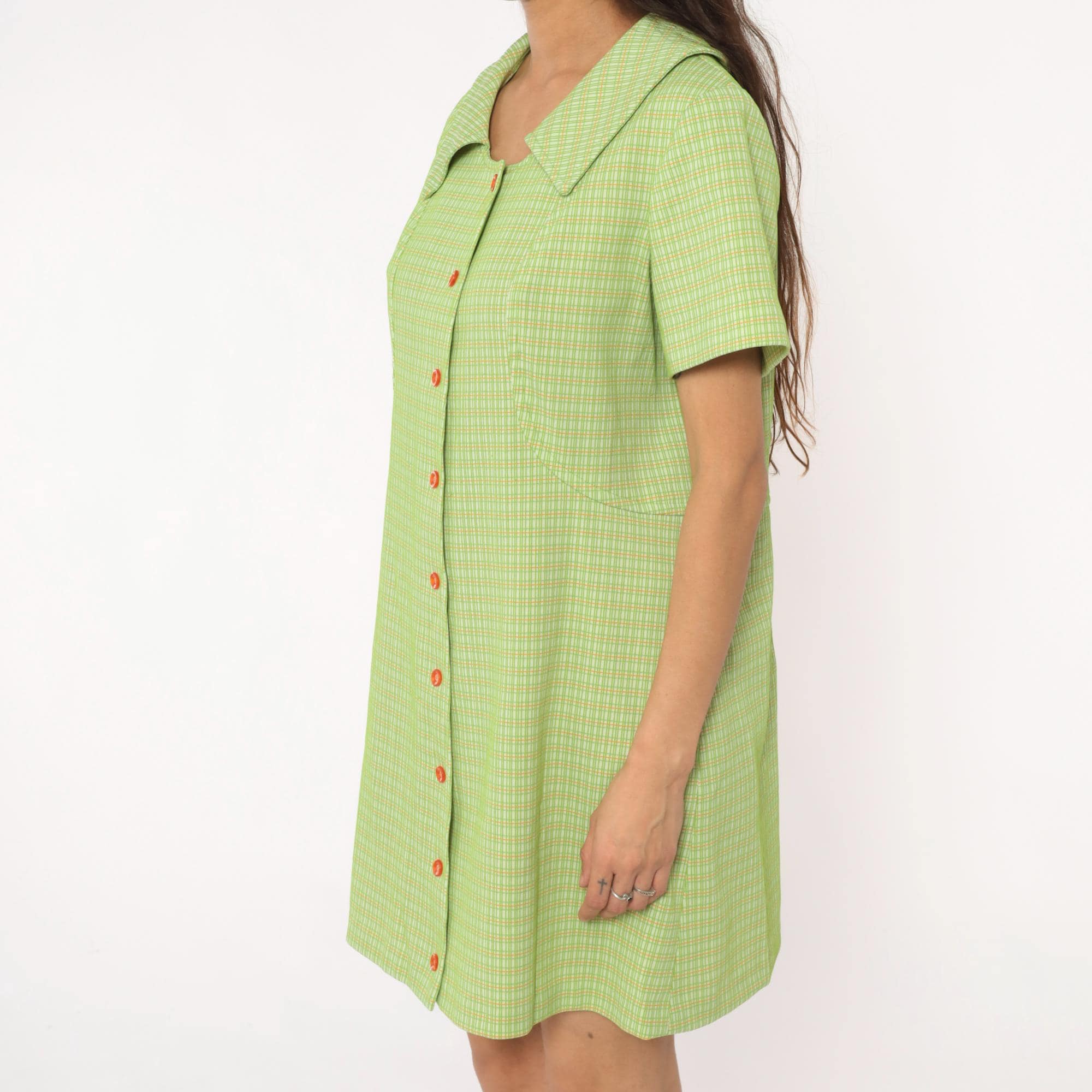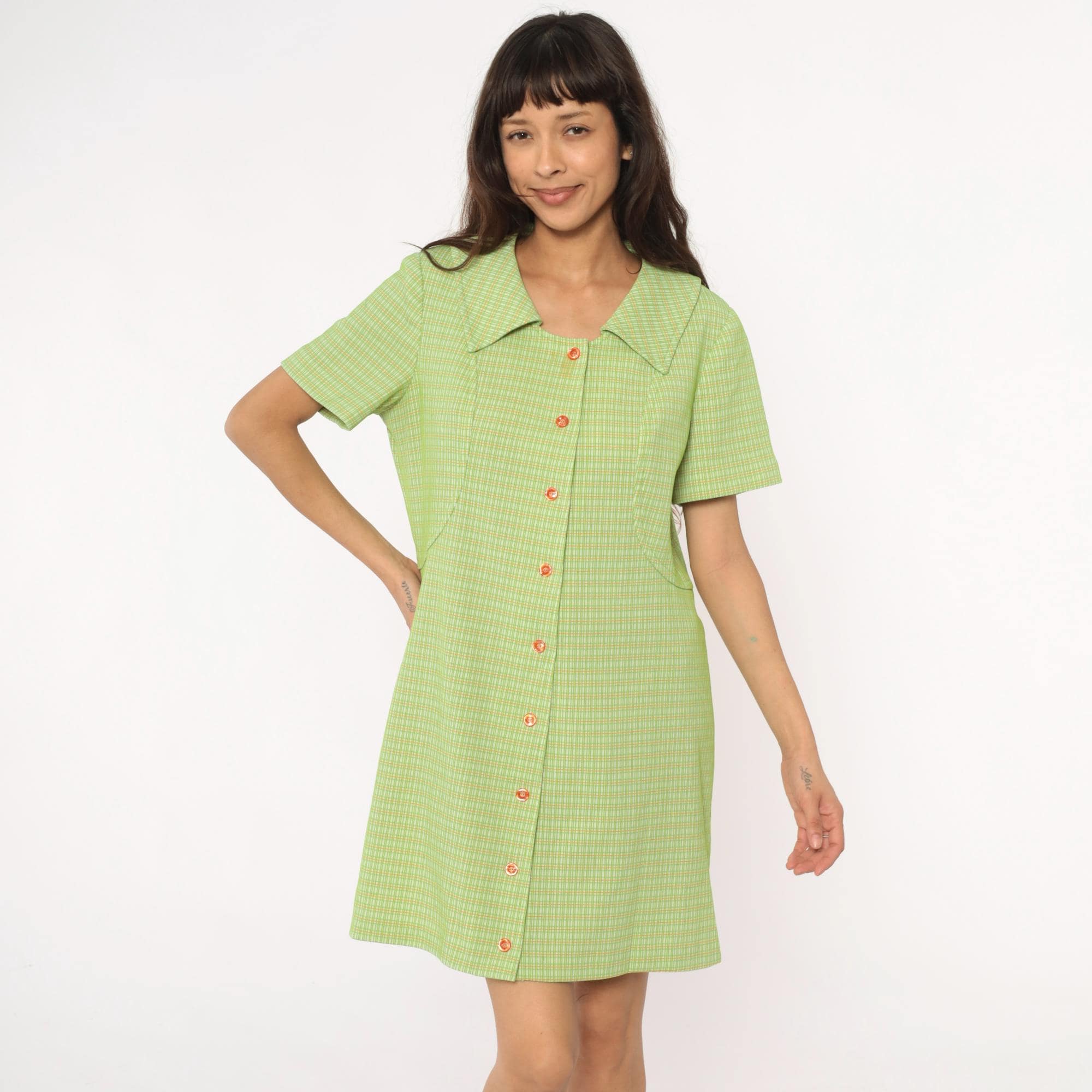 70s green and yellow check pattern shift dress in polyester with pointed collar and faux button front with zipper back closure. Short sleeves and straight silhouette. Lime green and yellow plaid throughout.