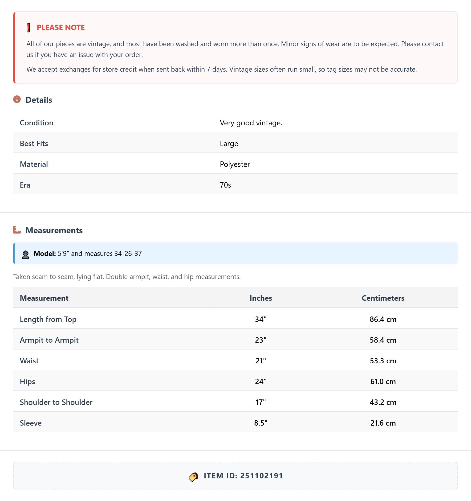 All of our pieces are vintage, and most have been washed and worn more than once. Minor signs of wear are to be expected. Please contact us if you have an issue with your order. We accept exchanges for store credit when sent back within 7 days.