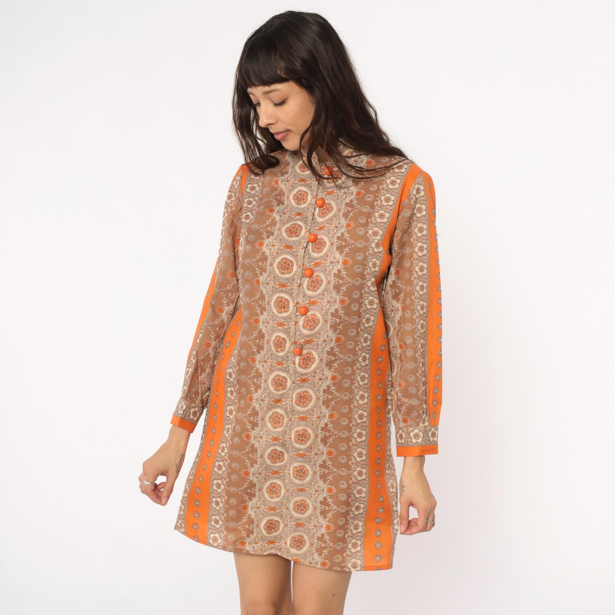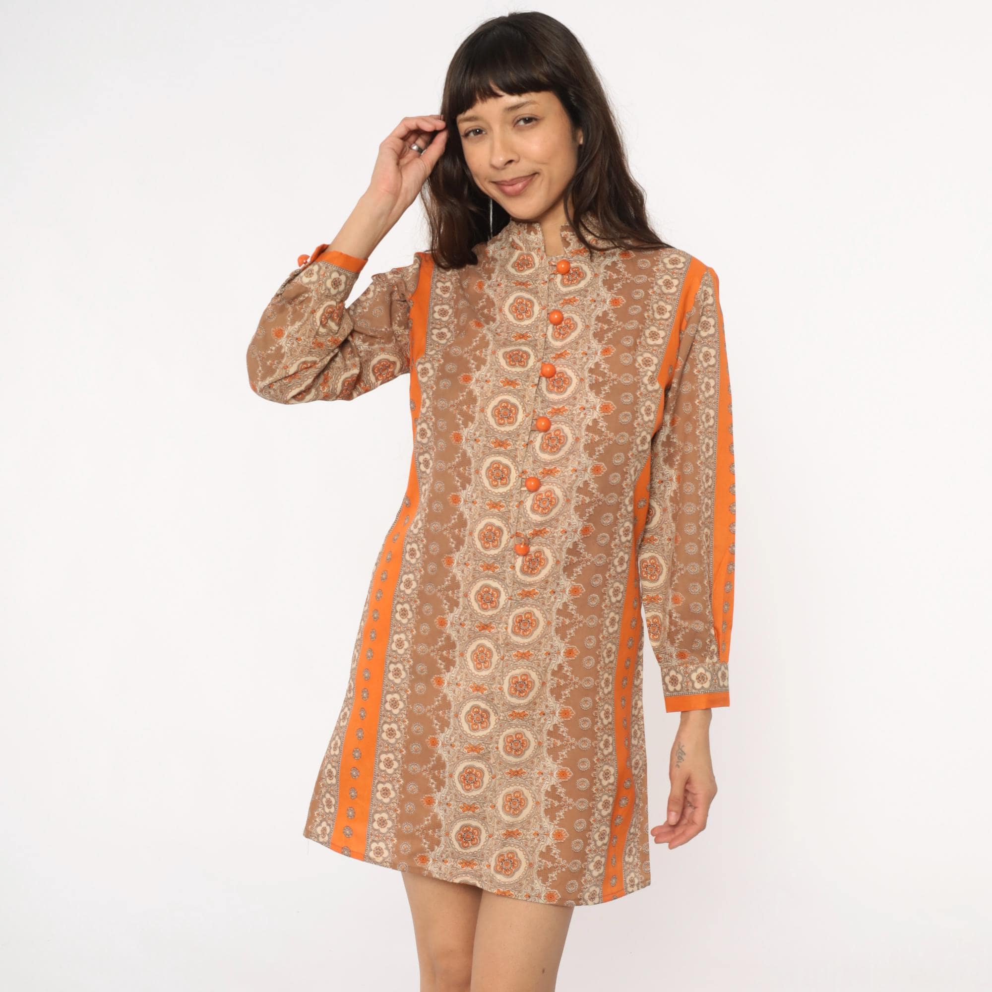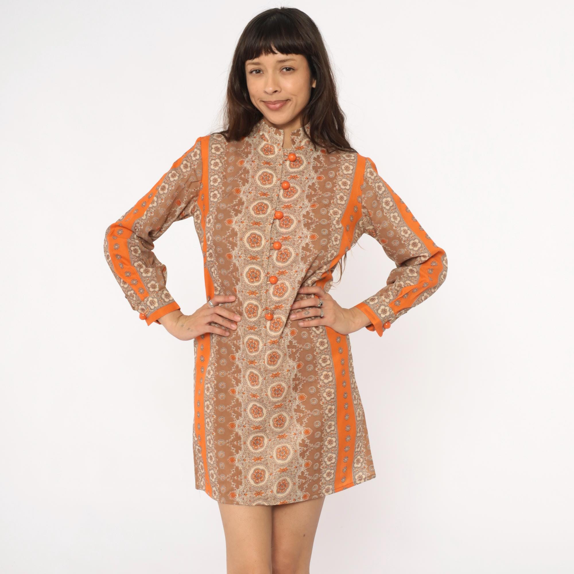 60s mod mini dress in brown and orange medallion print with mandarin collar and front button closure. Long sleeves with decorative button details, orange trim along shoulders and center back panel. All-over floral medallion pattern in shades of brown, tan, beige, and orange.