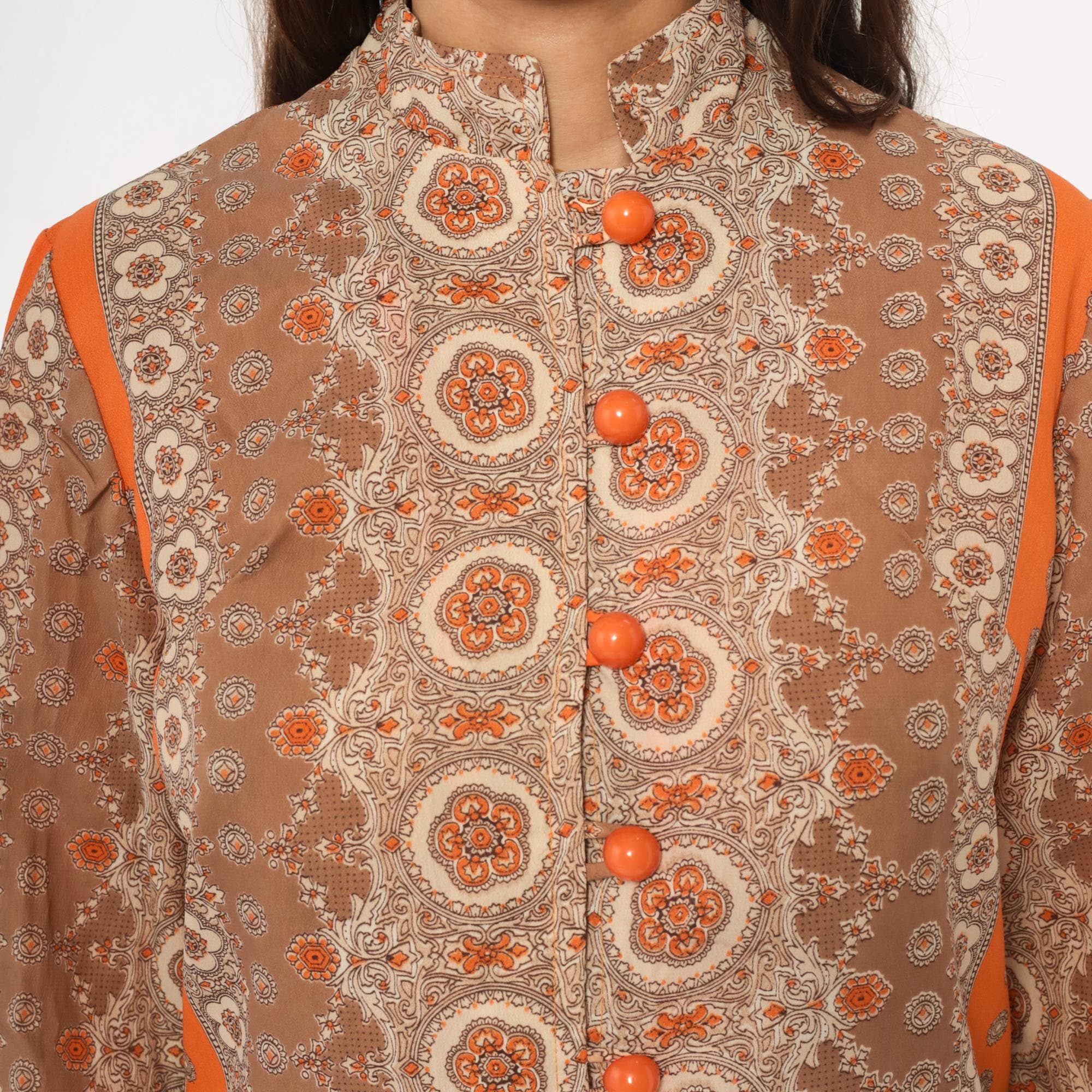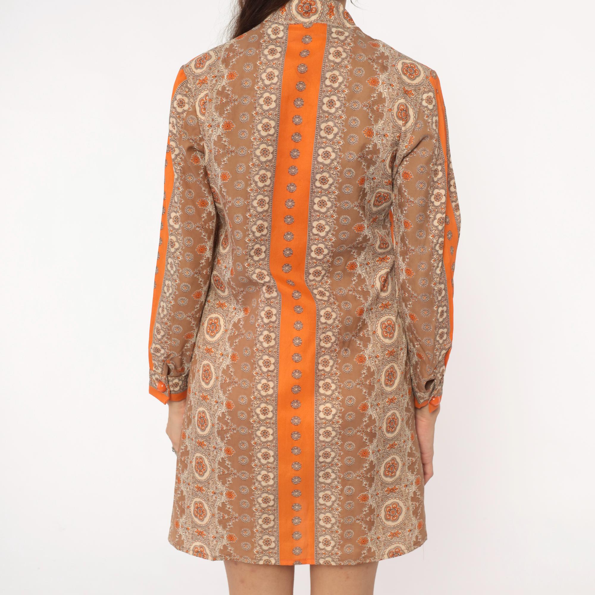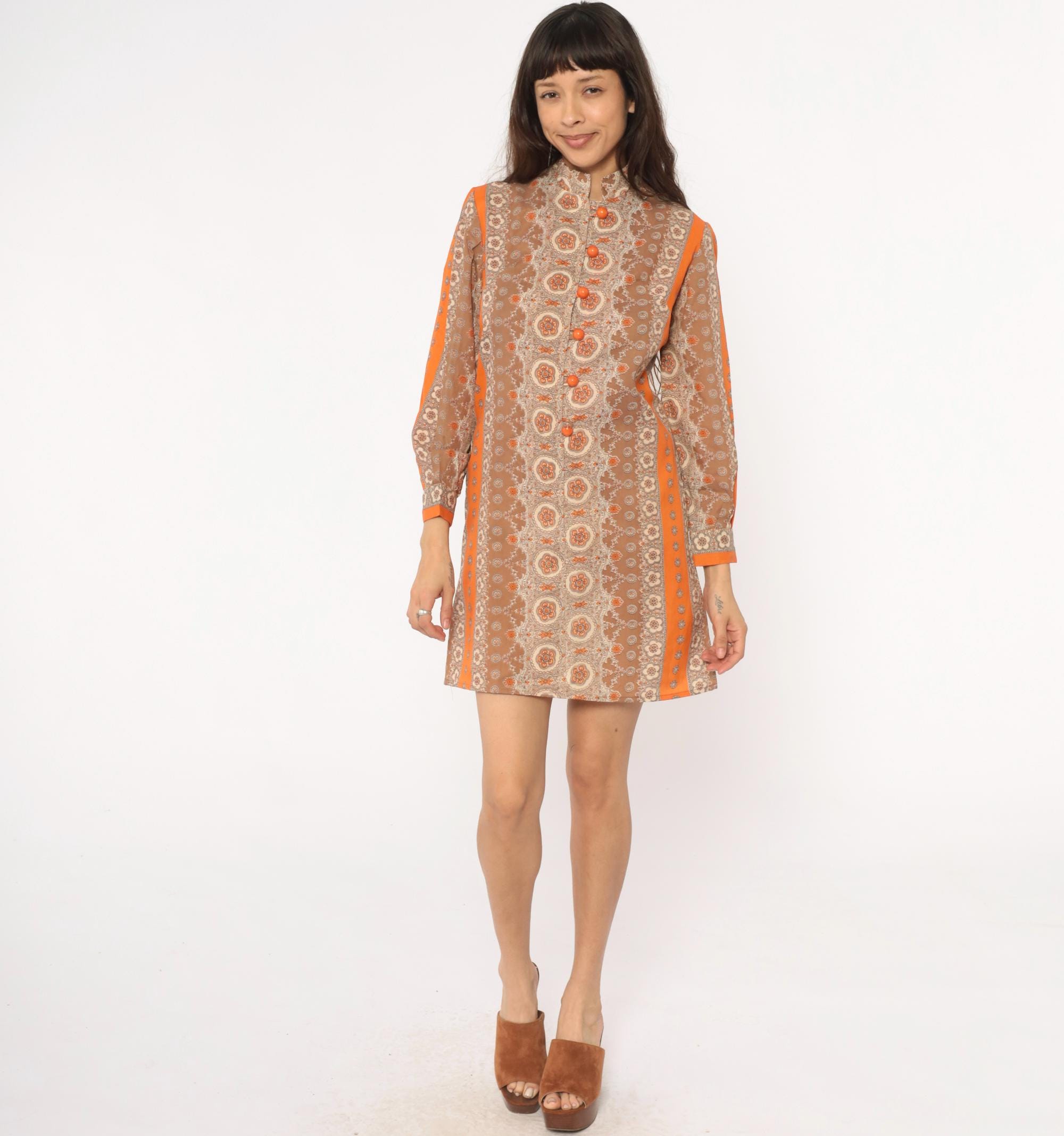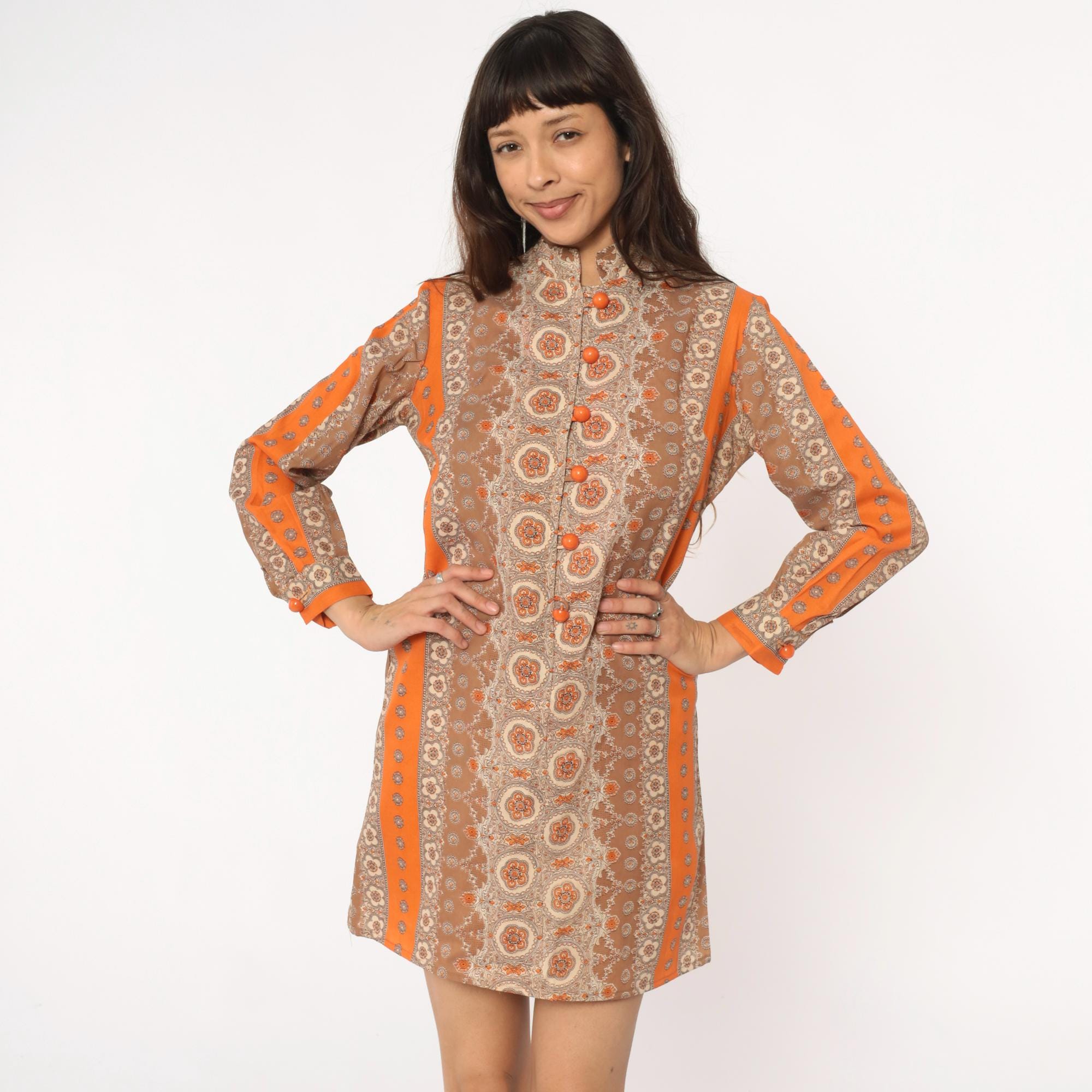 60s mod mini dress in brown and orange medallion print with mandarin collar and front button closure. Long sleeves with decorative button details, orange trim along shoulders and center back panel. All-over floral medallion pattern in shades of brown, tan, beige, and orange.