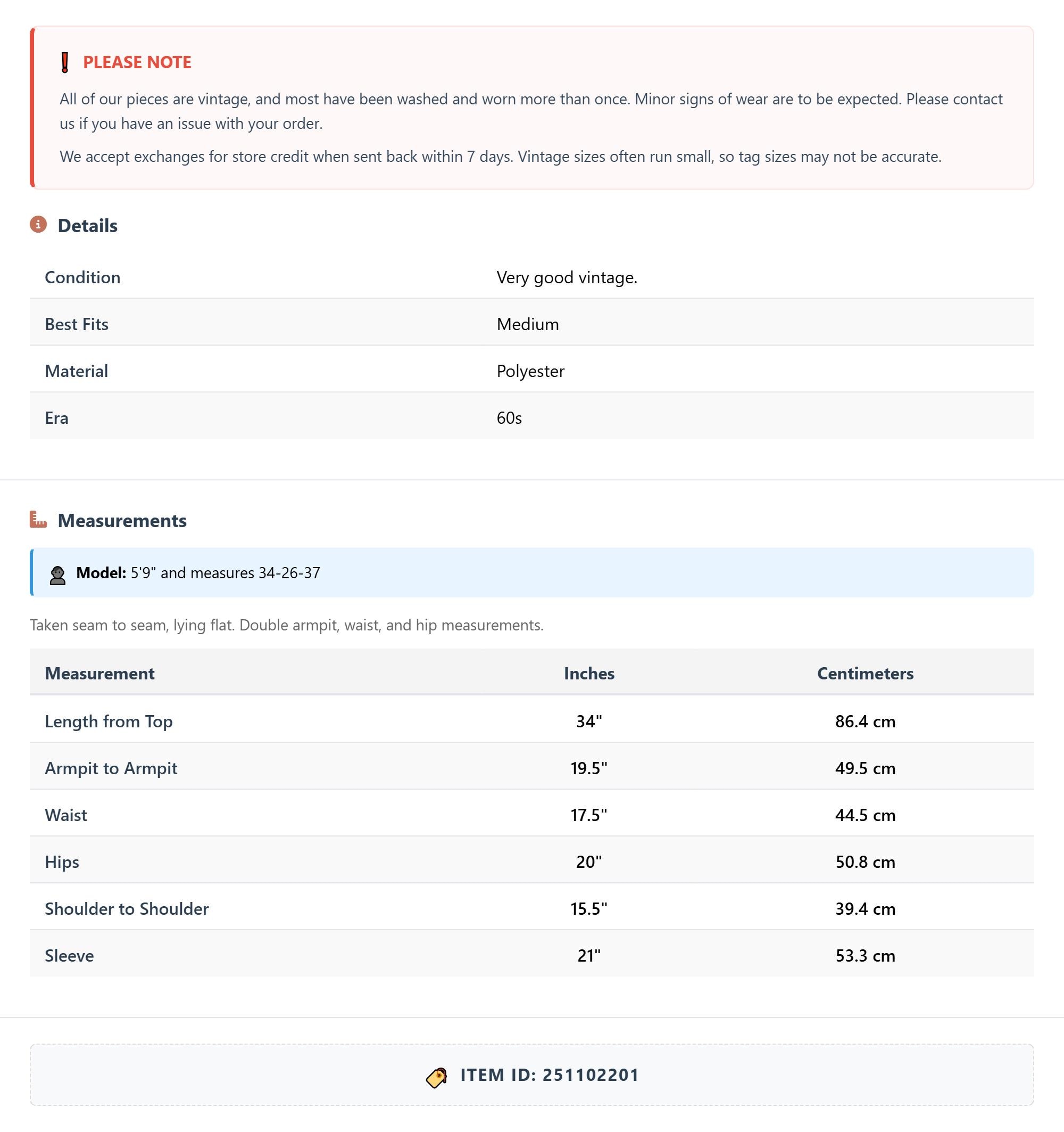 Measurements are taken laying flat and should be doubled where applicable. The "best fits" size is just an estimate, and vintage sizing can vary from modern sizing. Please use measurements to ensure proper fit. The best thing to do is measure a similar item of your own, and compare. When an item has stretch, we will list the unstretched dimensions with the stretched measurement afterwards.