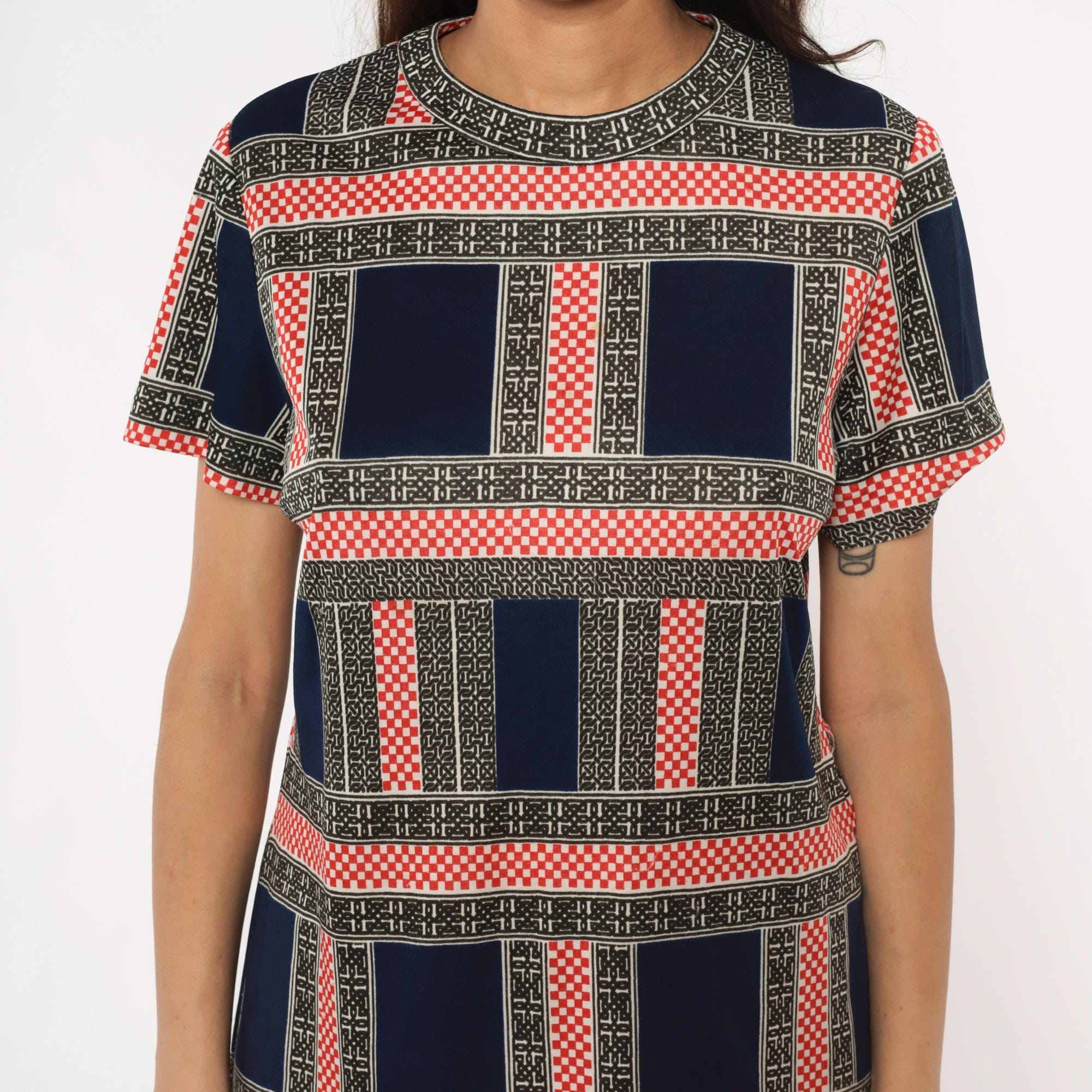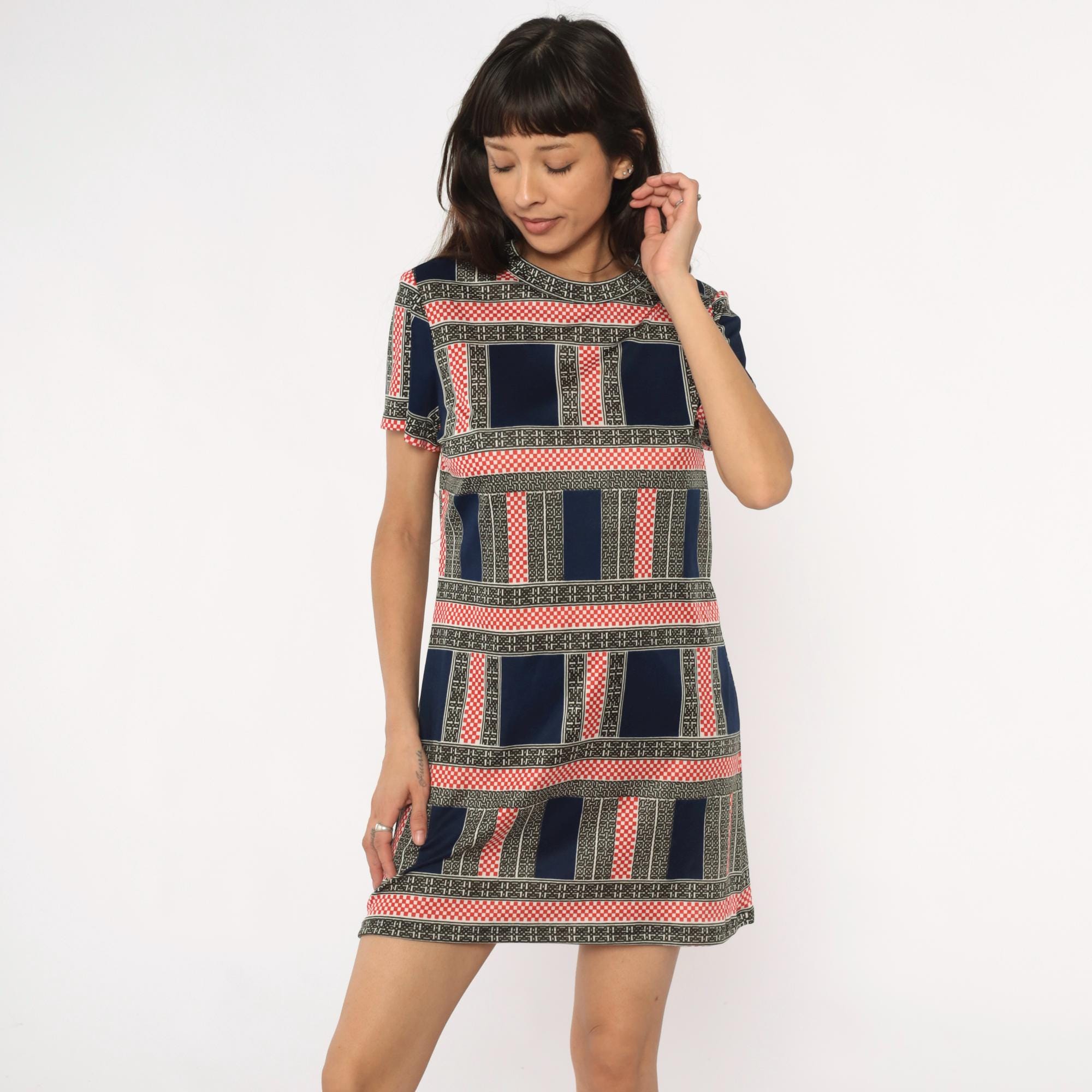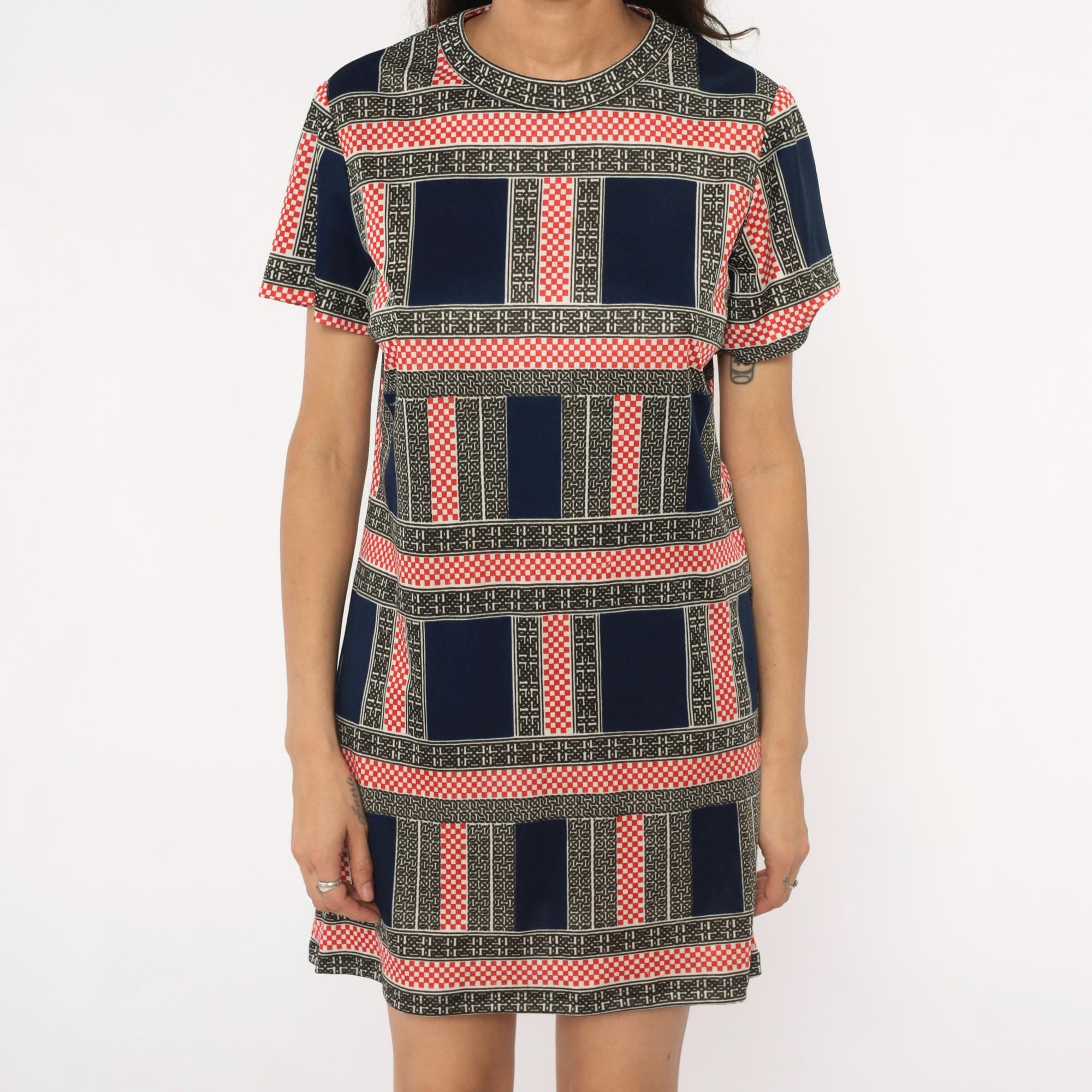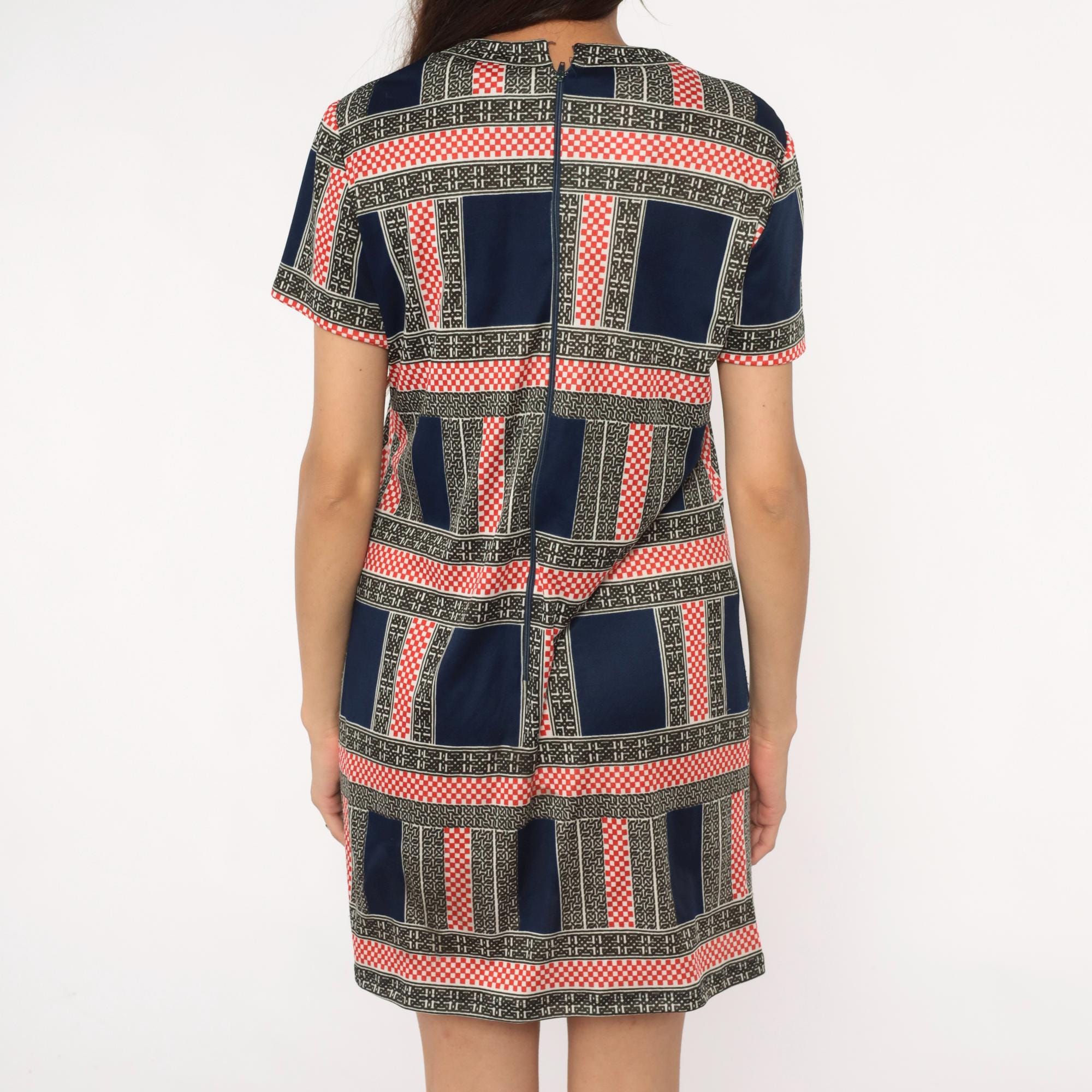 60s shift dress in geometric checkerboard and block pattern with navy blue, red-orange, and cream colors arranged in horizontal bands. Crew neckline, short sleeves, straight silhouette.