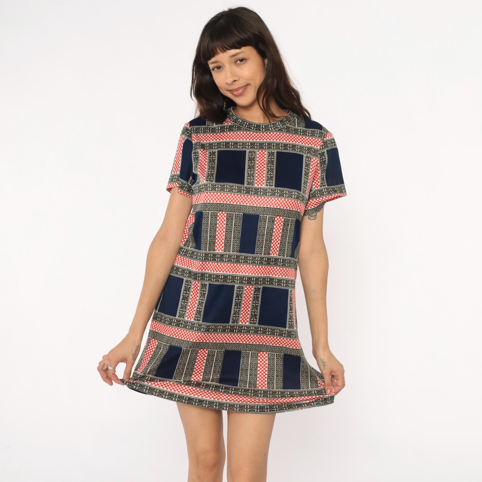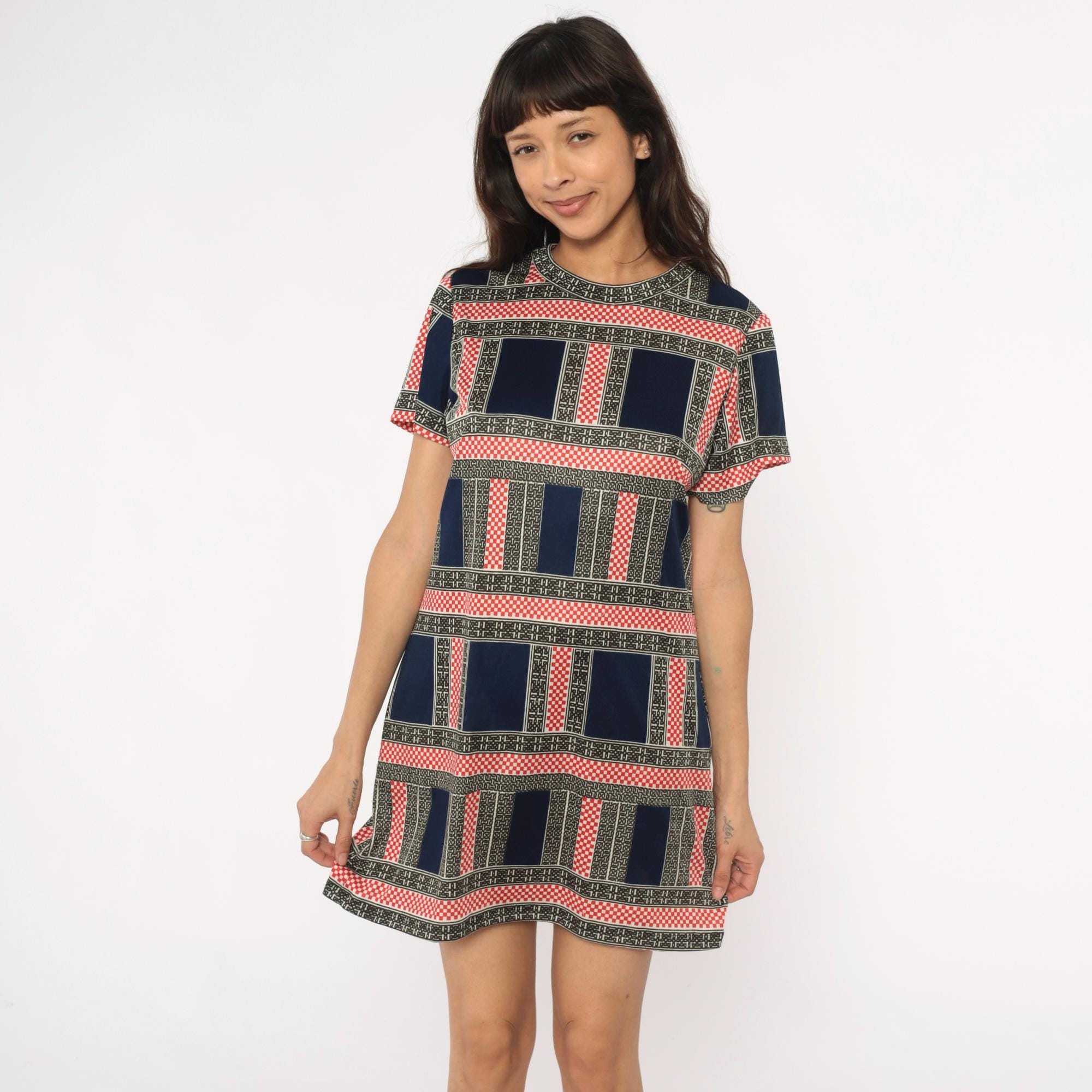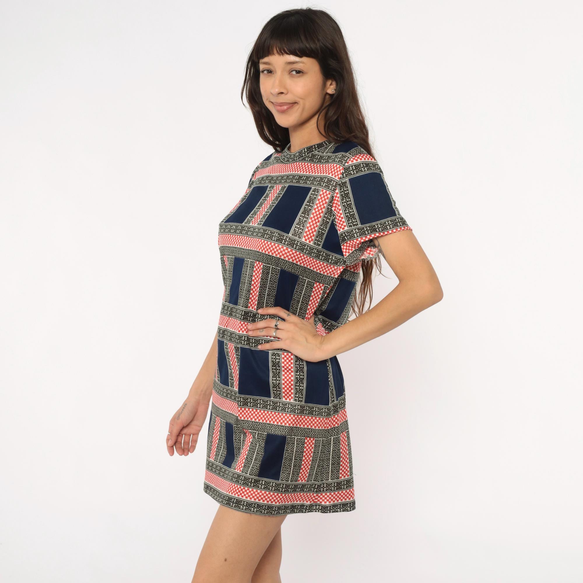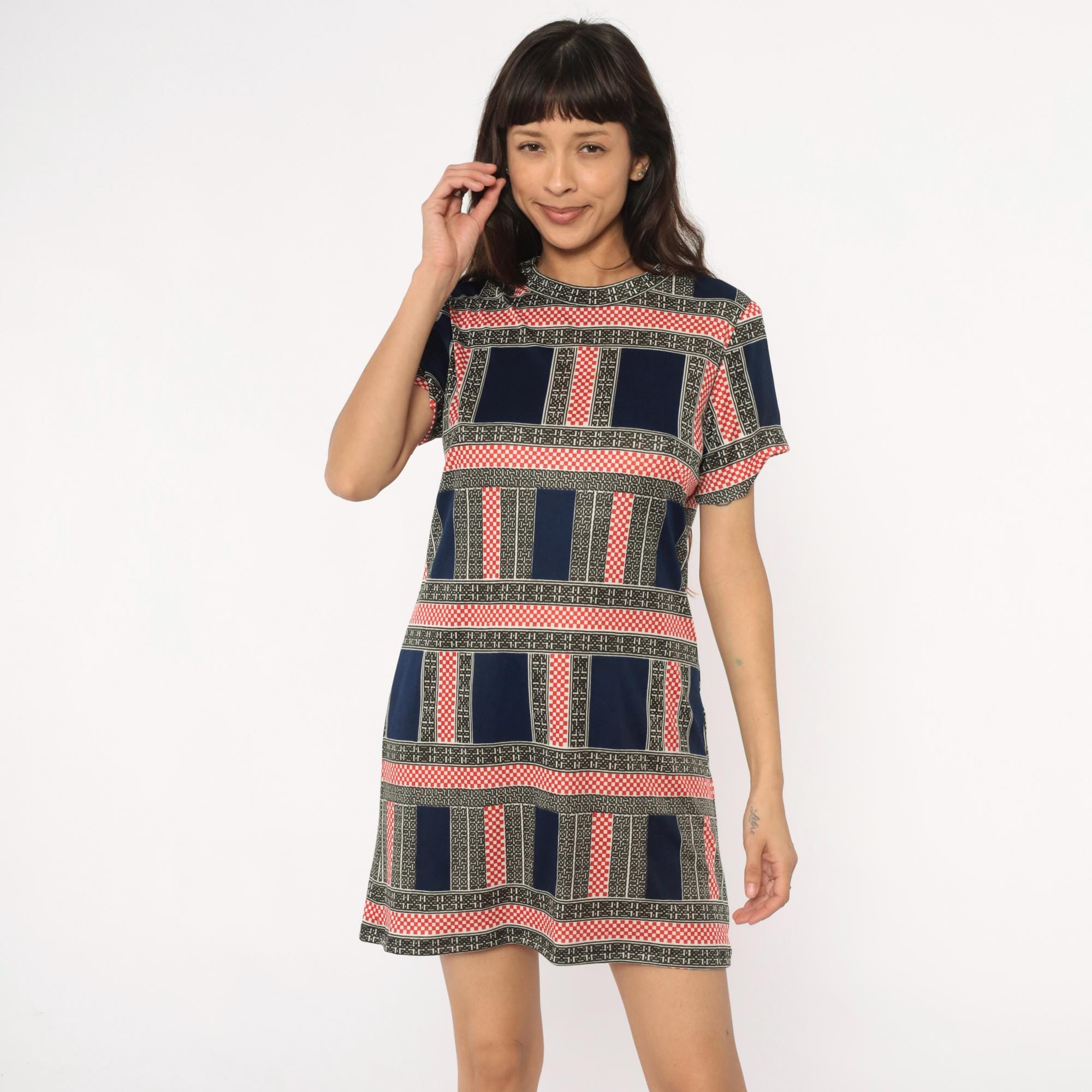 60s shift dress in geometric checkerboard and block pattern with navy blue, red-orange, and cream colors arranged in horizontal bands. Crew neckline, short sleeves, straight silhouette.