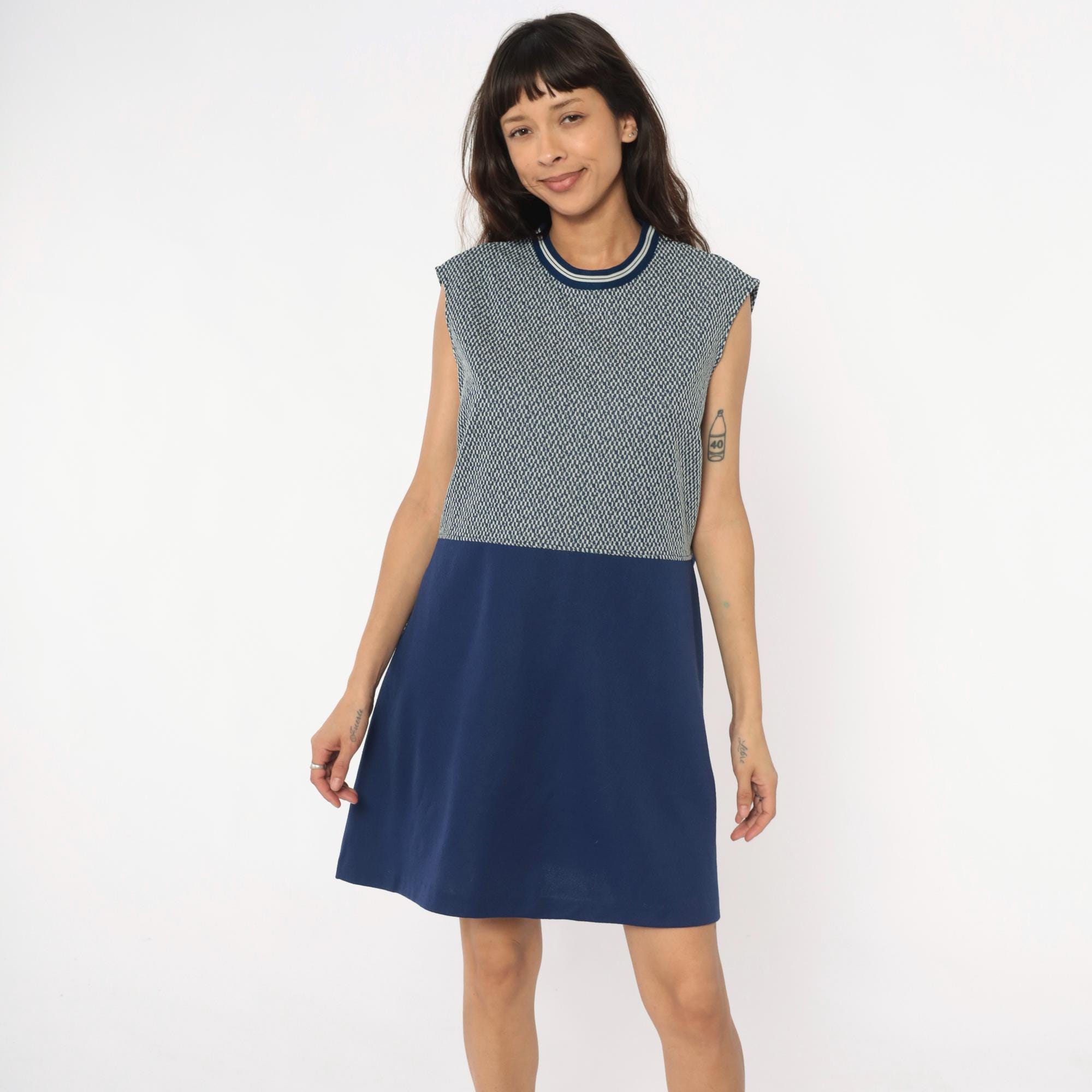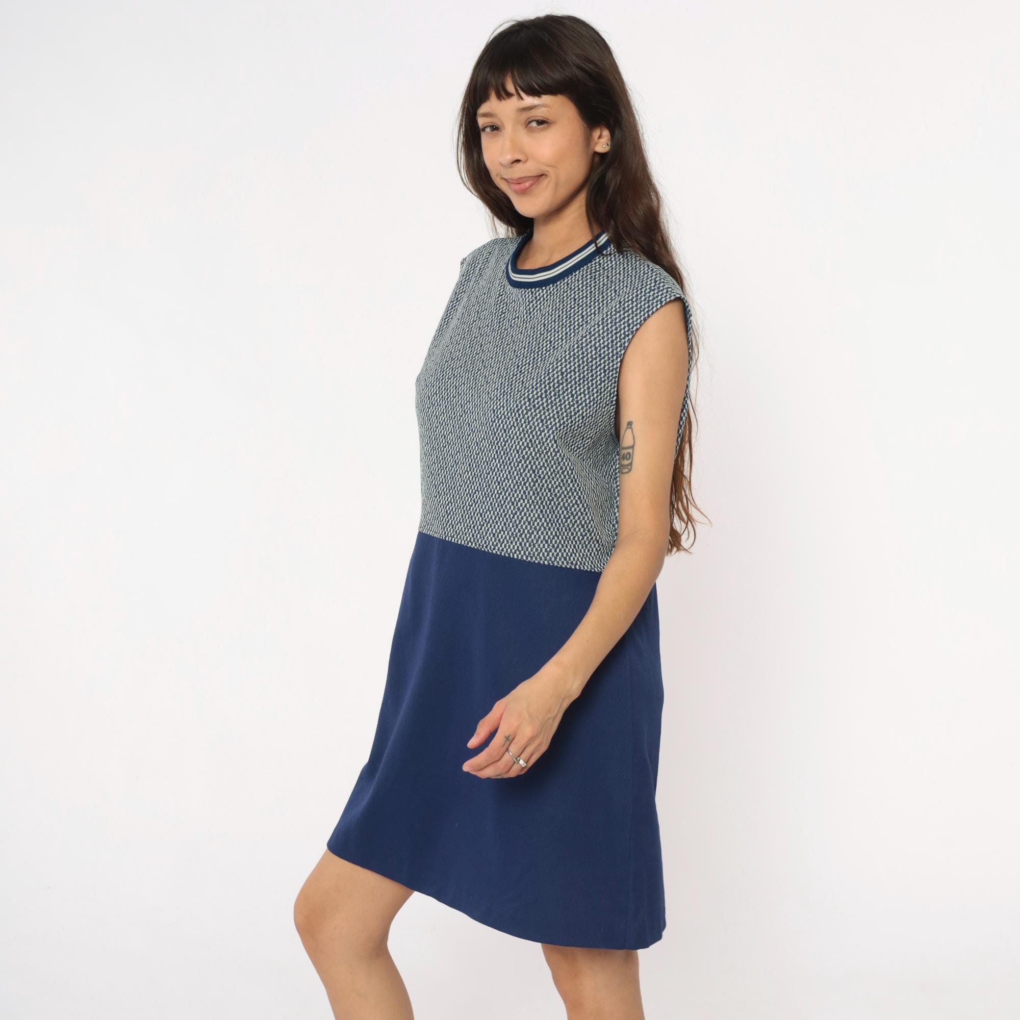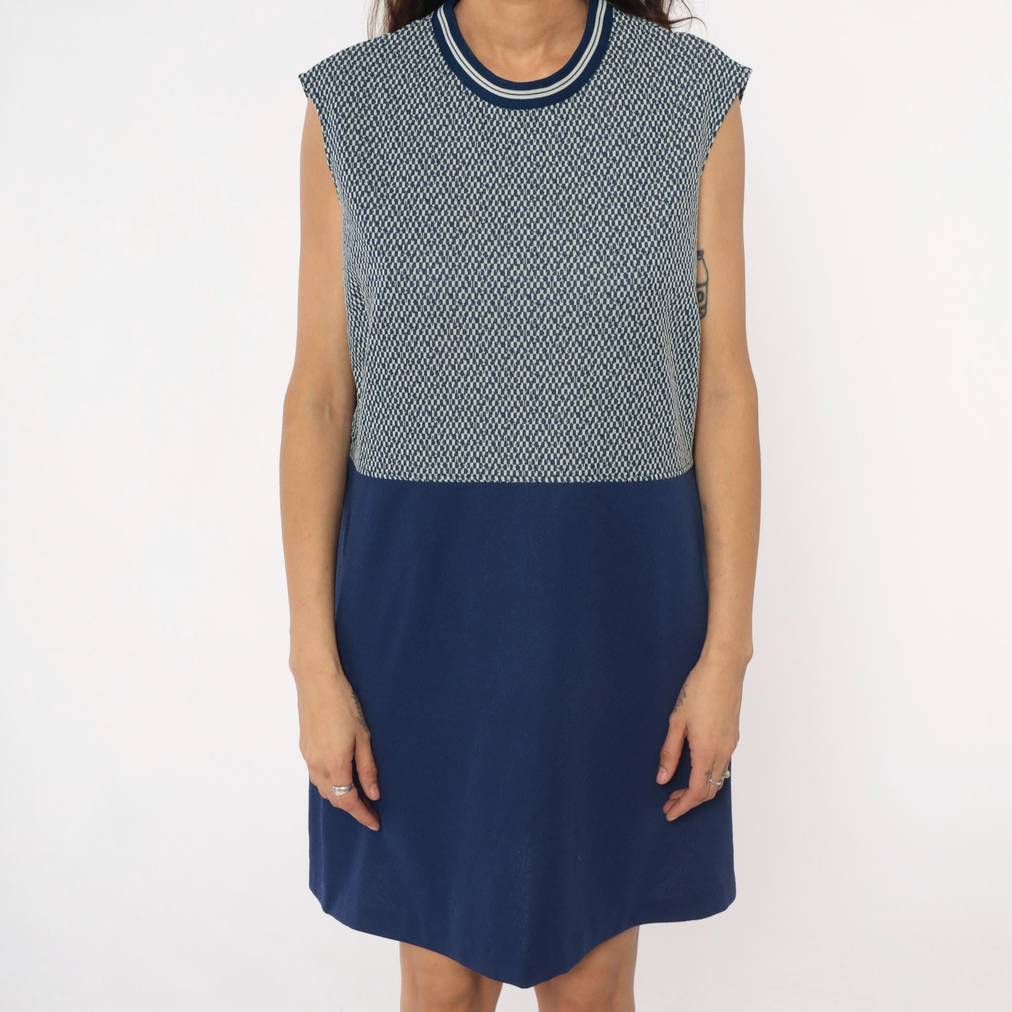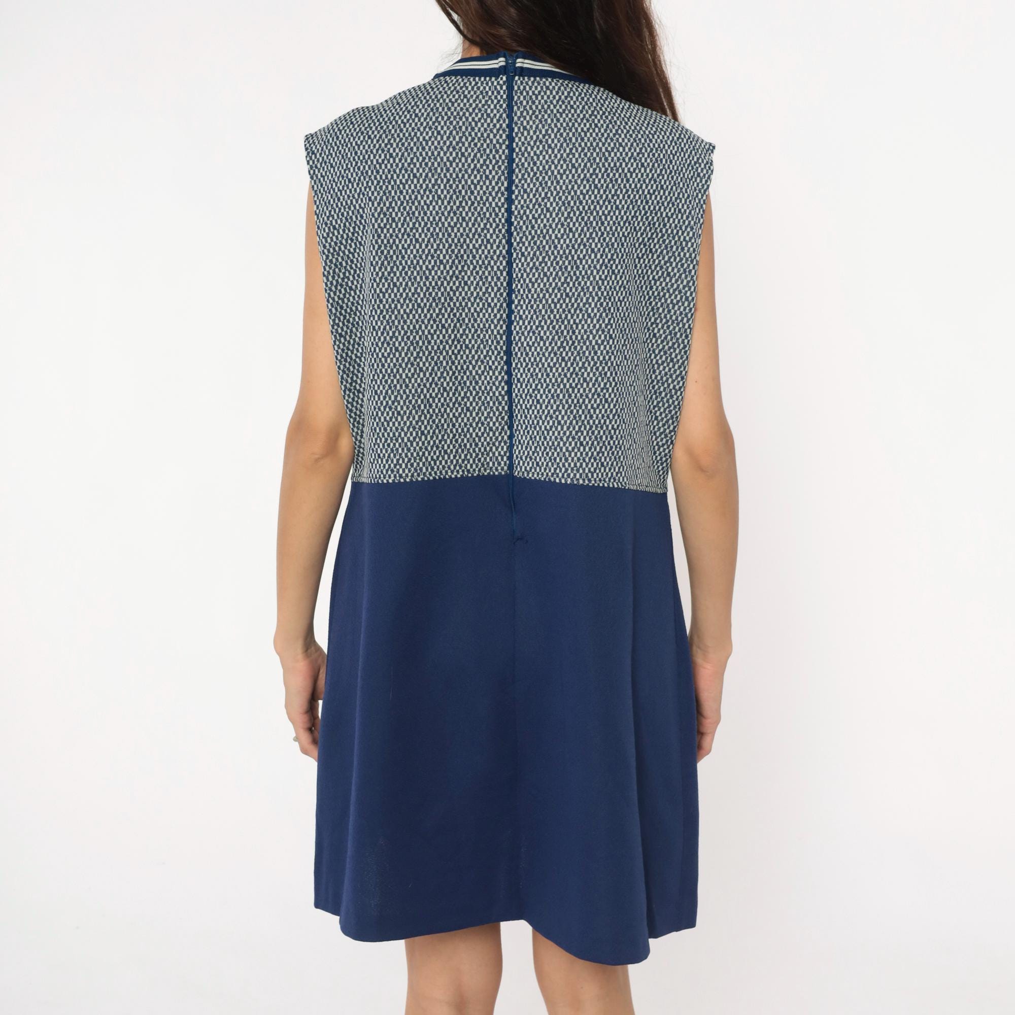 70s navy blue and white sleeveless dress from JC Penney with geometric zigzag knit pattern on upper bodice and solid navy skirt. Round neckline with navy and white striped ribbed trim. Knee-length with fitted silhouette.