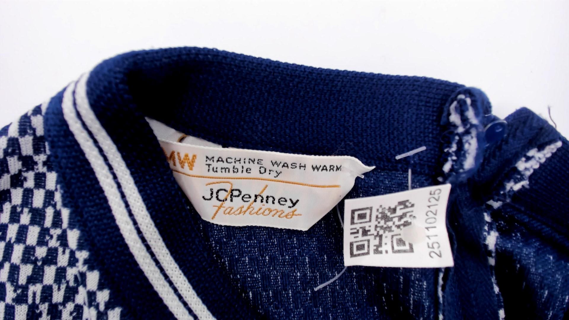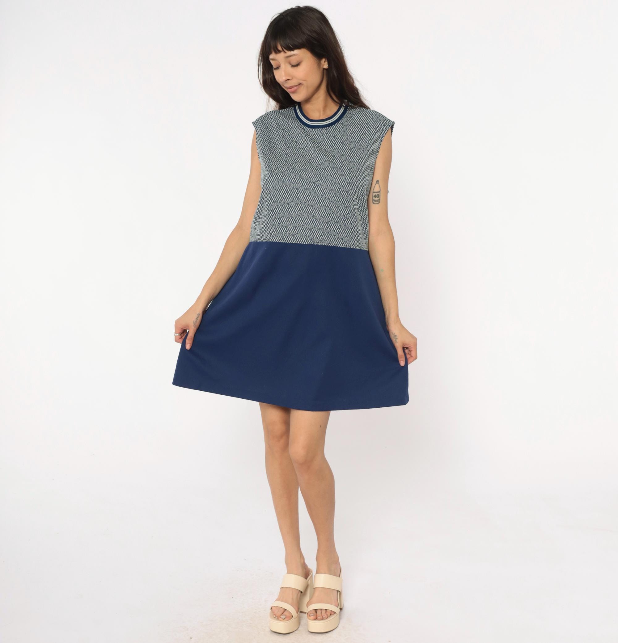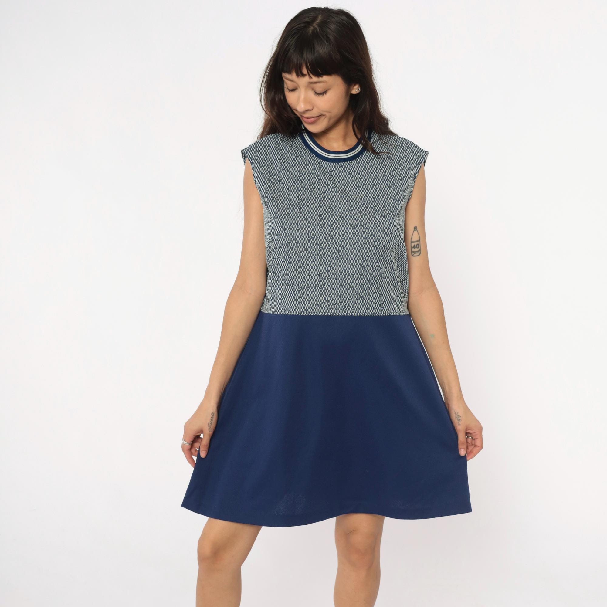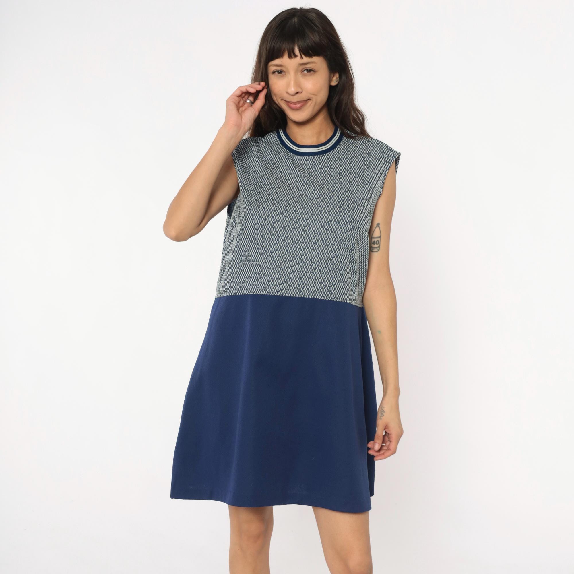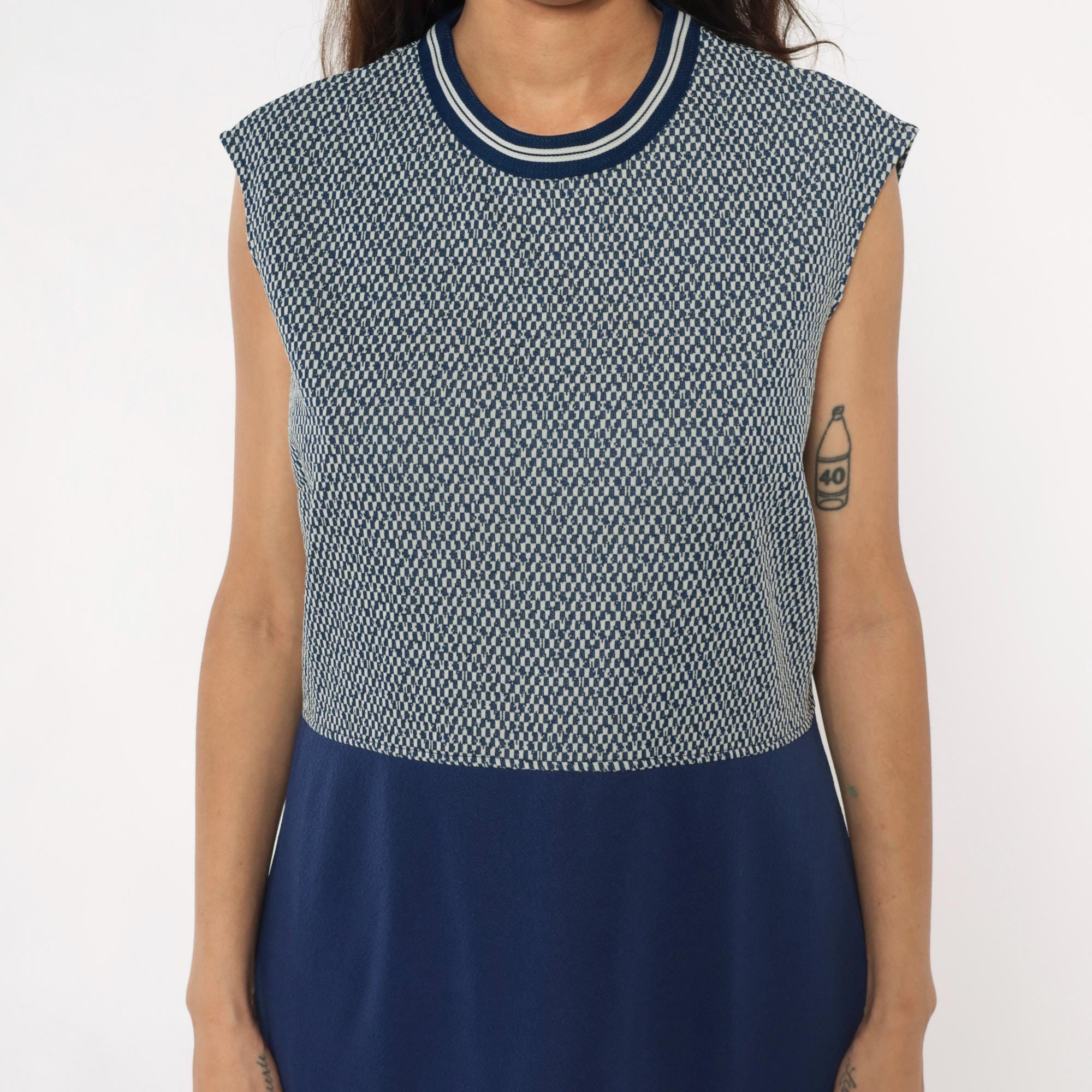 70s navy blue and white sleeveless dress from JC Penney with geometric zigzag knit pattern on upper bodice and solid navy skirt. Round neckline with navy and white striped ribbed trim. Knee-length with fitted silhouette.