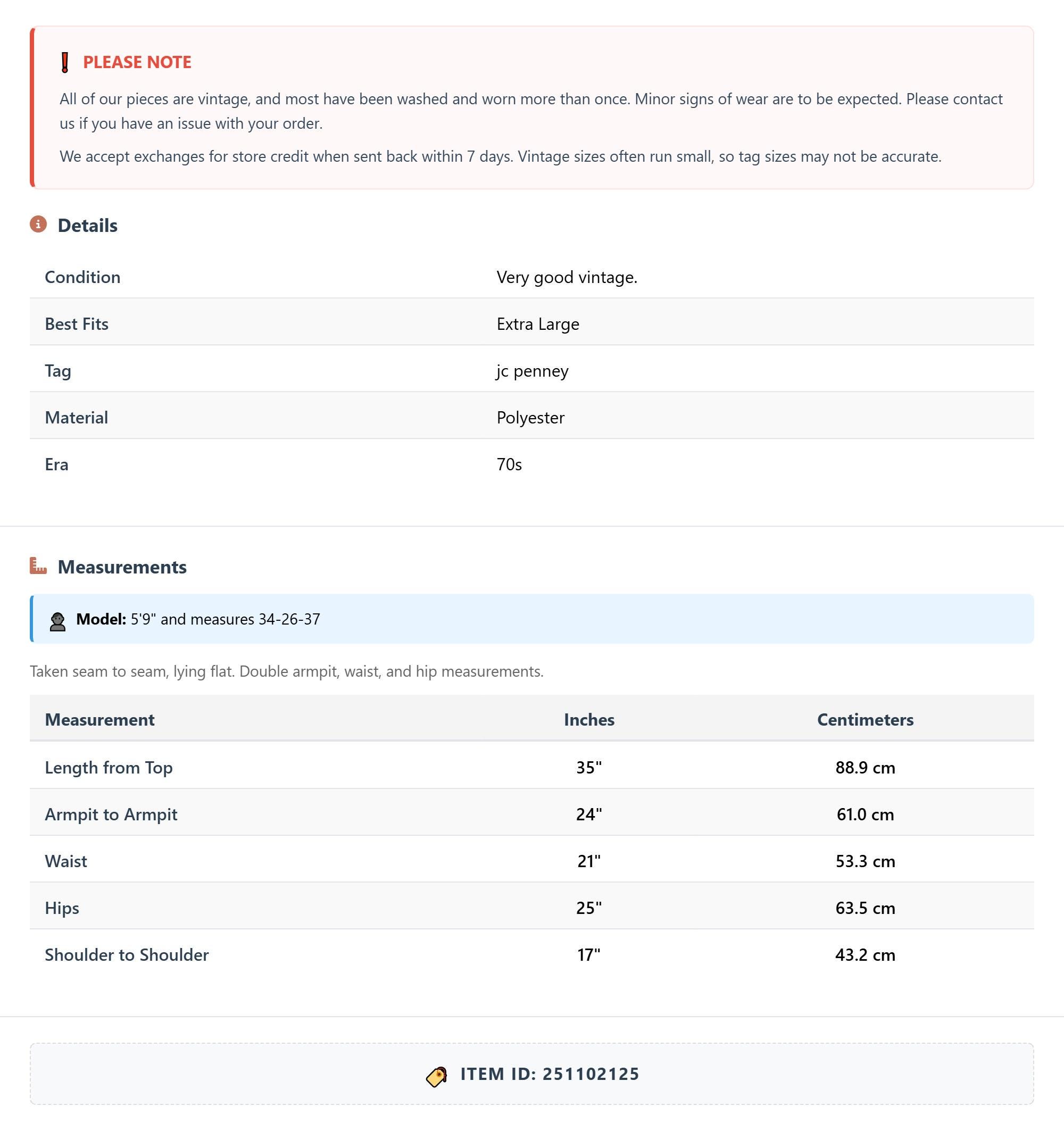 All of our pieces are vintage, and most have been washed and worn more than once. Minor signs of wear are to be expected. Please contact us if you have an issue with your order. We accept exchanges for store credit when sent back within 7 days.