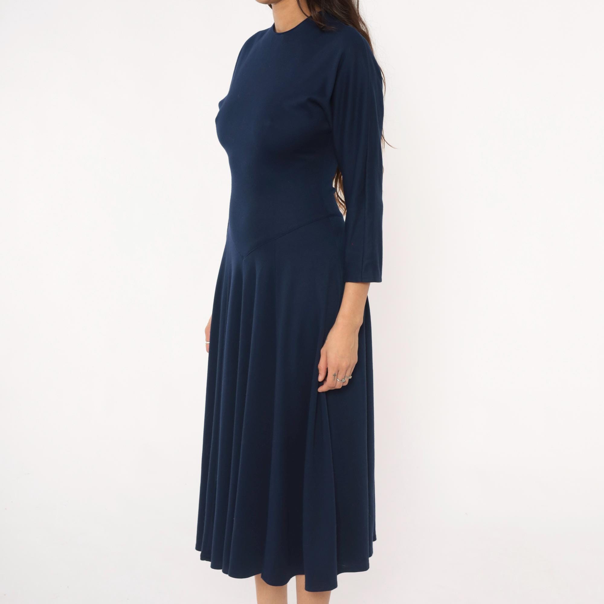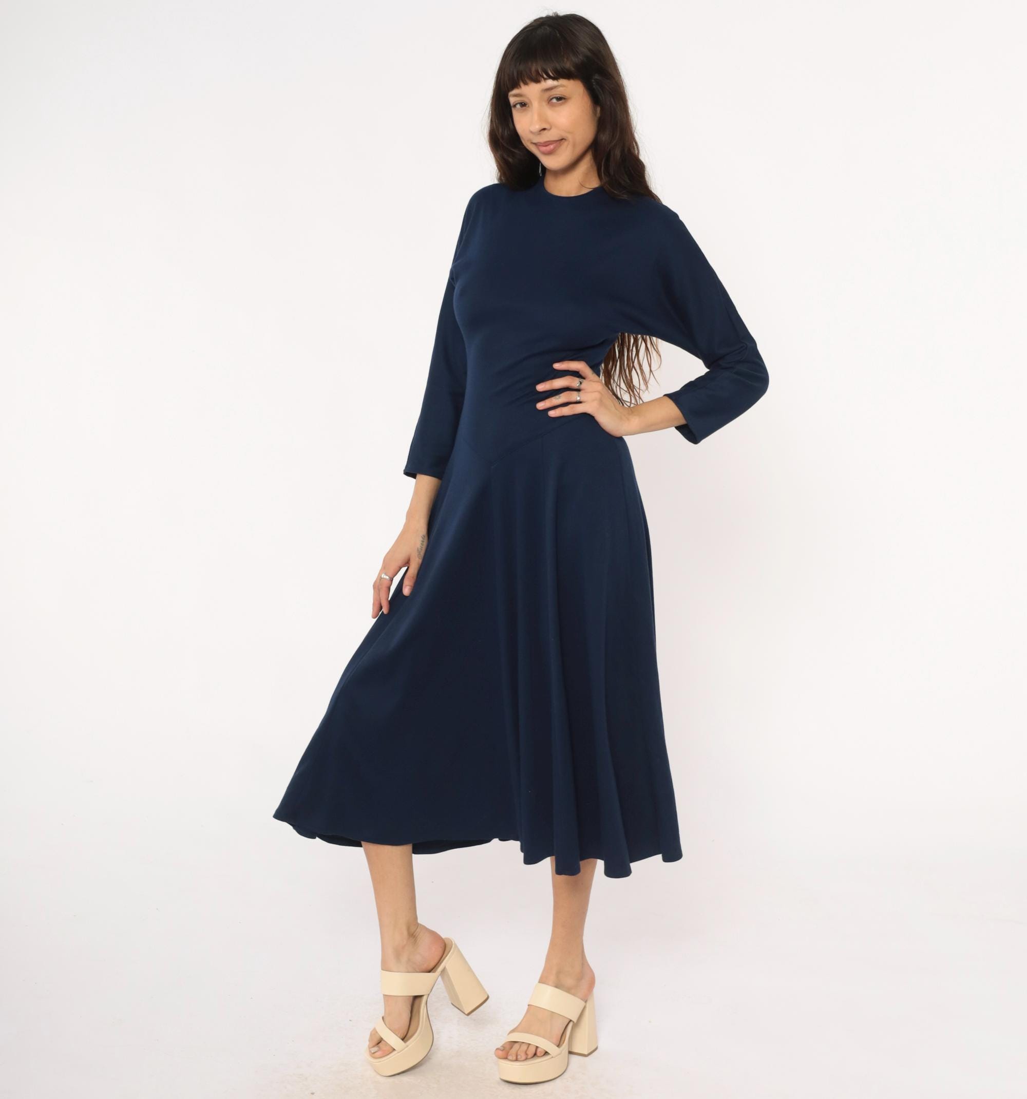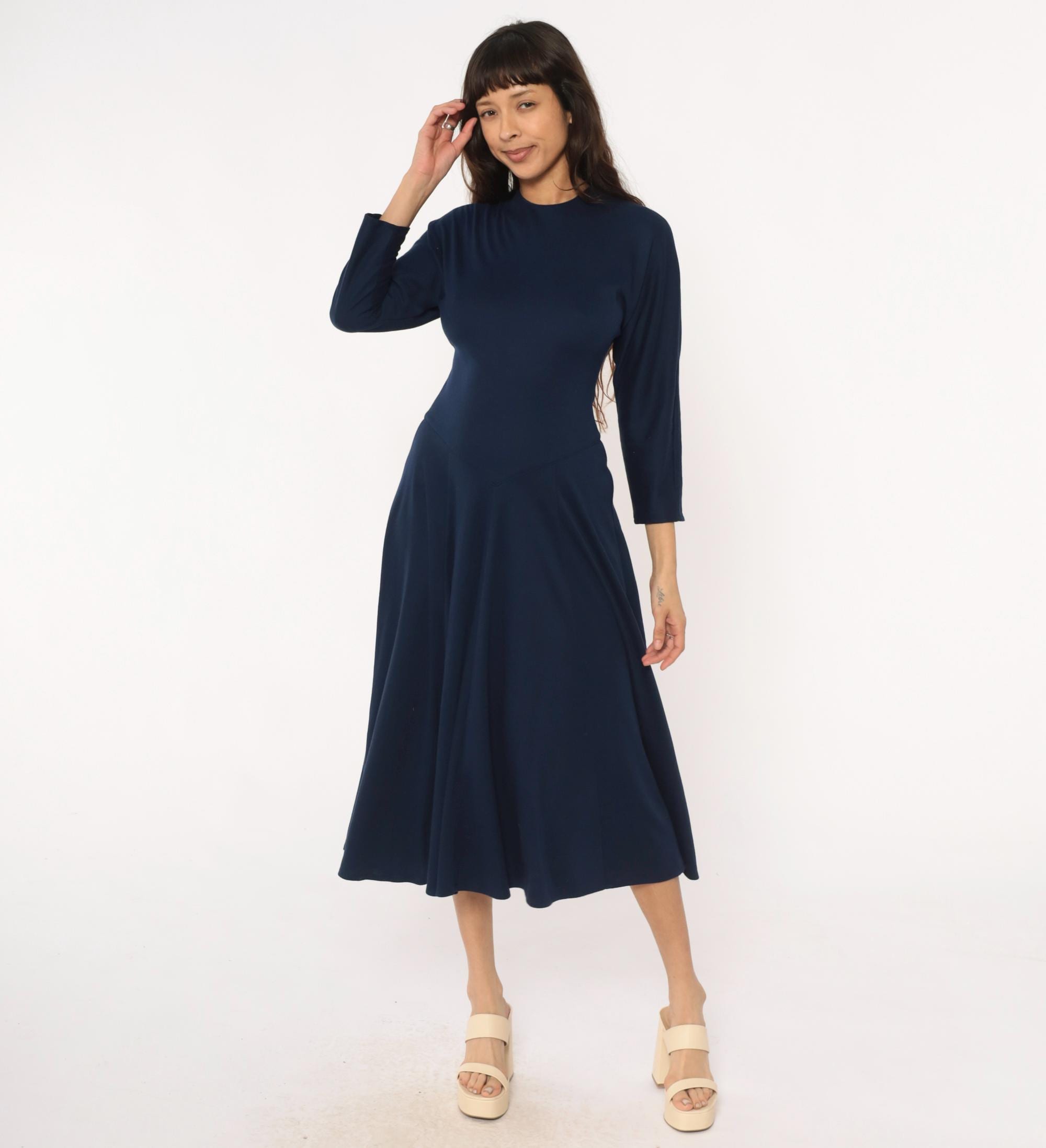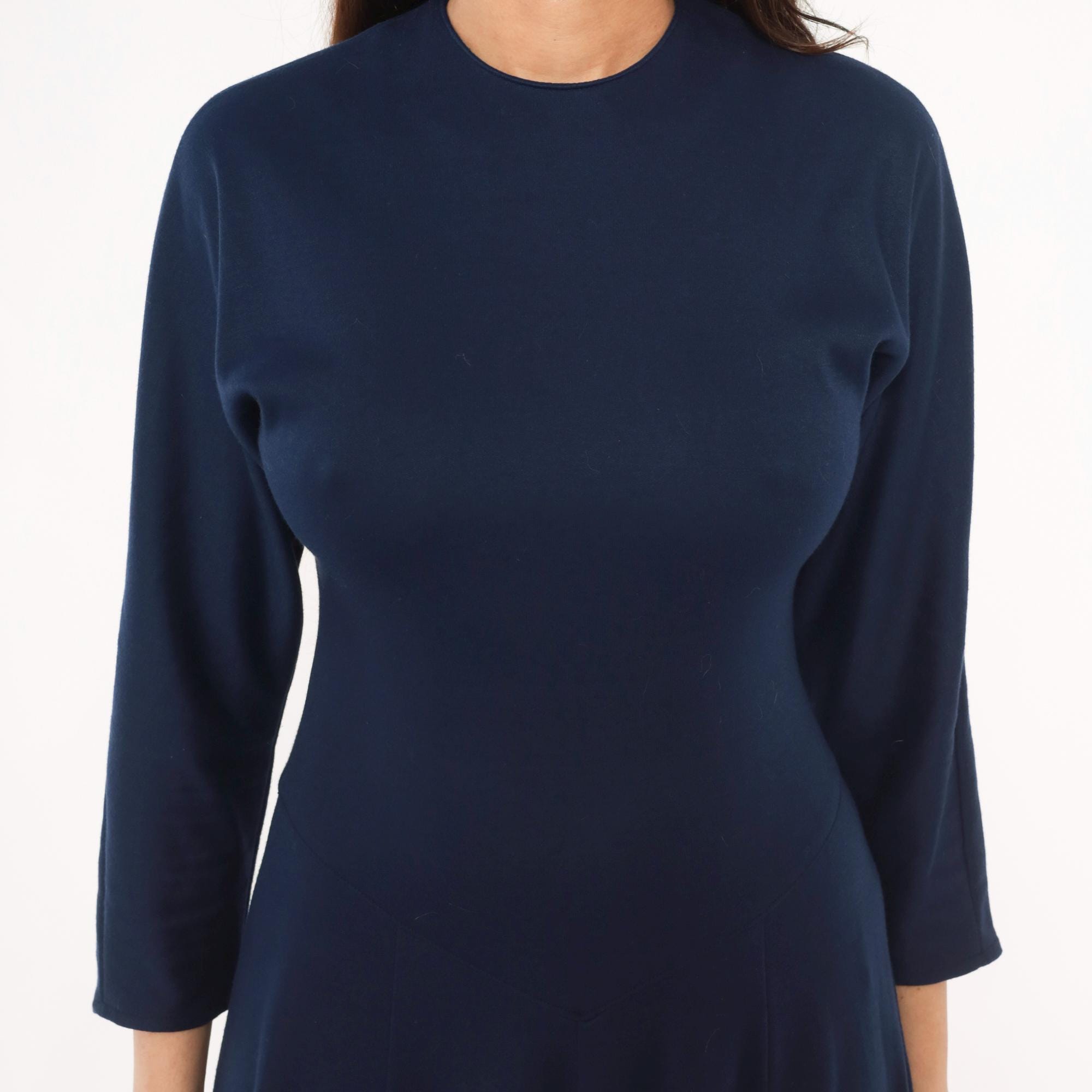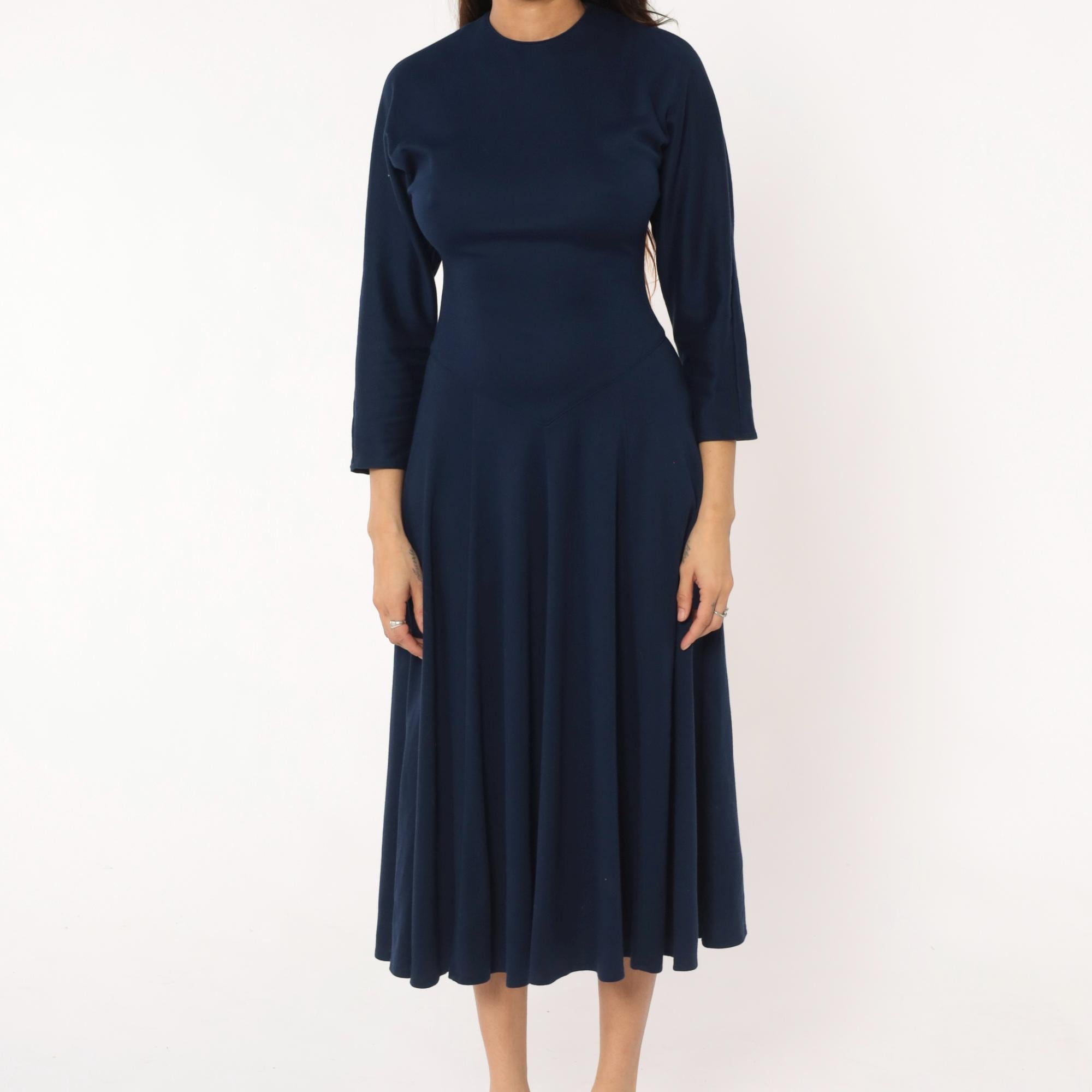80s navy blue midi dress from Diane von Furstenberg with crew neckline and long sleeves. Fitted bodice with A-line skirt, invisible back zipper closure.